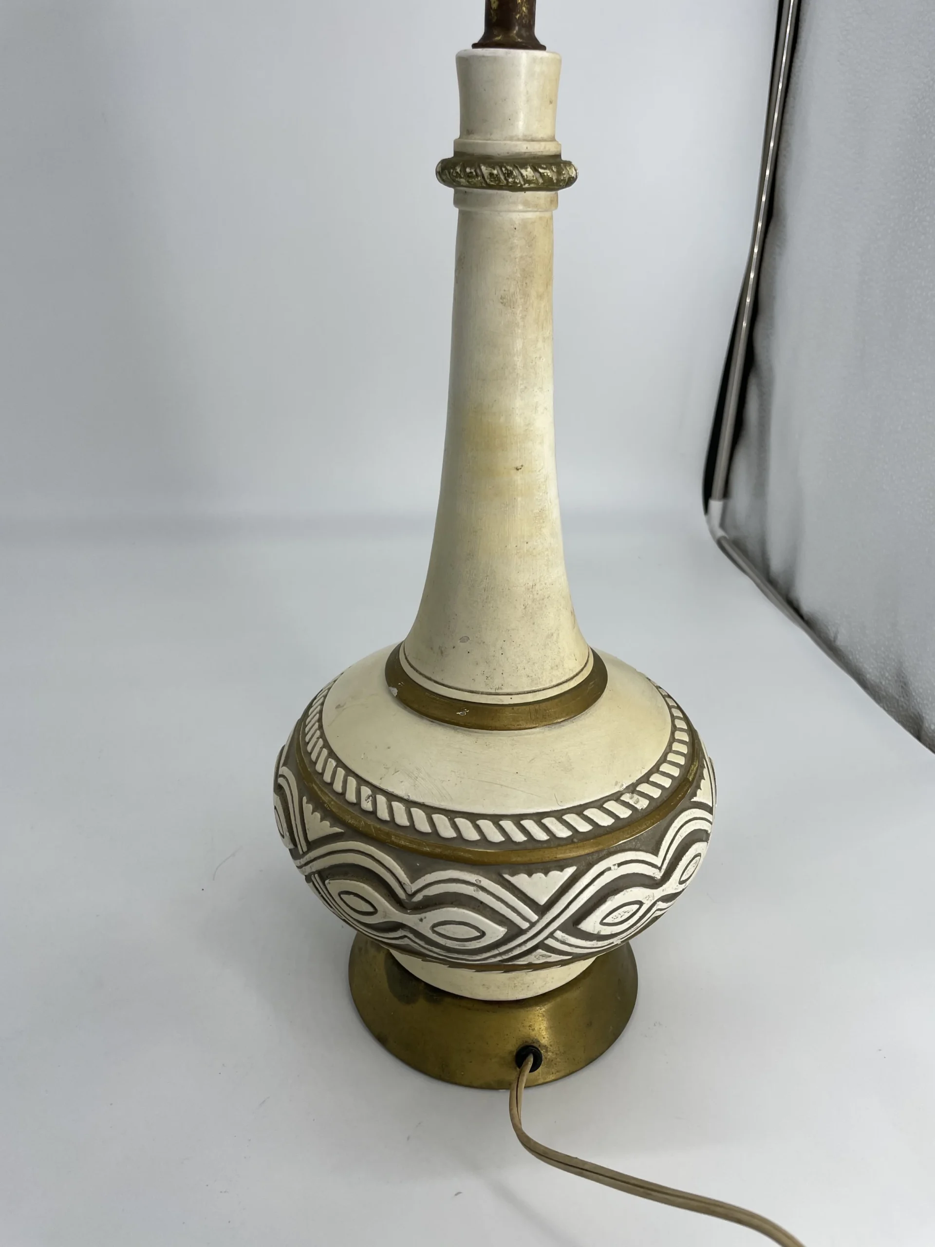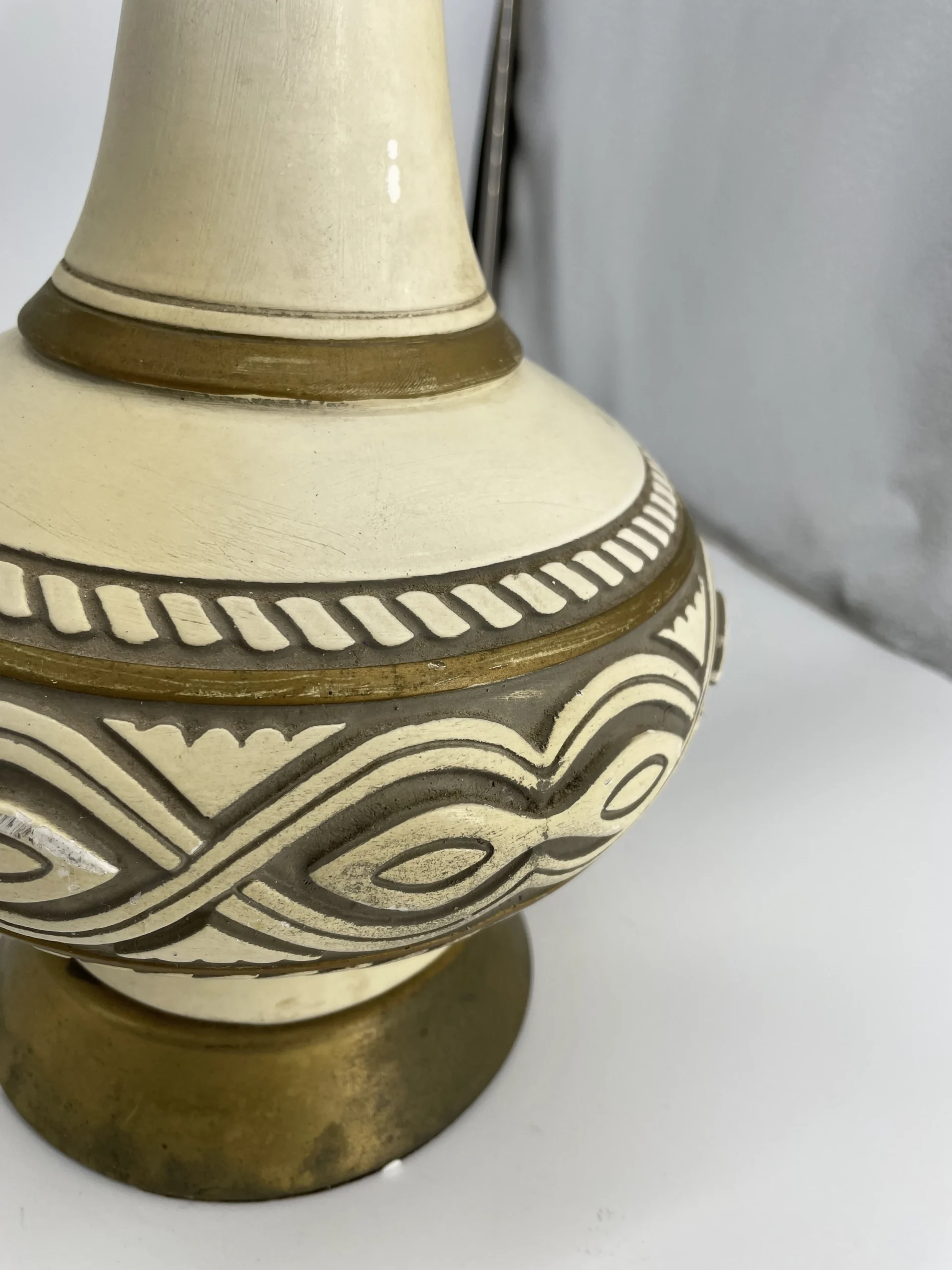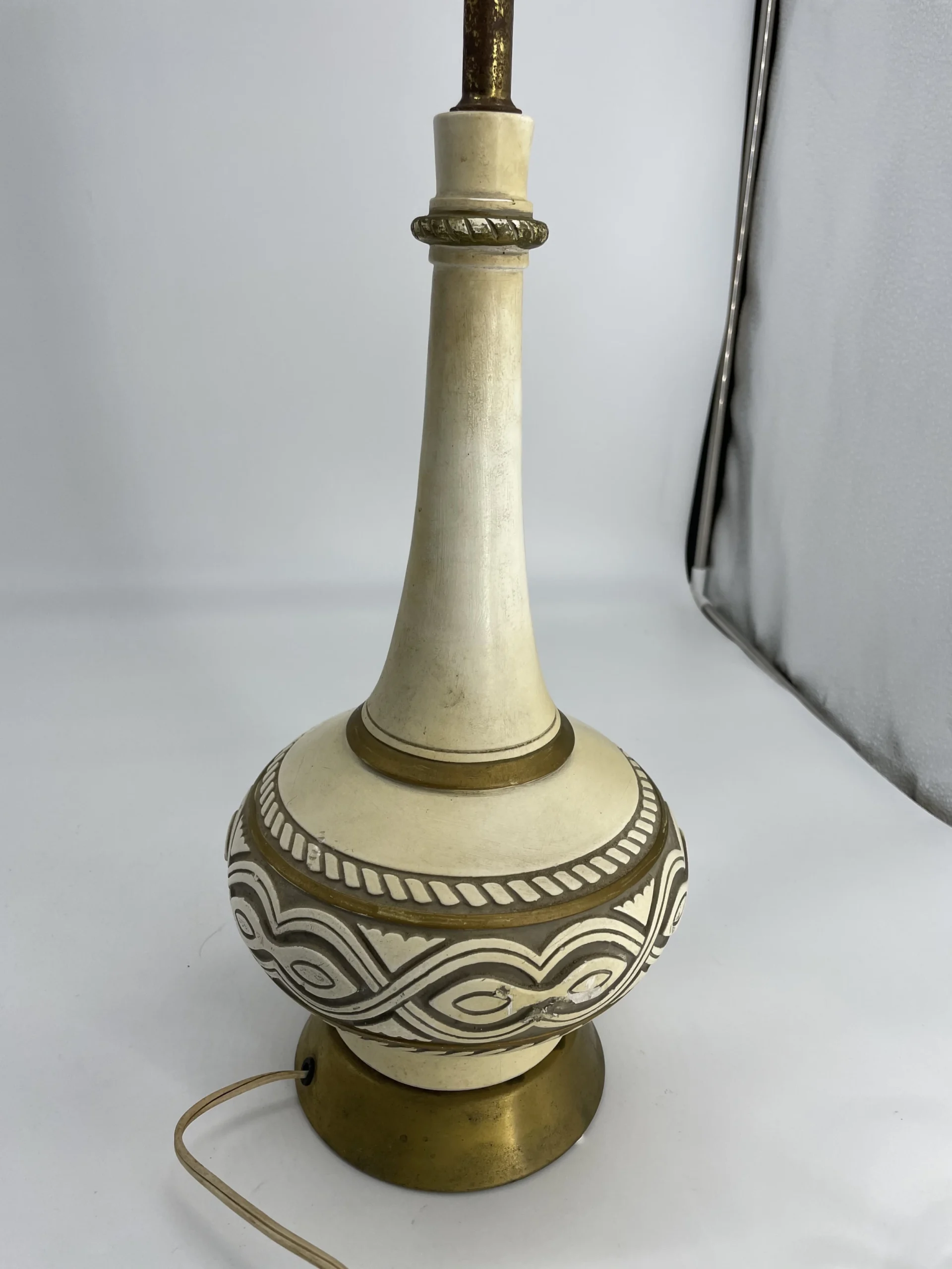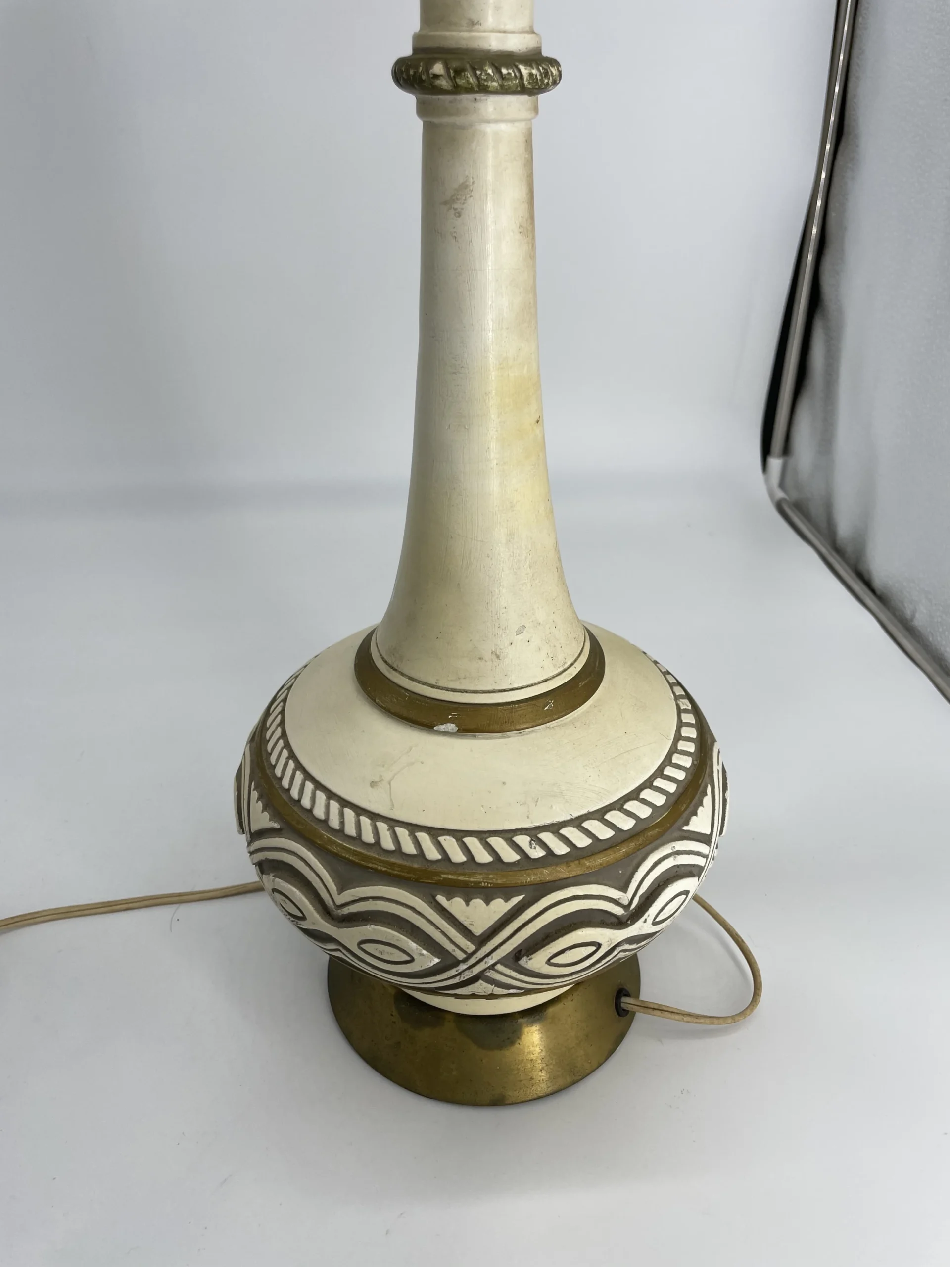This groovy table lamp is very similar in style to other Quartite Creative lamps, however there is no makers mark present. Lamp is mounted on brass-toned base and has a lovely design around its wide center before tapering off up to neck.