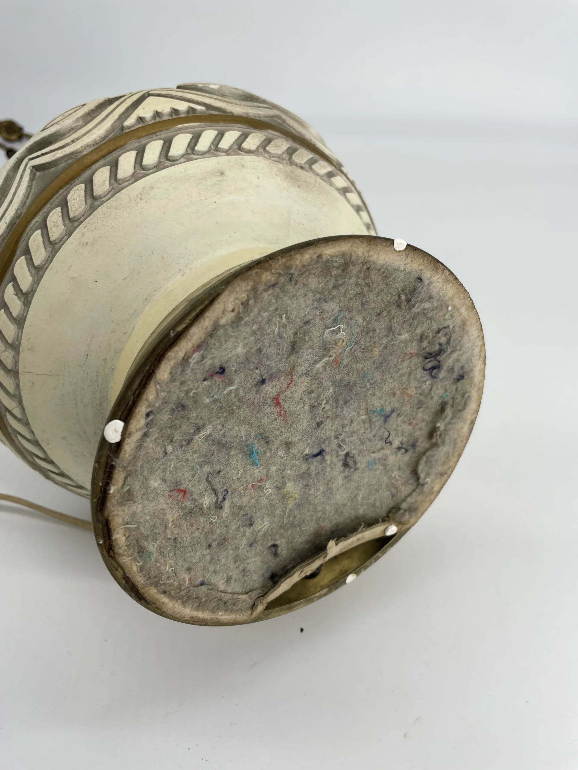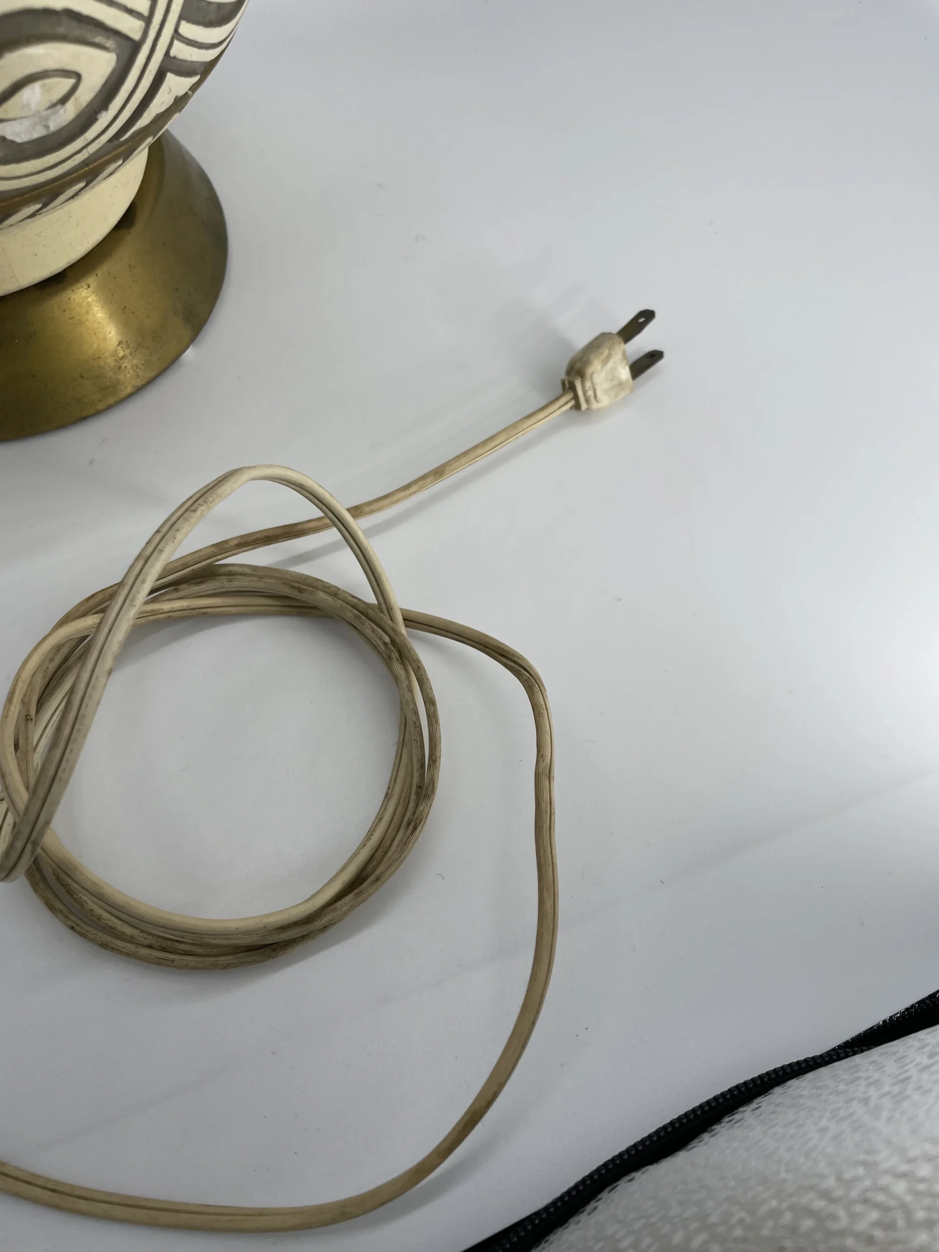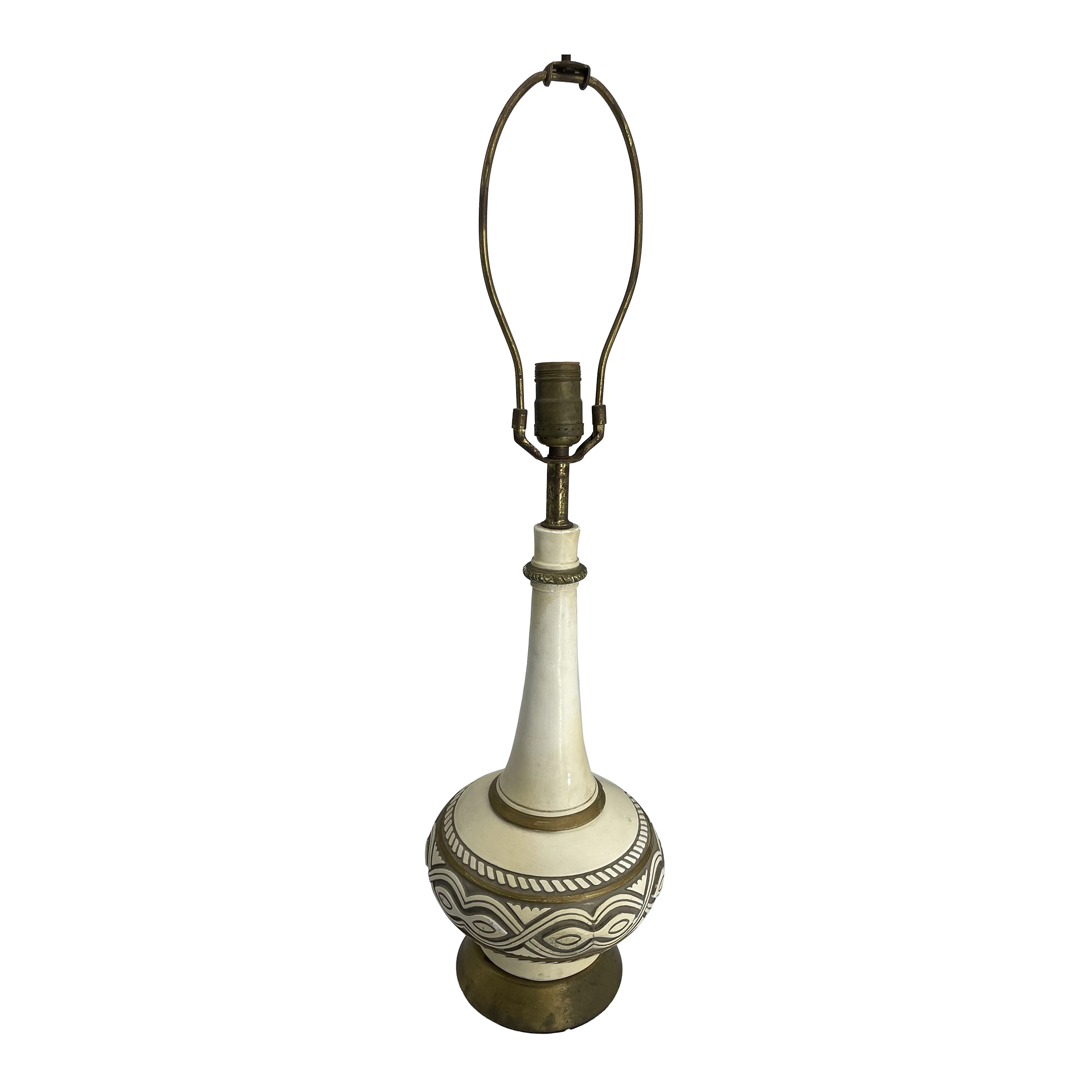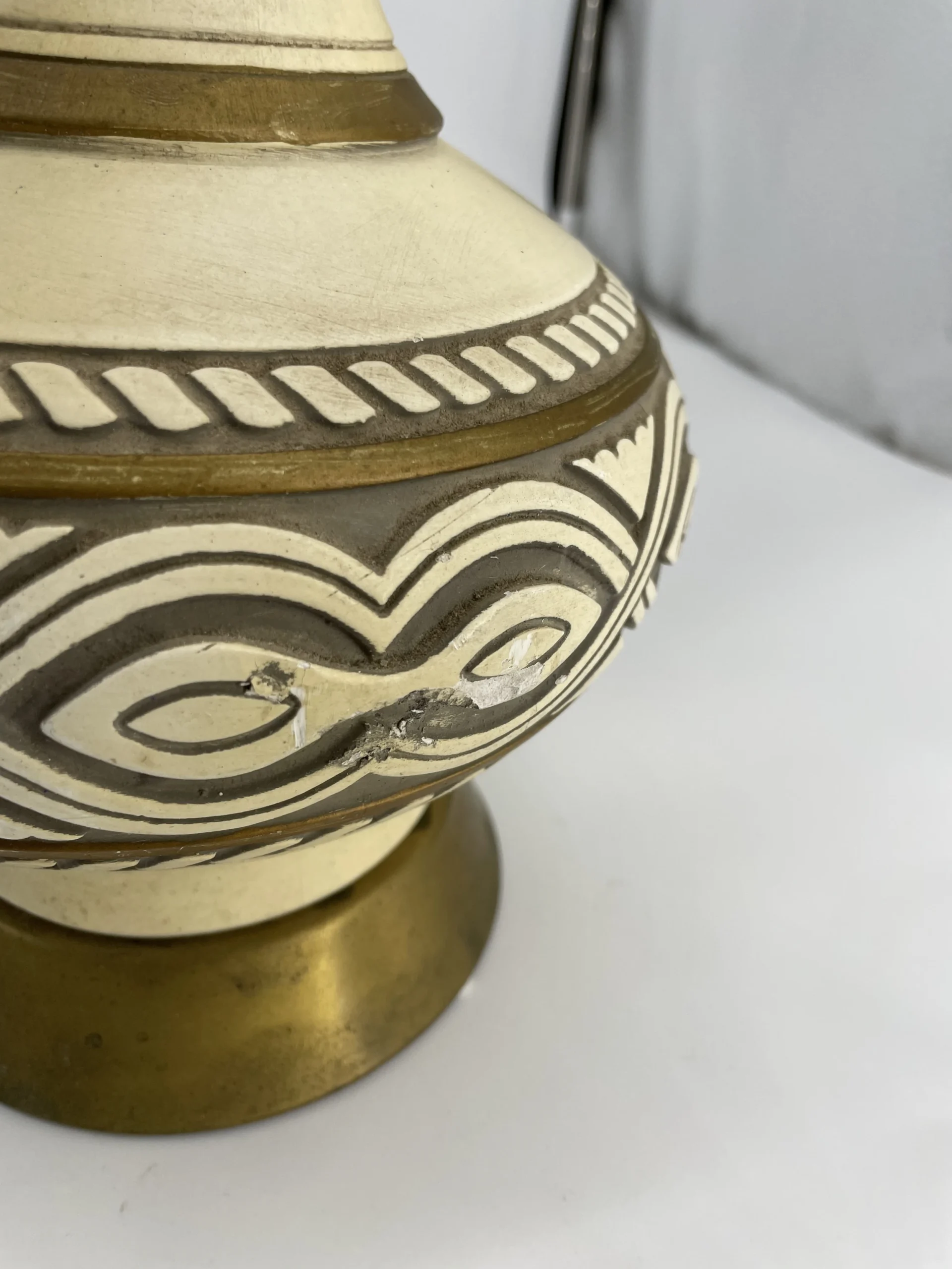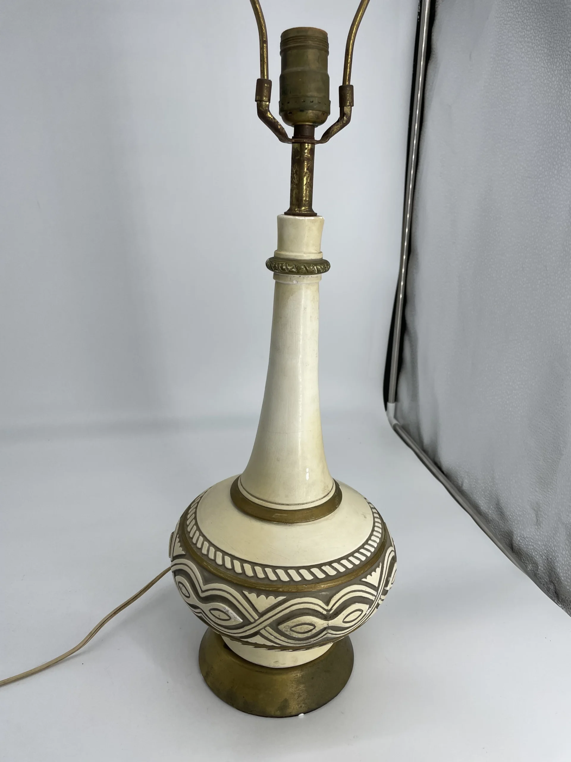 This groovy table lamp is very similar in style to other Quartite Creative lamps, however there is no makers mark present. Lamp is mounted on brass-toned base and has a lovely design around its wide center before tapering off up to neck.