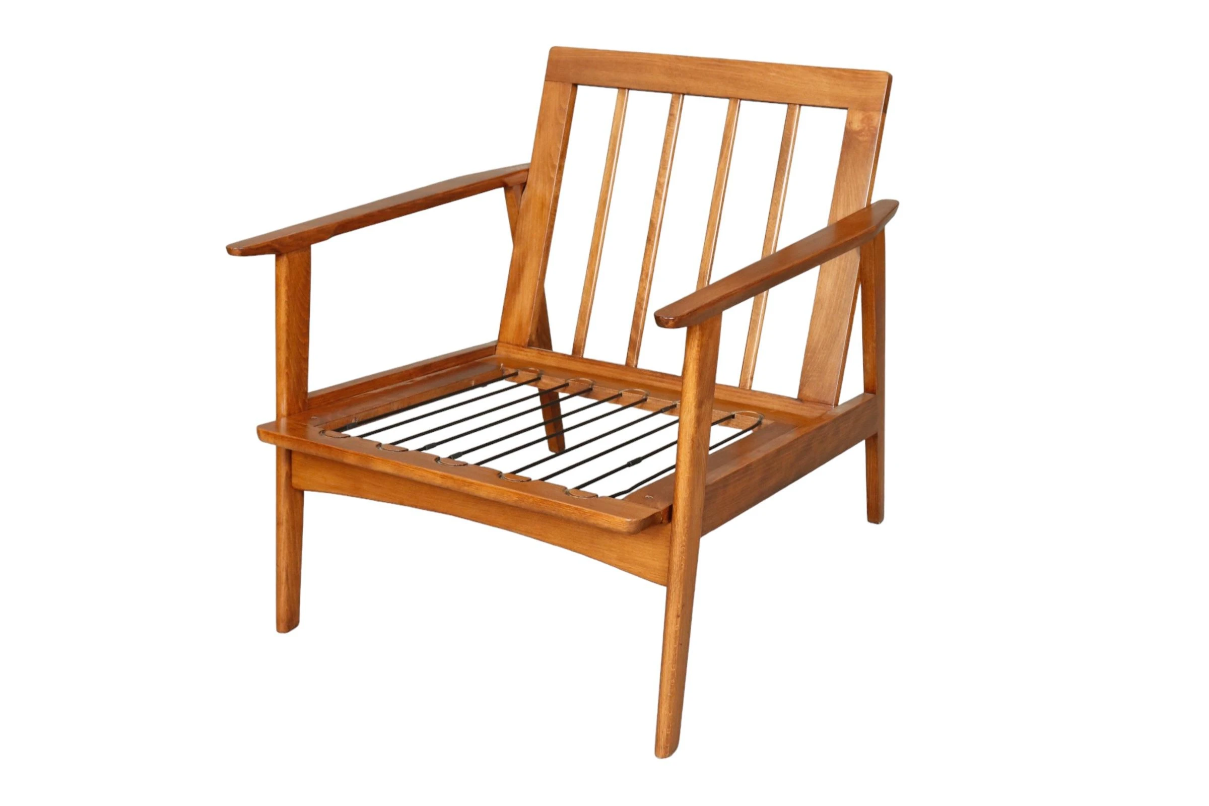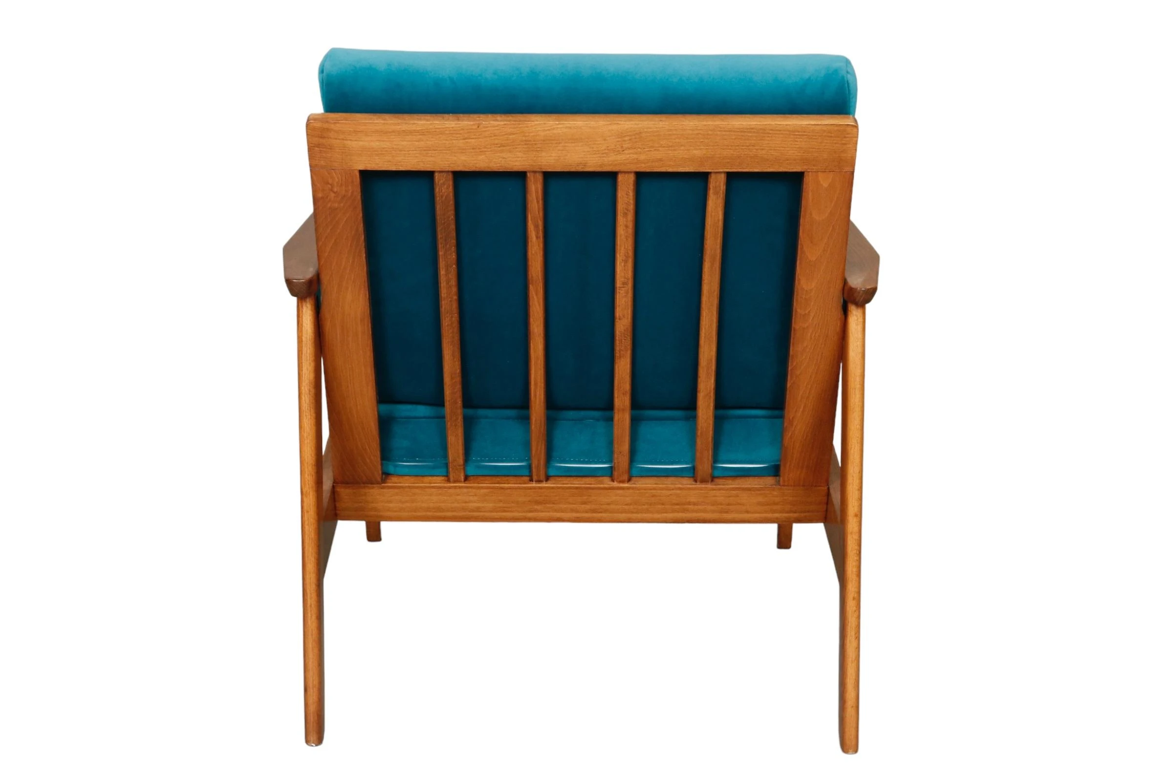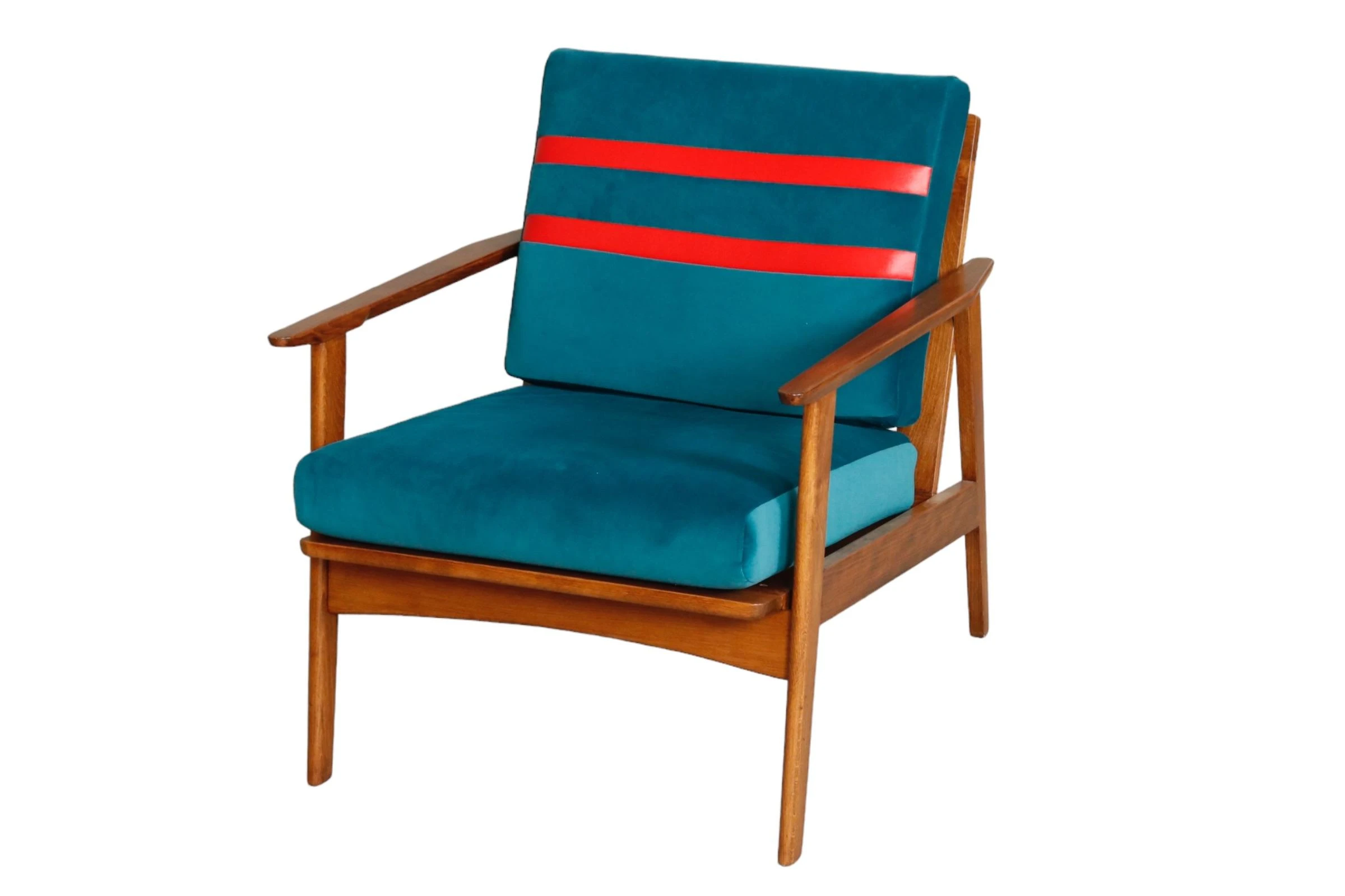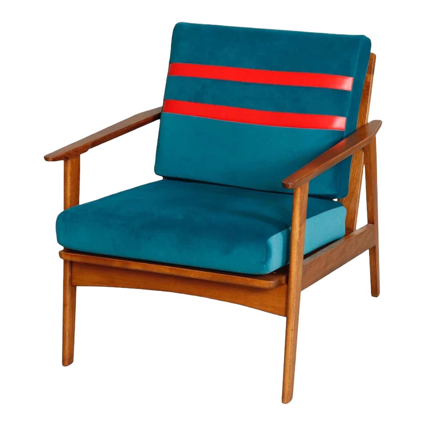 A 1960’s Danish mid century modern lounge chair made of solid teak. New upholstery with teal velvet and red striped cushions.