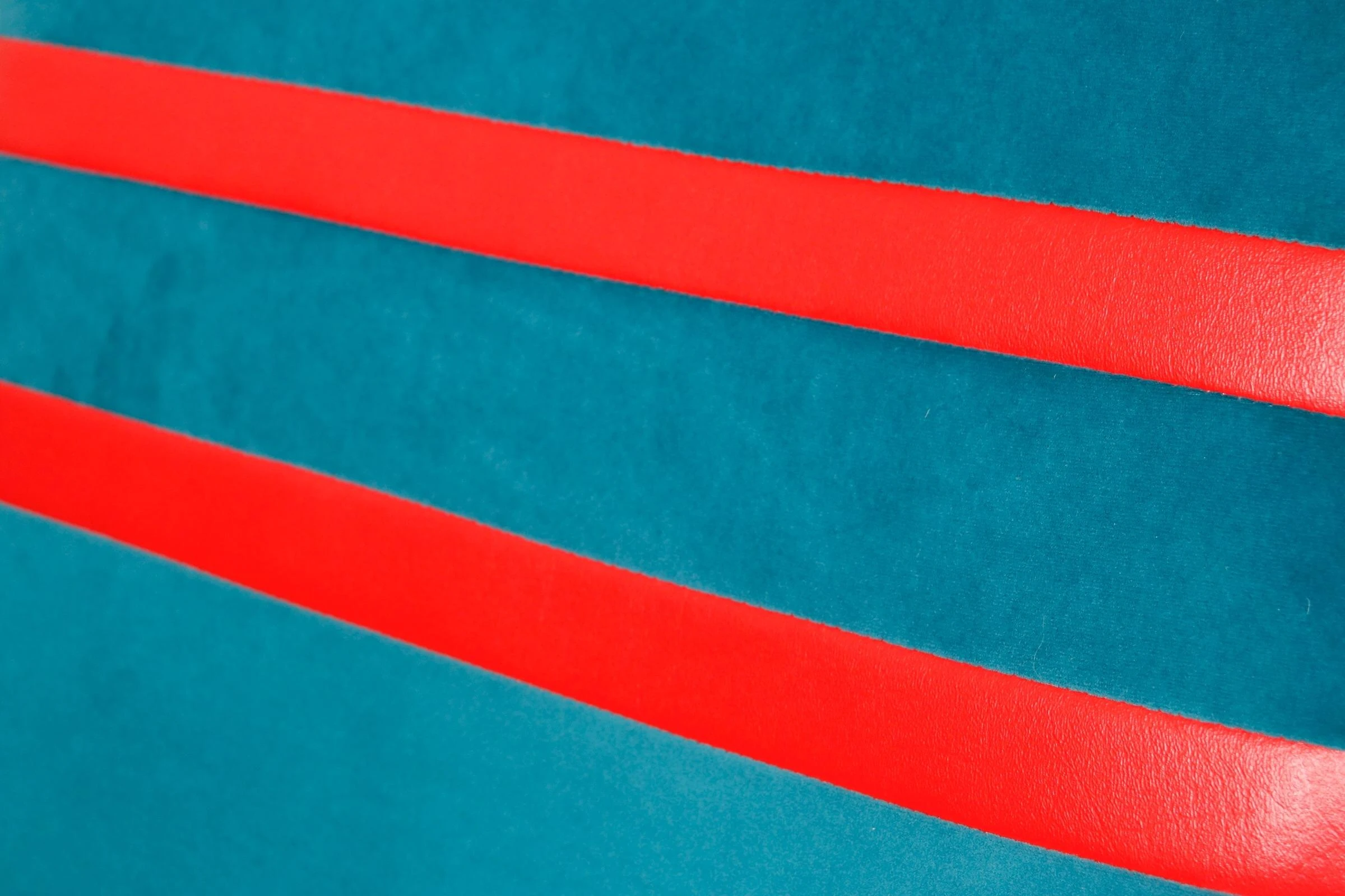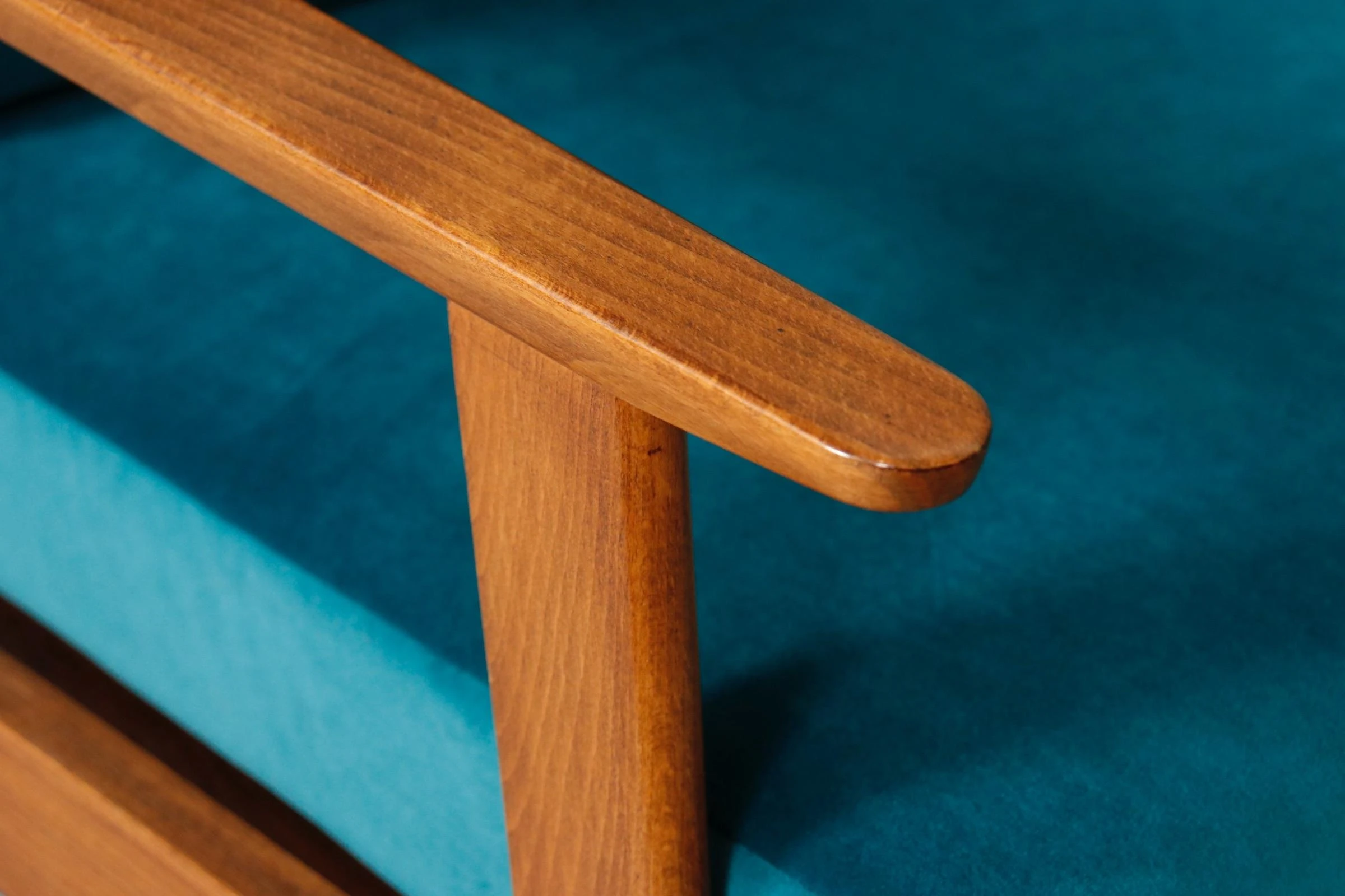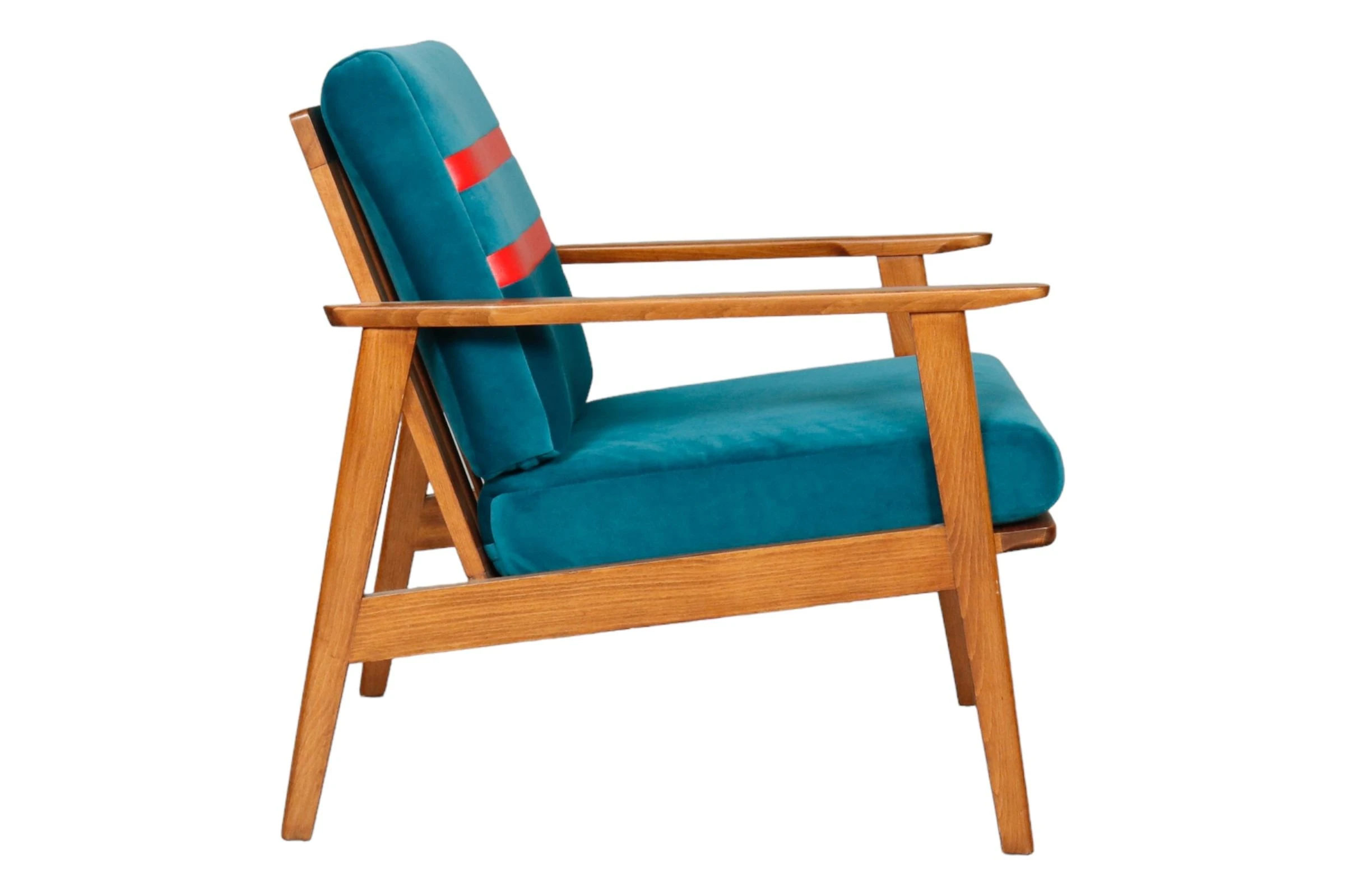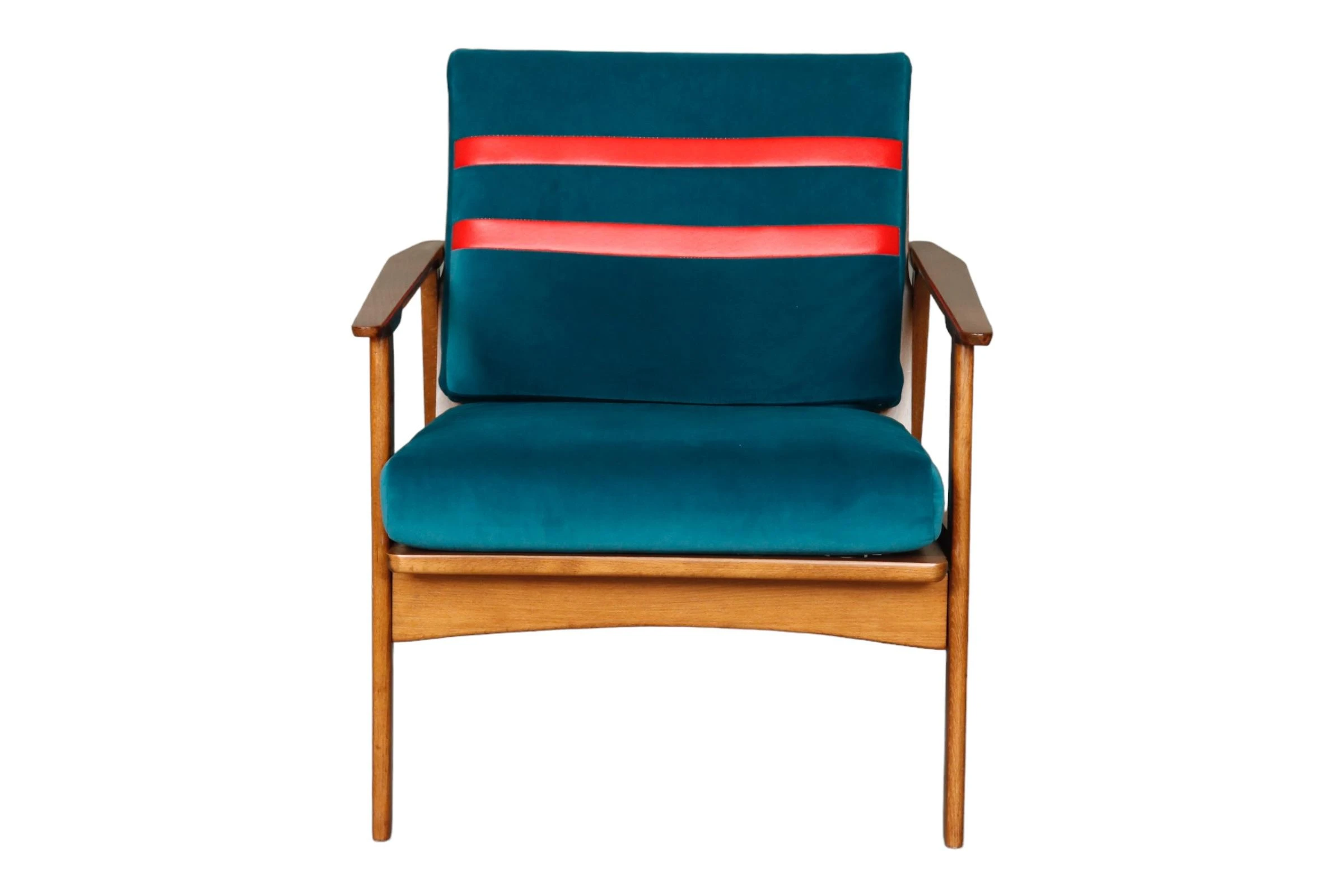 A 1960’s Danish mid century modern lounge chair made of solid teak. New upholstery with teal velvet and red striped …