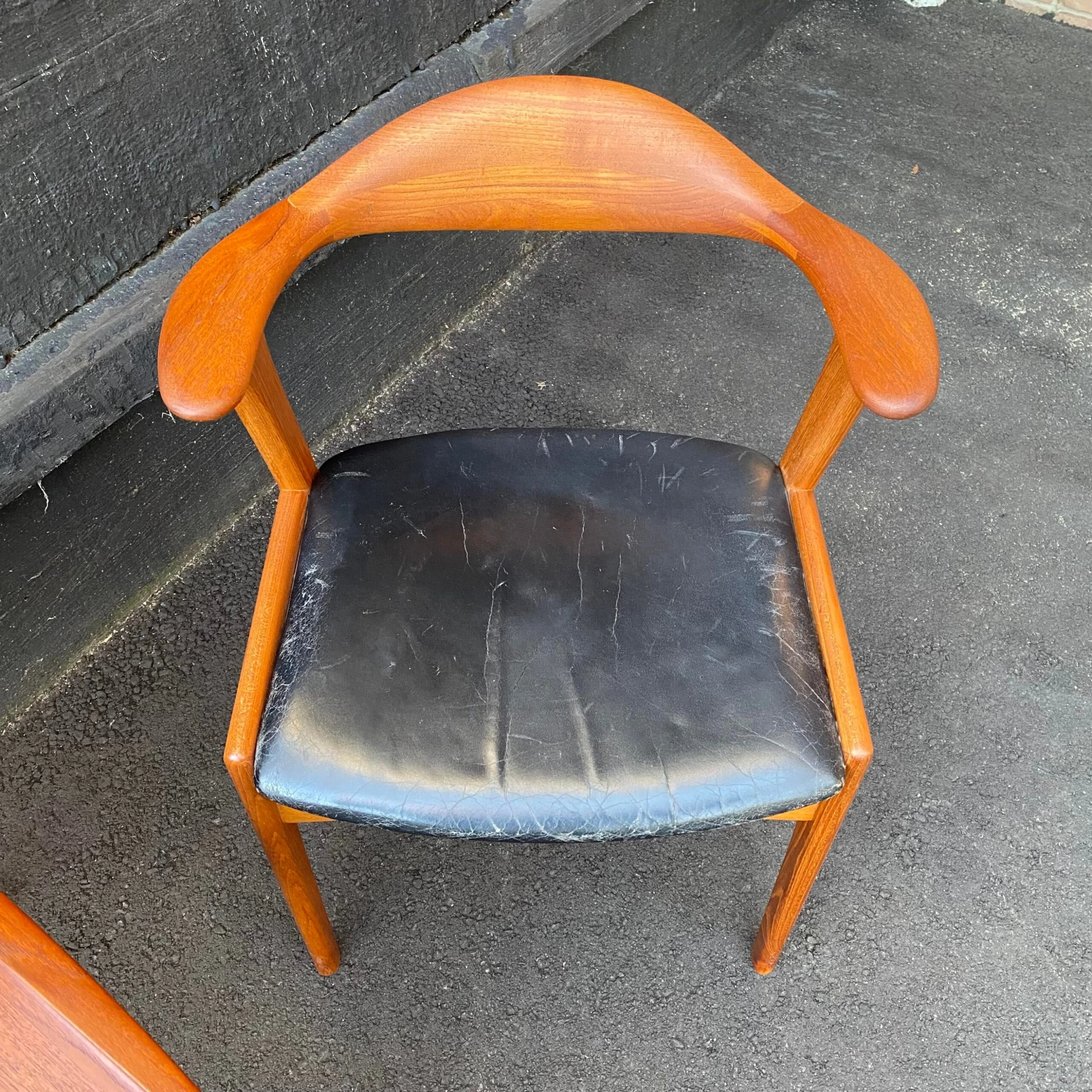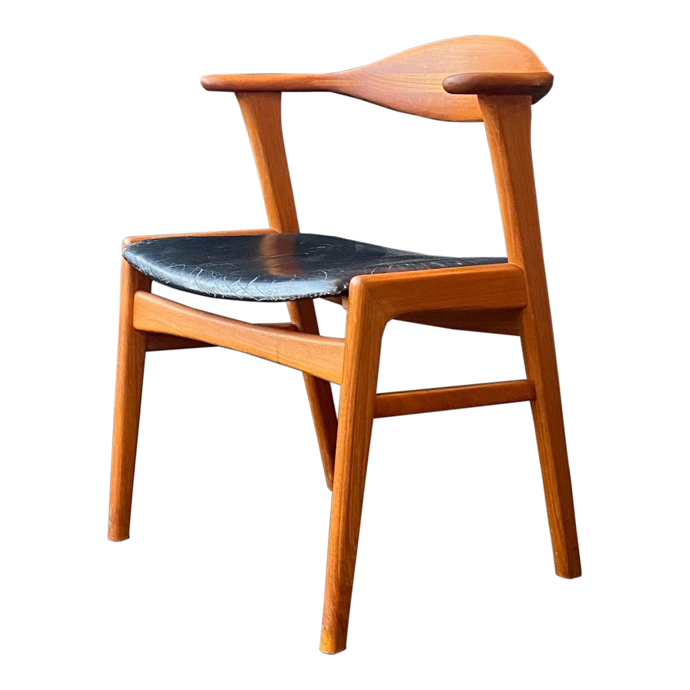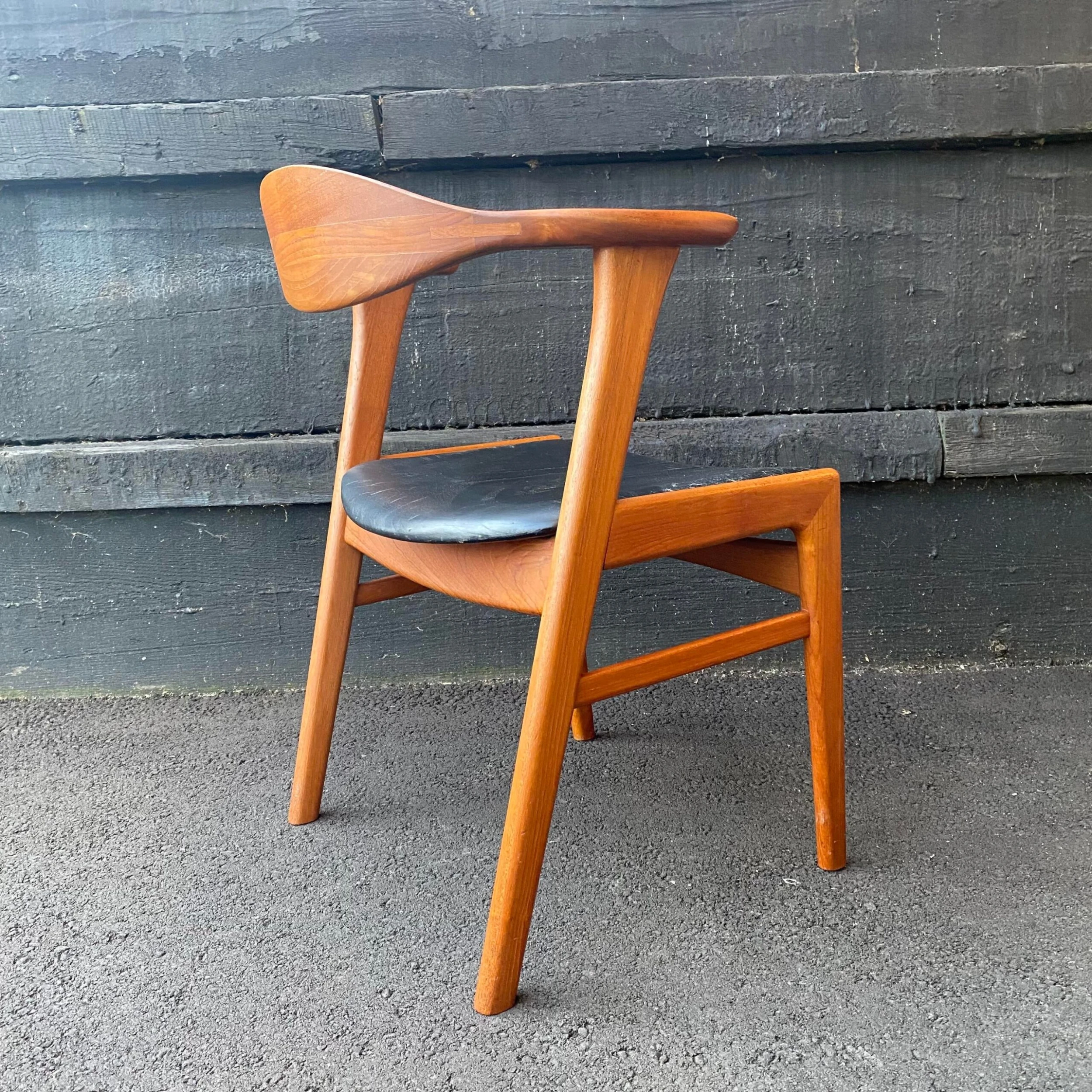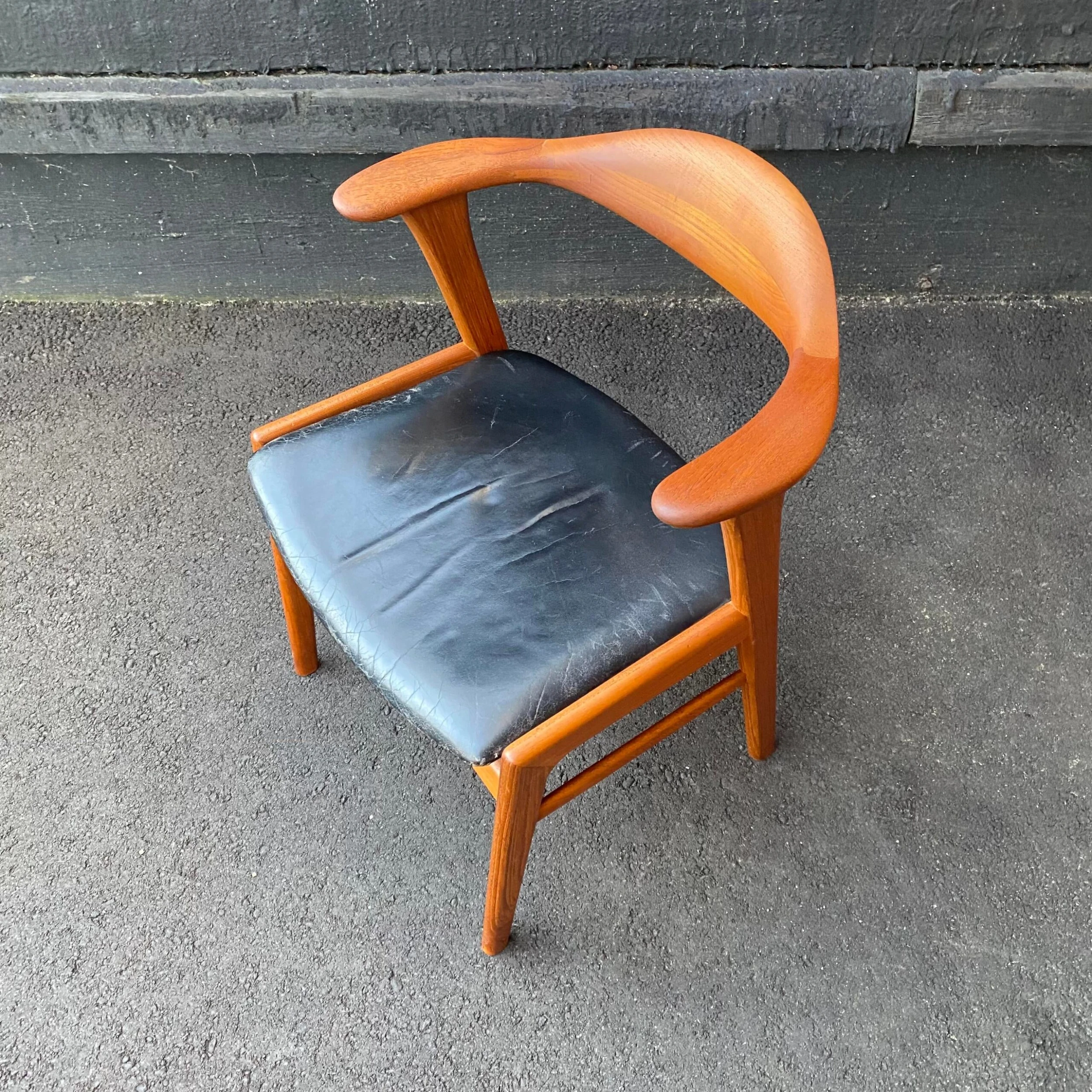 This is an excellent vintage 1960’s Danish Modern Teak with black leather Desk Armchair by Erik Kirkegaard for Høng Stolefabrik, ca. 1960’s, Denmark. The chair is stately, yet compact. It commands attention but does not fill the room. This chair was purchased in Denmark and brought to the States in 1982. It was never imported to the US for resale, which makes it a more uncommon piece.