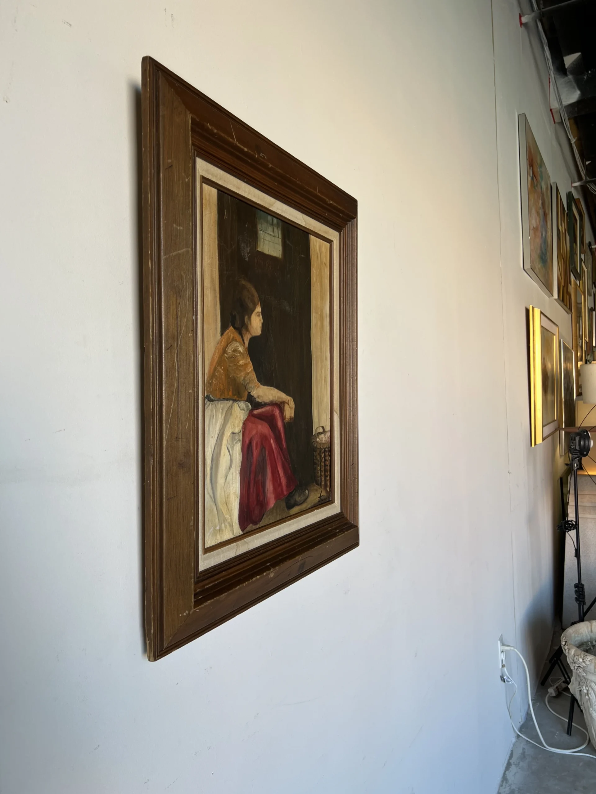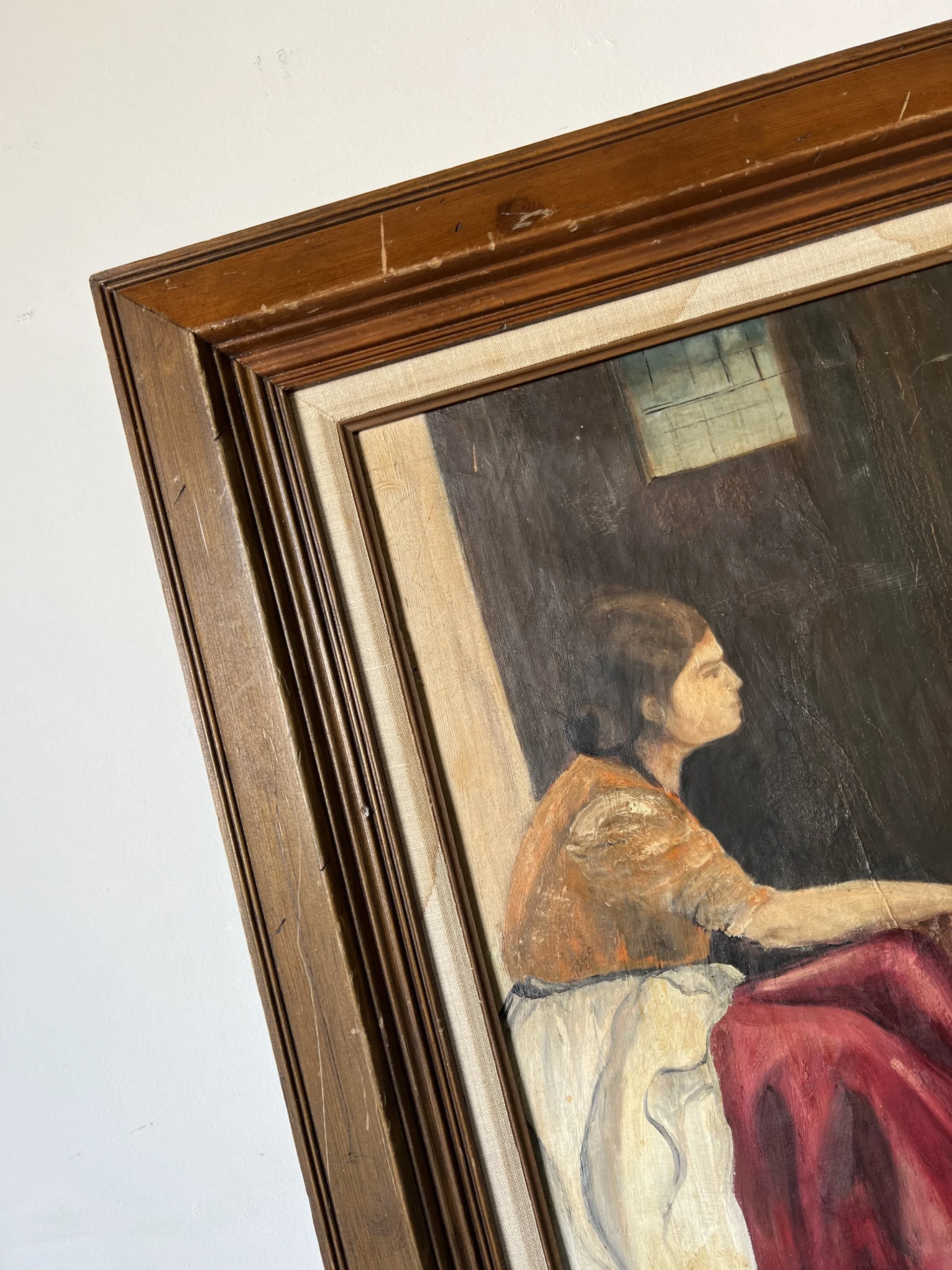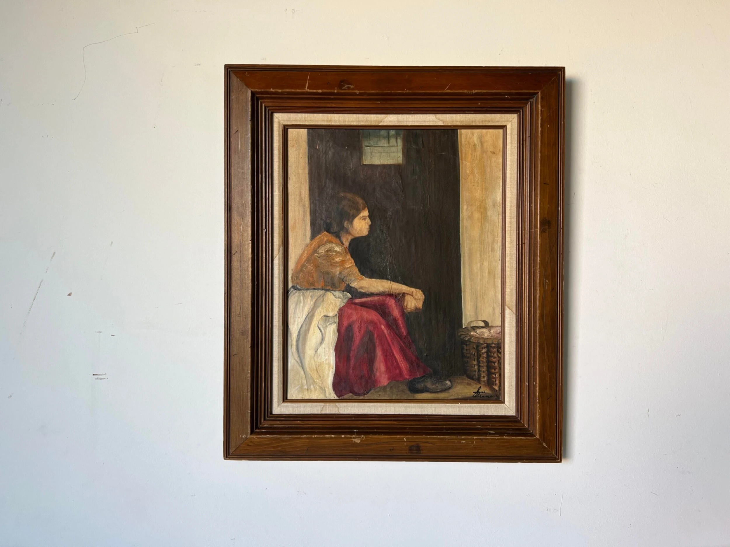 Available for sale this beautiful vintage oil painting on canvas depicts a country Girl sitting