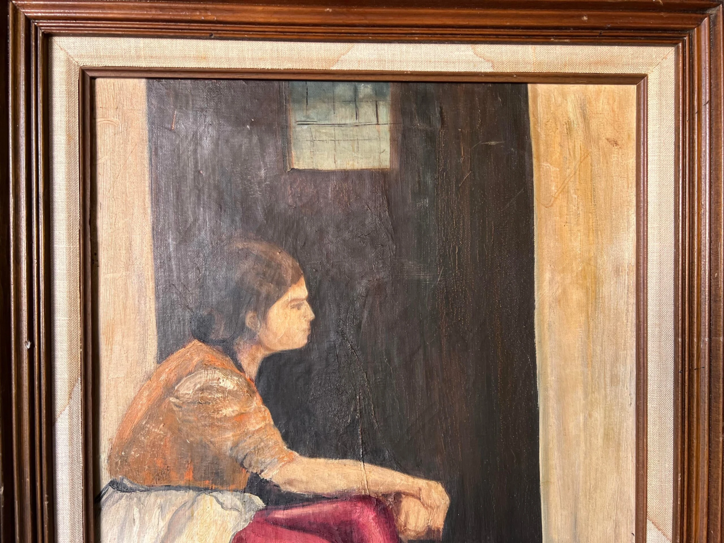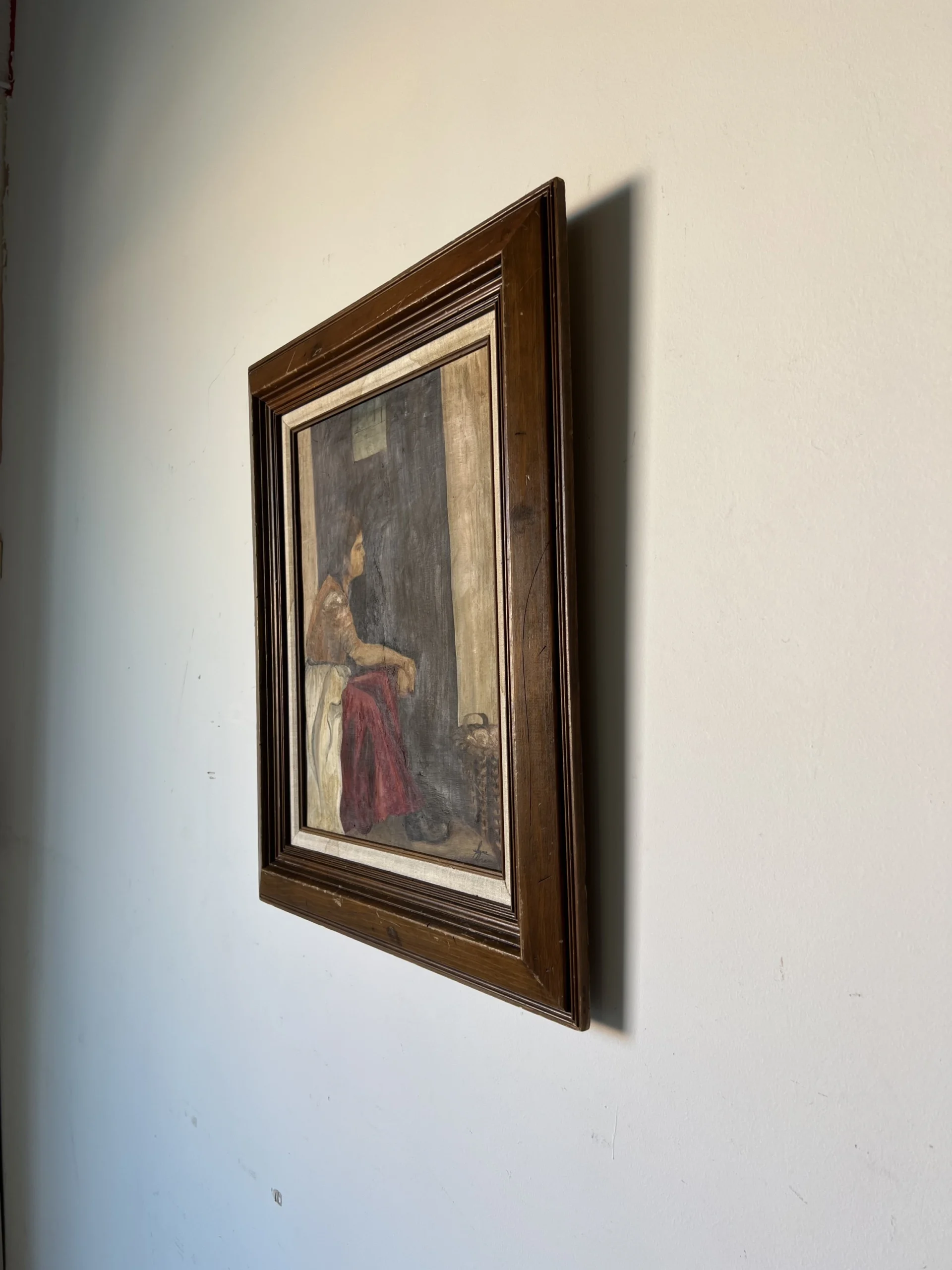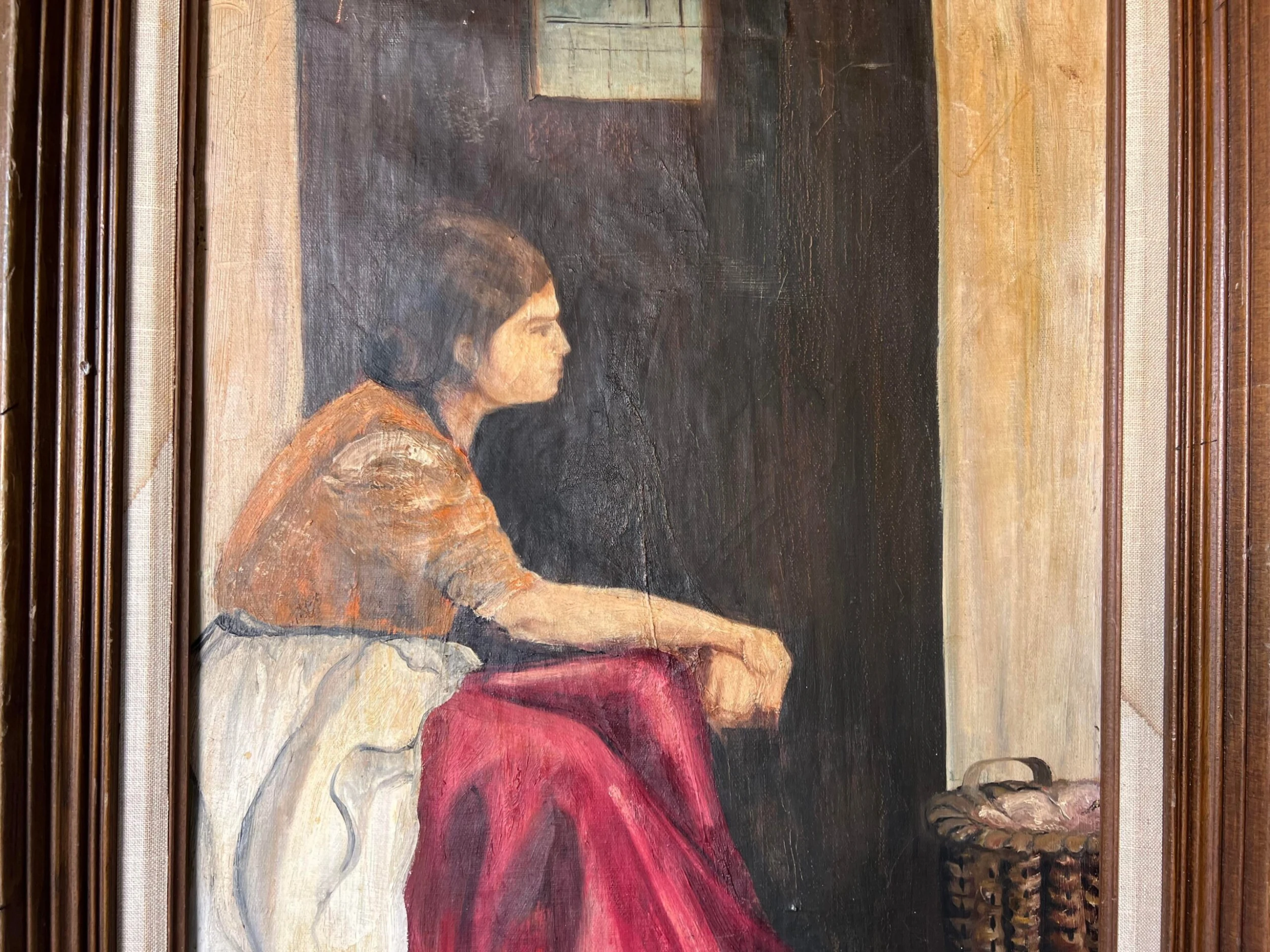 Available for sale this beautiful vintage oil painting on canvas depicts a country Girl sitting