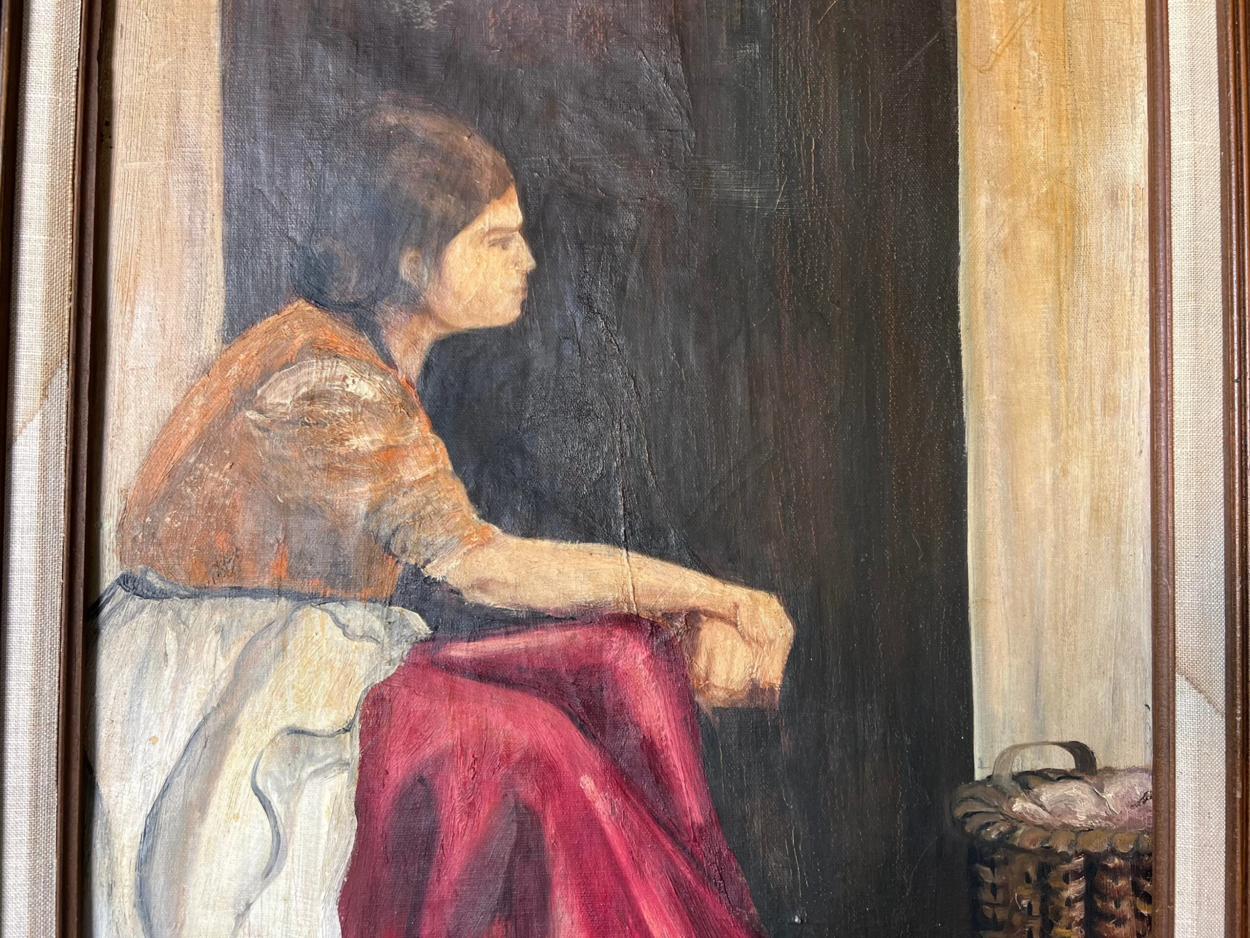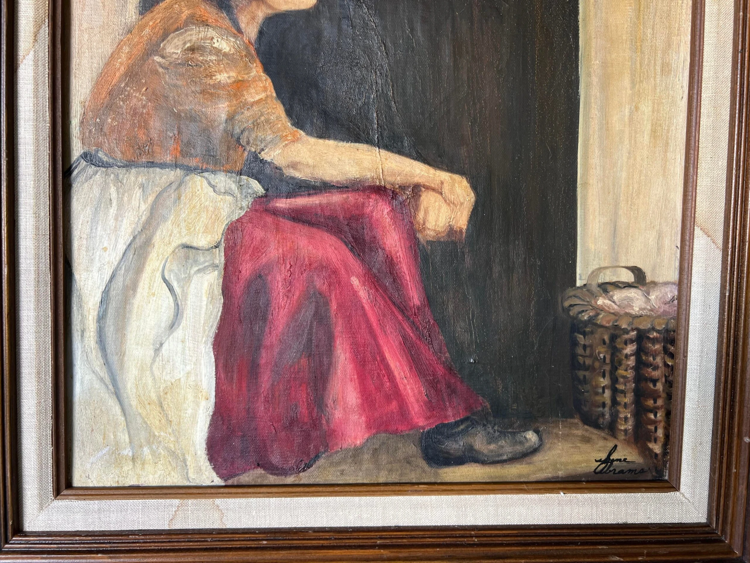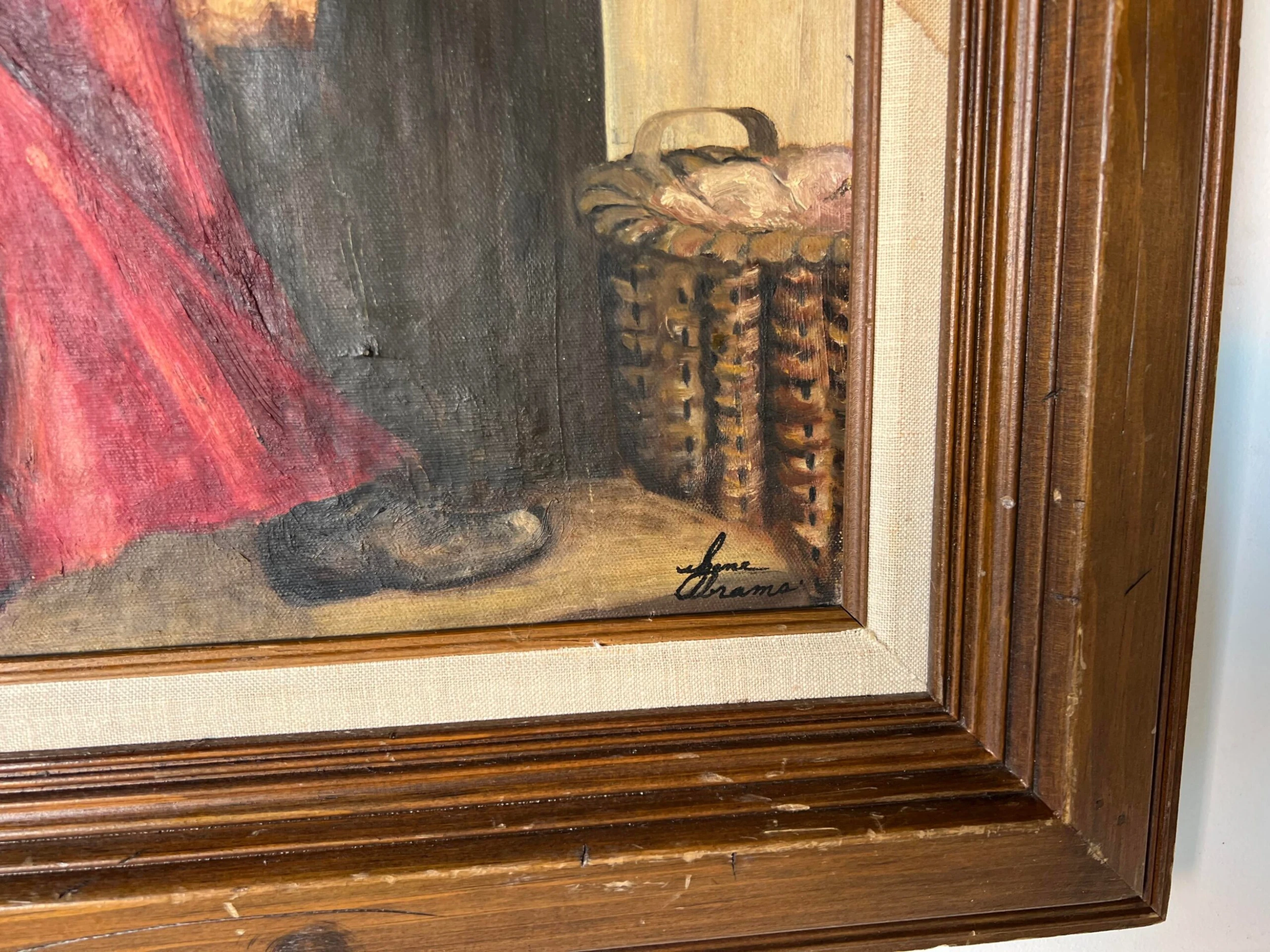 next to a door and a basket in front of her. This impressionistic painting of the peasant country girl is signed lower right side by Elena Abrams and circa of 1960’s . Wonderful housewarming gift or addition to your rustic farmhouse decor home.