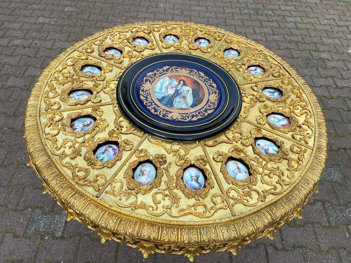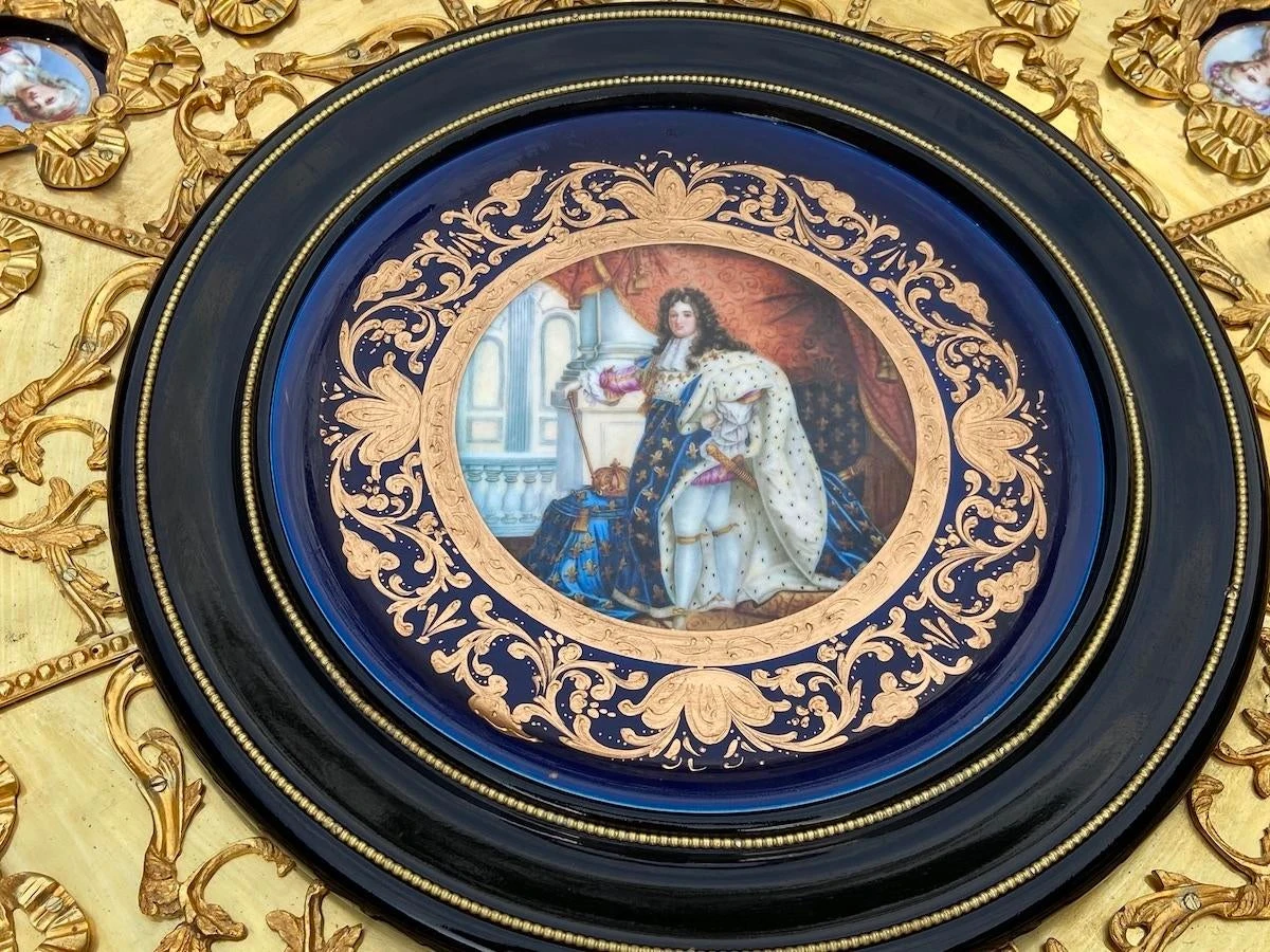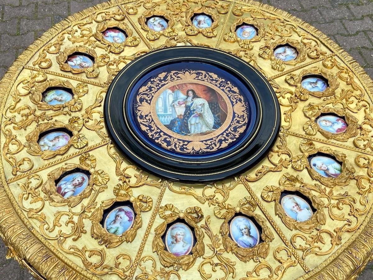 Around him we find 16 porcelain portraits of famous French women of the 19th century in France. The colours on all the portraits are beautifully light and vibrant, very clear and precise work. They also portray the garments of the times very convincingly. Every small miniature has its own decorations around it in the form of the classical French Louis XVI bows.