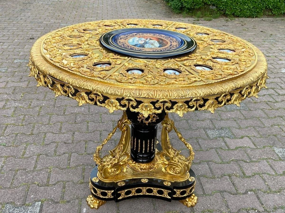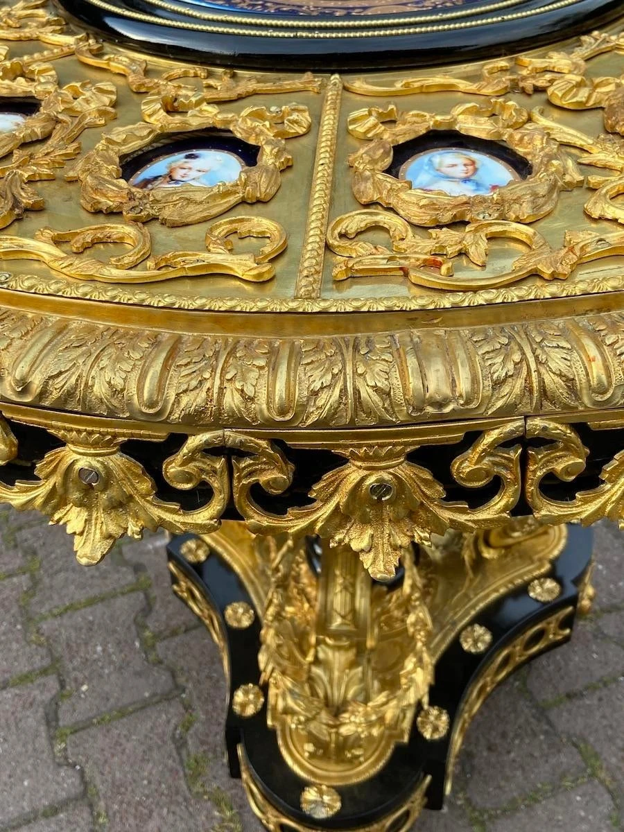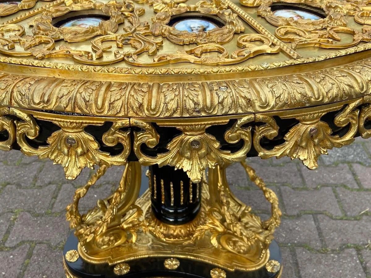 The table top itself was also very beautifully crafted. The edges are also of heavily gilded bronze quality in the authentic and typical Louis XVI decorations. The legs of the table are triangles, in gilded bronze again combined with black wood.