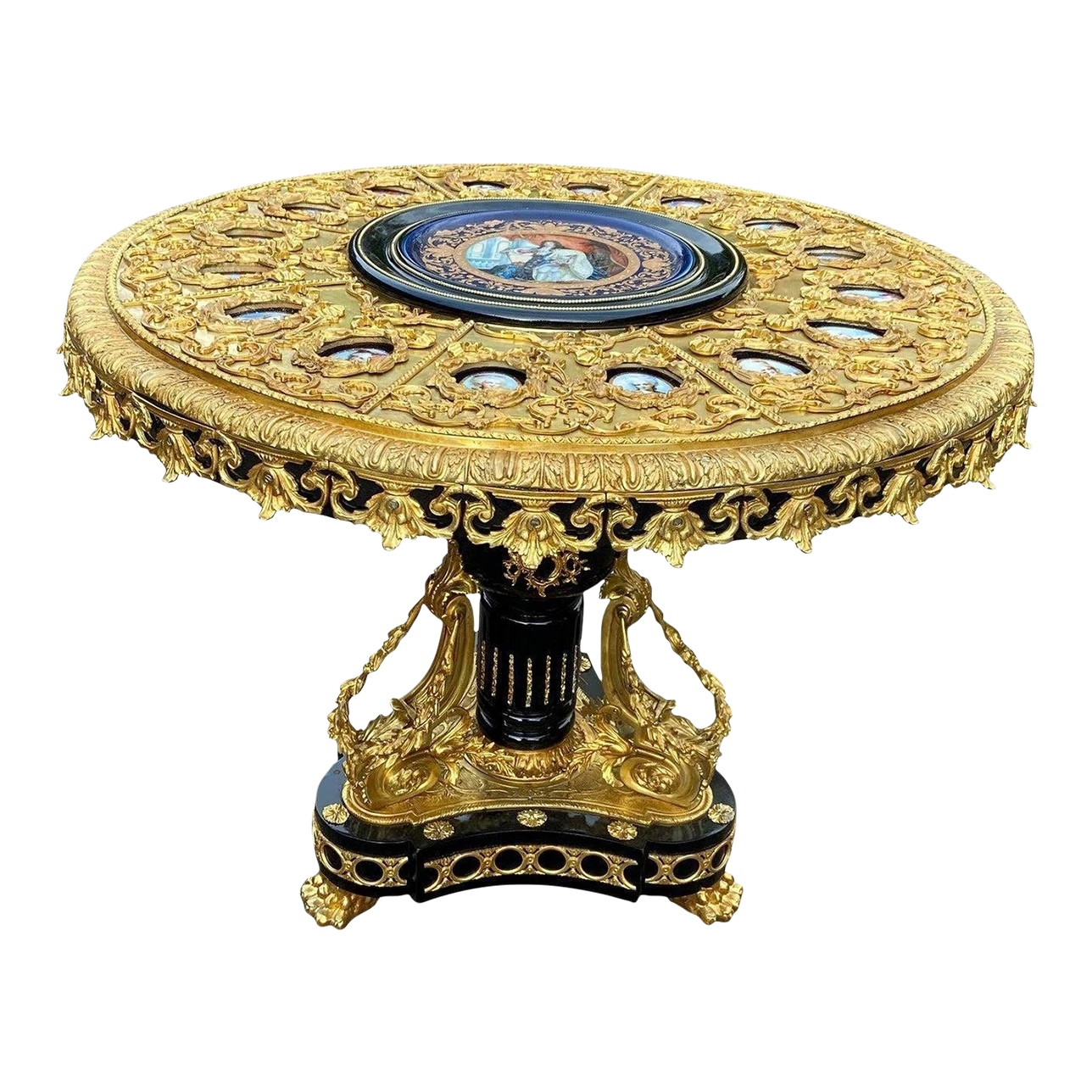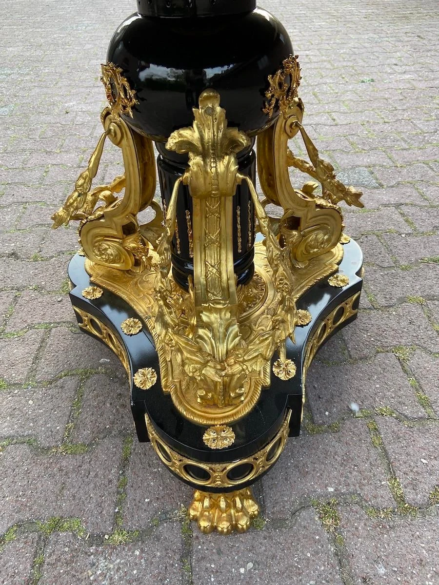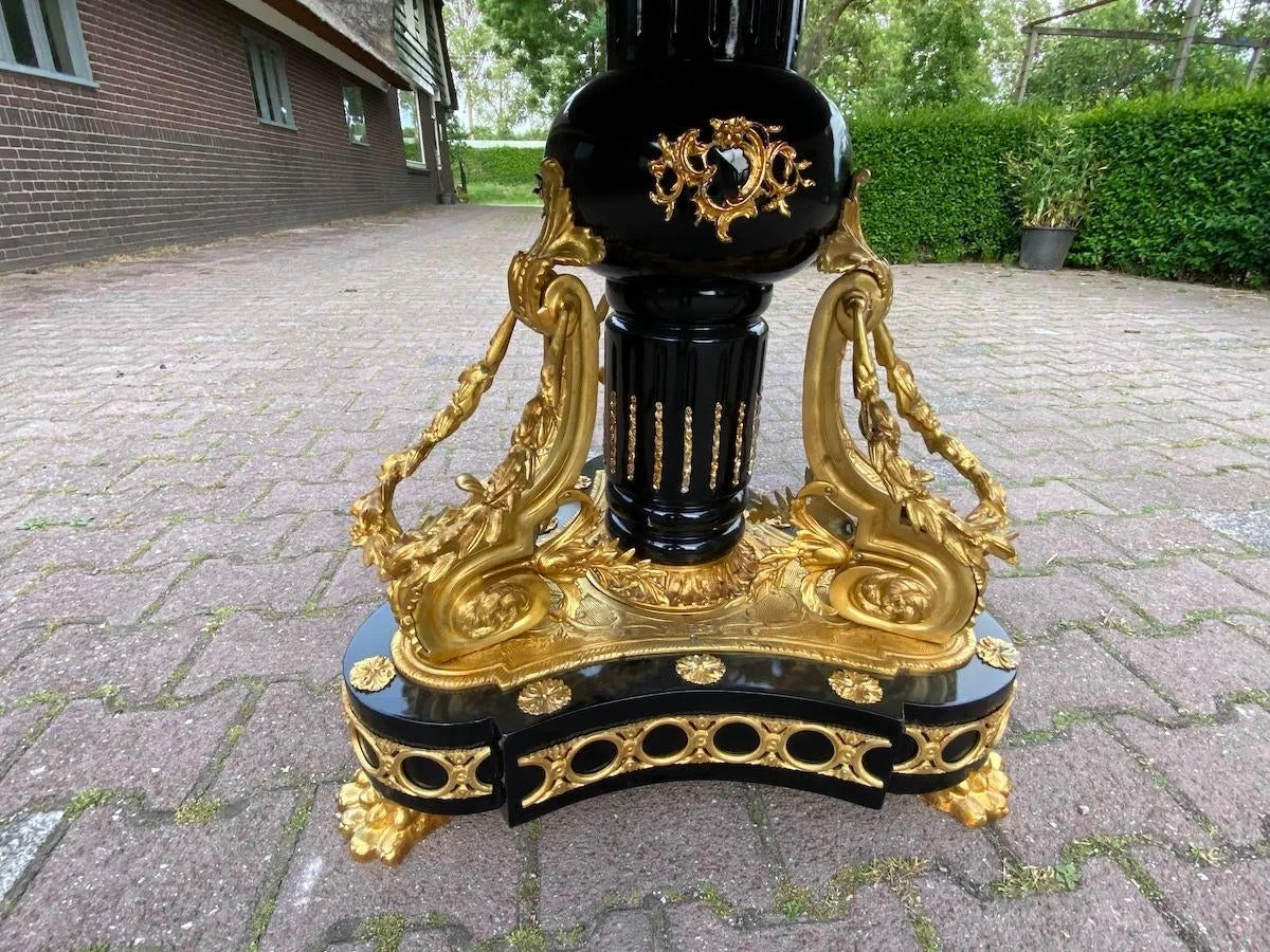 The table top itself was also very beautifully crafted. The edges are also of heavily gilded bronze quality in the authentic and typical Louis XVI decorations. The legs of the table are triangles, in gilded bronze again combined with black wood.