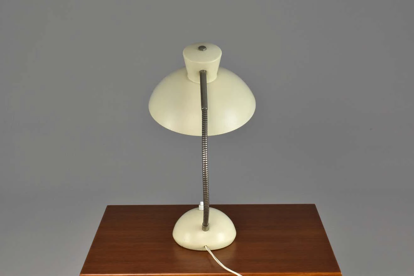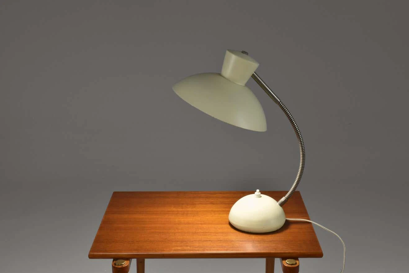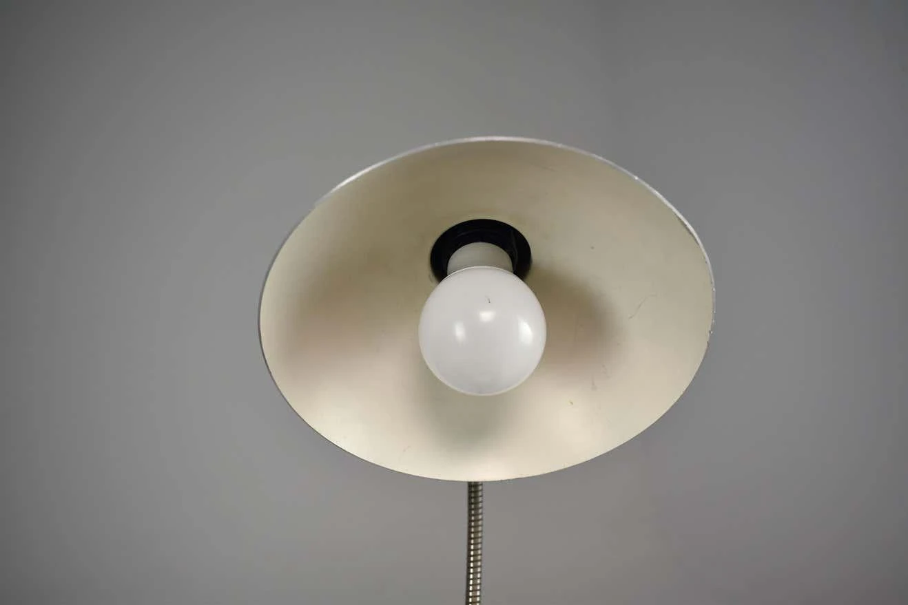 A fantastic mid-century vintage articulating desk light designed with a quality steel circular base and an aluminum shade in its original white lacquer. The base features a push-type switch and the arm is in steel.