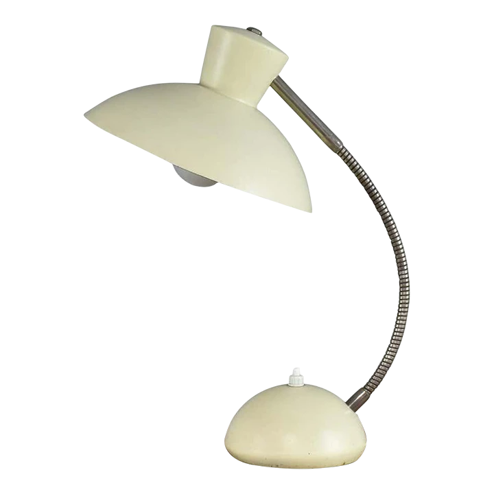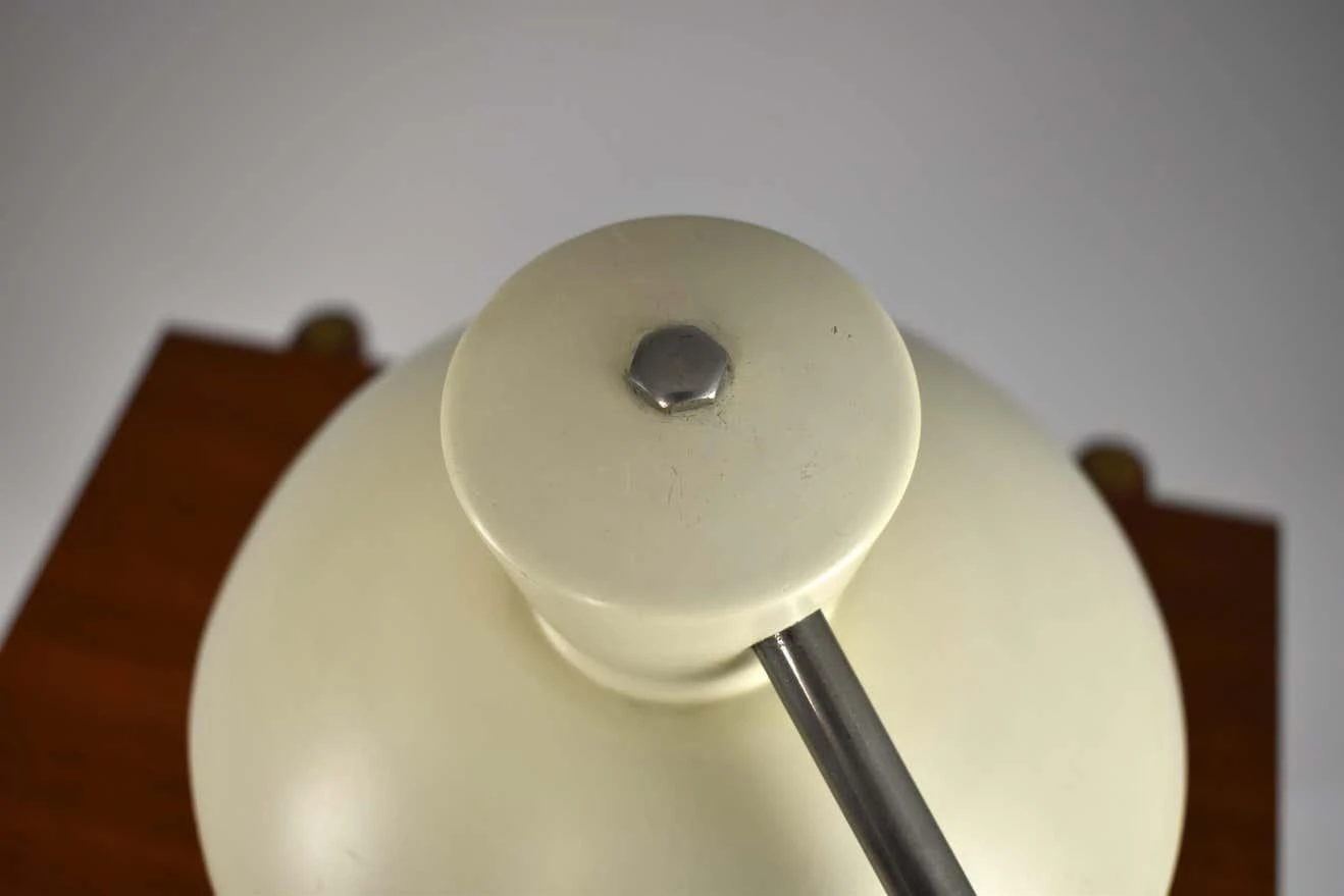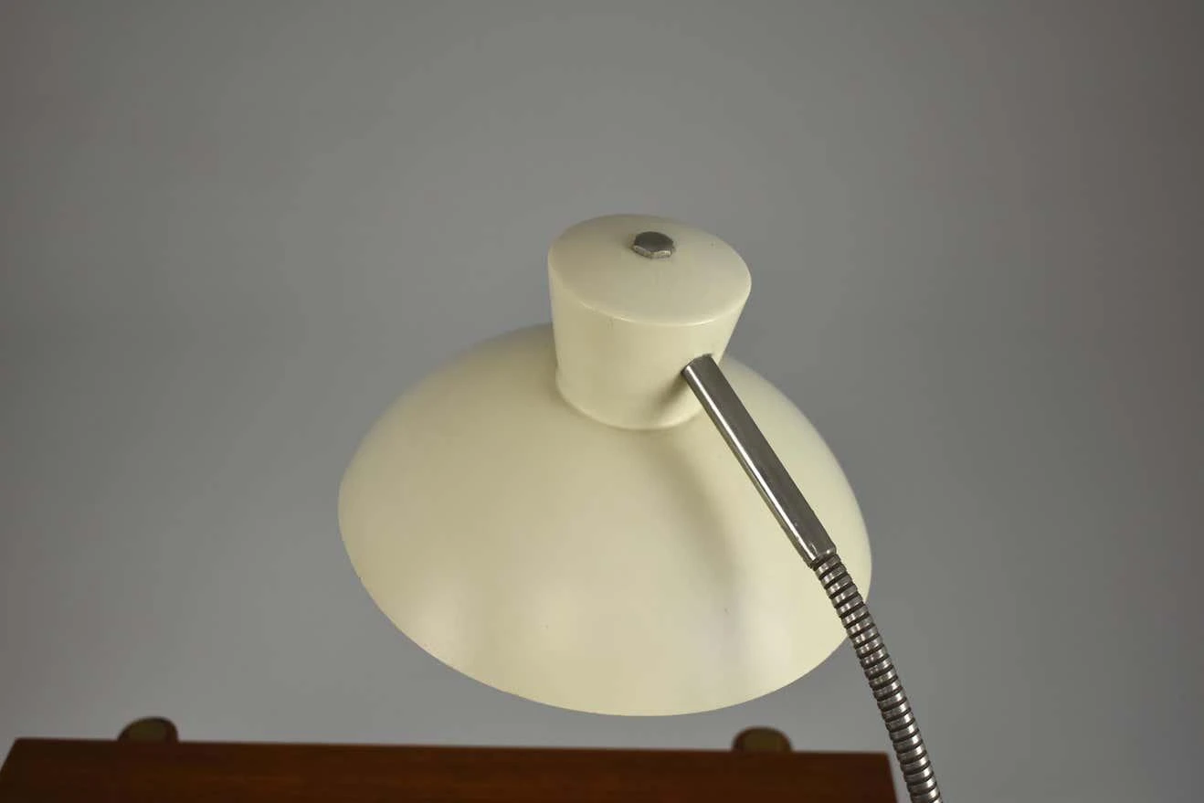 A fantastic mid-century vintage articulating desk light designed with a quality steel circular base and an aluminum shade in its original white lacquer. The base features a push-type switch and the arm is in steel.