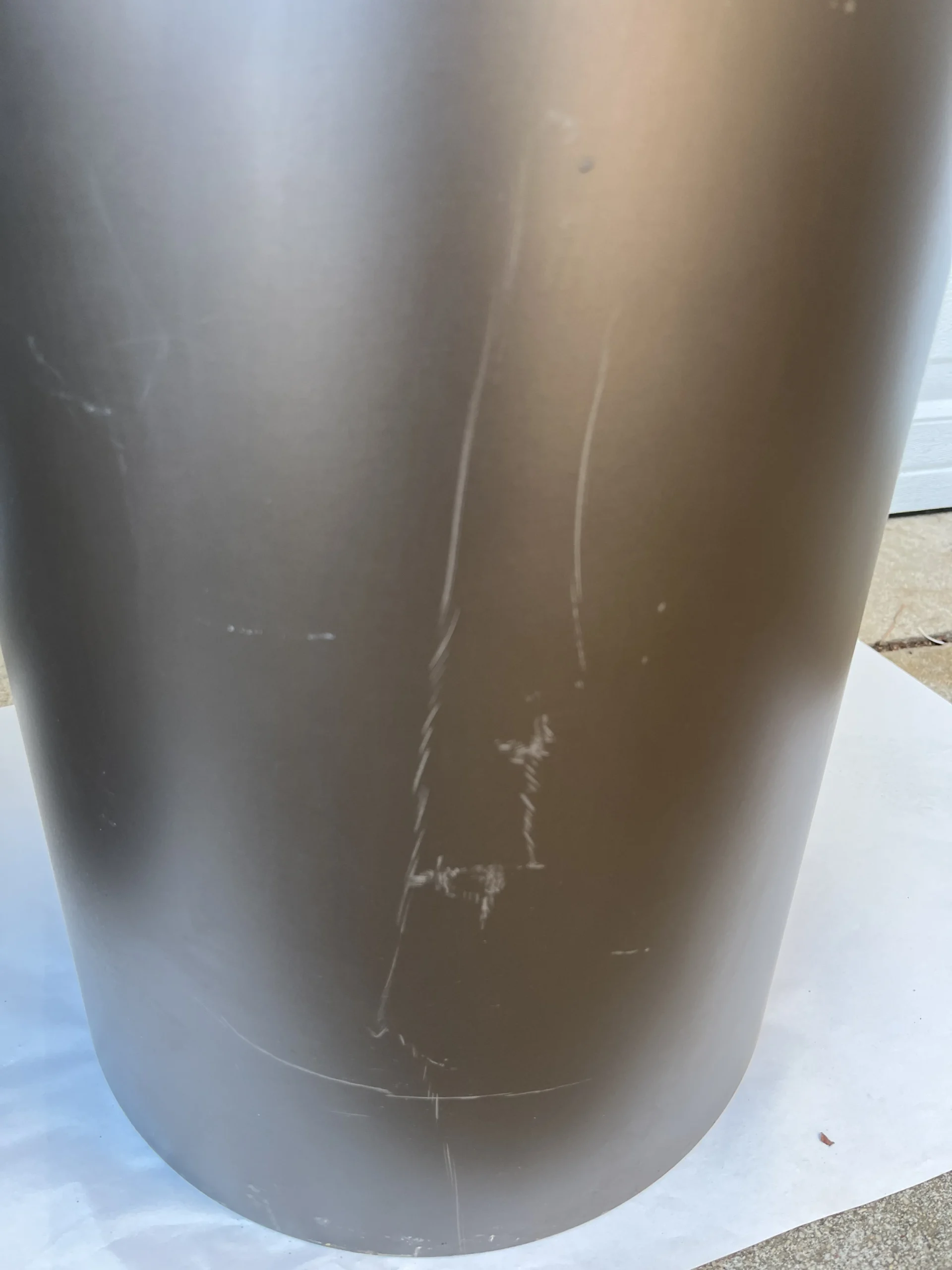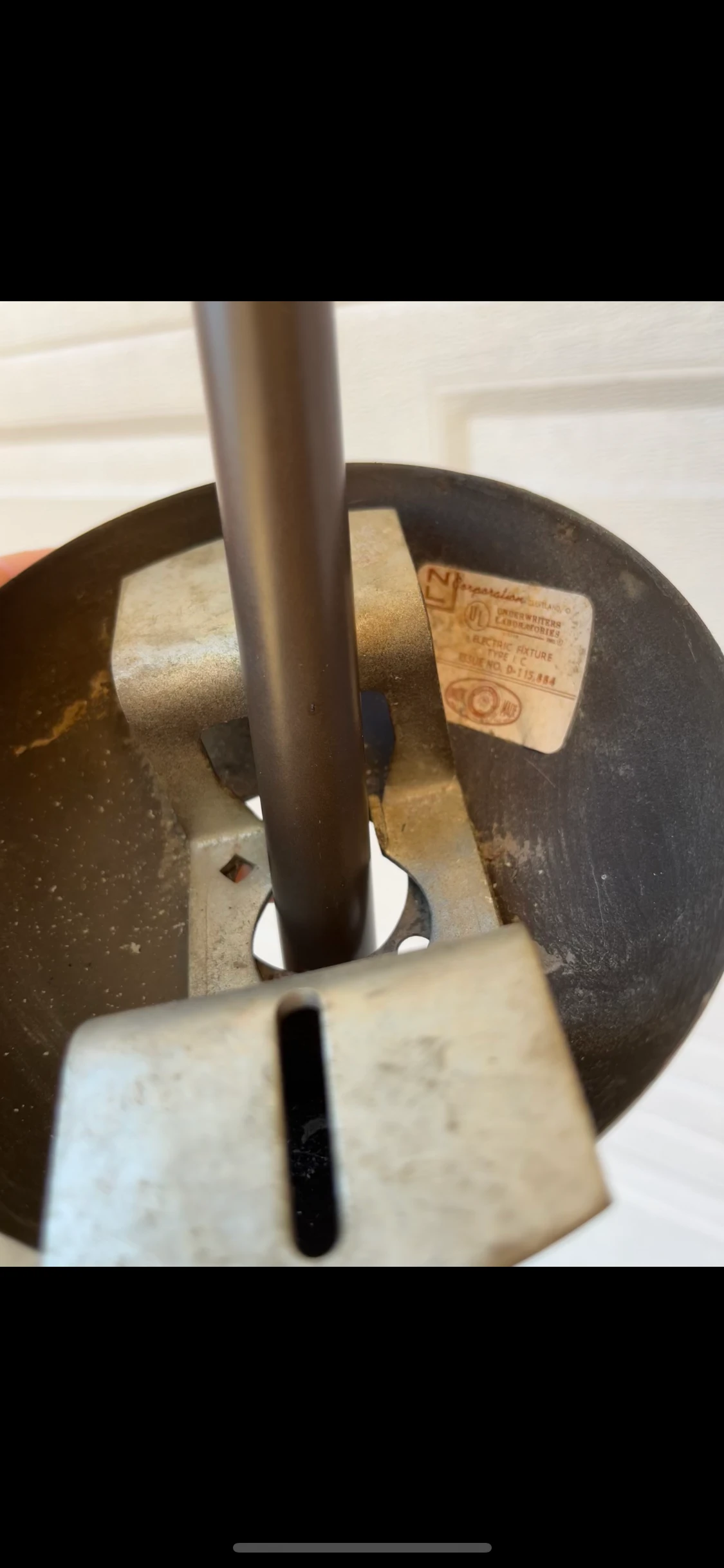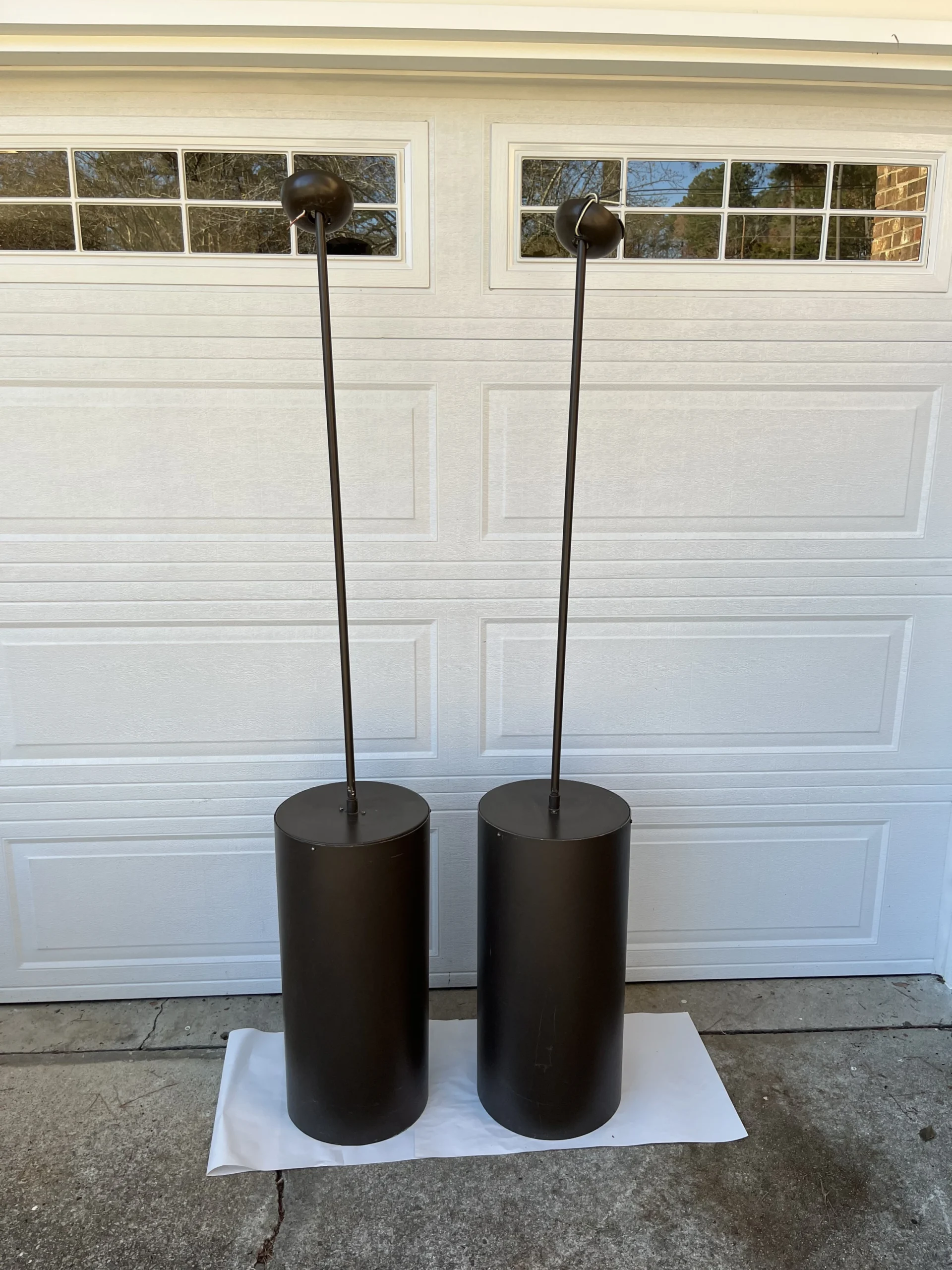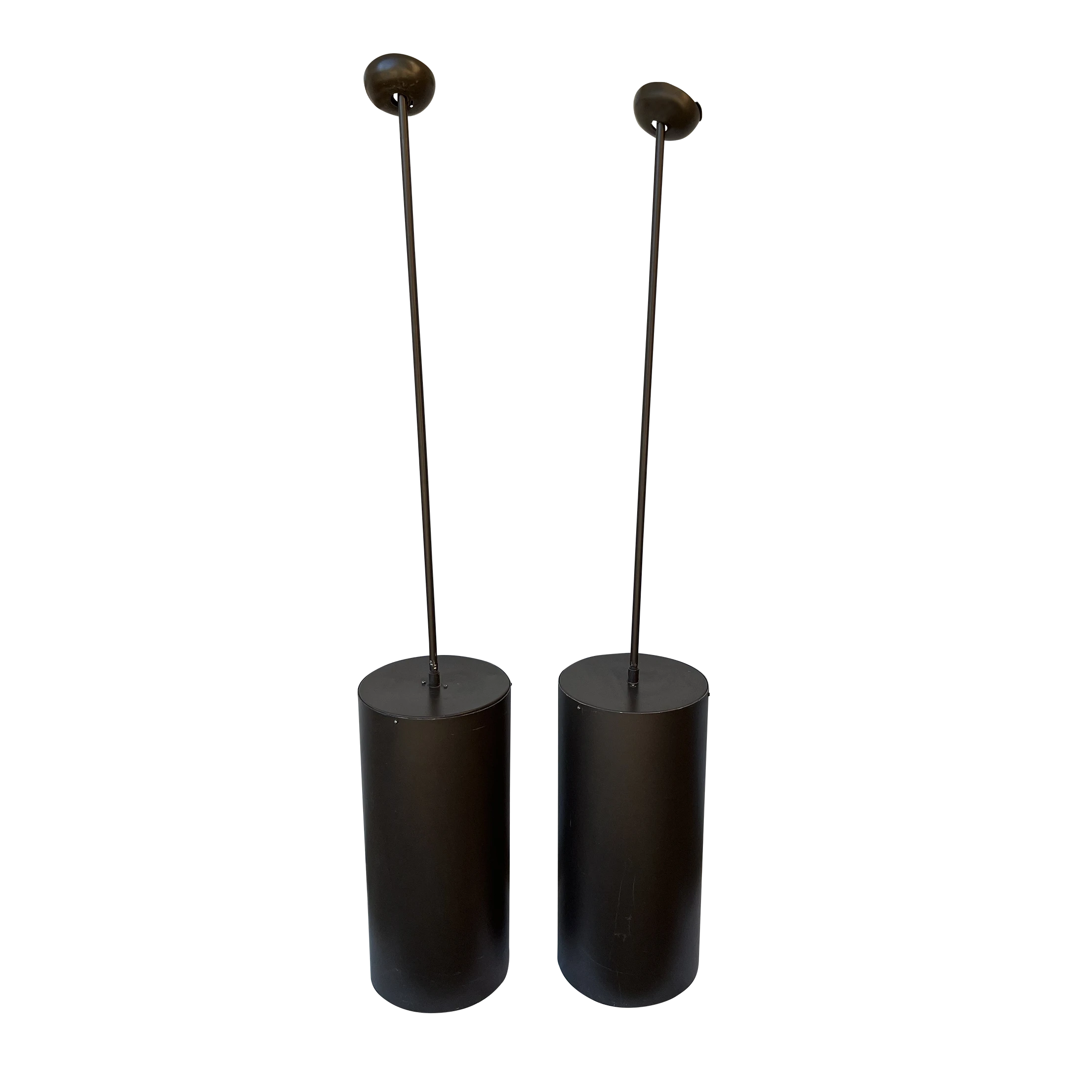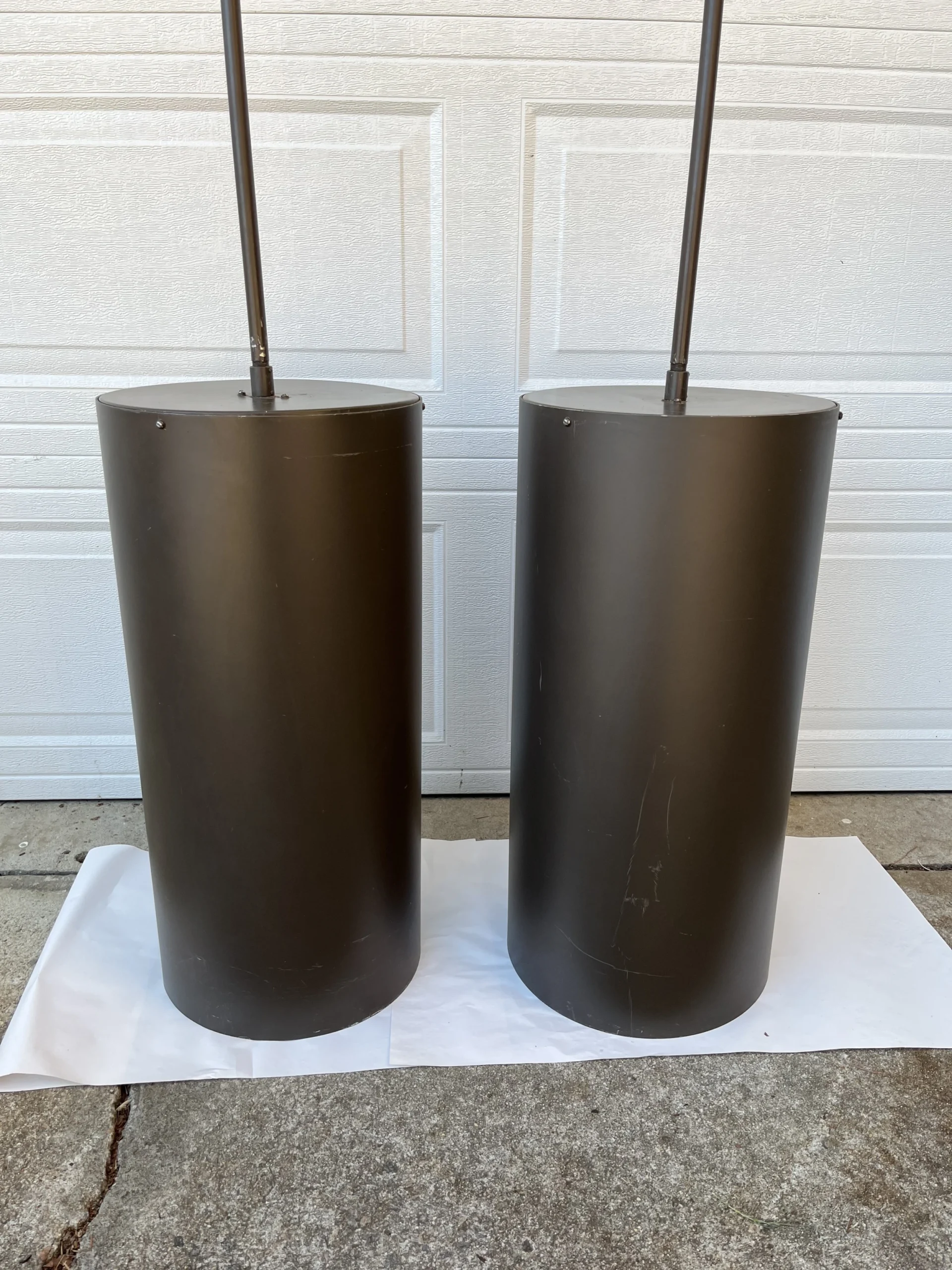 Gargantuan in scale these 1960’s minimalist pendants are made of brown metal with a reflective inside. The ceiling cap measures 5” in diameter and hides a mounting bar. These would be stunning in a kitchen over an island or in a stairway, anywhere there is a high ceiling! There is patina consistent with age, original wiring has not been tested since these were pulled out, the canister of one (see photos) has some scratches. 73”H total drop.