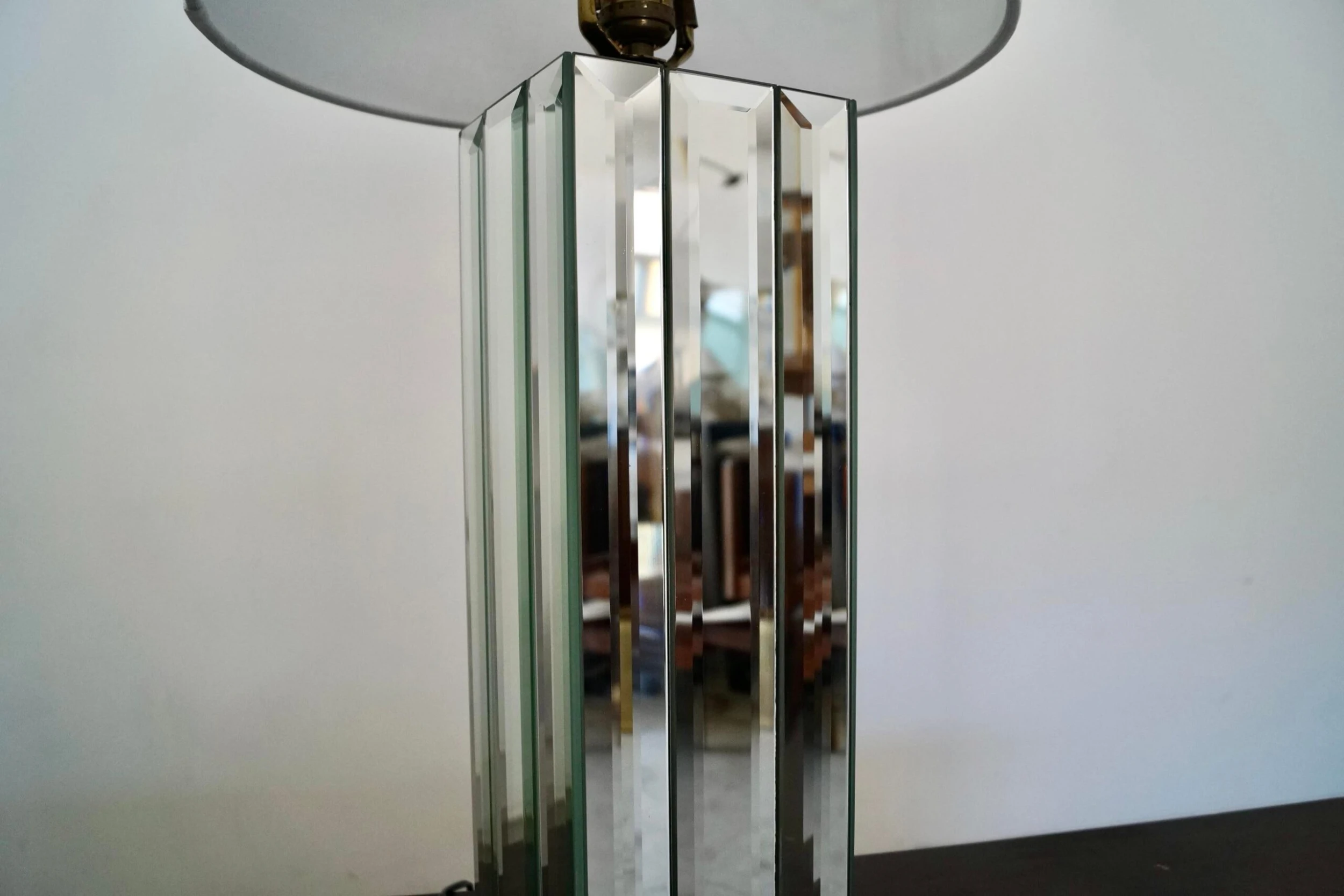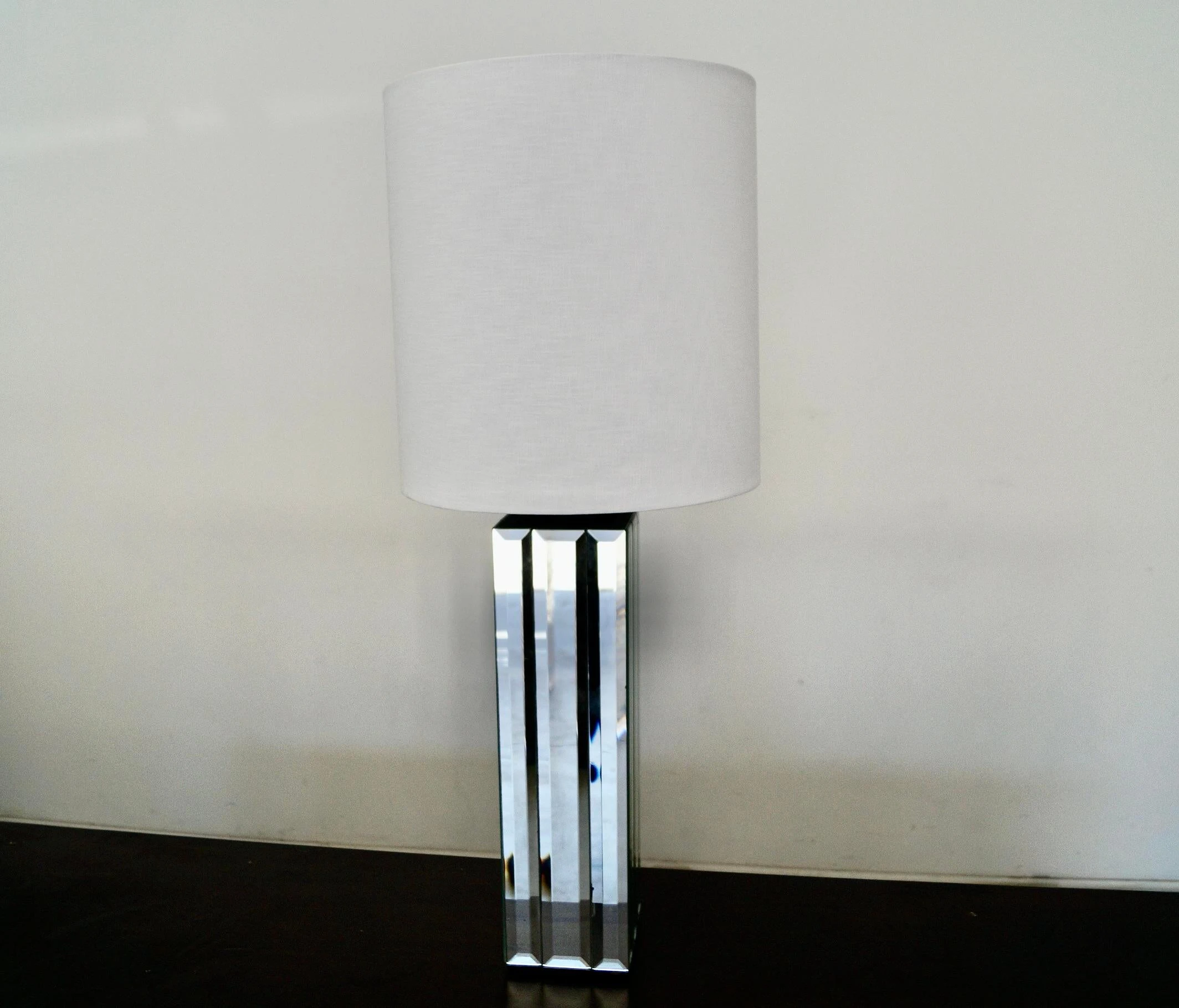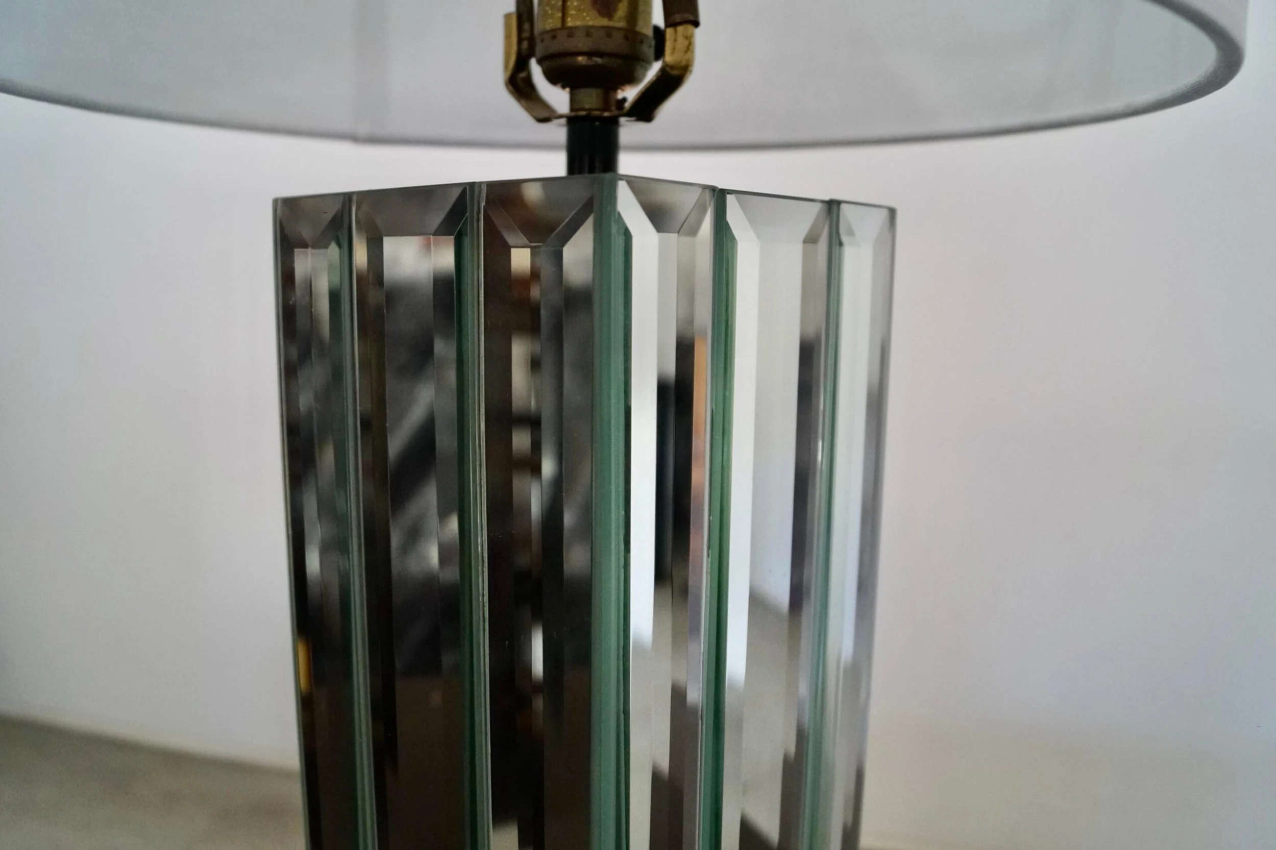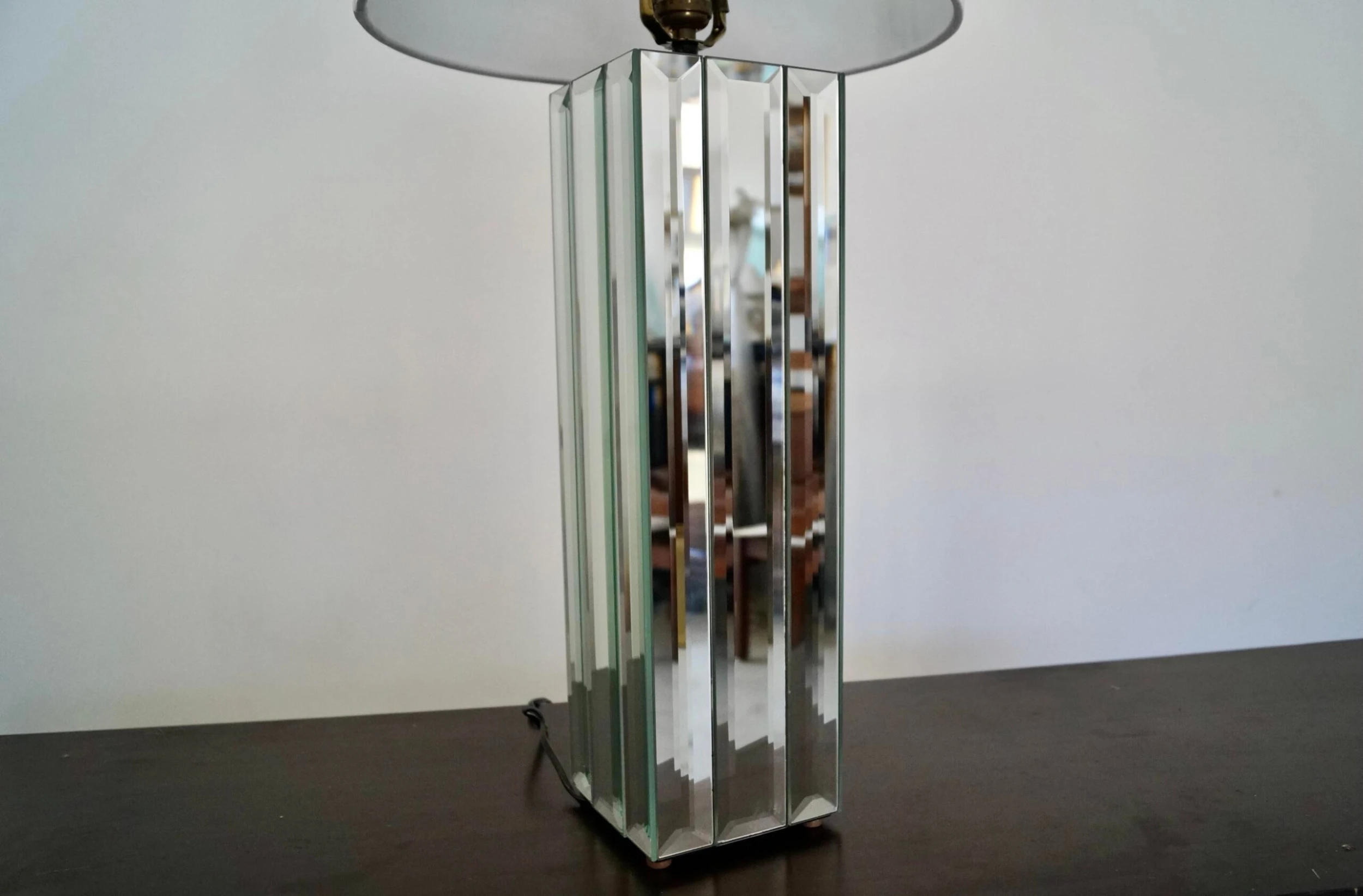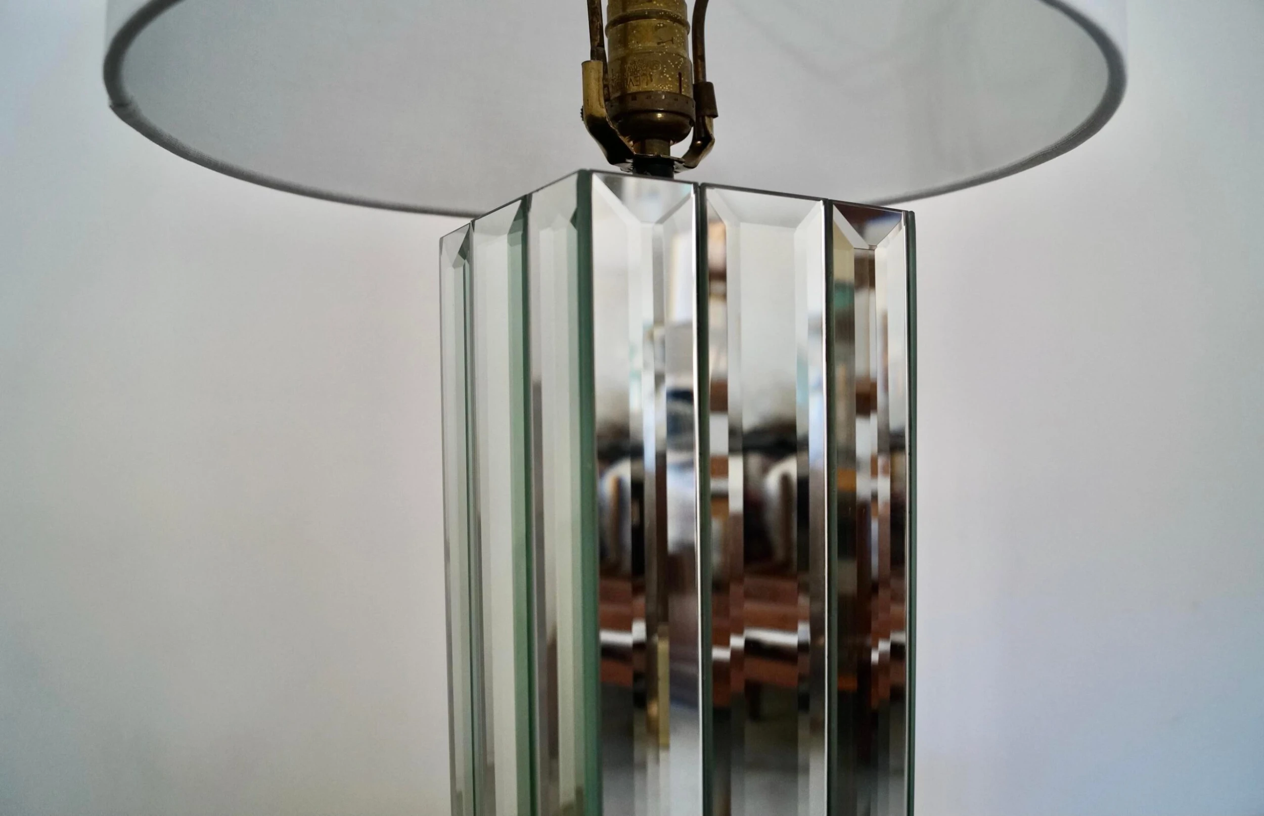 Vintage Mid-century Modern table lamp for sale. It’s from the 1960’s, and is in excellent condition. Its made of geometric beveled mirror, and has been professionally re-wired. It’s in great working order, and lights up beautifully. The mirror is in excellent condition with no scratches or chips. This lamp is rare, and would be a wonderful addition to any collection!