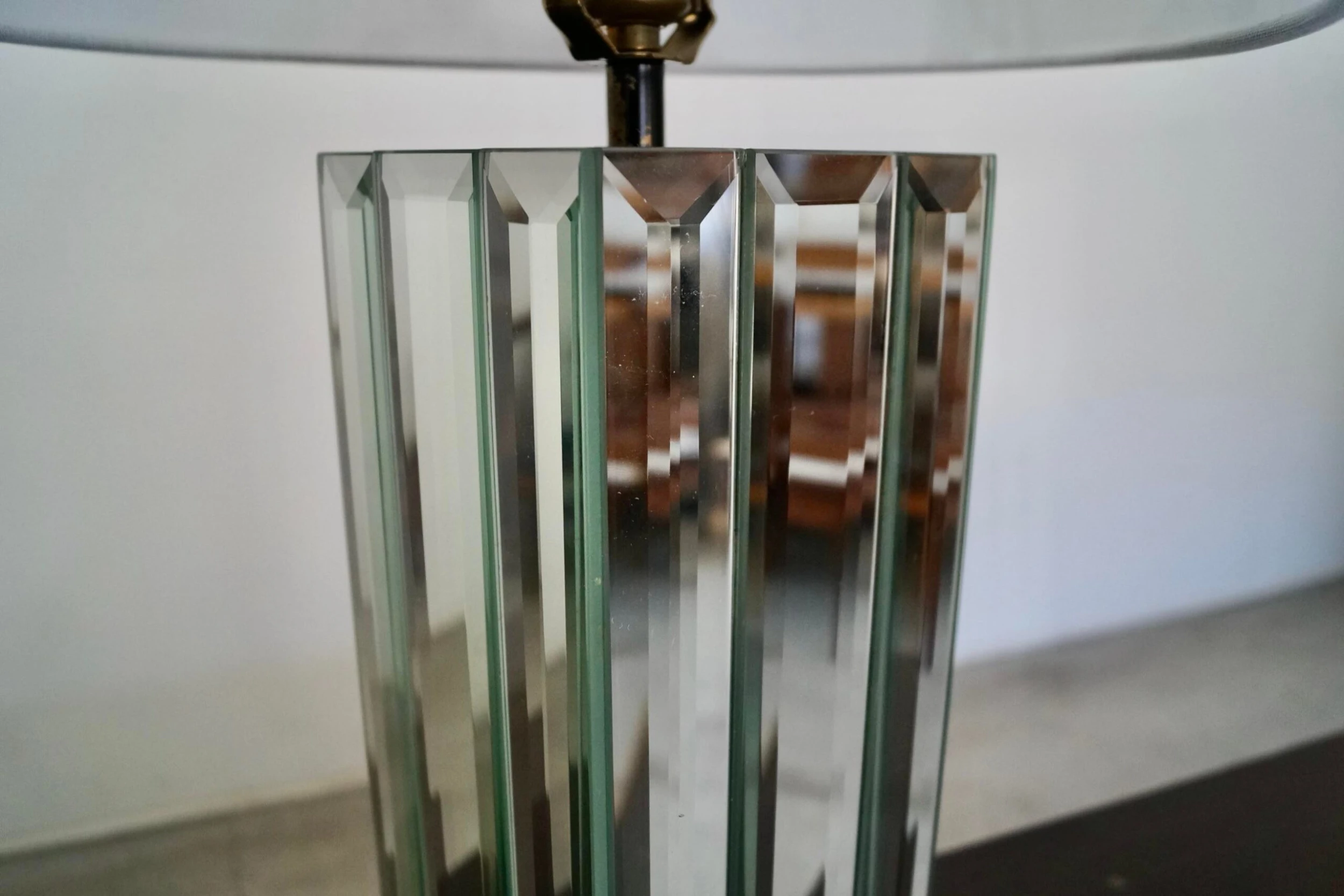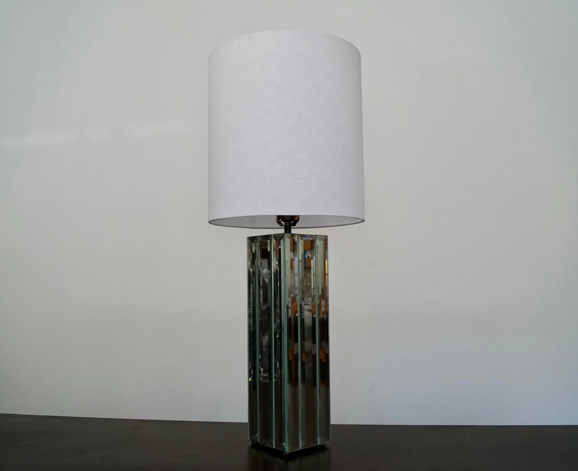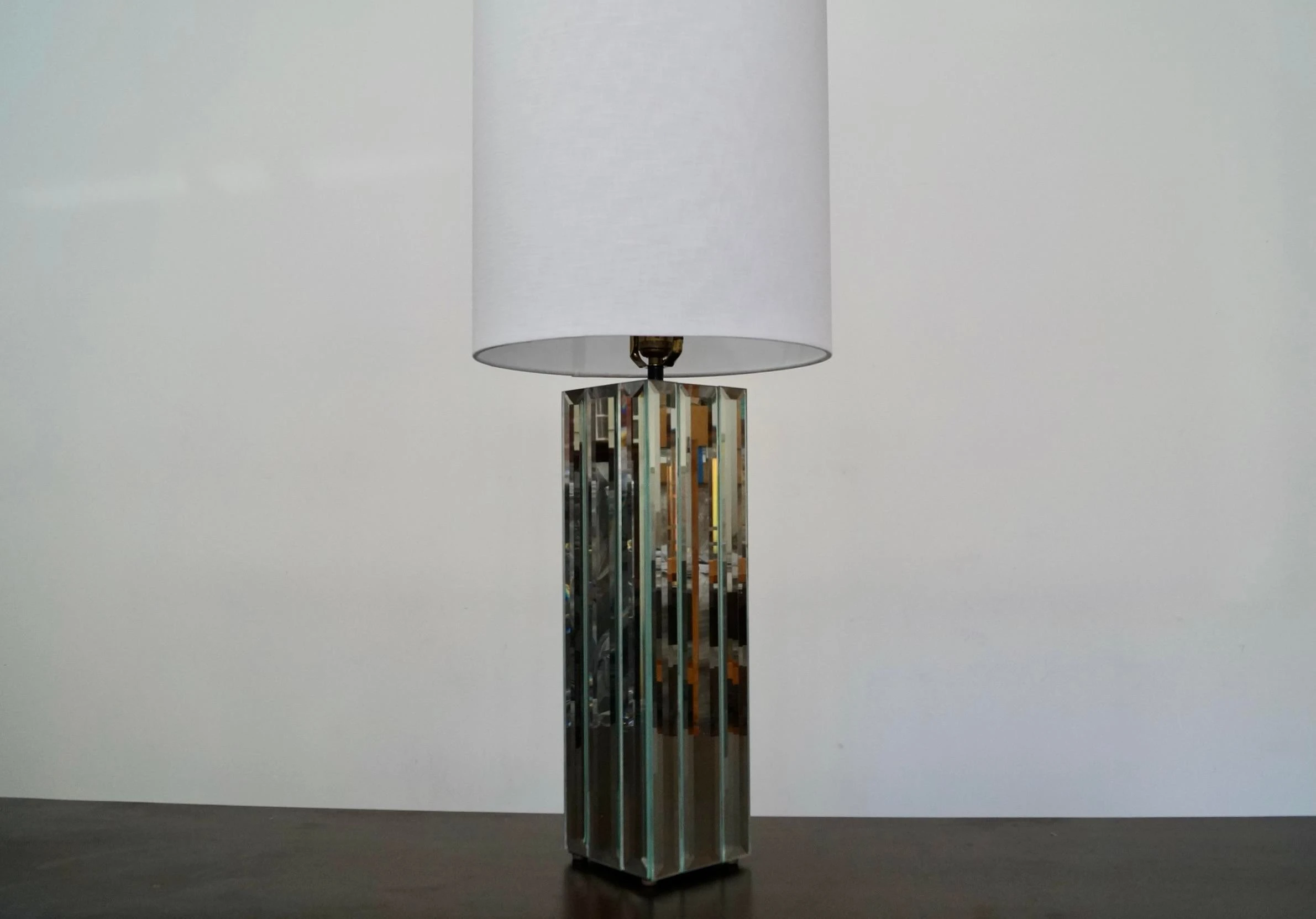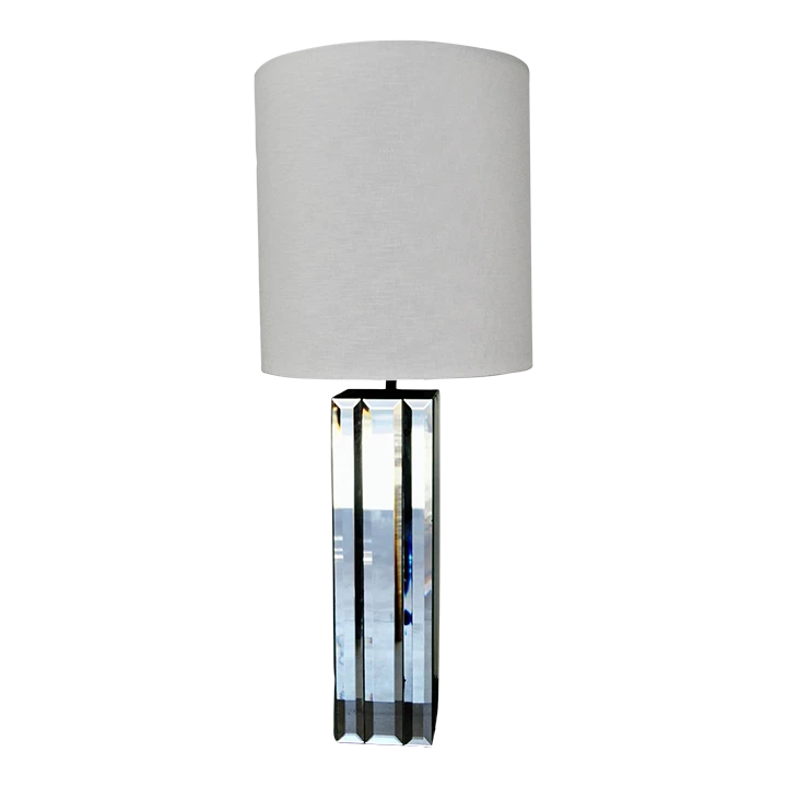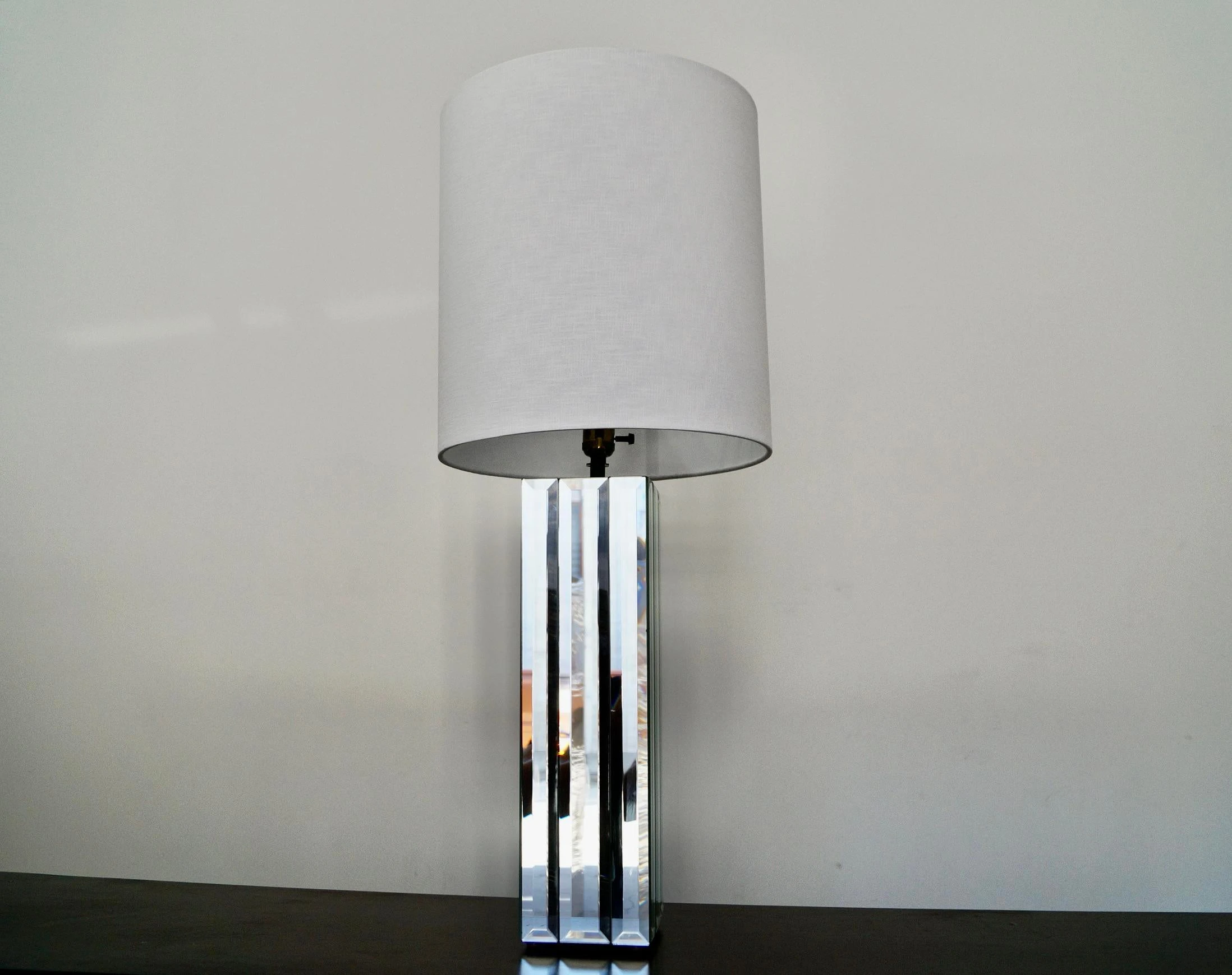 Vintage Mid-century Modern table lamp for sale. It’s from the 1960’s, and is in excellent condition. Its made of geometric beveled mirror, and has been professionally re-wired. It’s in great working order, and lights up beautifully. The mirror is in excellent condition with no scratches or chips. This lamp is rare, and would be a wonderful addition to any collection!