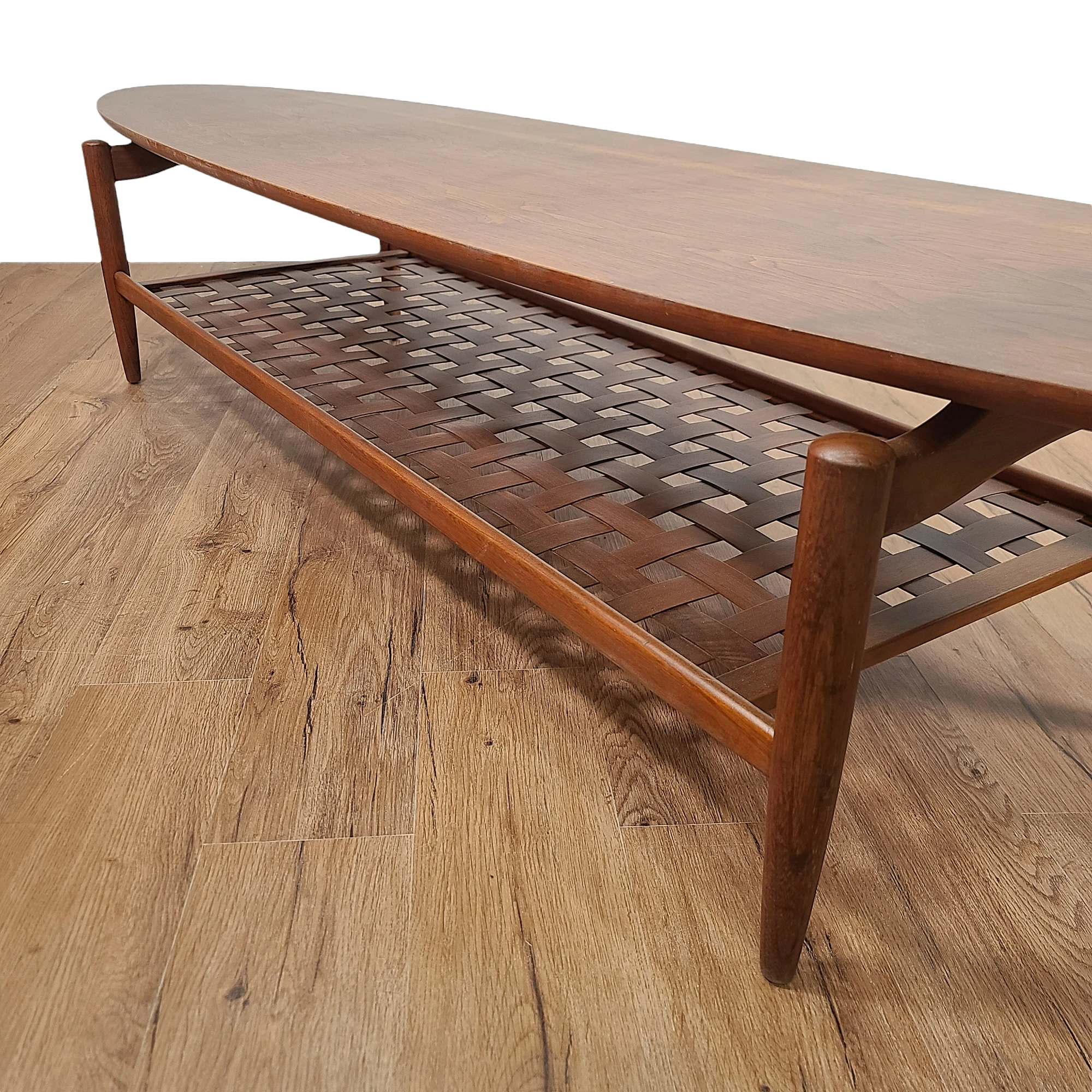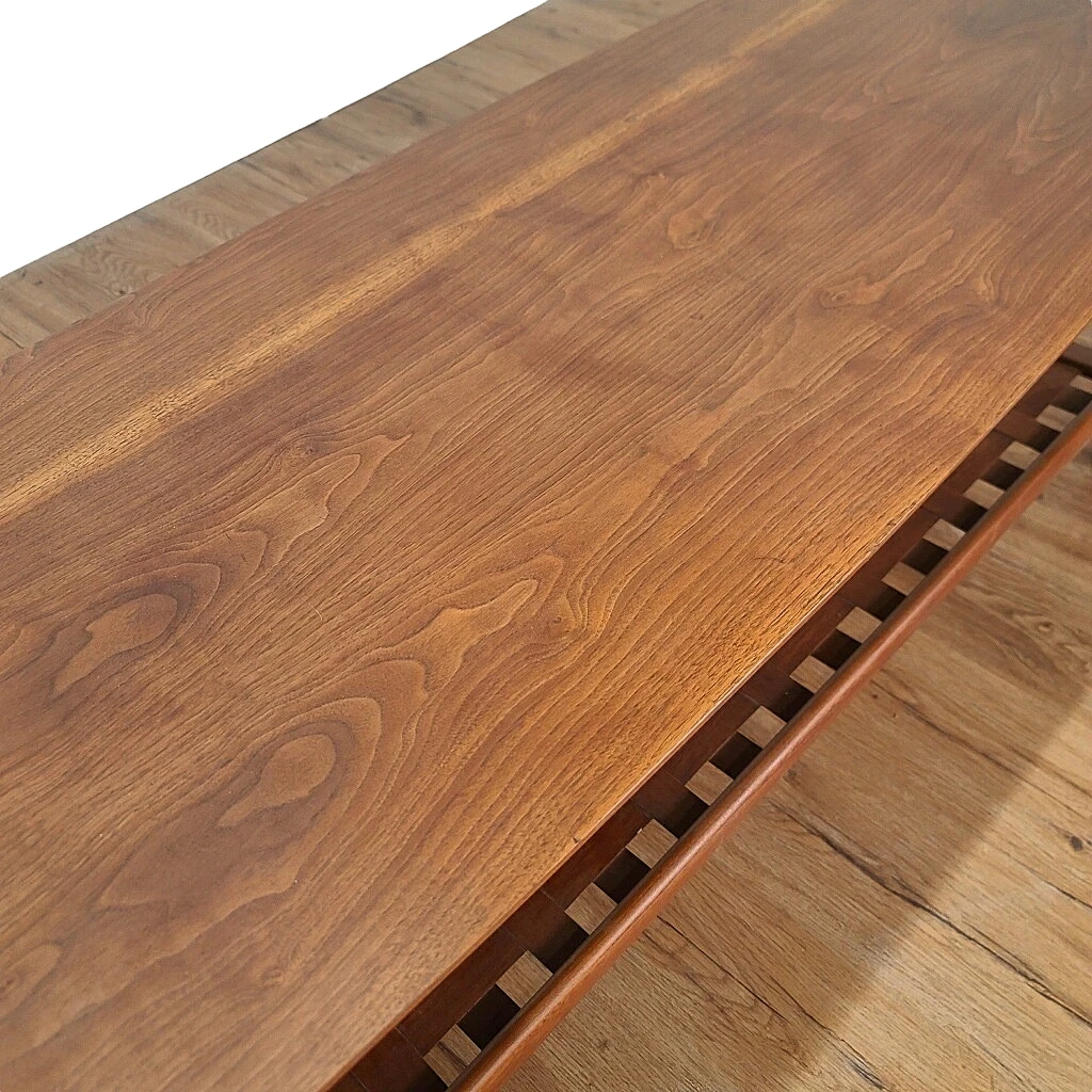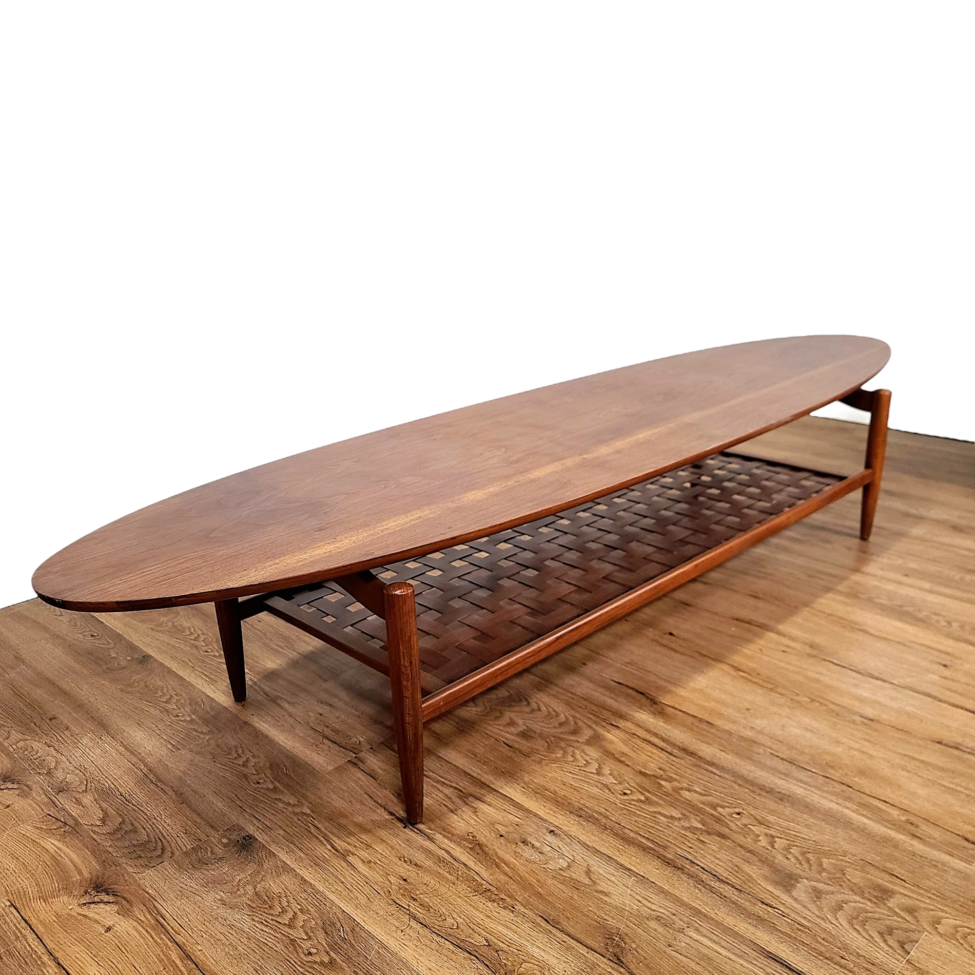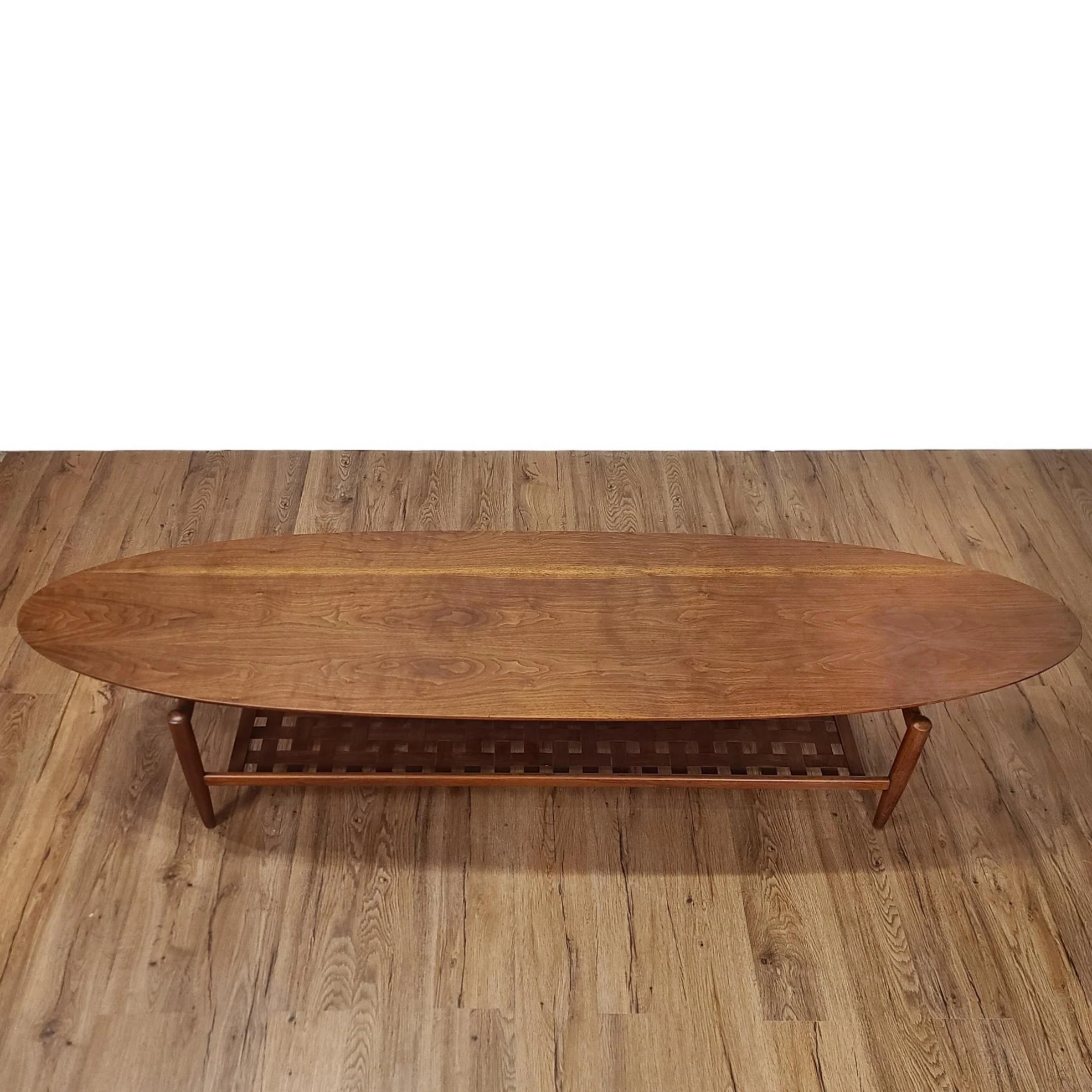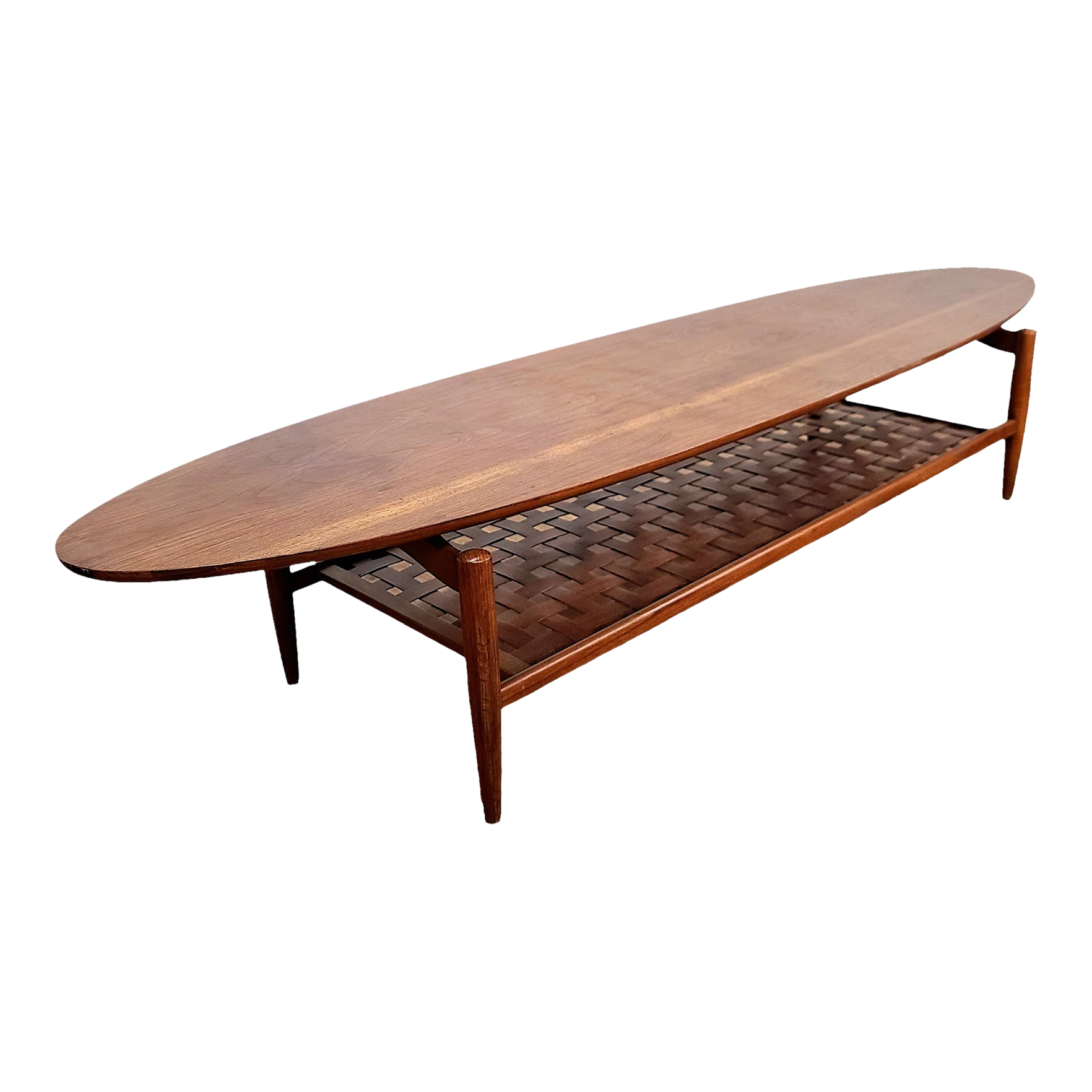 Spectacular “surfboard” coffee table by Lane from the seldom seen Award line. One of the more unique features from the line is the incorporation of a basketweave shelf underneath. 1960’s vintage, fashioned from Walnut this piece has received a light restoration in order to freshen its appearance with several coats of sealer and clear lacquer. Measures an impressive 80″ long by 20″ wide and 15″ tall.