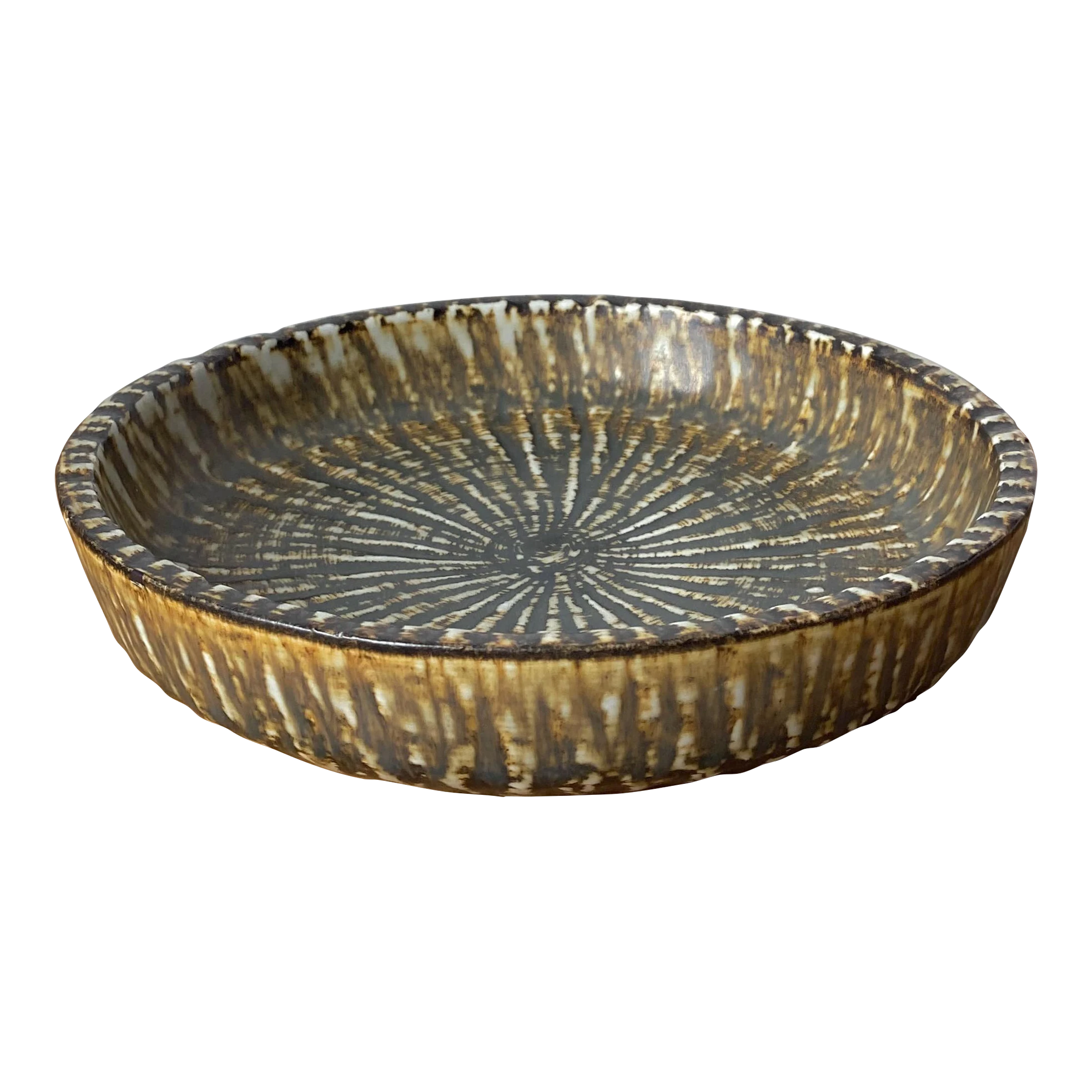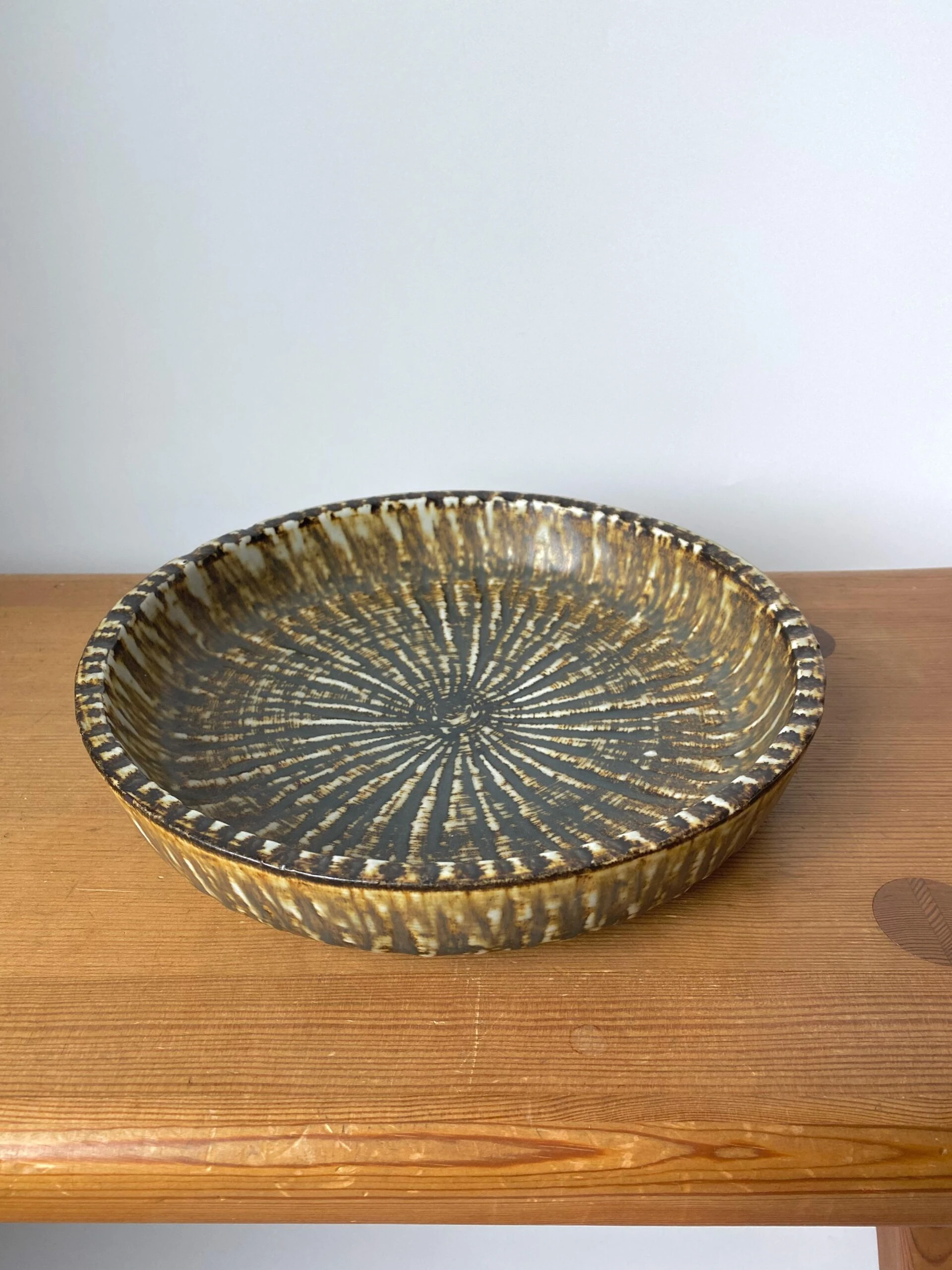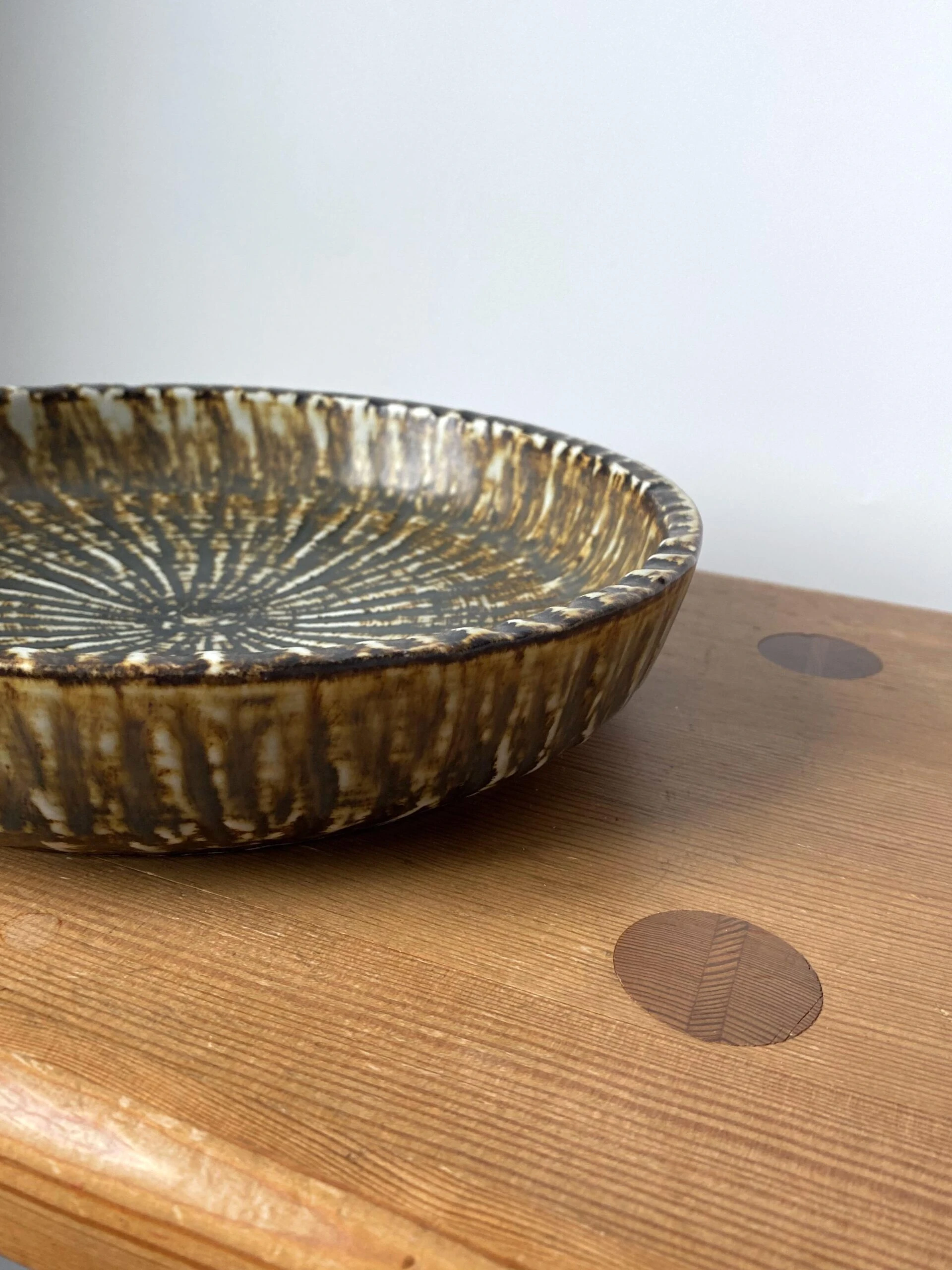 Large Ceramic bowl from the Robus collection by Gunnar Nylund for Rörstrand, Sweden. Decorative flame like design in brown, black …