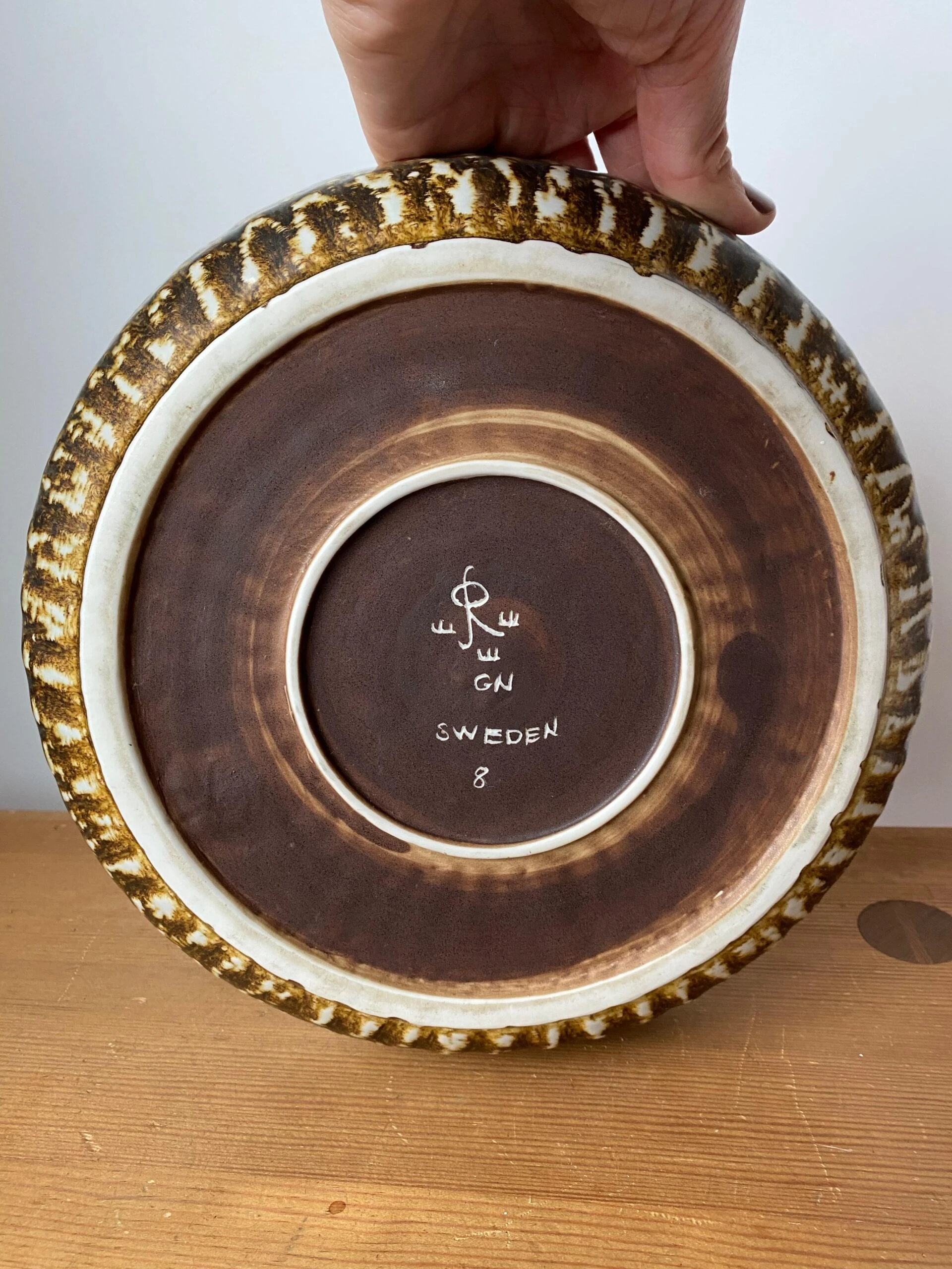 Large Ceramic bowl from the Robus collection by Gunnar Nylund for Rörstrand, Sweden. Decorative flame like design in brown, black and beige colors with designers signature underneath. In a very good vintage condition.