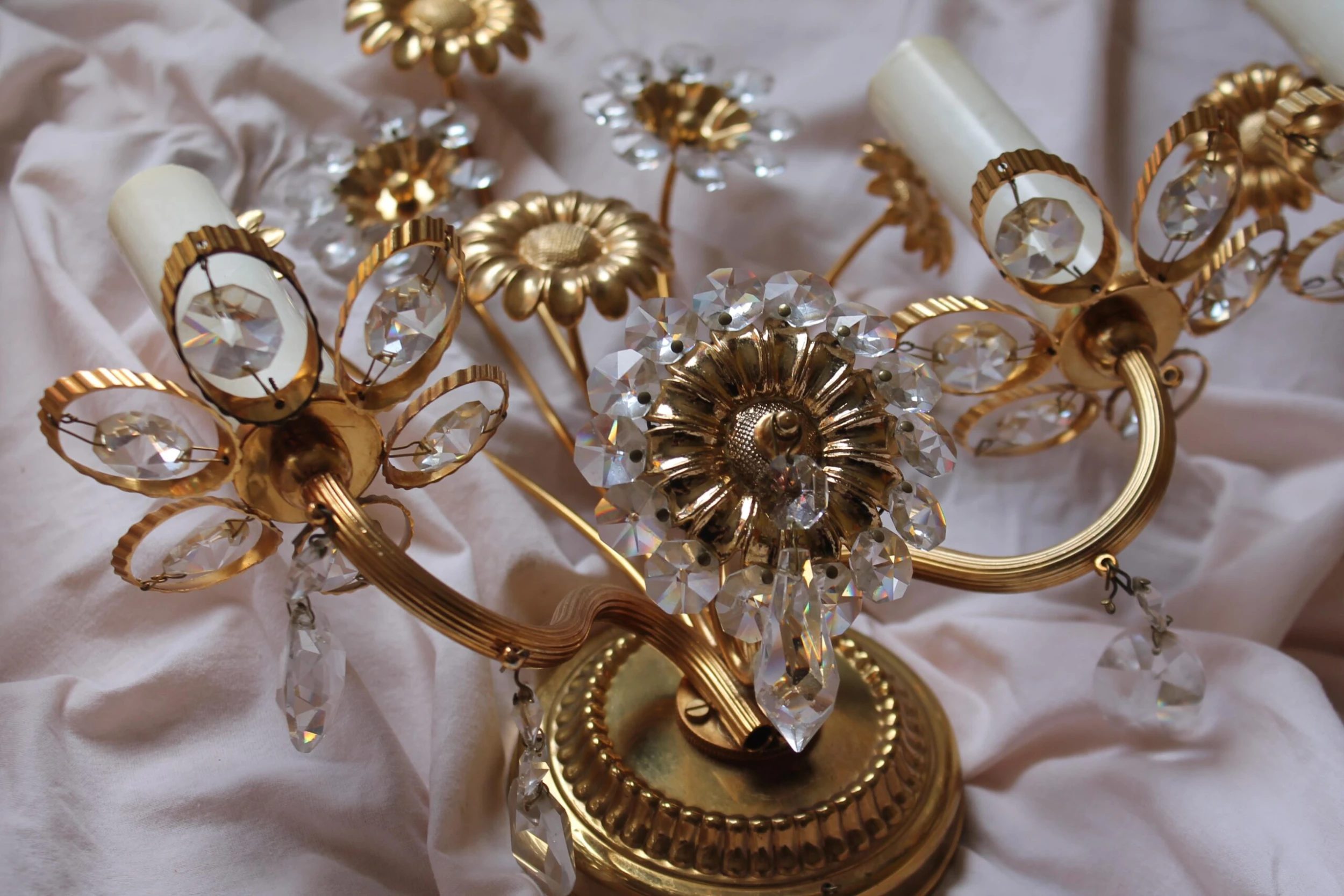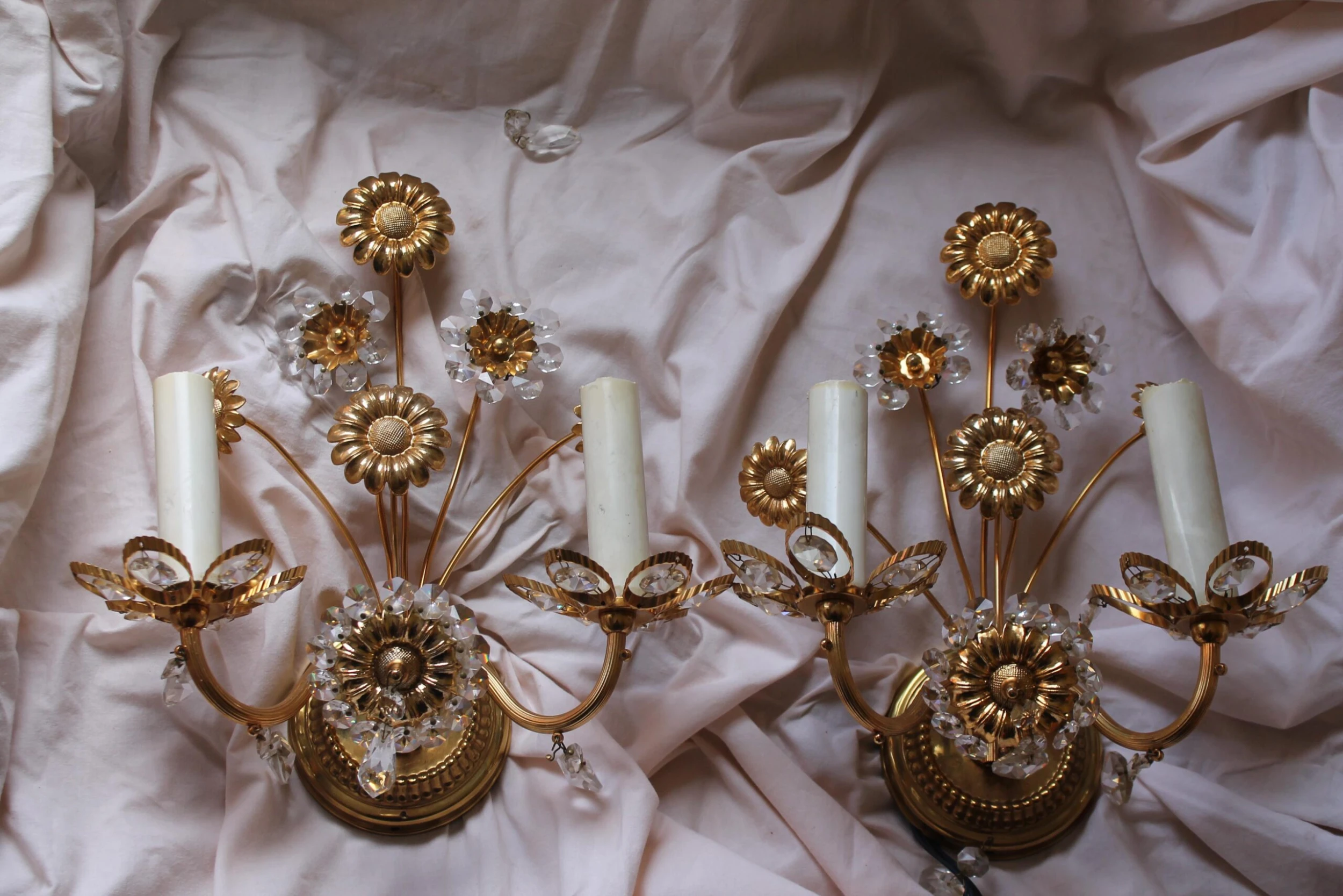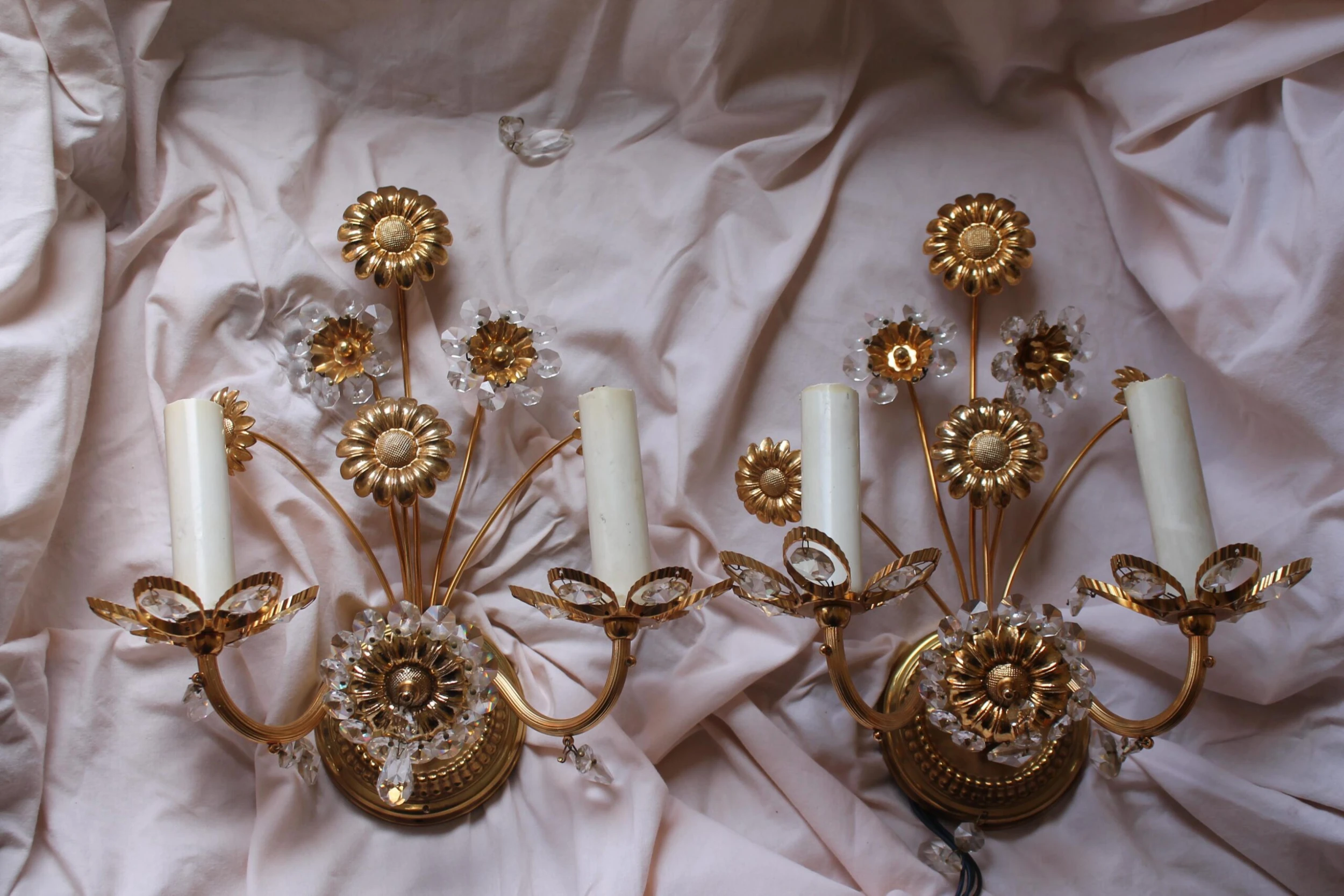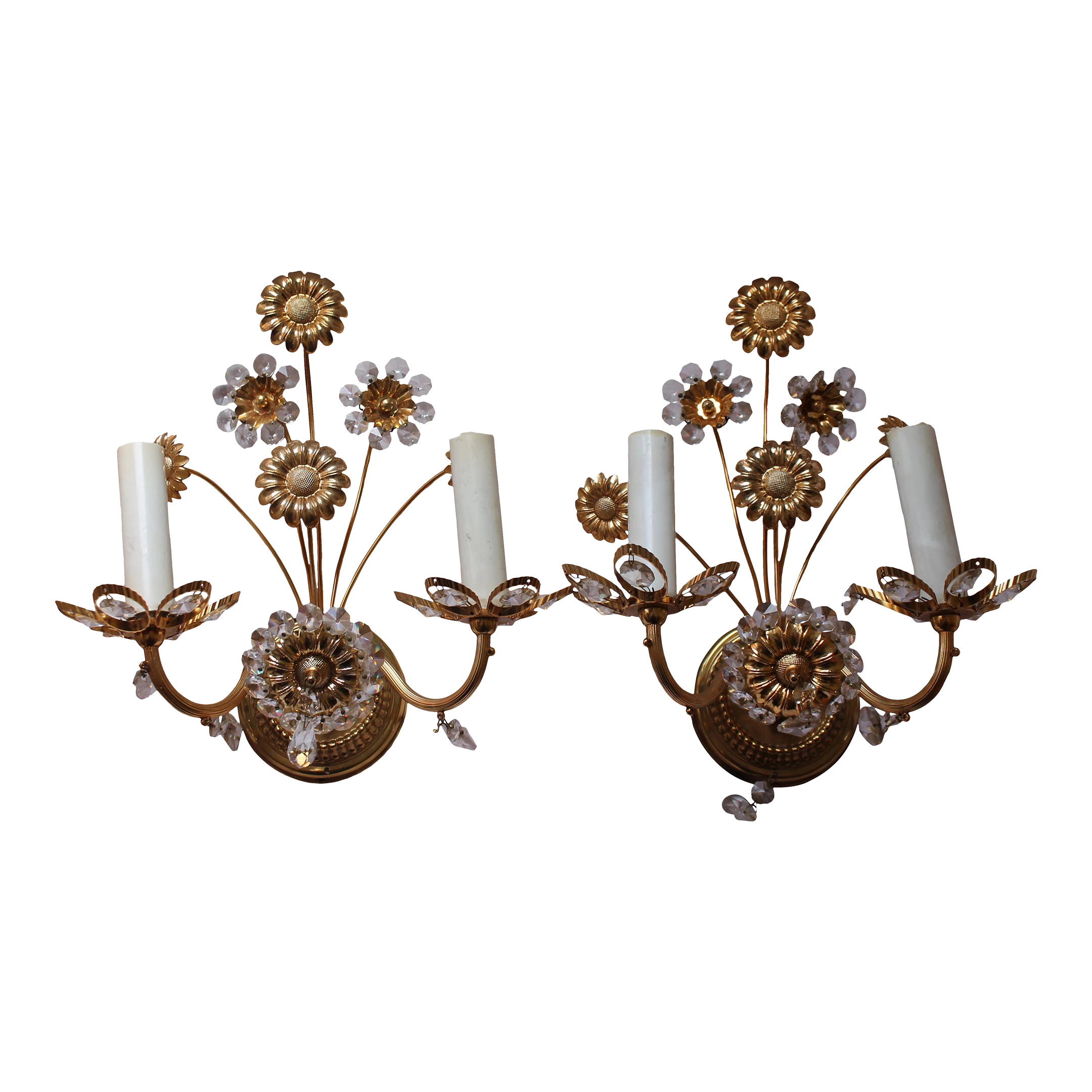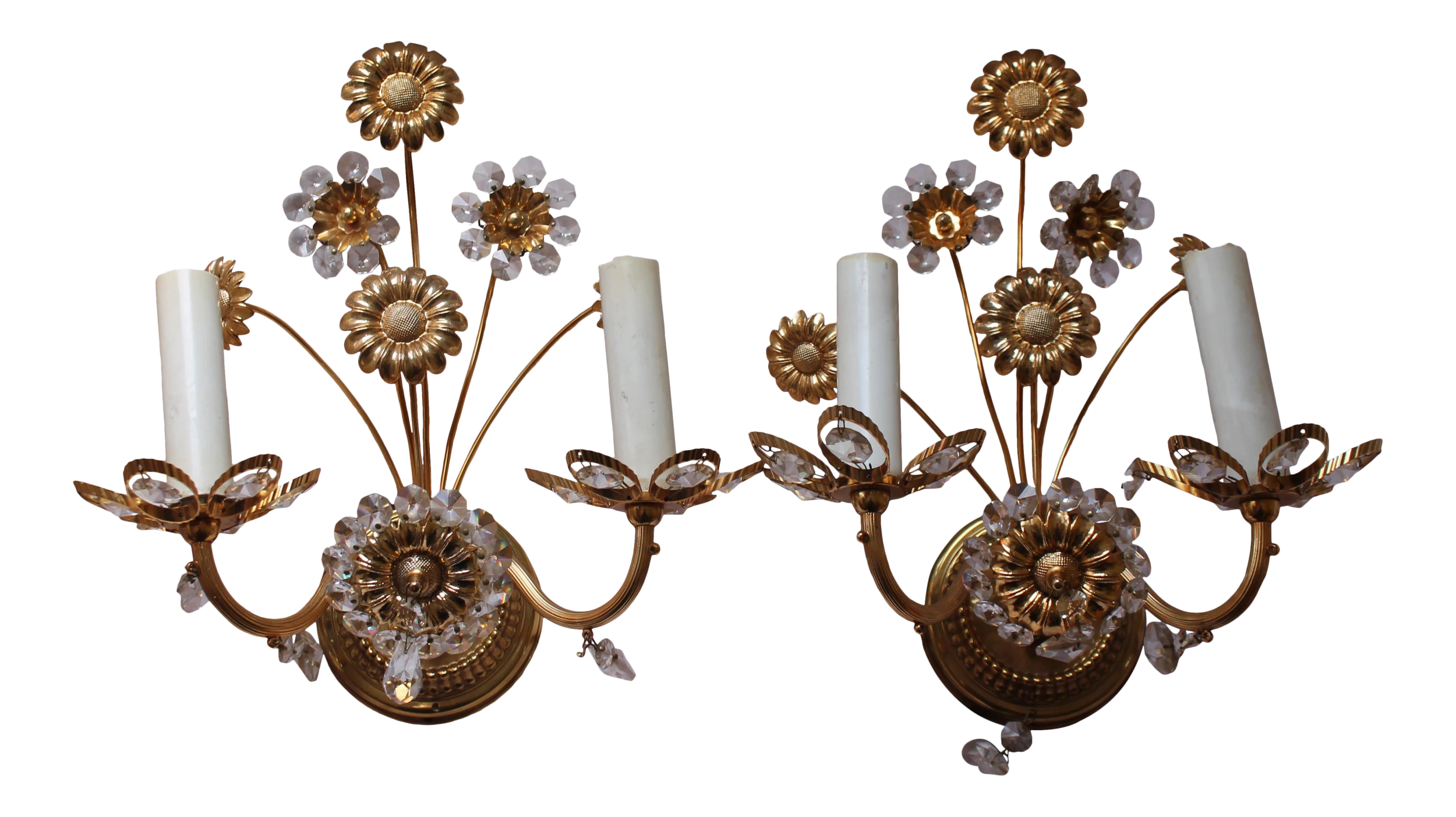 Pair 1960’s Mid Century Modern Cut Crystal 24K Gold Framed Floral Wall Sconces Made by “Palwa”. Highly detailed and exceptional quality.