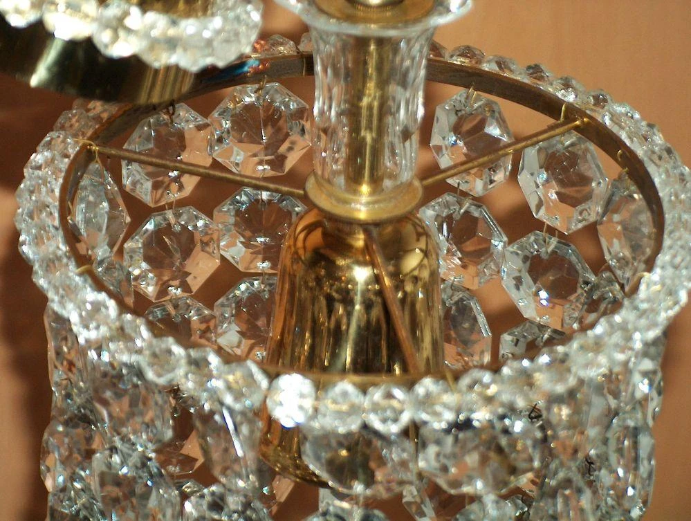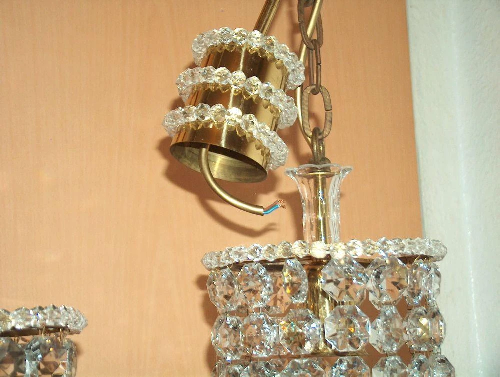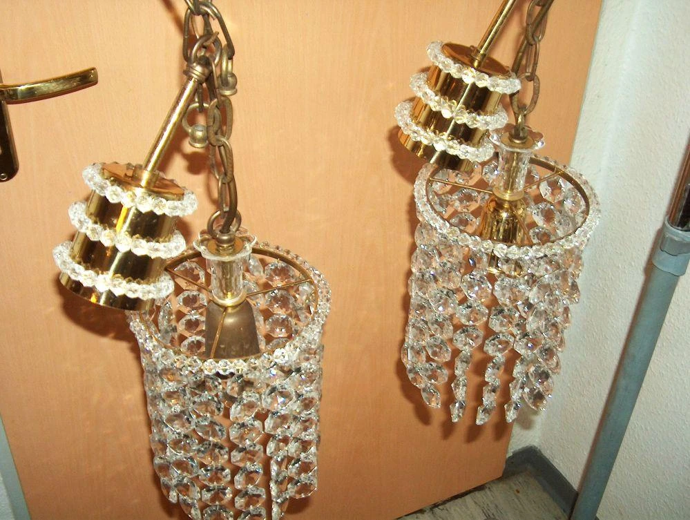 Pair 1960’s Austrian Mid Century Modern Cut Crystal & 24K Gold Plate Frame Pendant Lighting Fixtures by Palwa.. This is a stunning pair of fixtures. Jeweled ceiling caps.
