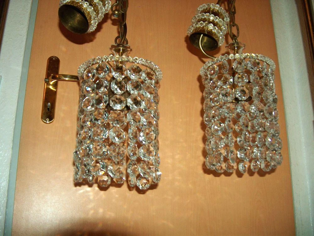 Pair 1960’s Austrian Mid Century Modern Cut Crystal & 24K Gold Plate Frame Pendant Lighting Fixtures by Palwa.. This is …