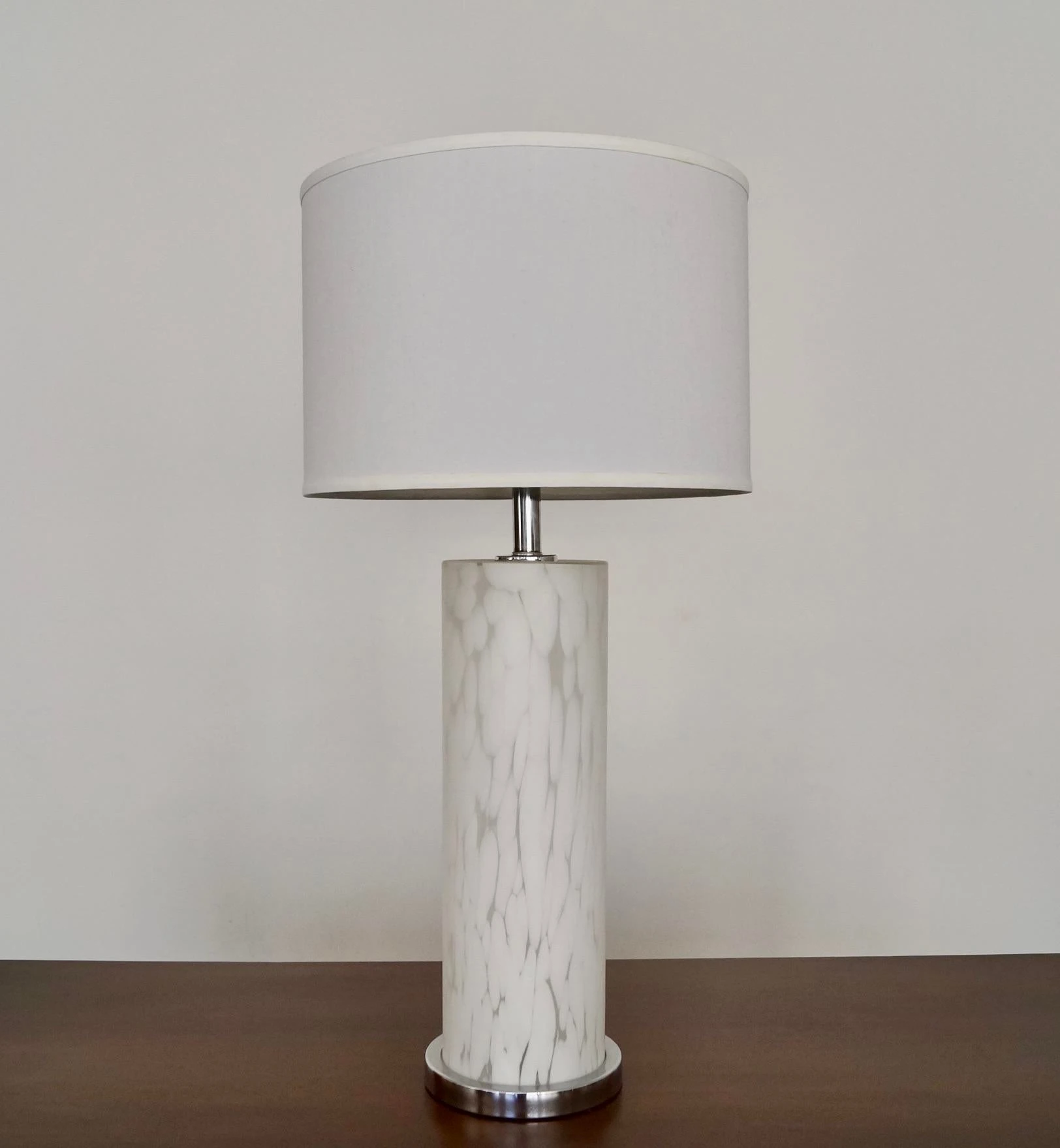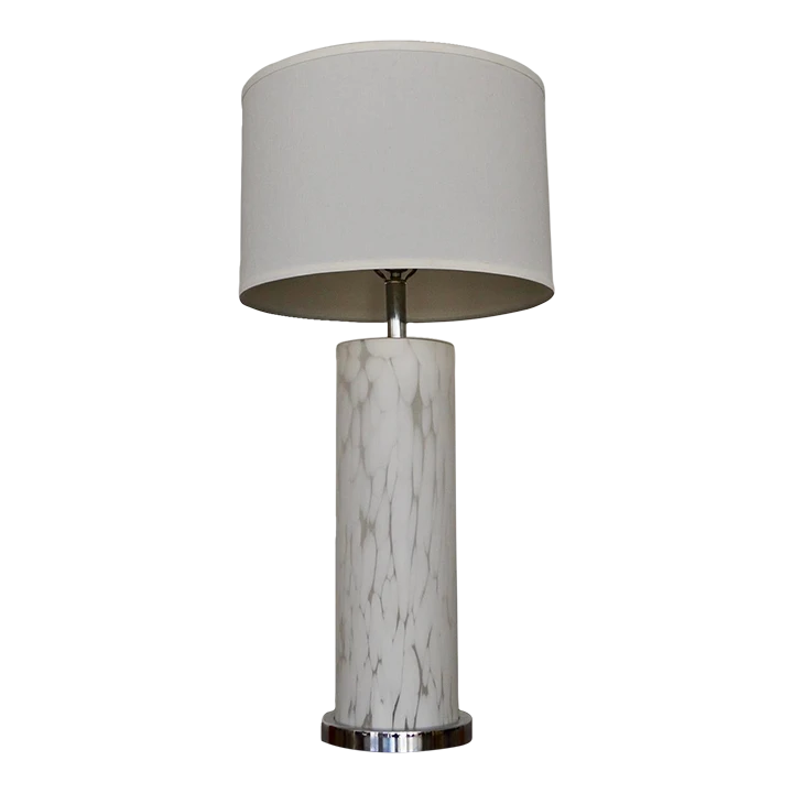 Beautiful Mid-century Modern table lamp for sale. Manufactured in the 1960’s, and made in Italy. Made of Italian Murano glass with a mottled glass finish, and a chrome base and stem. In amazing condition, and in great working order. It’s a white Murano glass table lamp that looks beautiful when lit up, or decorates nicely when not on. This lamp is unique, and a great piece to decorate a space.