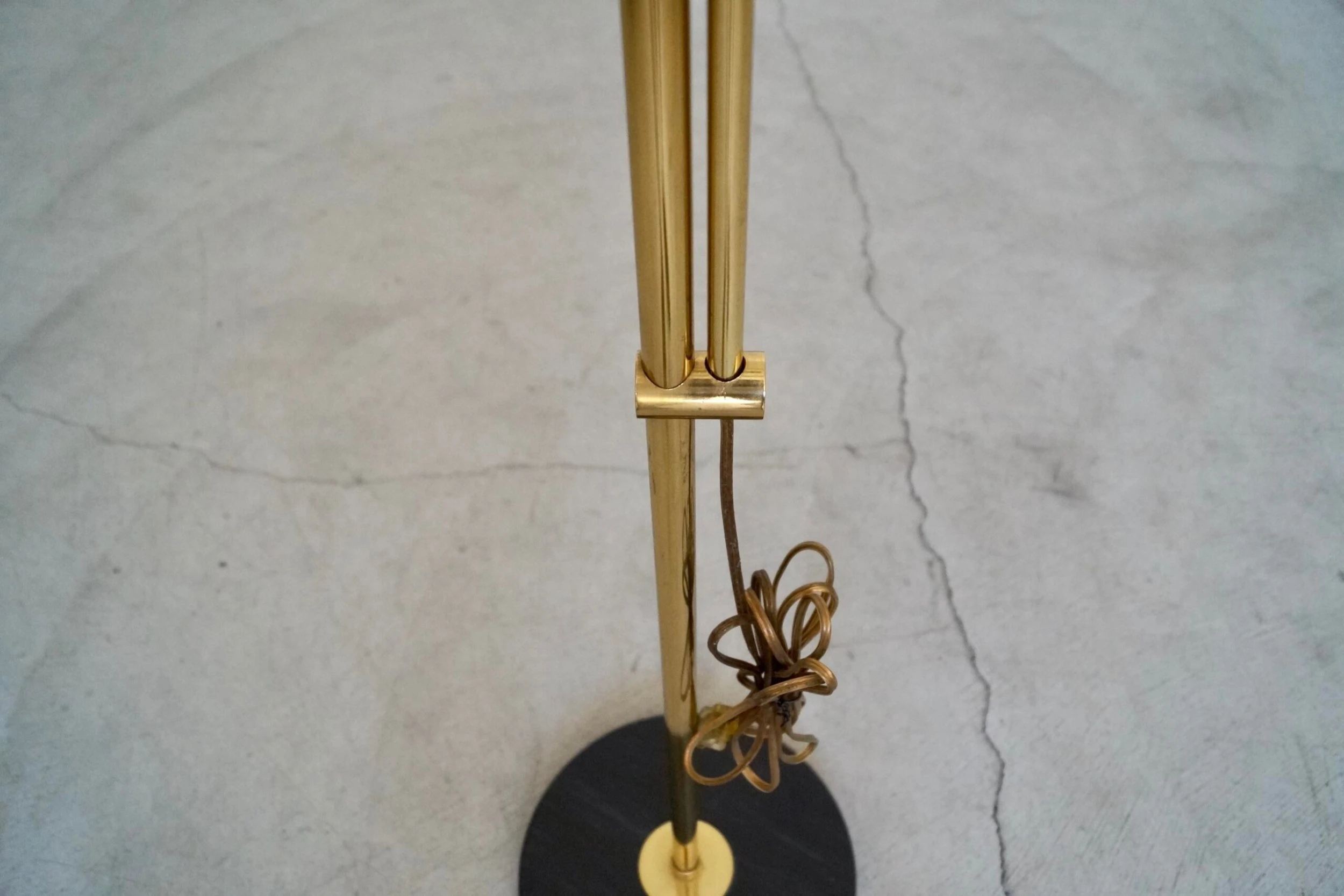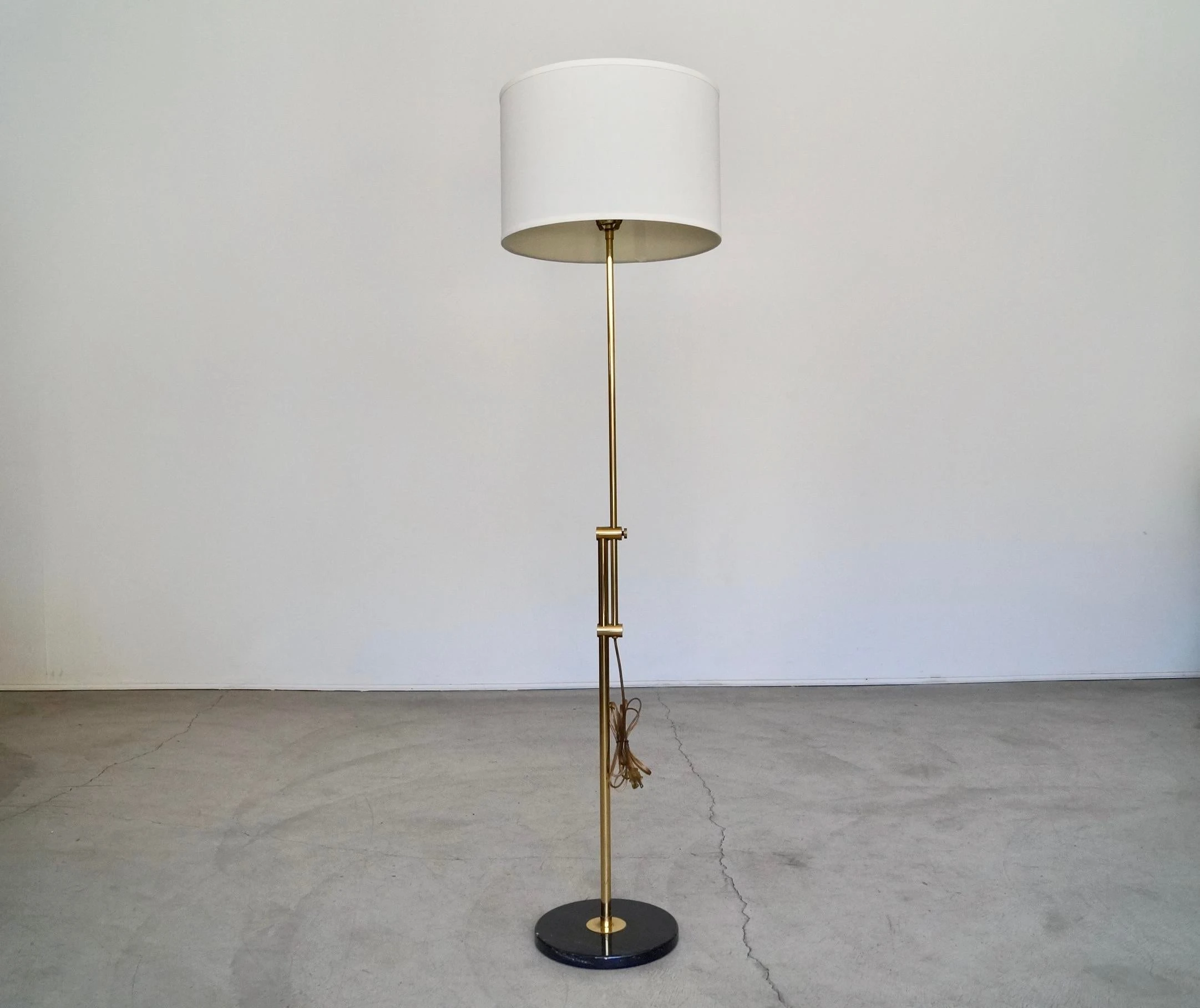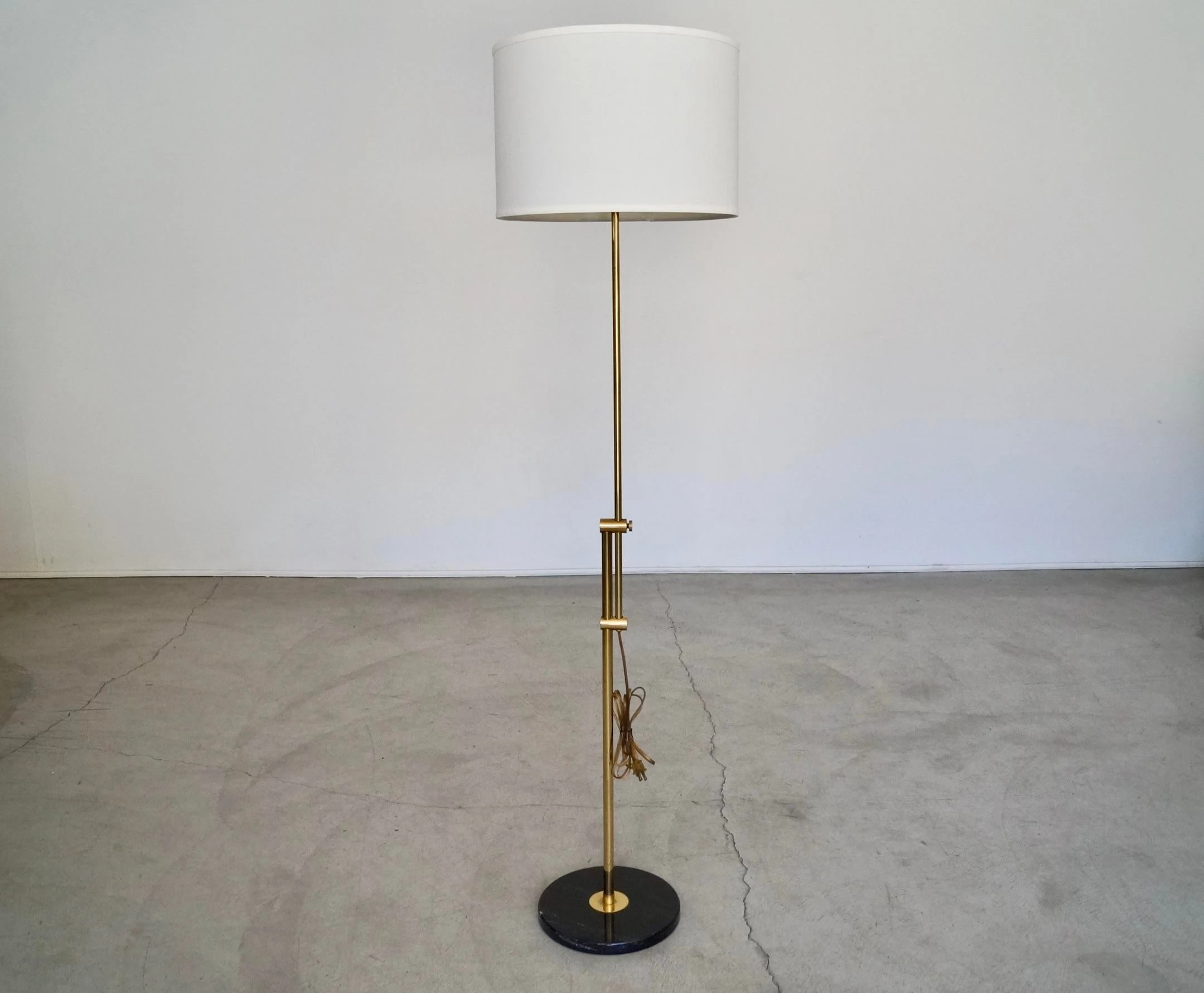 Vintage 1960’s Mid century Modern floor lamp for sale. It’s an incredible lamp with a solid marble base and brass poles and accents. The height is adjustable and the mechanism works smoothly. It’s really solid and well made, and in the manner of Robert Sonneman designs. The first image is the lamp at its’ tallest and the second image is of the lamp at its’ lowest point.