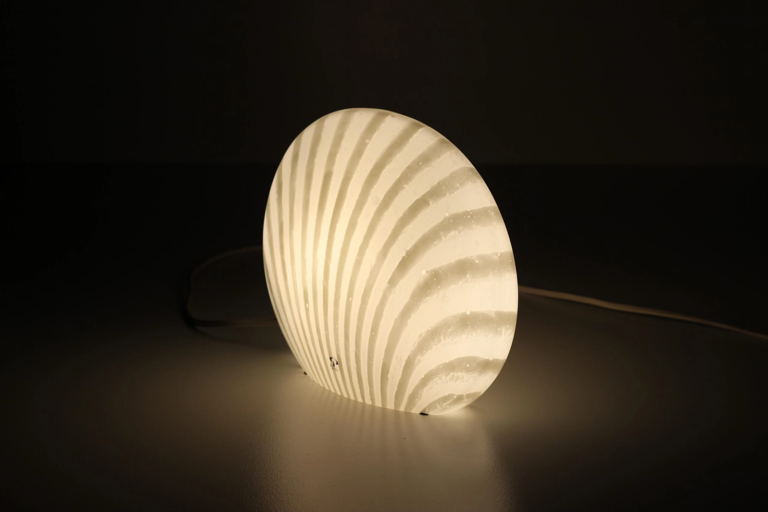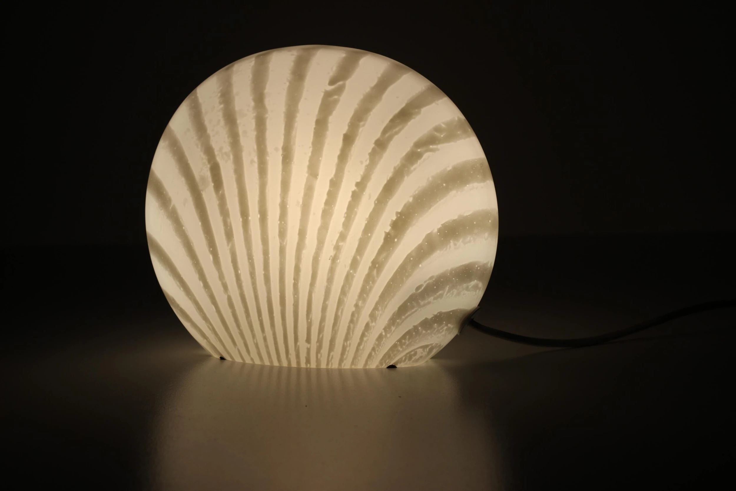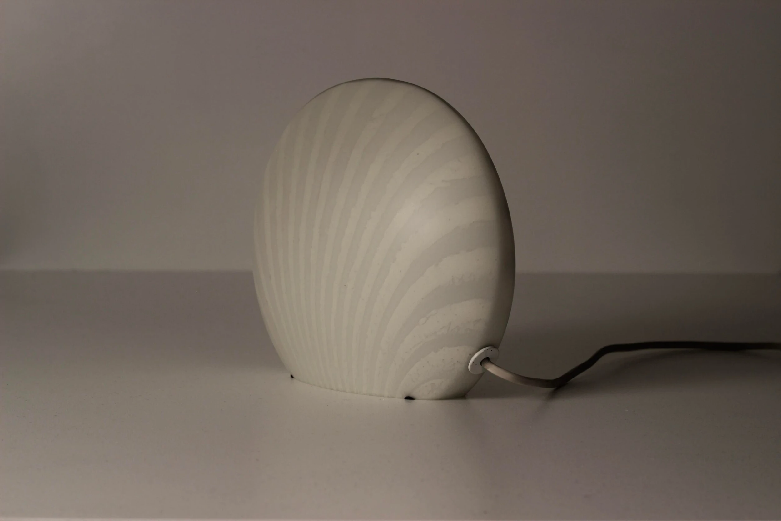 A Mid-Century Modern Peill & Putzler glass sea shell desk light or table light made in West Germany, in or around the 1960’s. This highly tactile and very smooth to the touch seashell light is made from a seamless piece of continuous flowing glass. Sculptural in its quality during the day, with a subtle visual textural pattern running though the inside of the glass, it takes on a whole new feel and quality when lit in the evening. It then emanates an ethereal delicate light, with the internal design of the organic graining becoming far more apparent. A wonderful atmospheric light than can be rewired for all regions and countries.