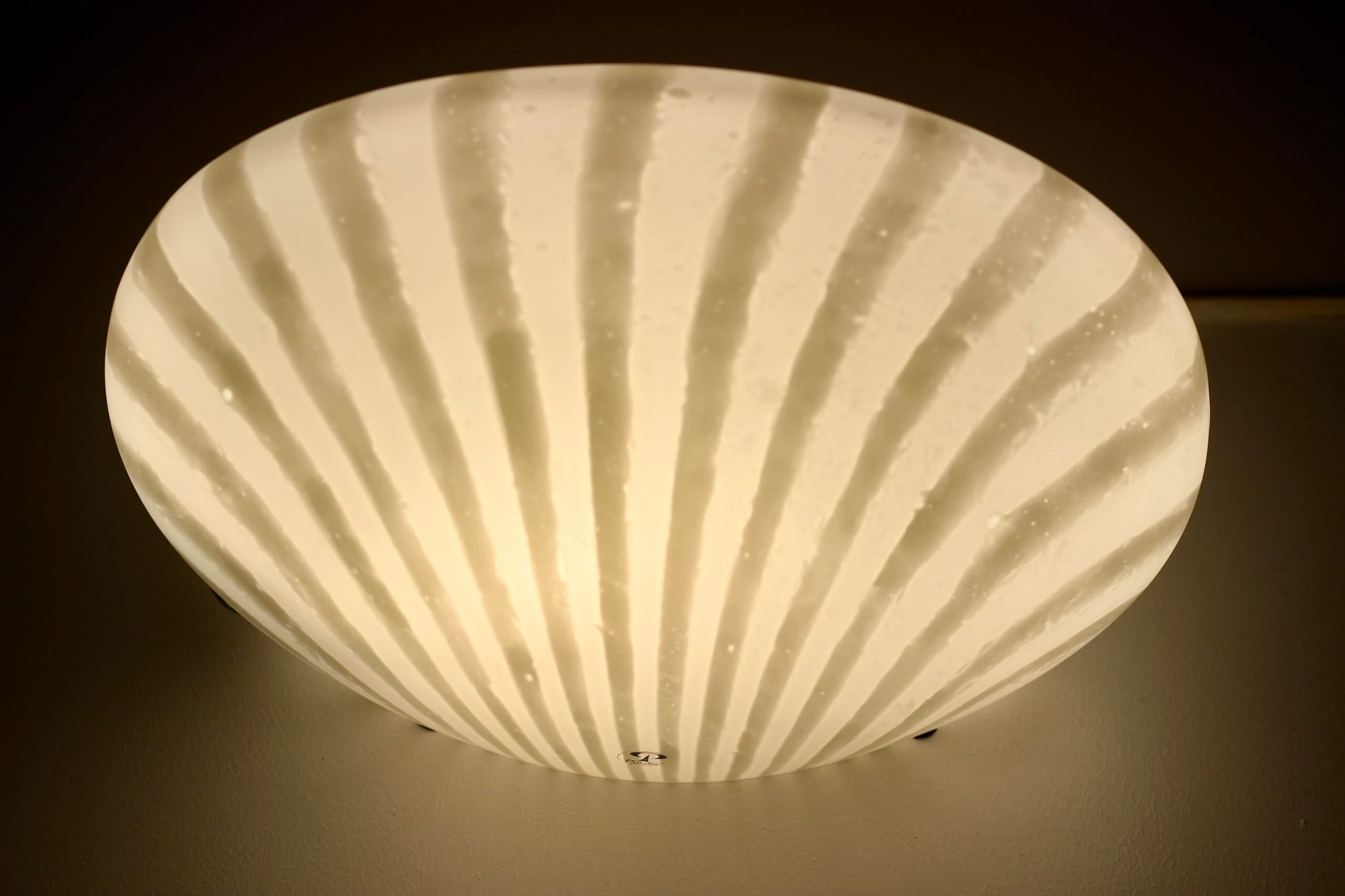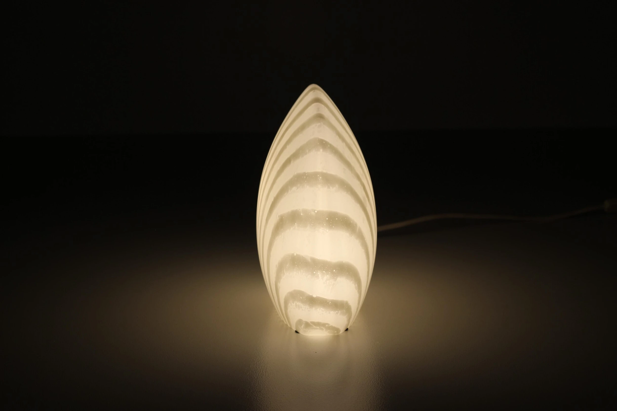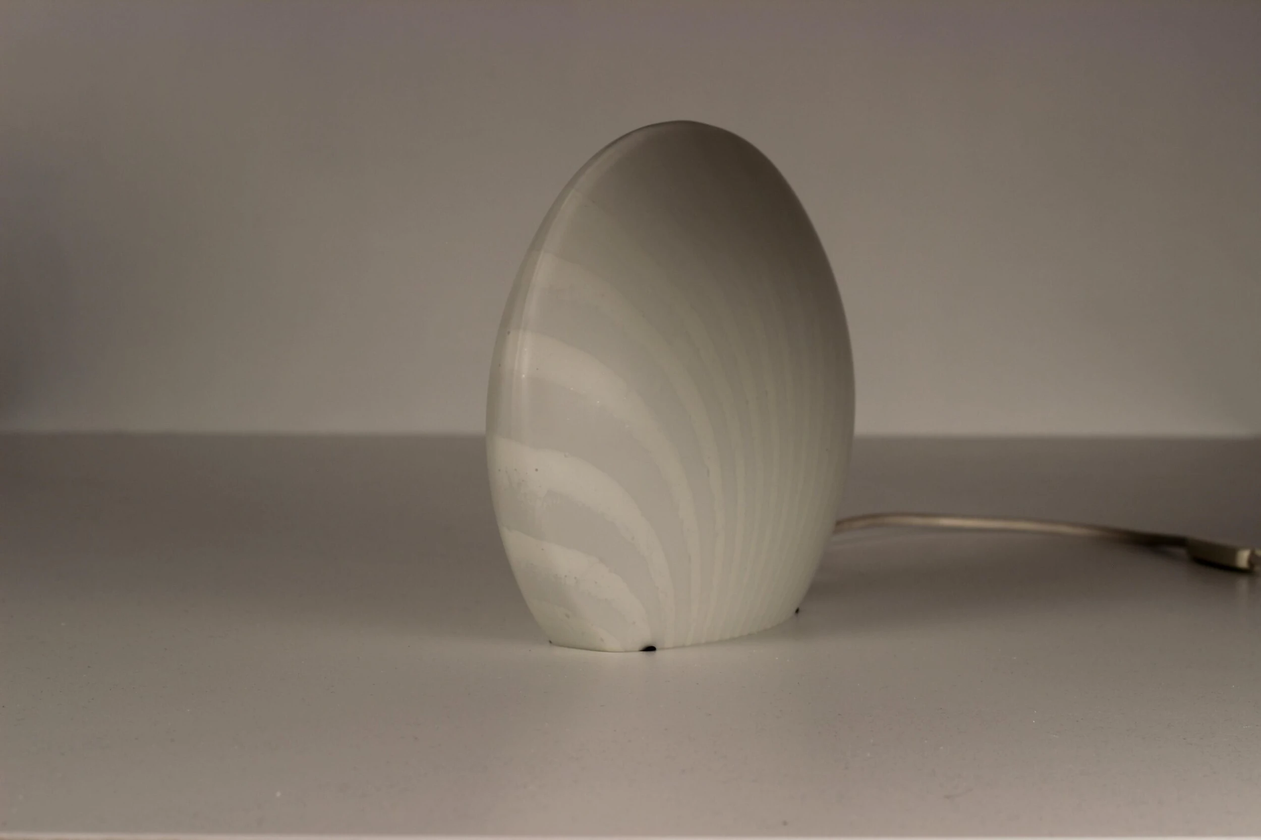 A Mid-Century Modern Peill & Putzler glass sea shell desk light or table light made in West Germany, in or around the 1960’s. This highly tactile and very smooth to the touch seashell light is made from a seamless piece of continuous flowing glass. Sculptural in its quality during the day, with a subtle visual textural pattern running though the inside of the glass, it takes on a whole new feel and quality when lit in the evening. It then emanates an ethereal delicate light, with the internal design of the organic graining becoming far more apparent. A wonderful atmospheric light than can be rewired for all regions and countries.