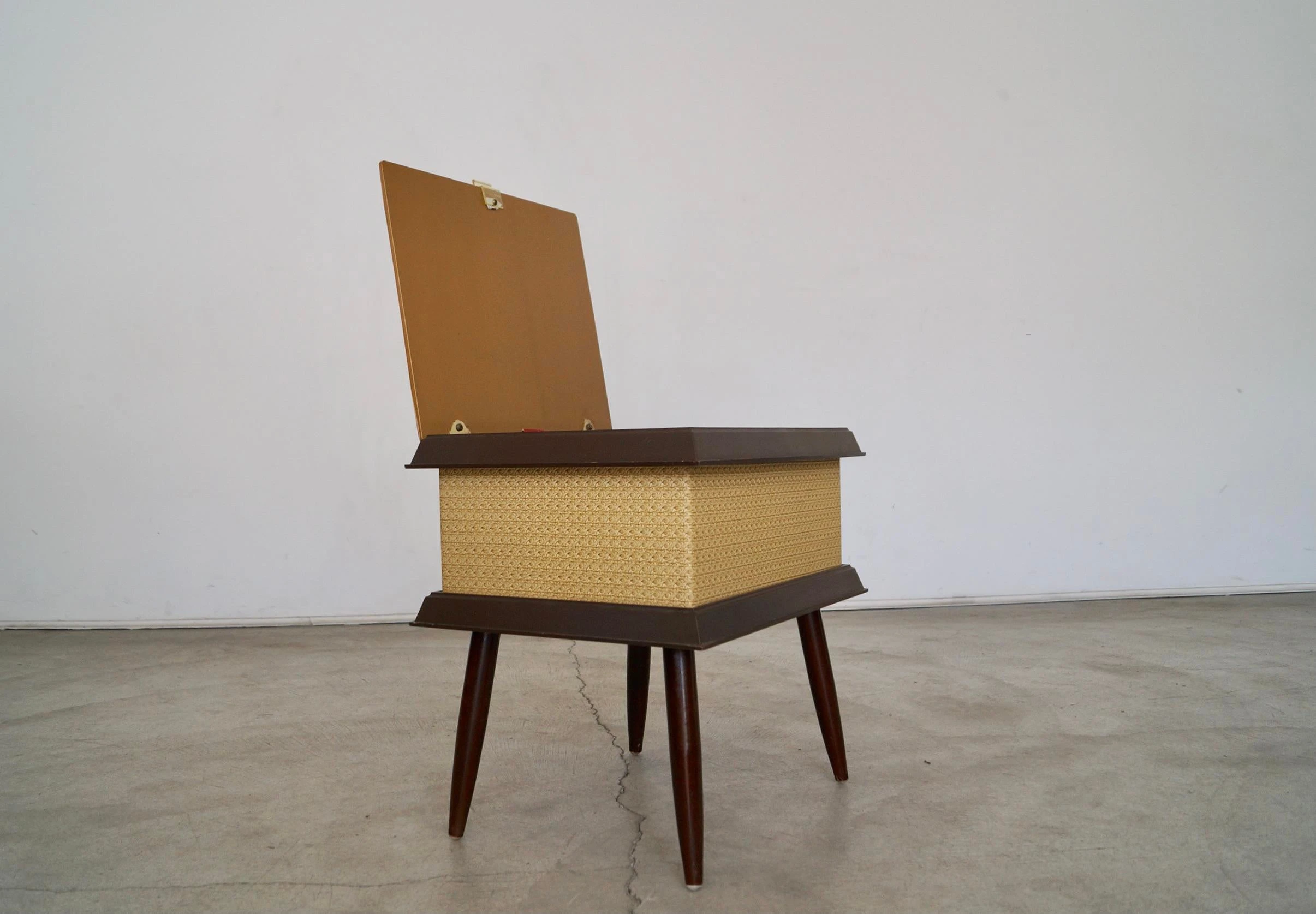 Vintage Mid-century stool ottoman for sale. The top opens for storage. It’s from the 1960’s, and was manufactured by Pearl-Wick …
