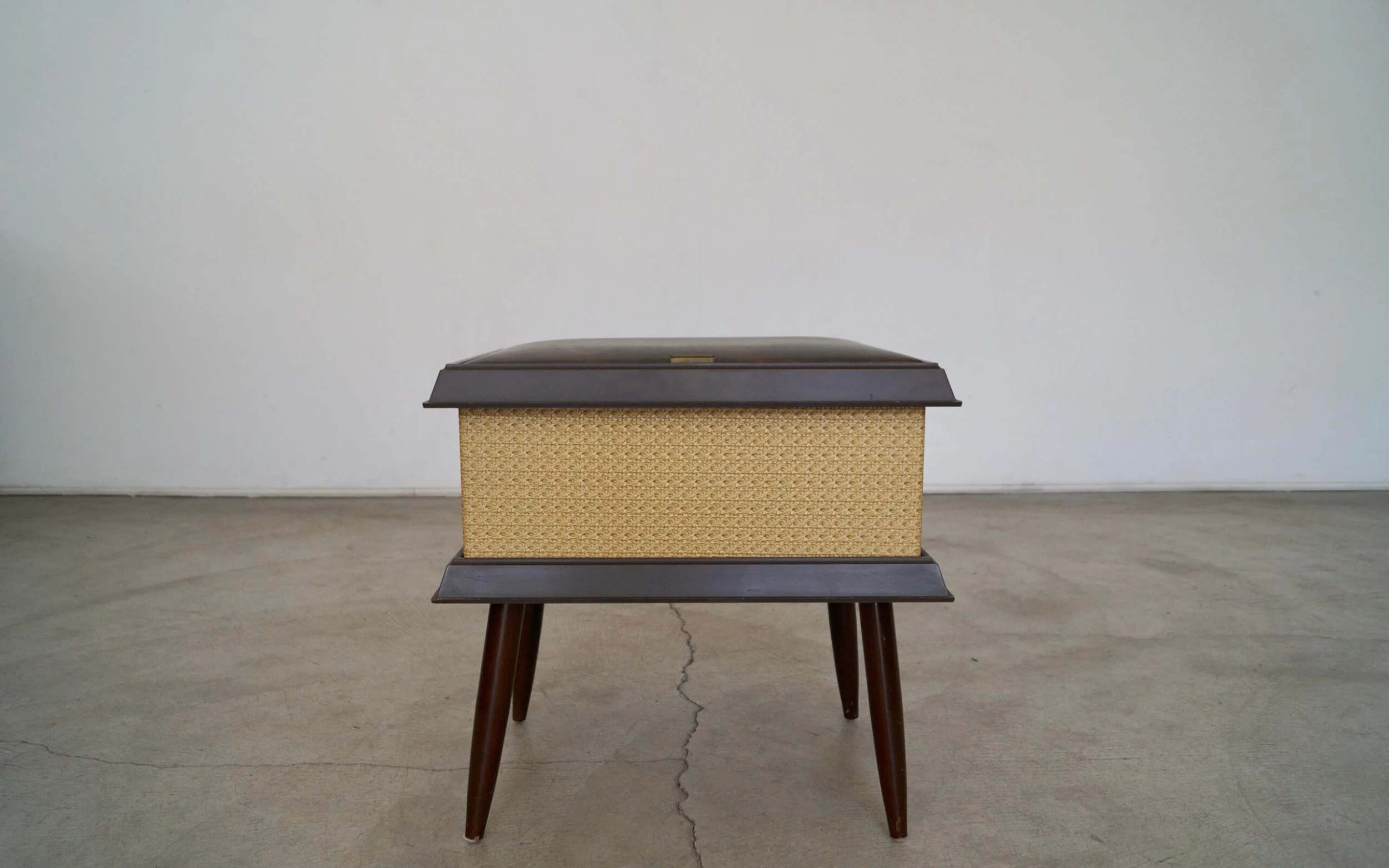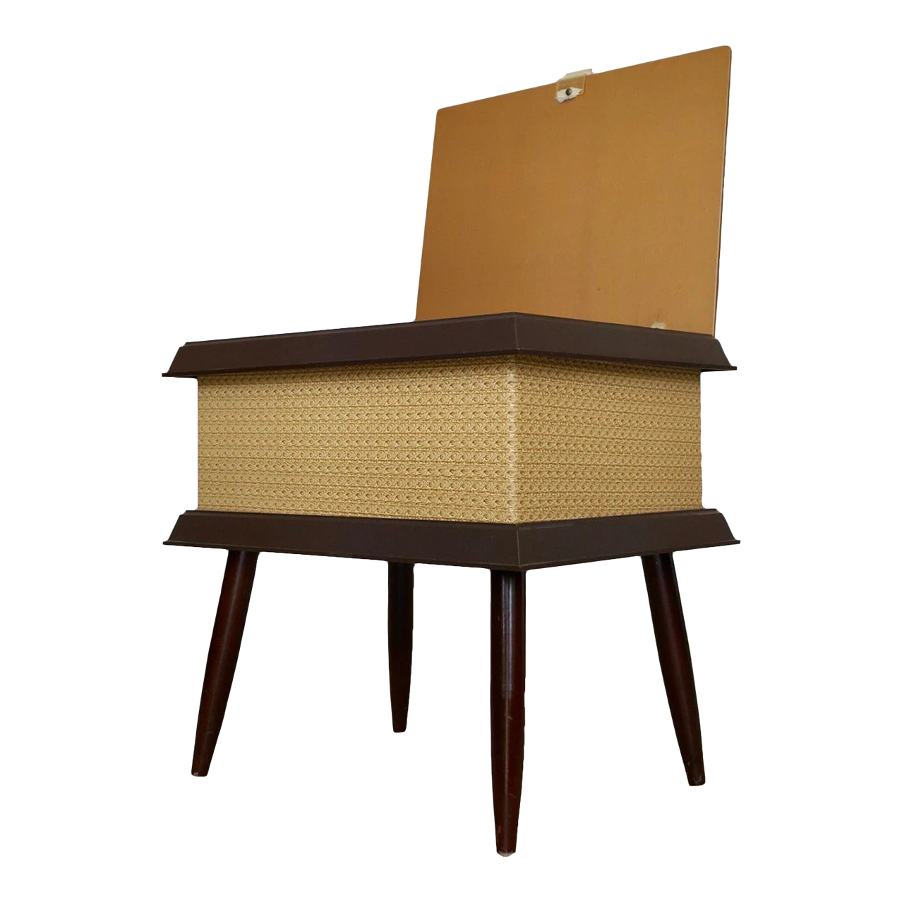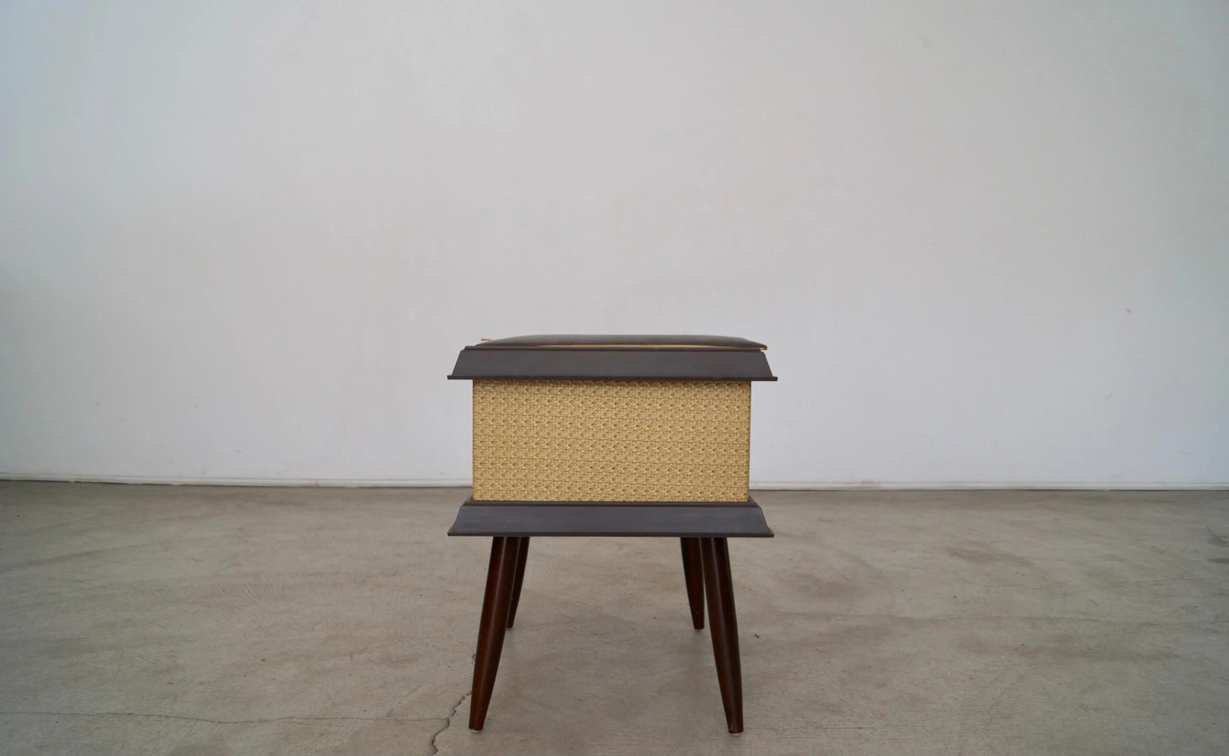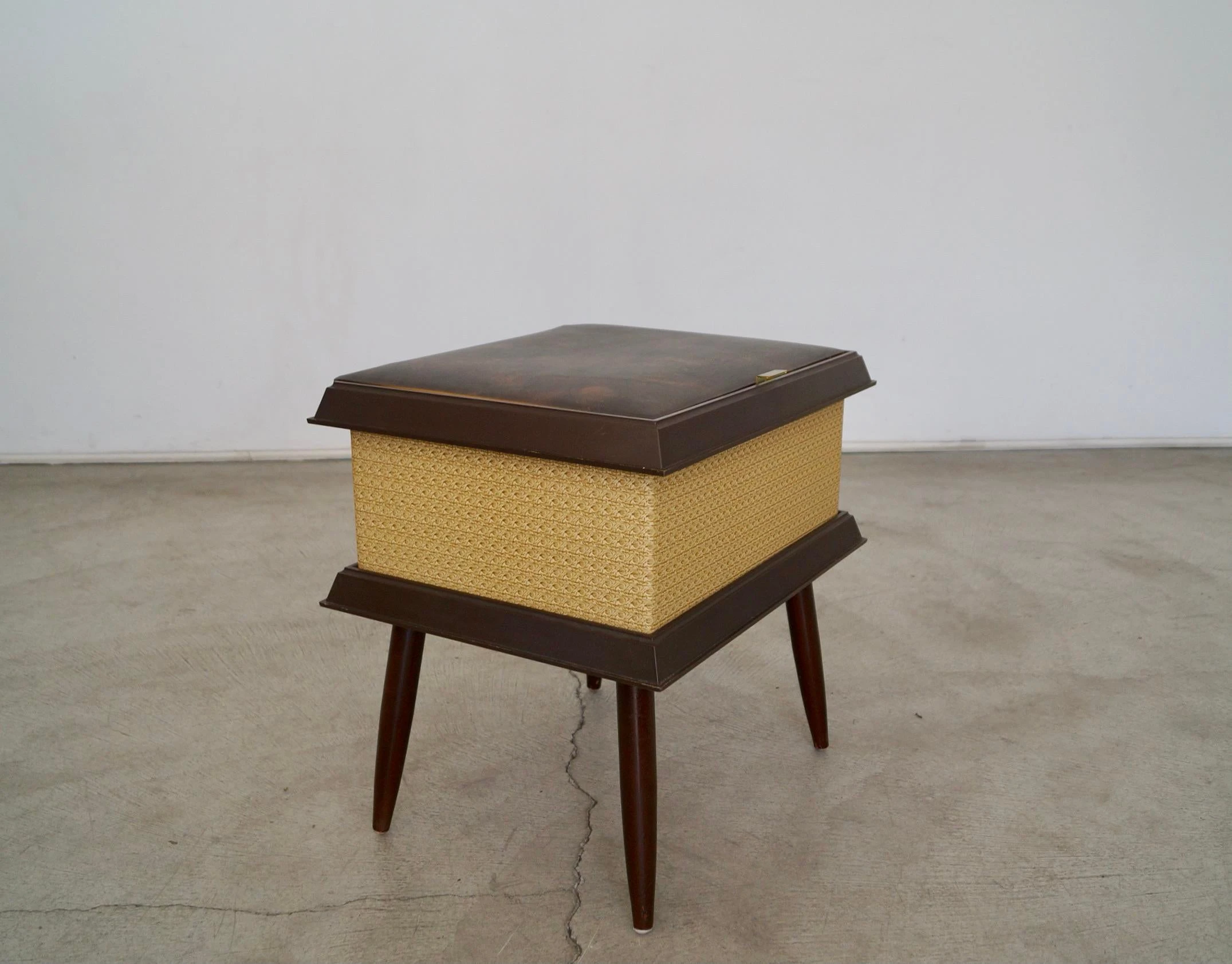 Vintage Mid-century stool ottoman for sale. The top opens for storage. It’s from the 1960’s, and was manufactured by Pearl-Wick in Long Island, New York. It’s in amazing condition. The top has a naugahyde vinyl with a gold trim in the center and walnut finished tapered legs. It’s a great piece to store items. It’s not strong enough to sit on as it’s a storage piece.
