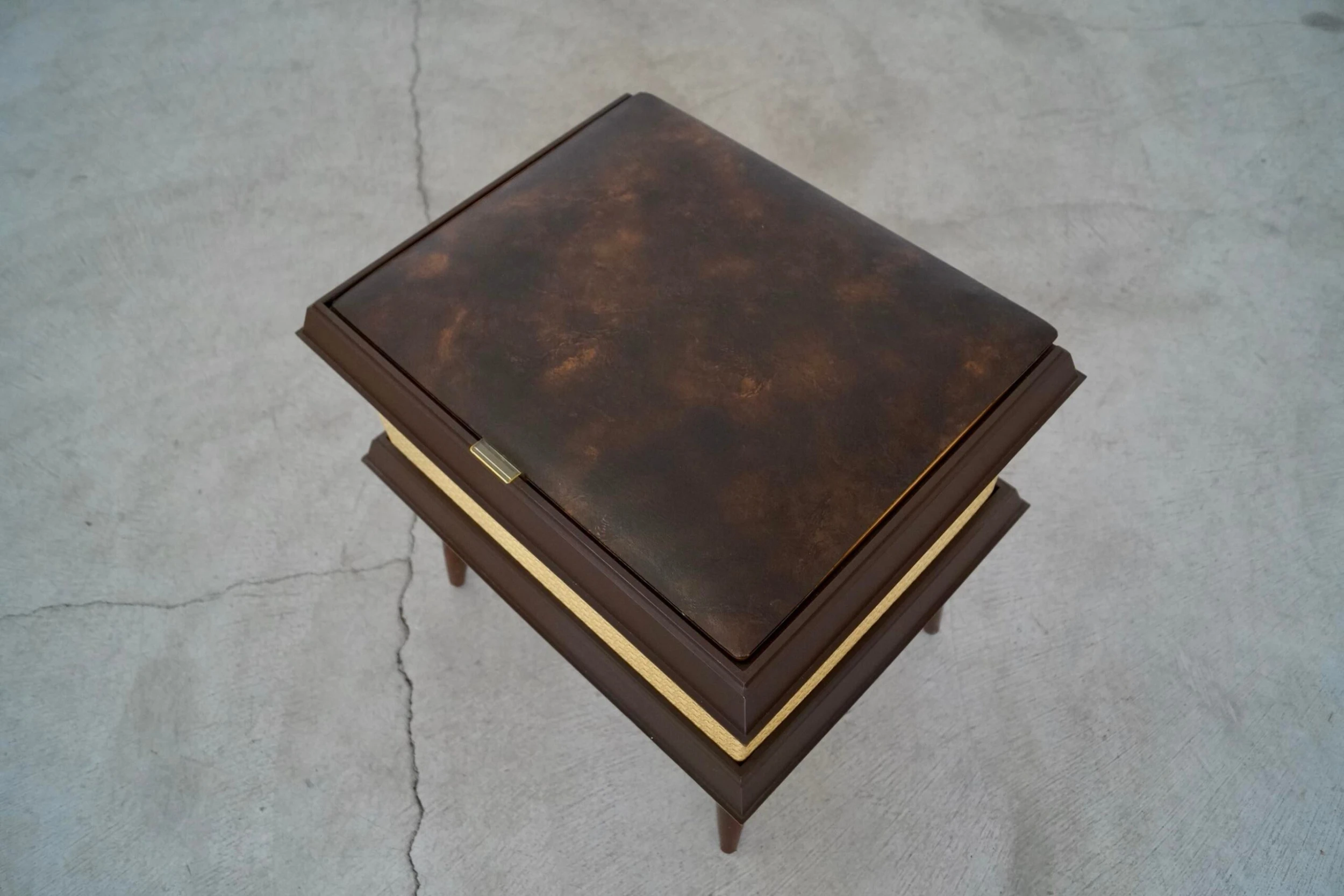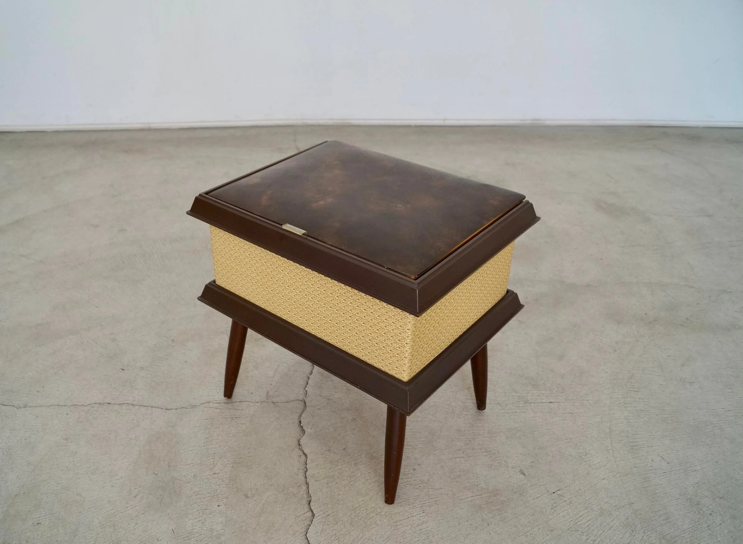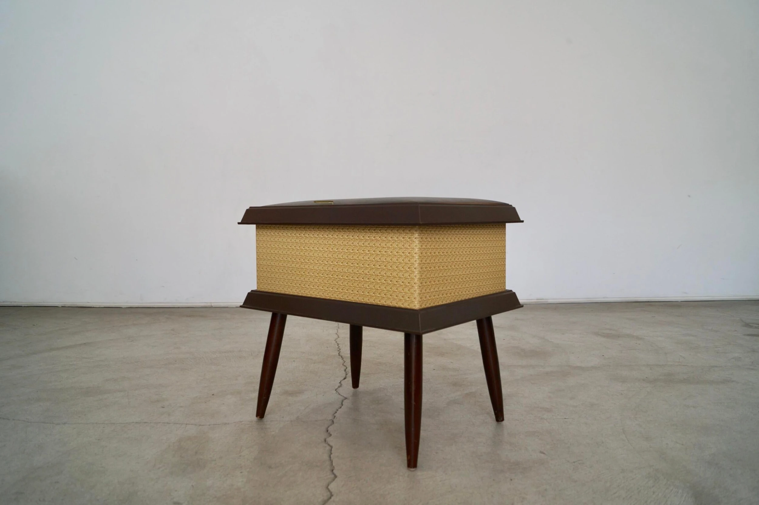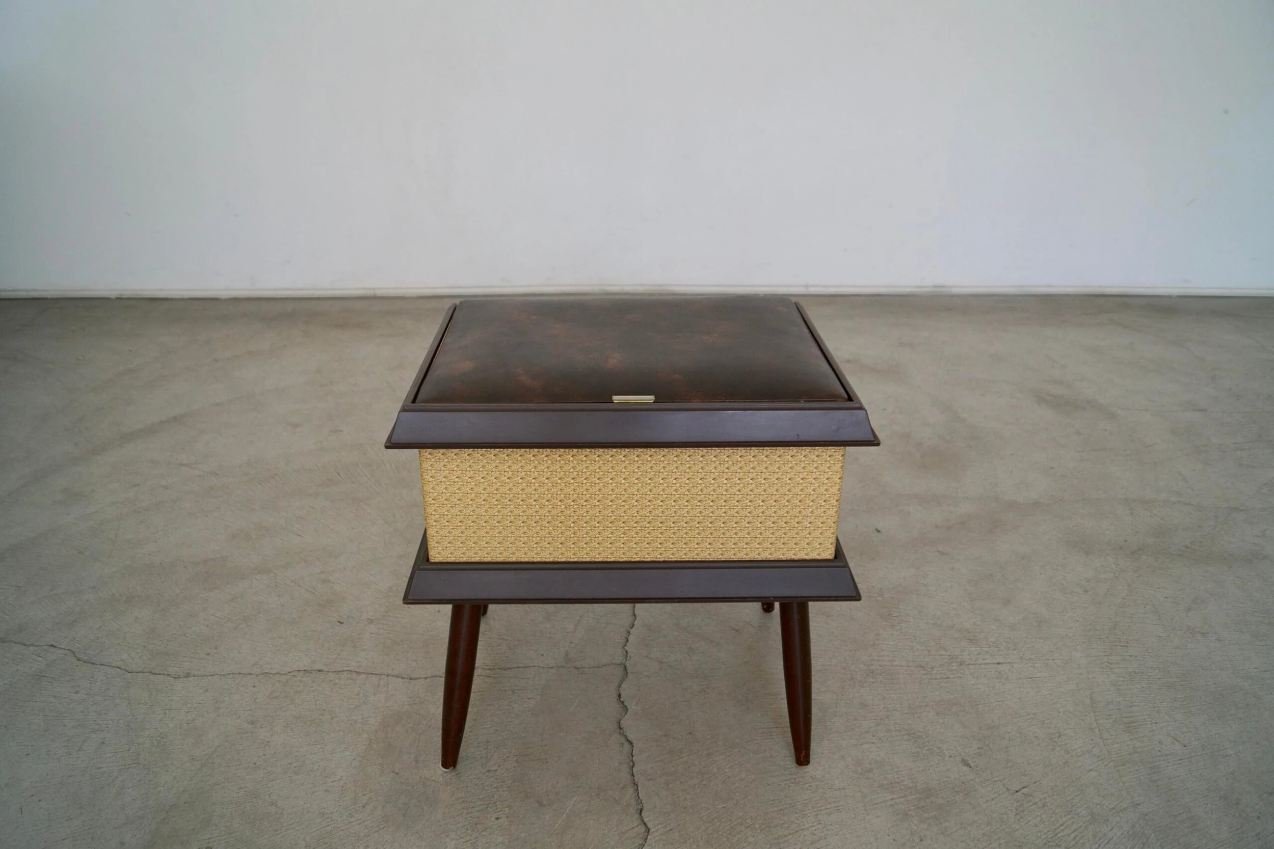 Vintage Mid-century stool ottoman for sale. The top opens for storage. It’s from the 1960’s, and was manufactured by Pearl-Wick in Long Island, New York. It’s in amazing condition. The top has a naugahyde vinyl with a gold trim in the center and walnut finished tapered legs. It’s a great piece to store items. It’s not strong enough to sit on as it’s a storage piece.