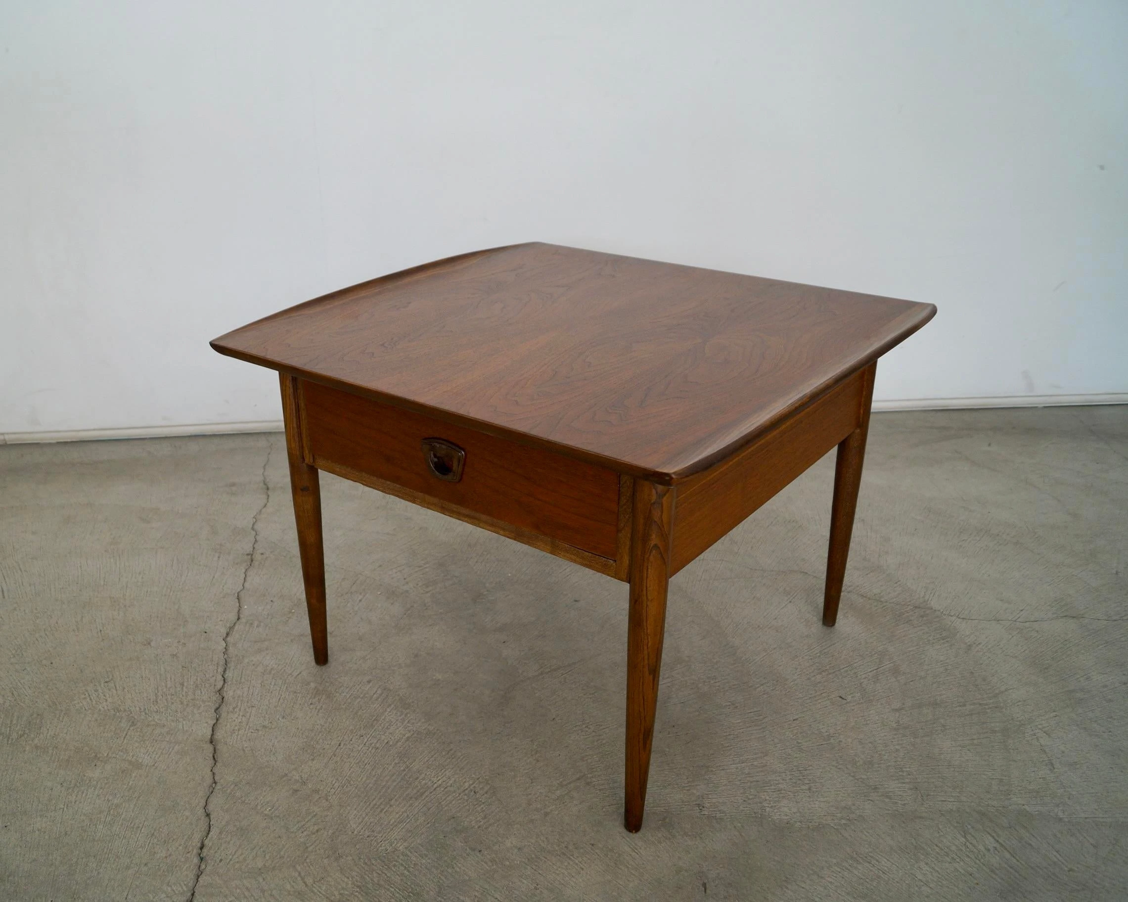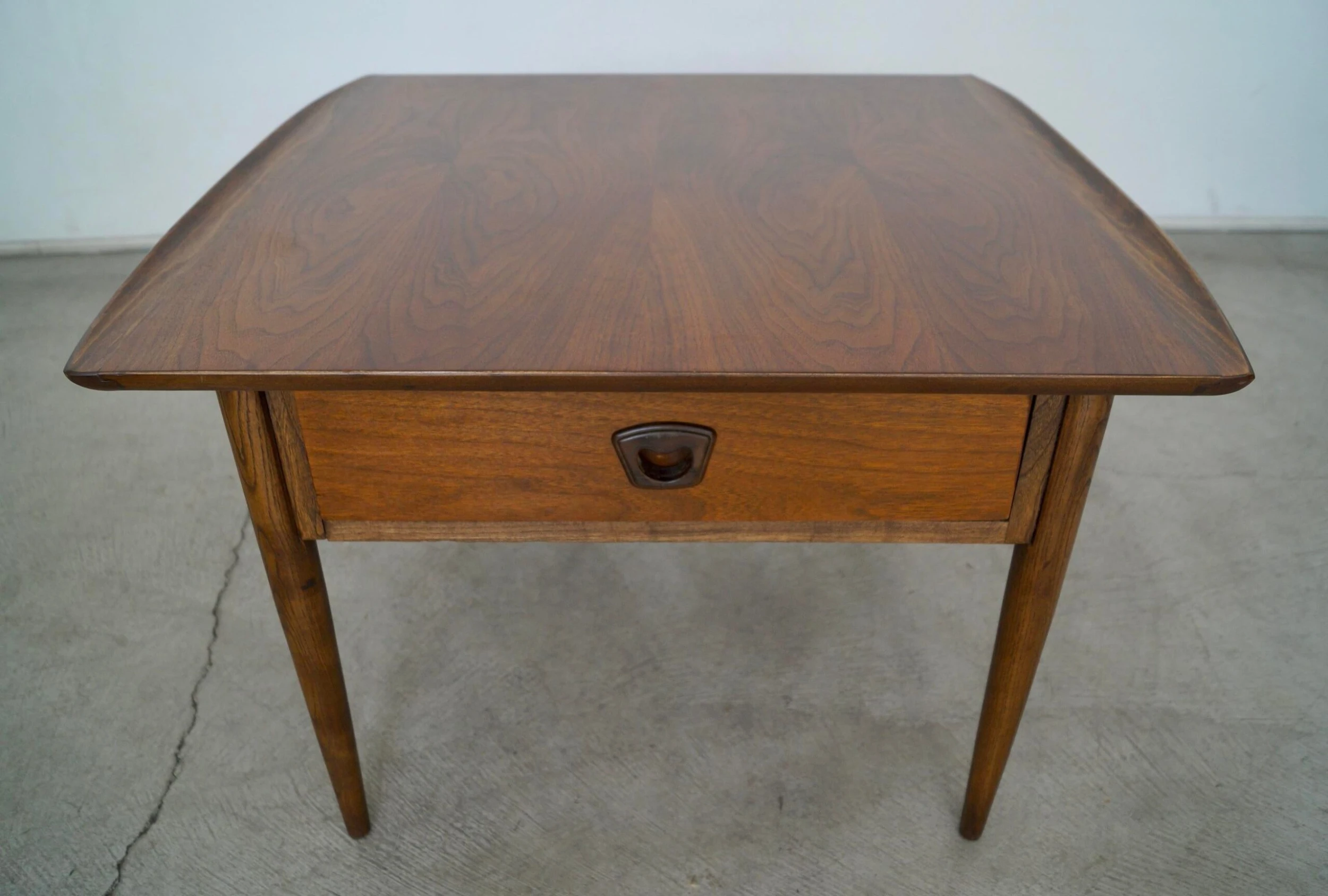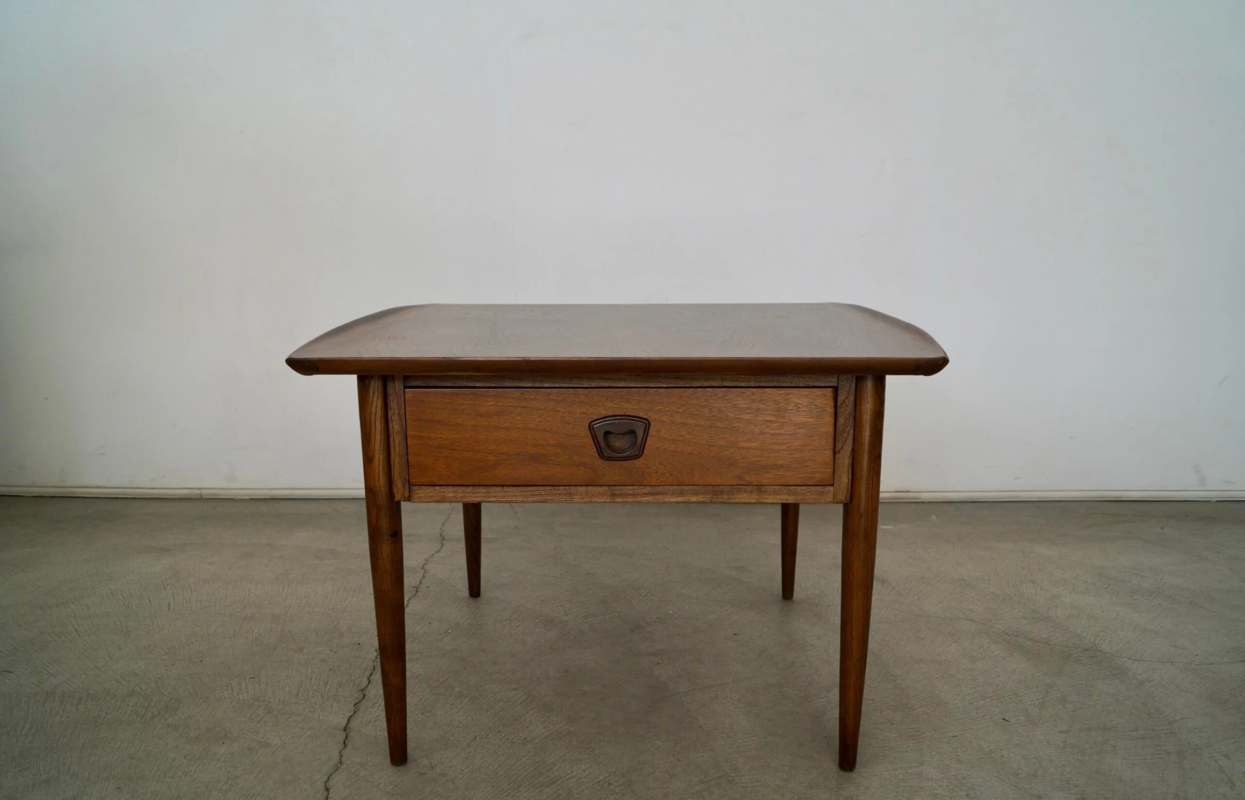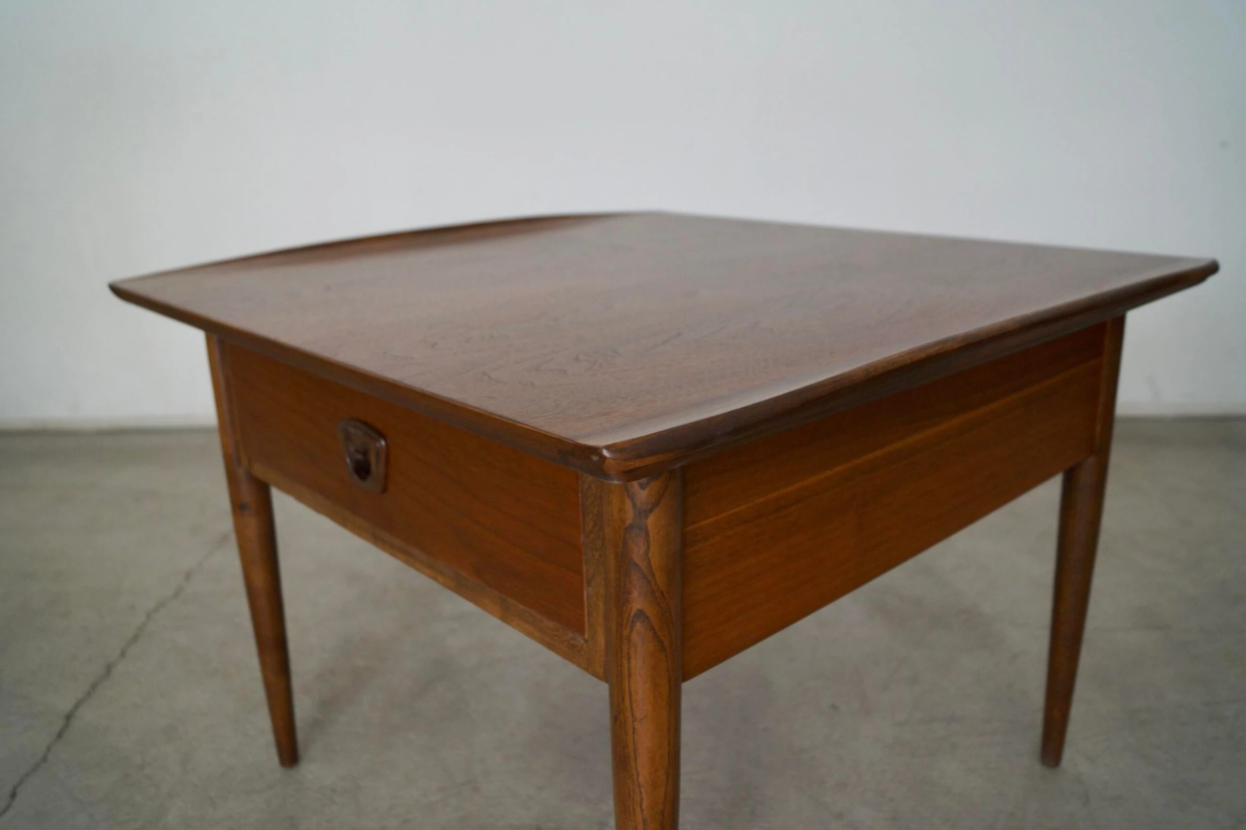 Vintage 1960’s Mid century Modern side table for sale. It has been professionally refinished and looks beautifully restored. It has a Danish Modern design with a drawer and recessed handle. The woodwork is fantastic and has curved wood lips on either end. It’s really solid and well made, and large. The walnut grain on the surface is beautiful.