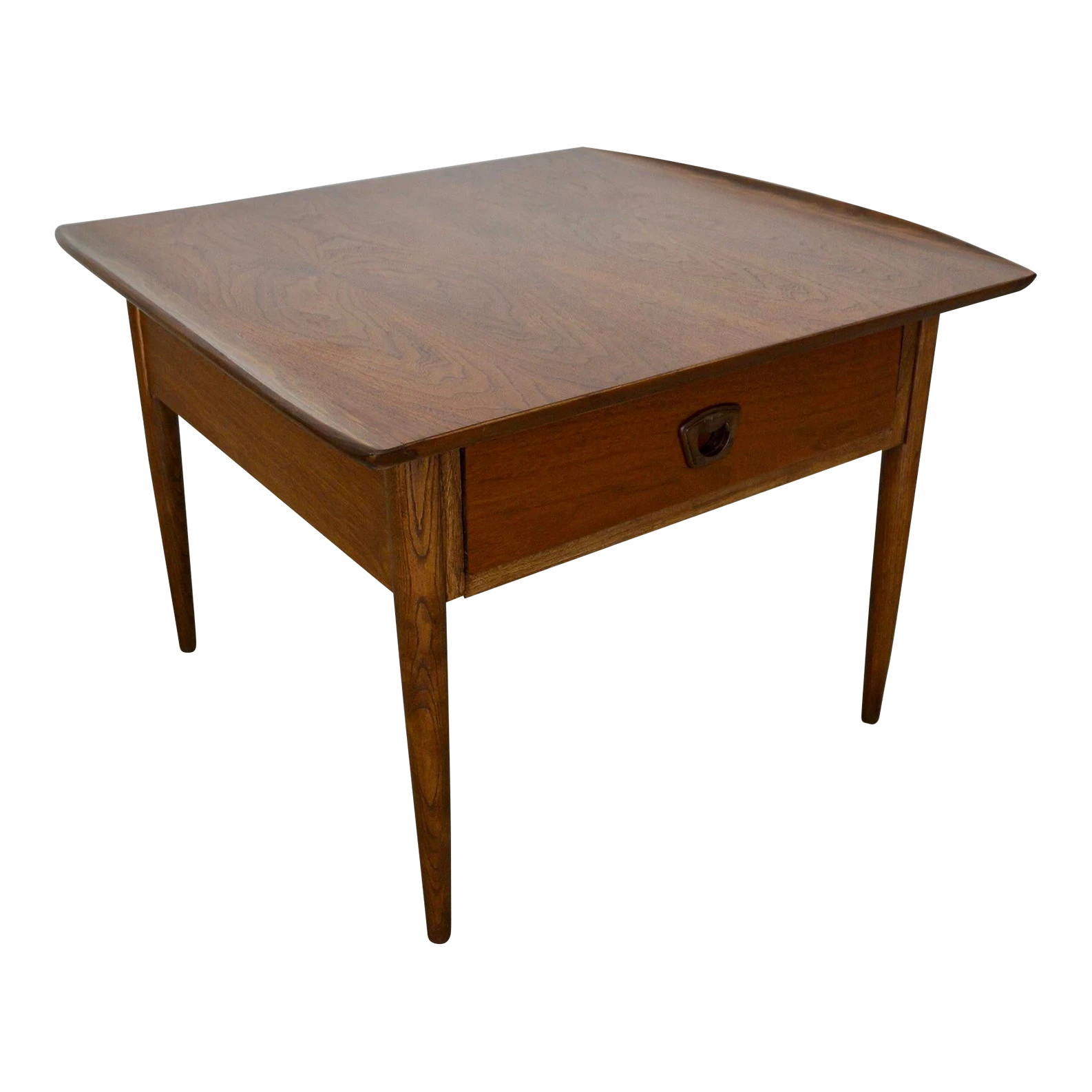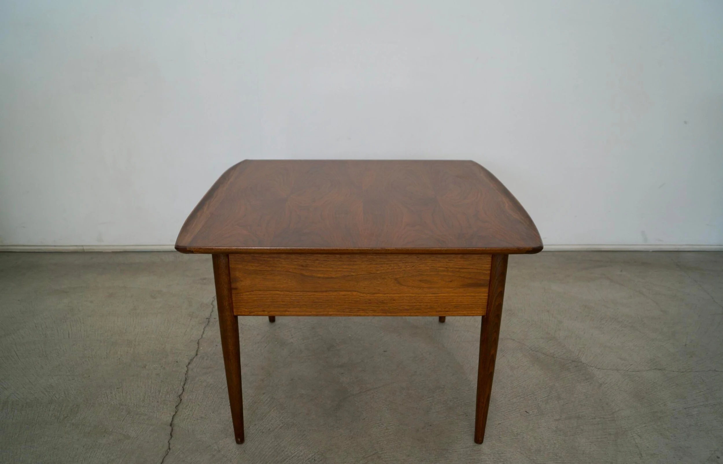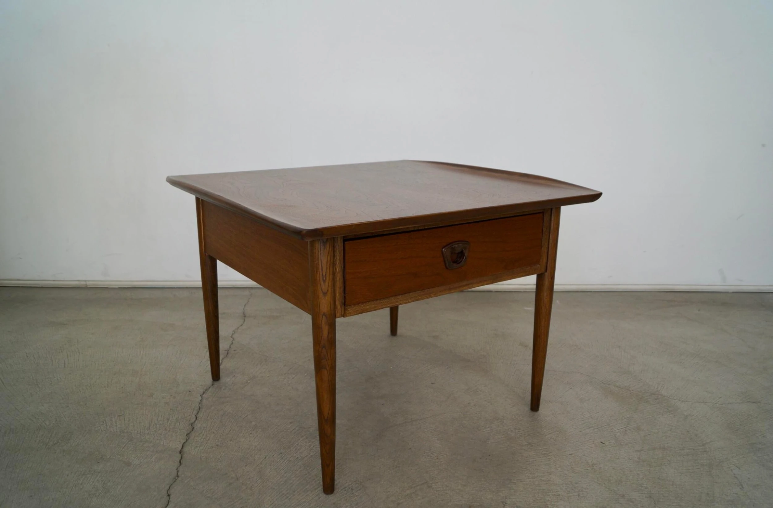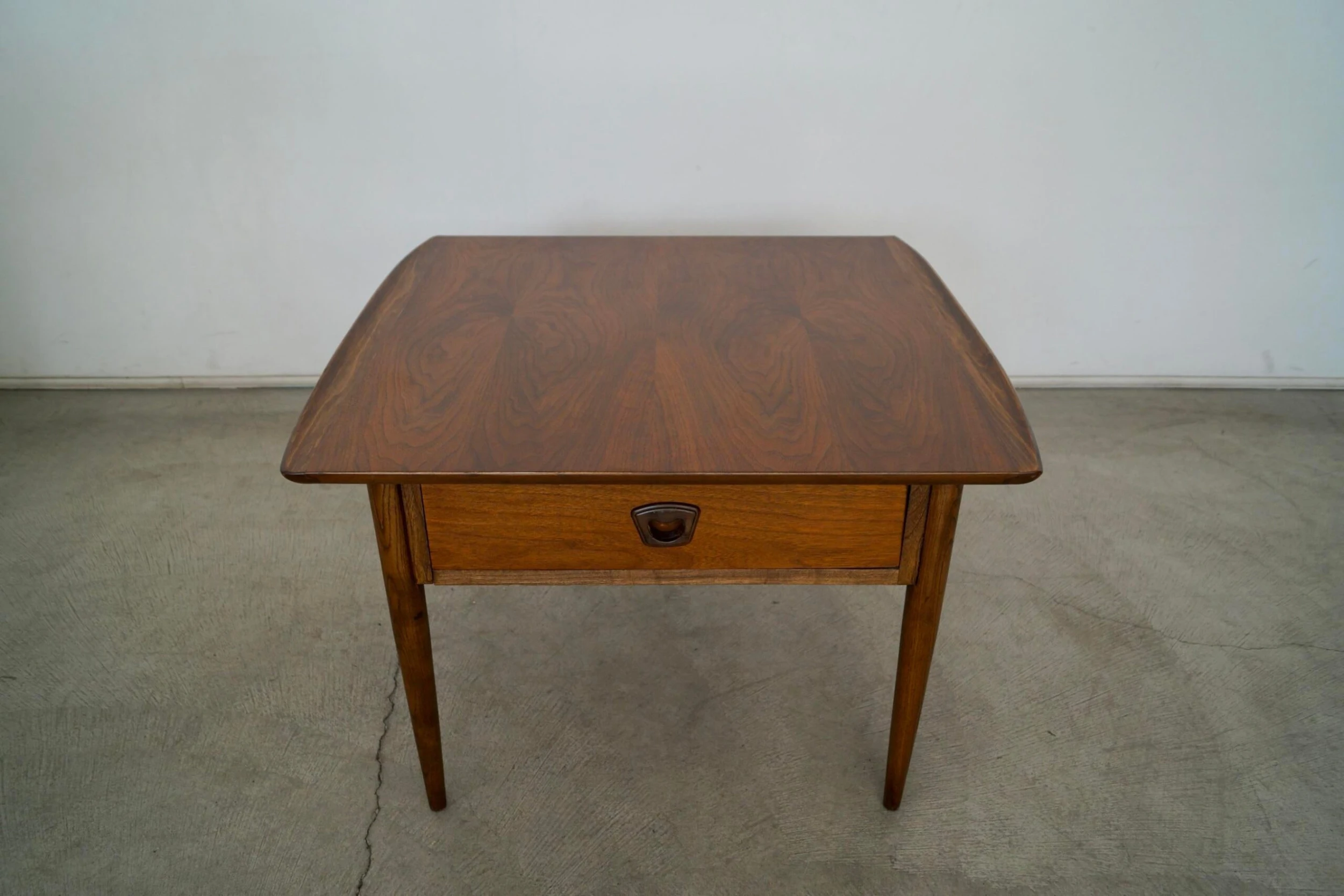 Vintage 1960’s Mid century Modern side table for sale. It has been professionally refinished and looks beautifully restored. It has a Danish Modern design with a drawer and recessed handle. The woodwork is fantastic and has curved wood lips on either end. It’s really solid and well made, and large. The walnut grain on the surface is beautiful.