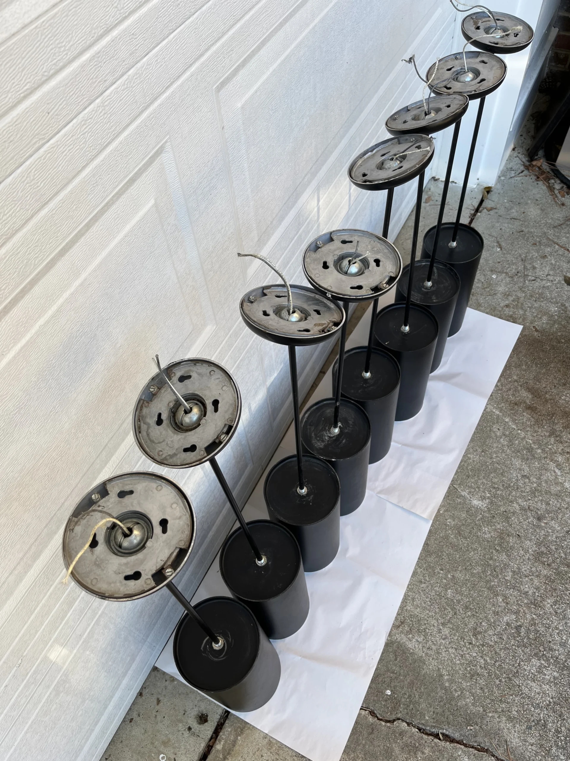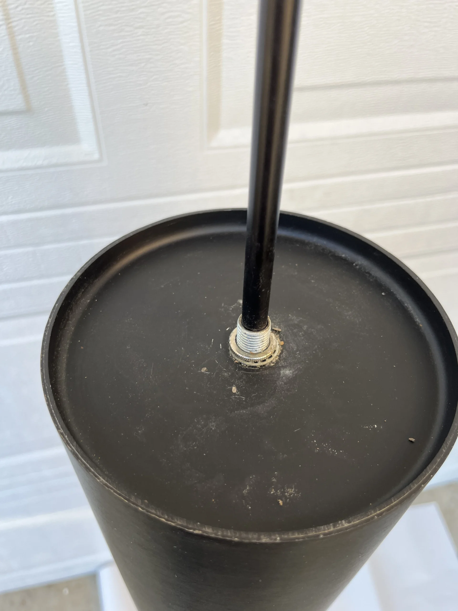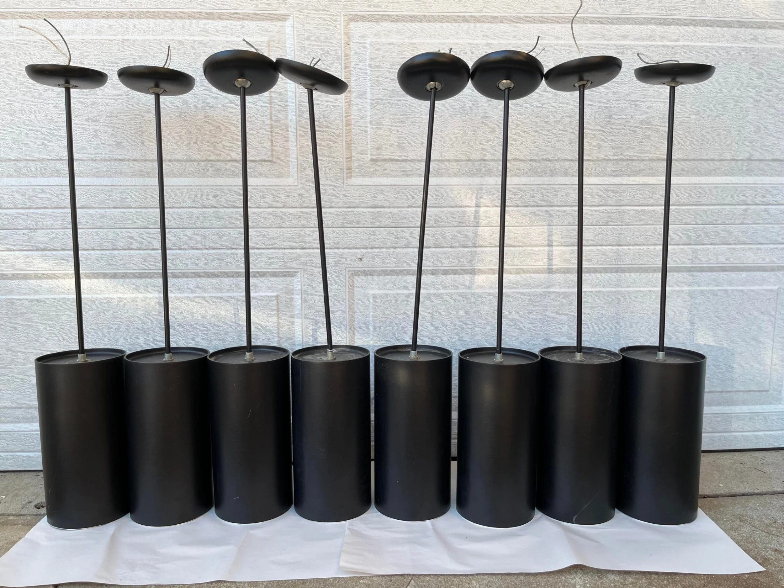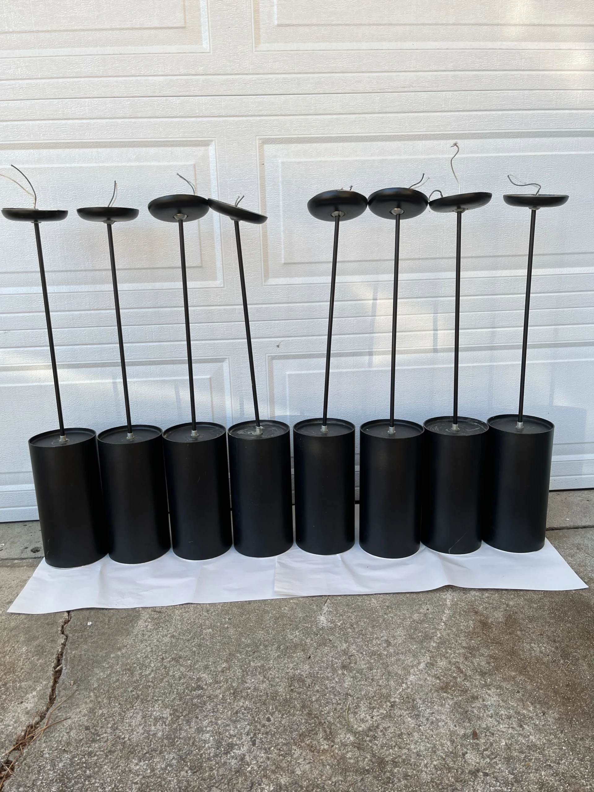 1960’s minimalist black cylindrical pendant lights by Prescolite. A pivoting mechanism makes it so that these can hang from a …