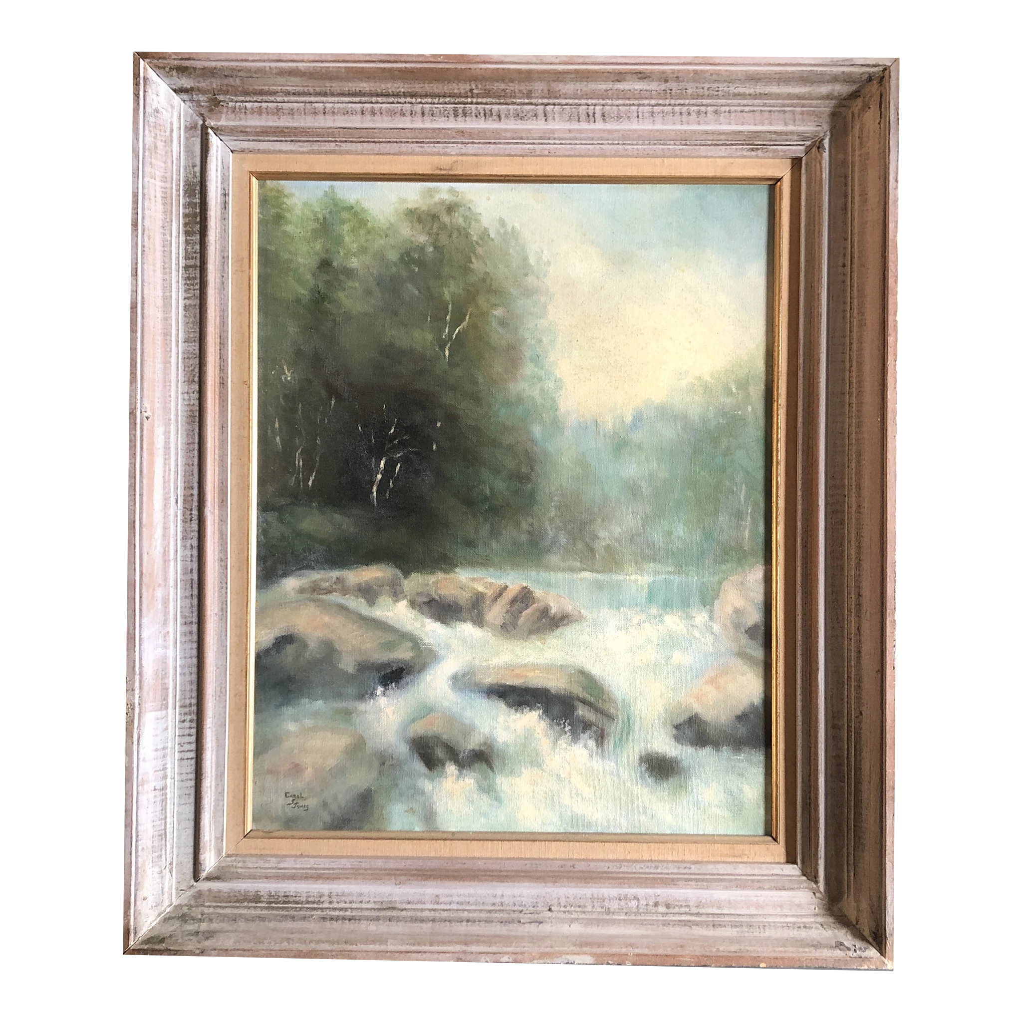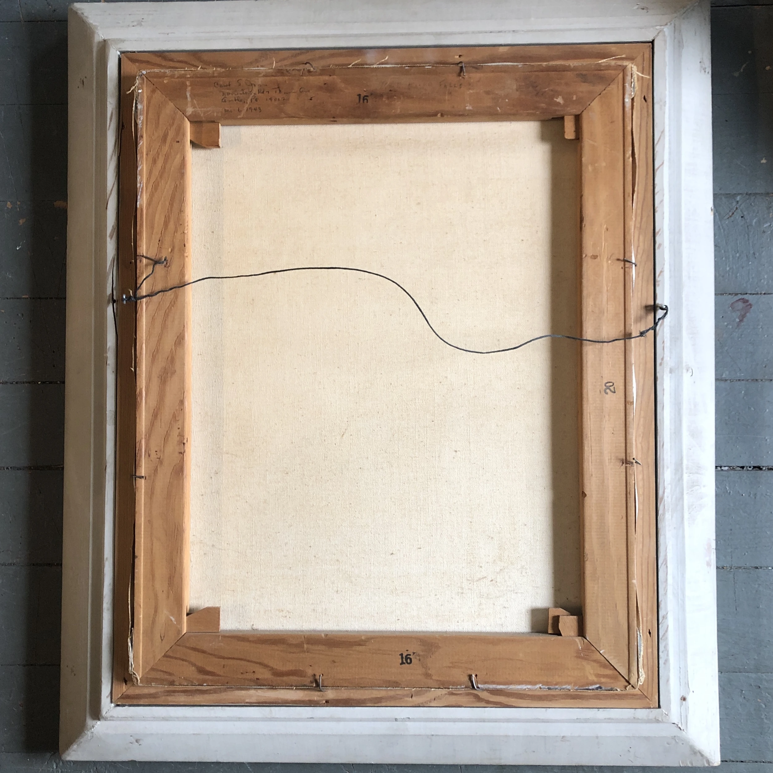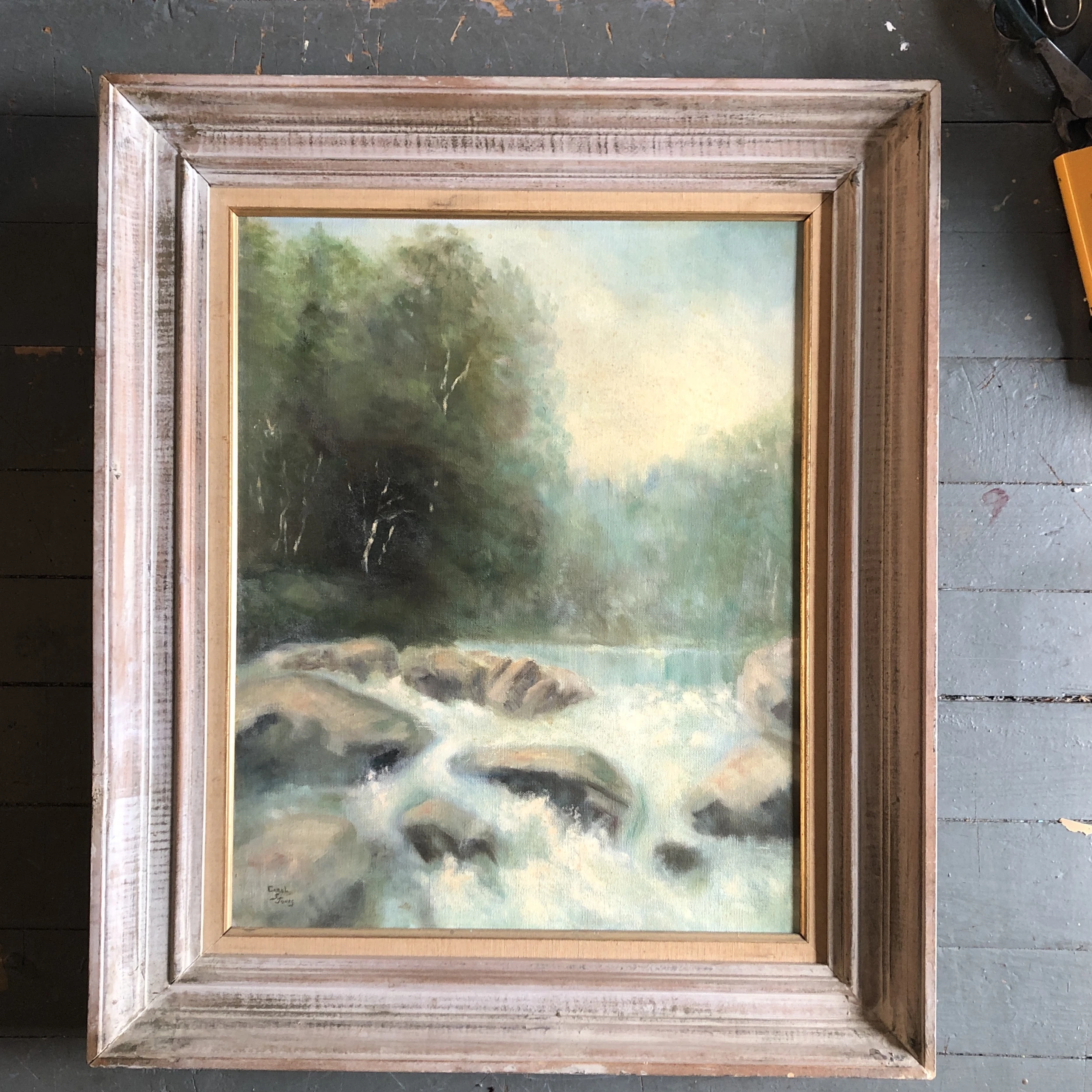 Original 16 x 20 painting on stretched canvas signed bottom left overall size with vintage original modernist frame with aged …