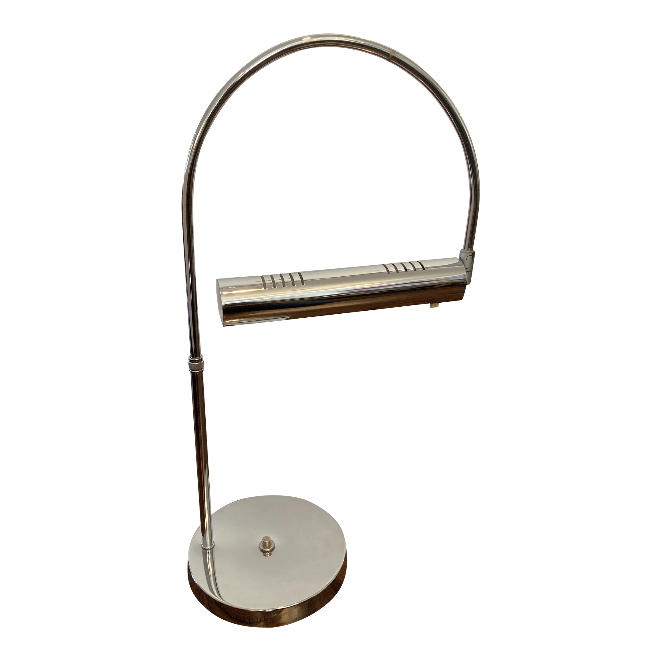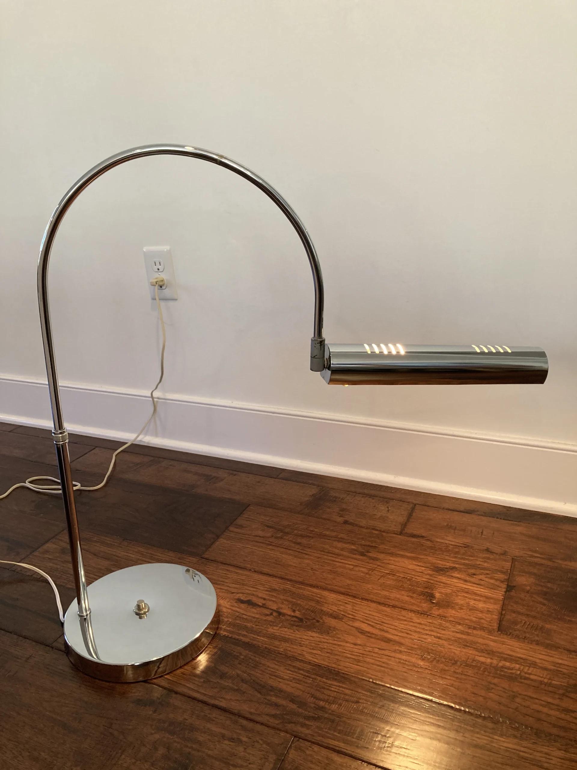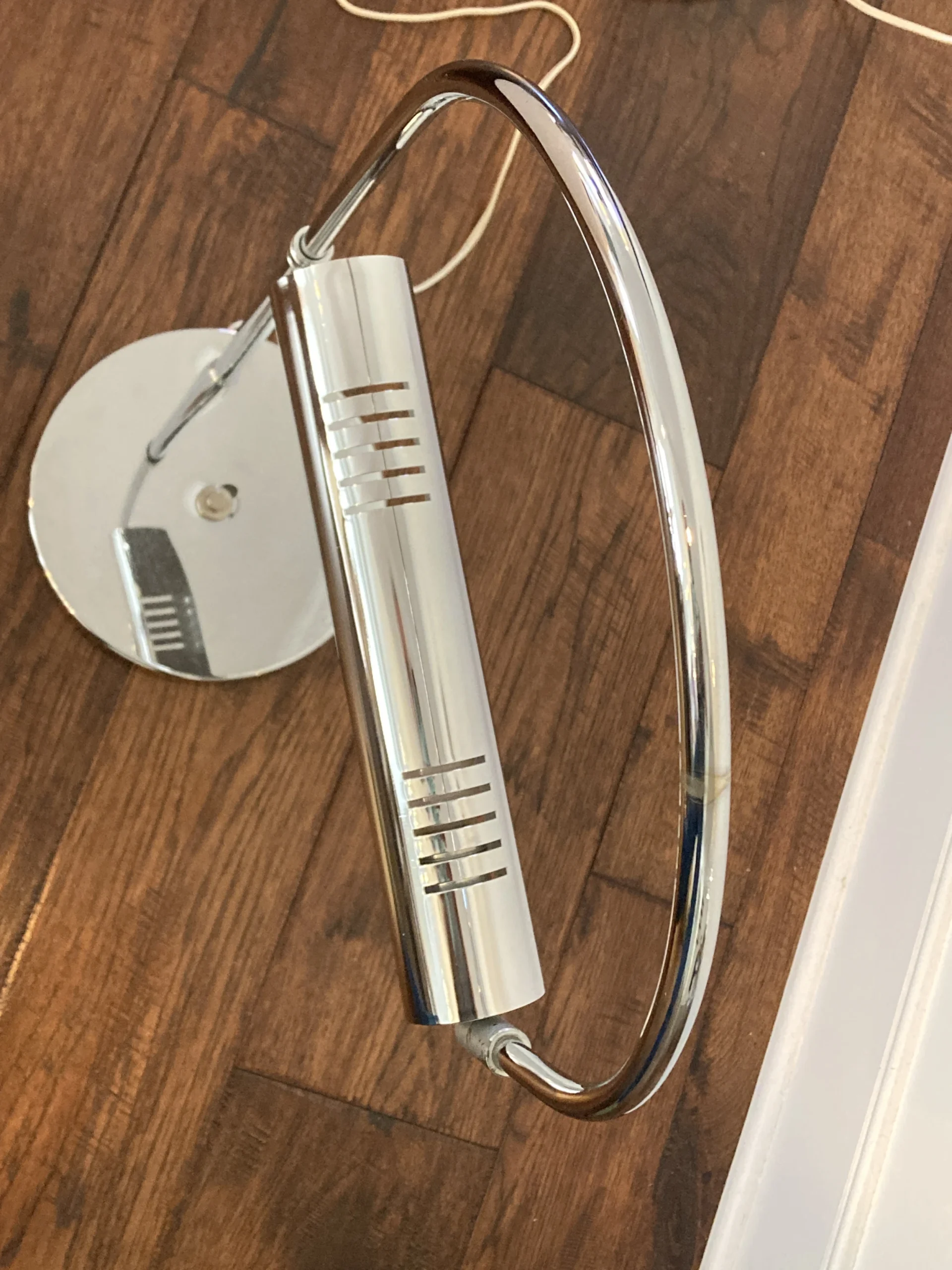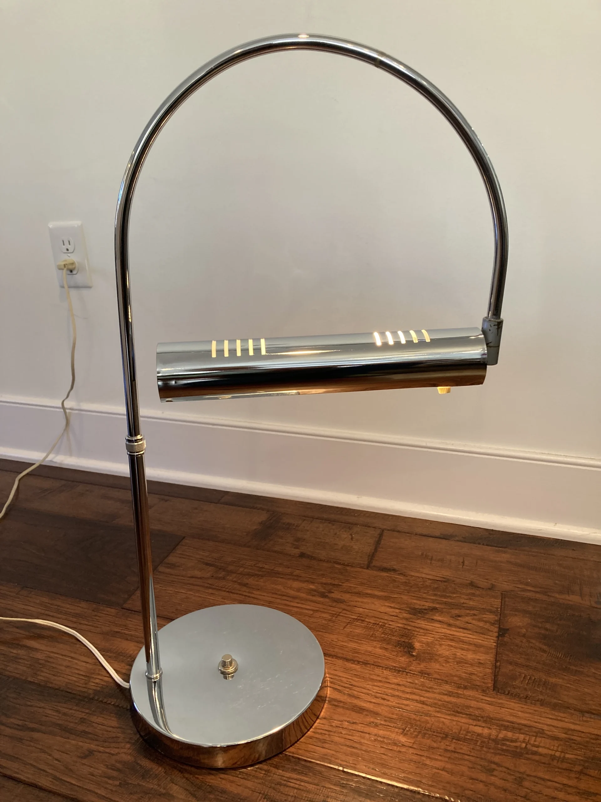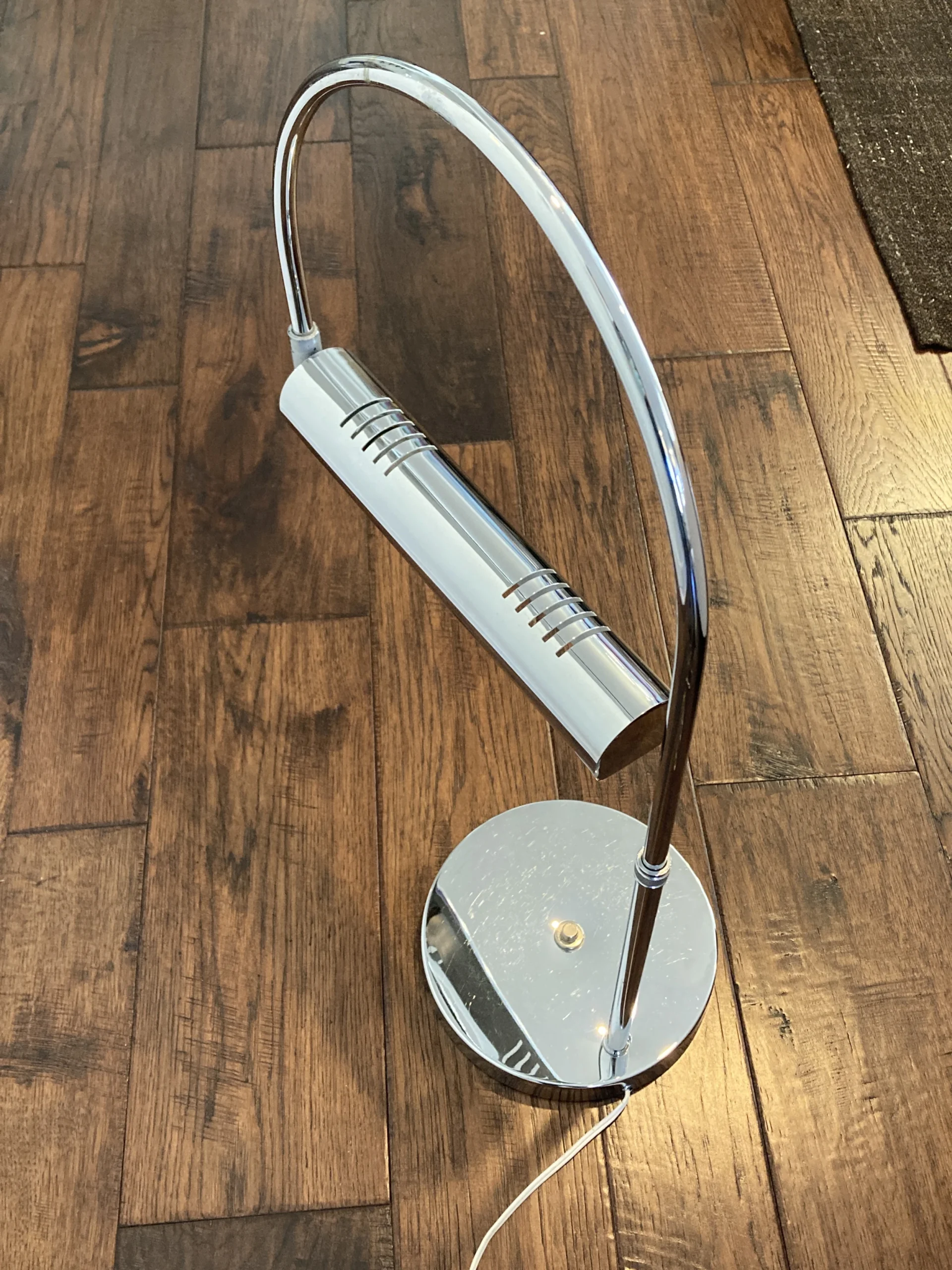 Nice polished chrome lamp with unique style and desktop presence. Hoop support swivels on base and lamp further swivels from …