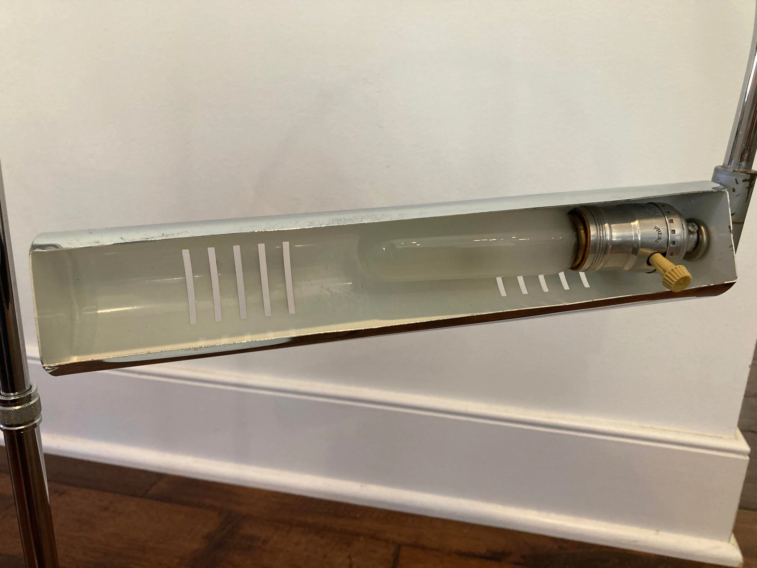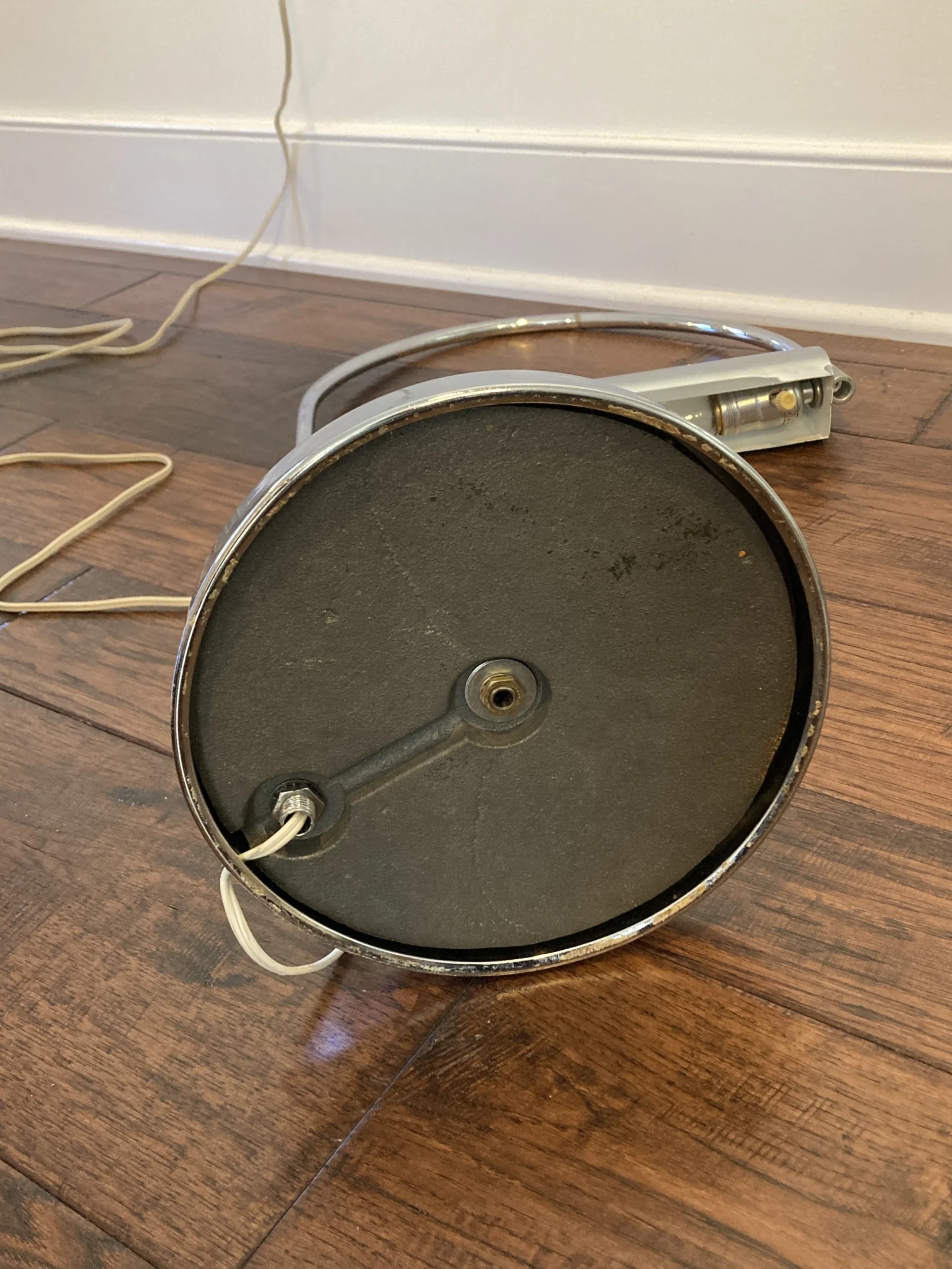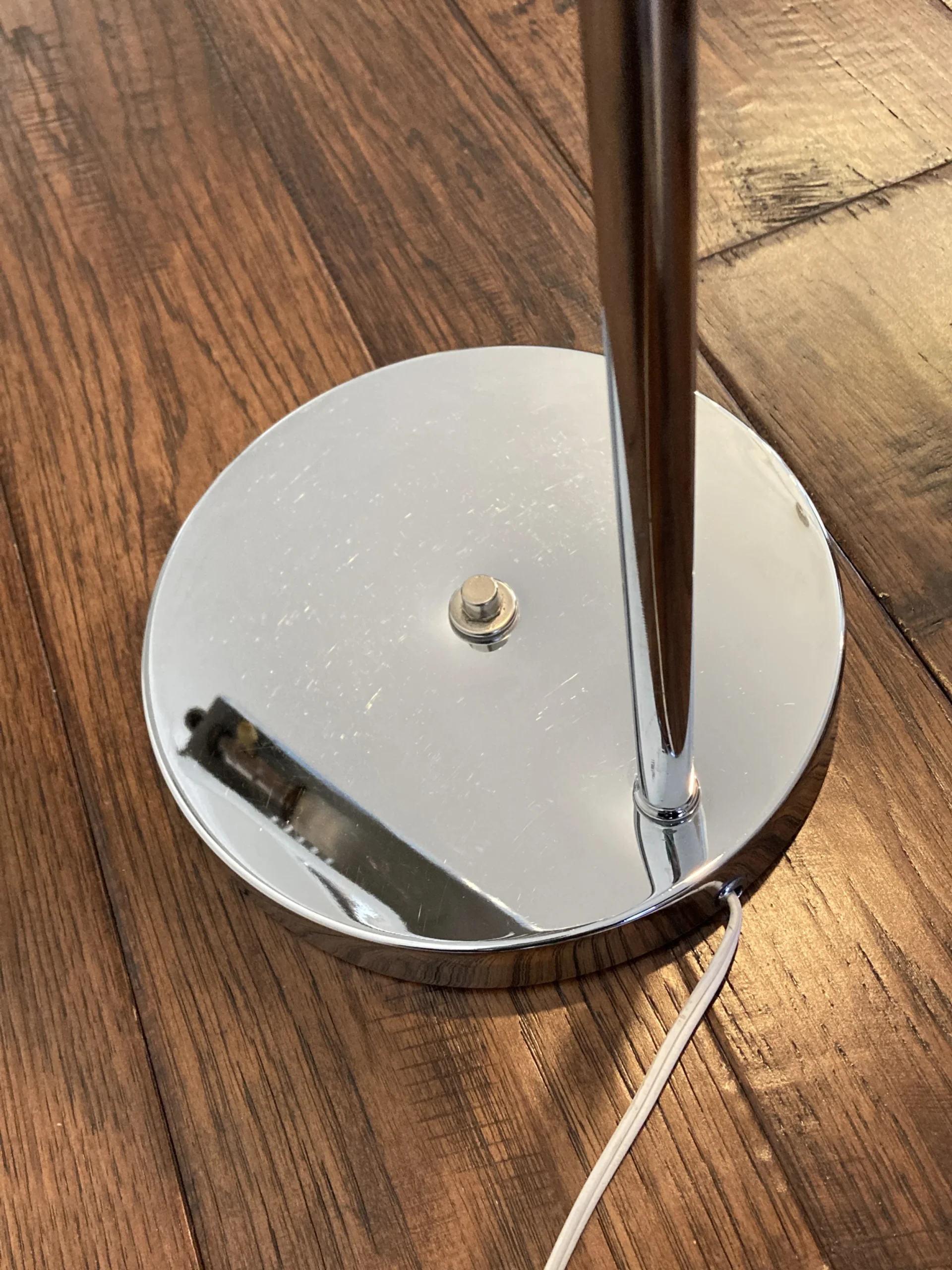 Nice polished chrome lamp with unique style and desktop presence. Hoop support swivels on base and lamp further swivels from curved arm as seen in photos. Polished chrome finish is overall in excellent condition with very minimal visible marks consistent with age and prior use. Heavy cast metal weight in base – approx. 13 lbs. total weight. Uses tubular medium base bulb. Base is 9″ in diameter, lamp housing is 12″ long. Height to top of hoop as seen in photos is 27″ – can be lowered using twist ferrule on the upright.