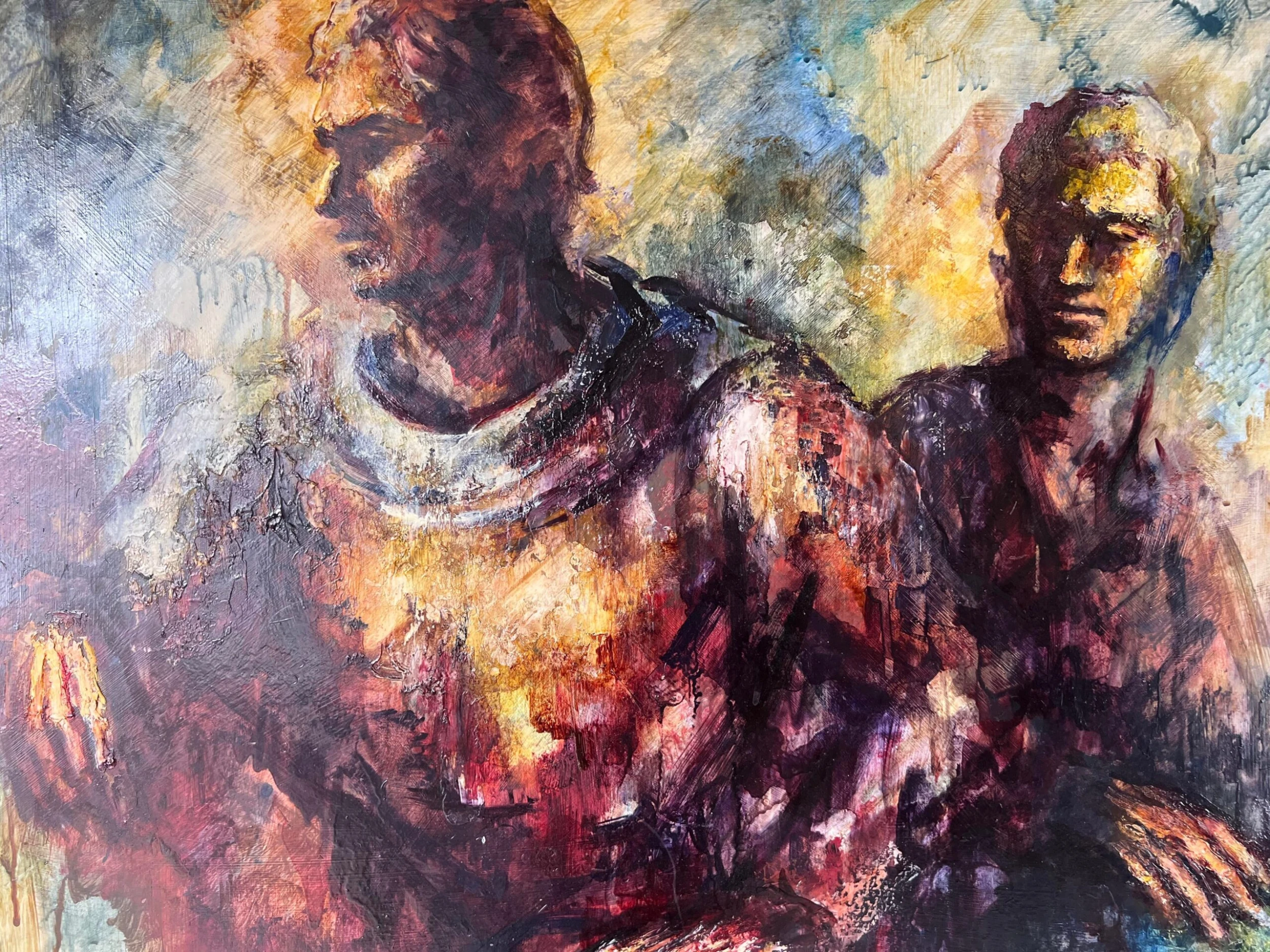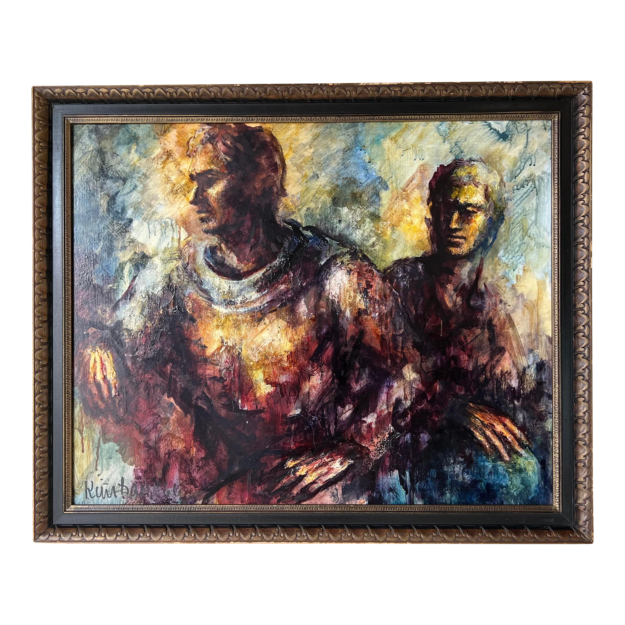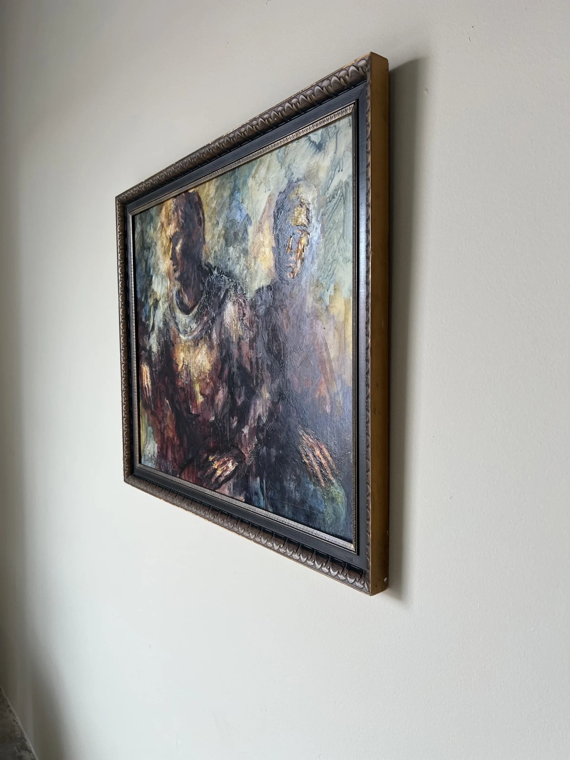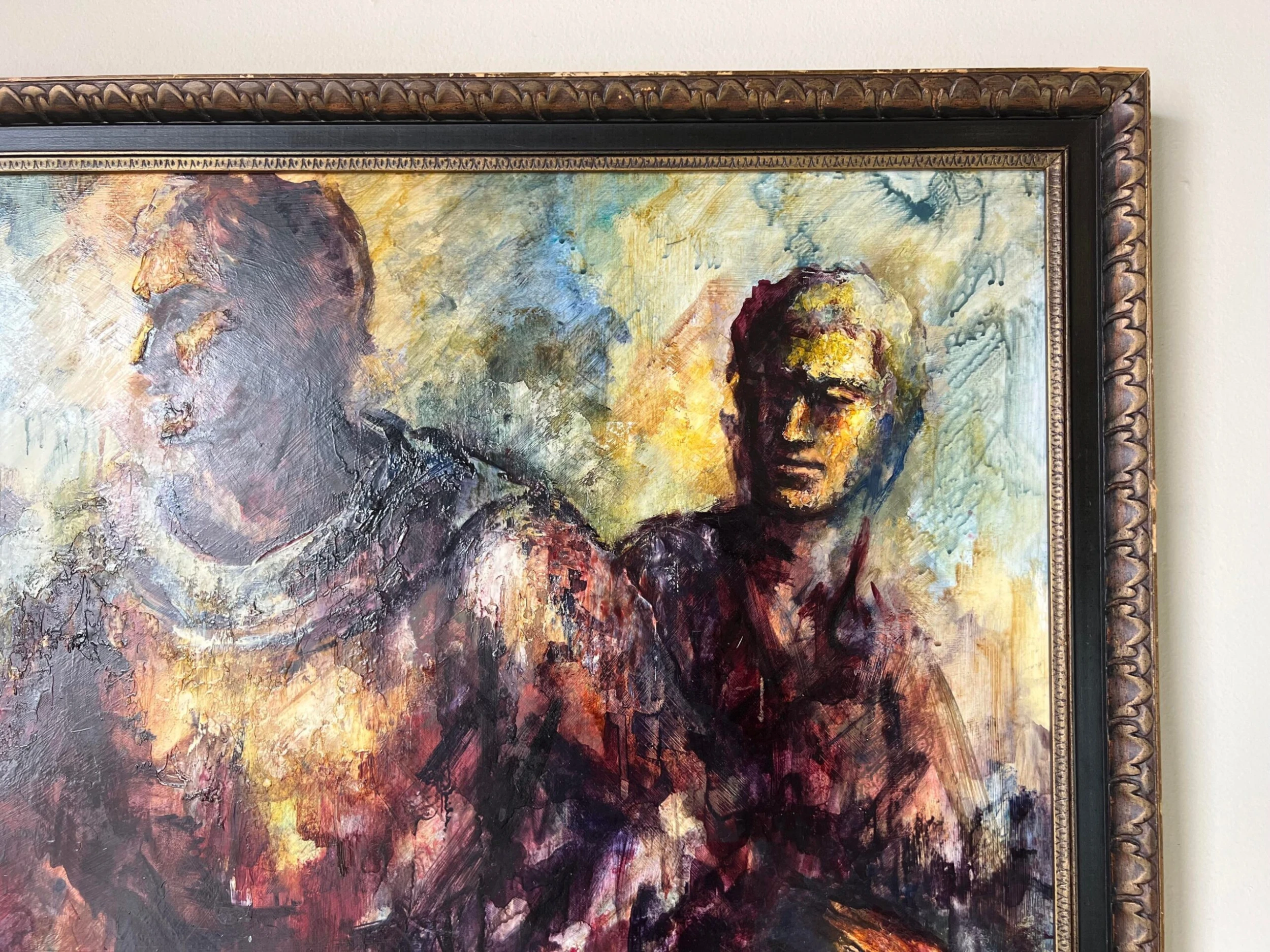 An incredibly well executed impressionist abstract figurative oil composition, painted in 1966 by the Swedish artist Kimball. Titled ” Hamlet + Horatto” Made In Sweden – mark on the back