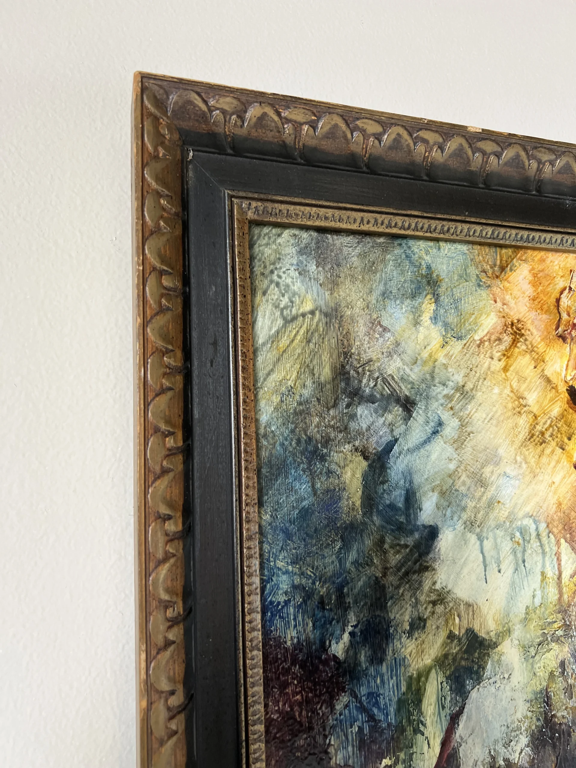 The painting is housed in a wooden frame that suits it very well. A hanging wire attached to the reverse side.