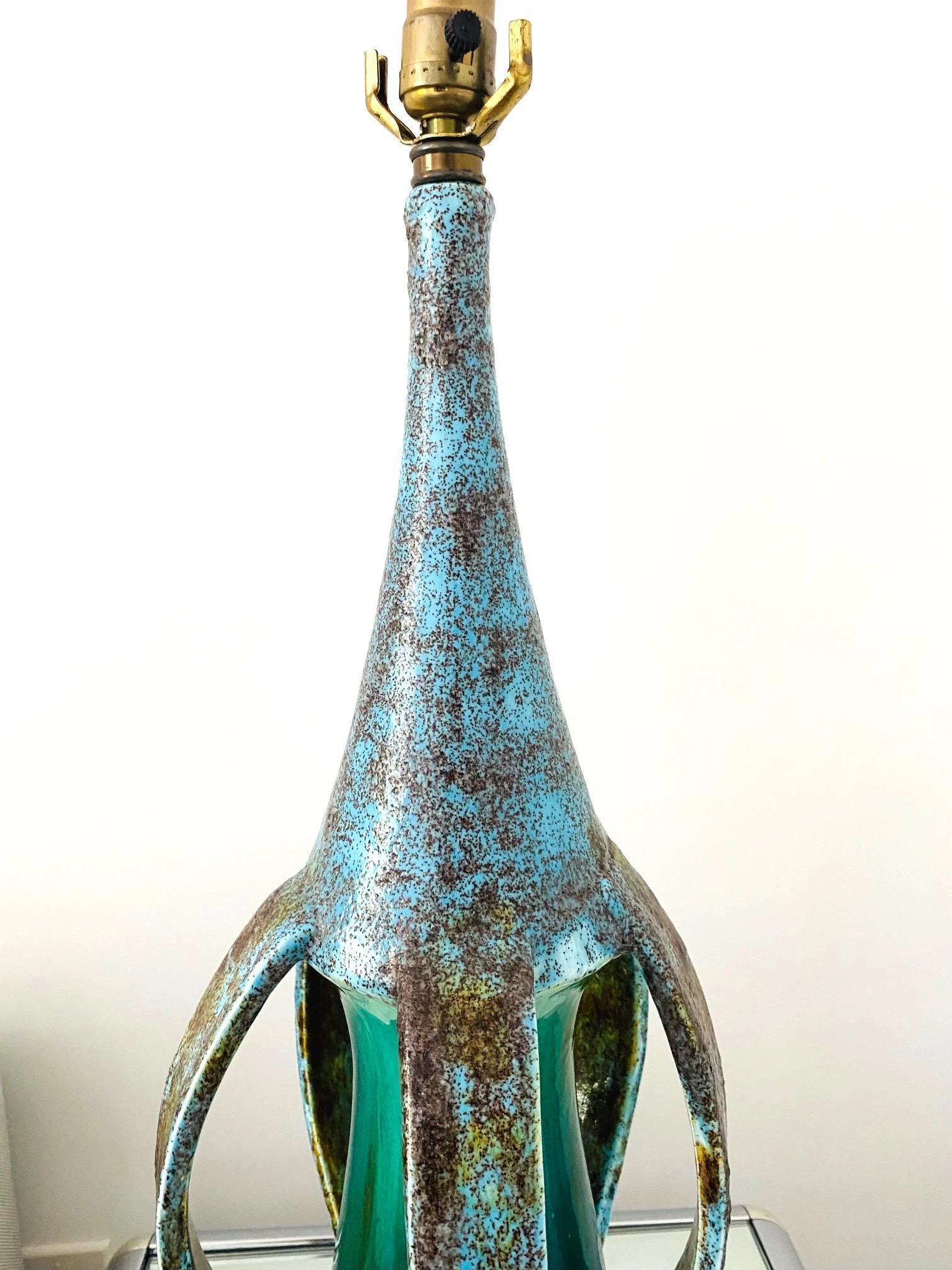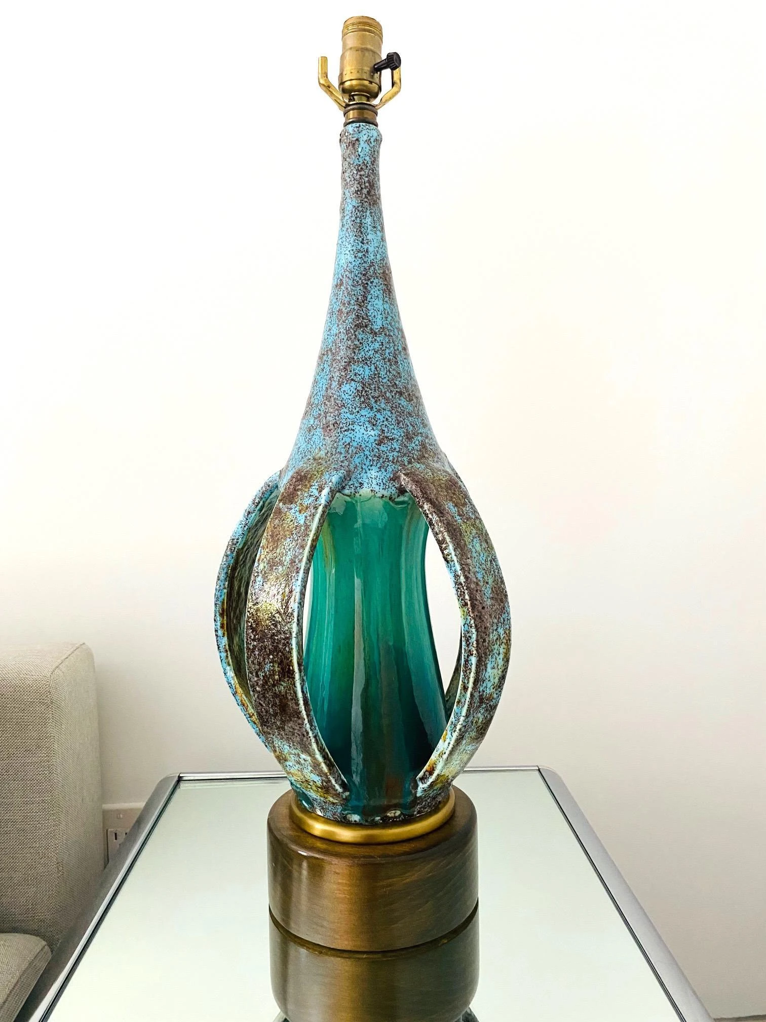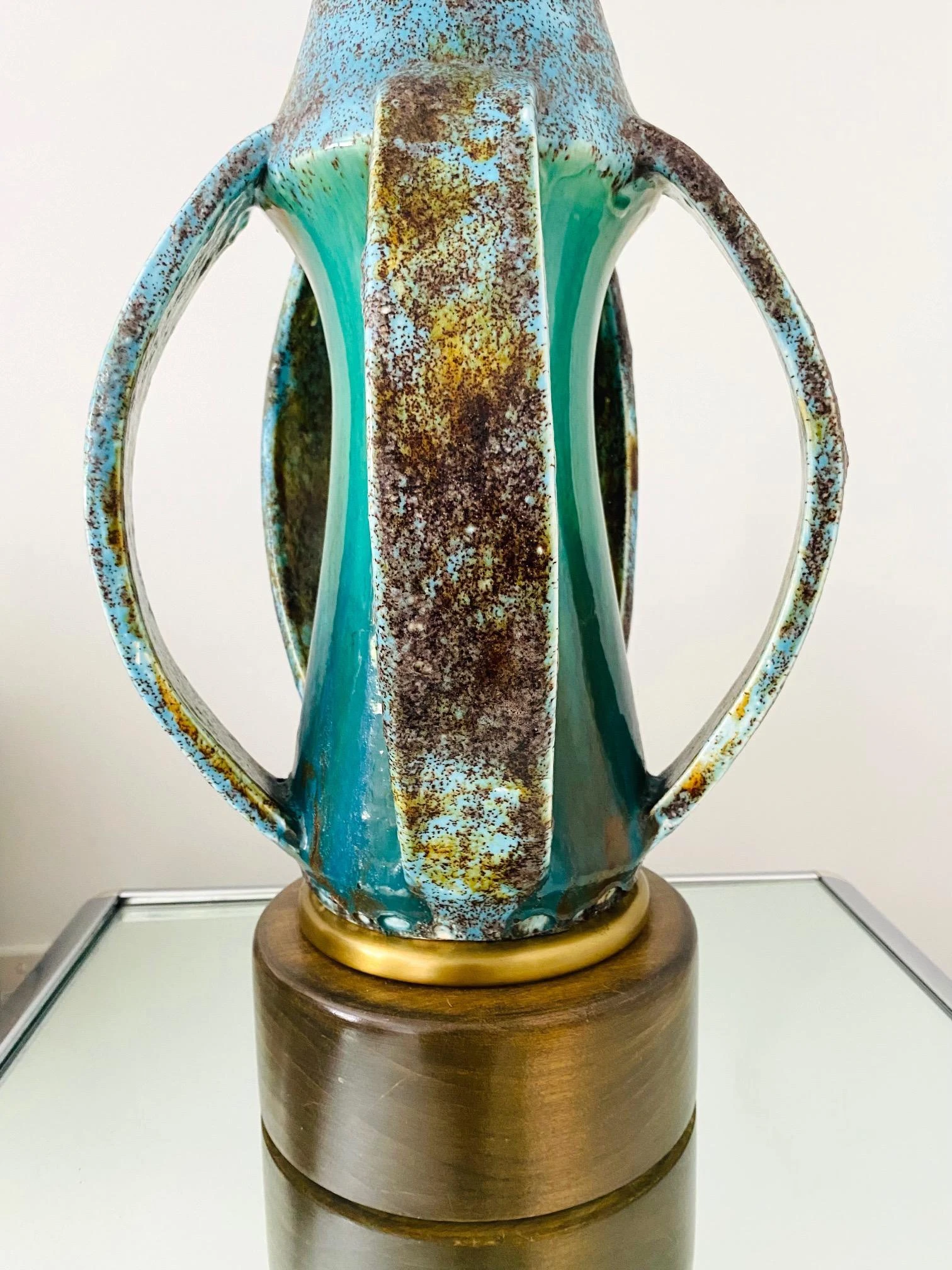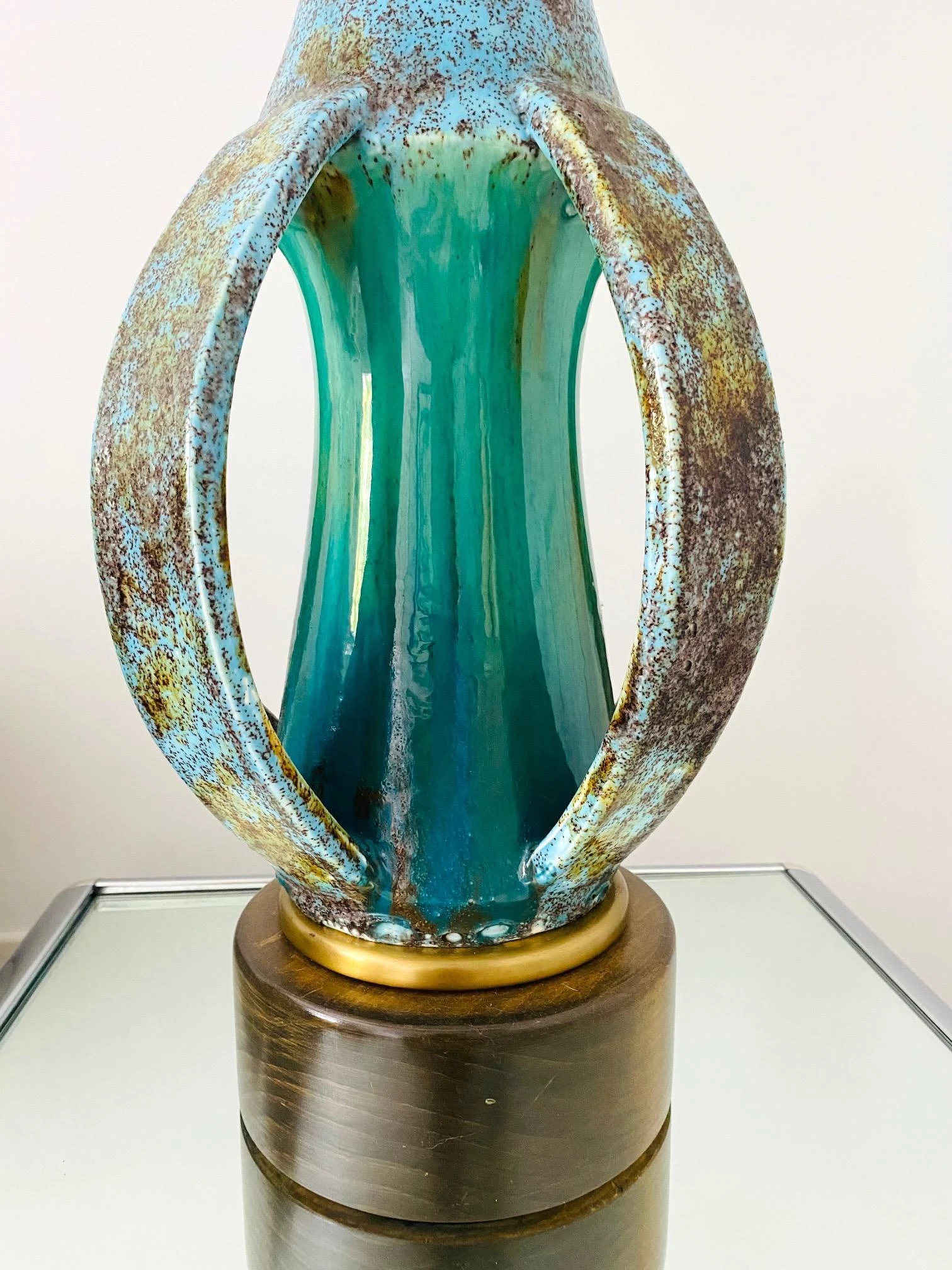Danish Mid-Century Modern stoneware lamp with glazed finish in turquoise blue. Unique Studio Pottery lamp features an elongated vessel with open slats along the lower portion. Beautifully handmade in extraordinary matte glazed finish of robin’s-egg blue with spotted hues of moss. The center stem portion has a high gloss finish in vibrant turquoise. Finished with a teak wood base with a brass trim detail.