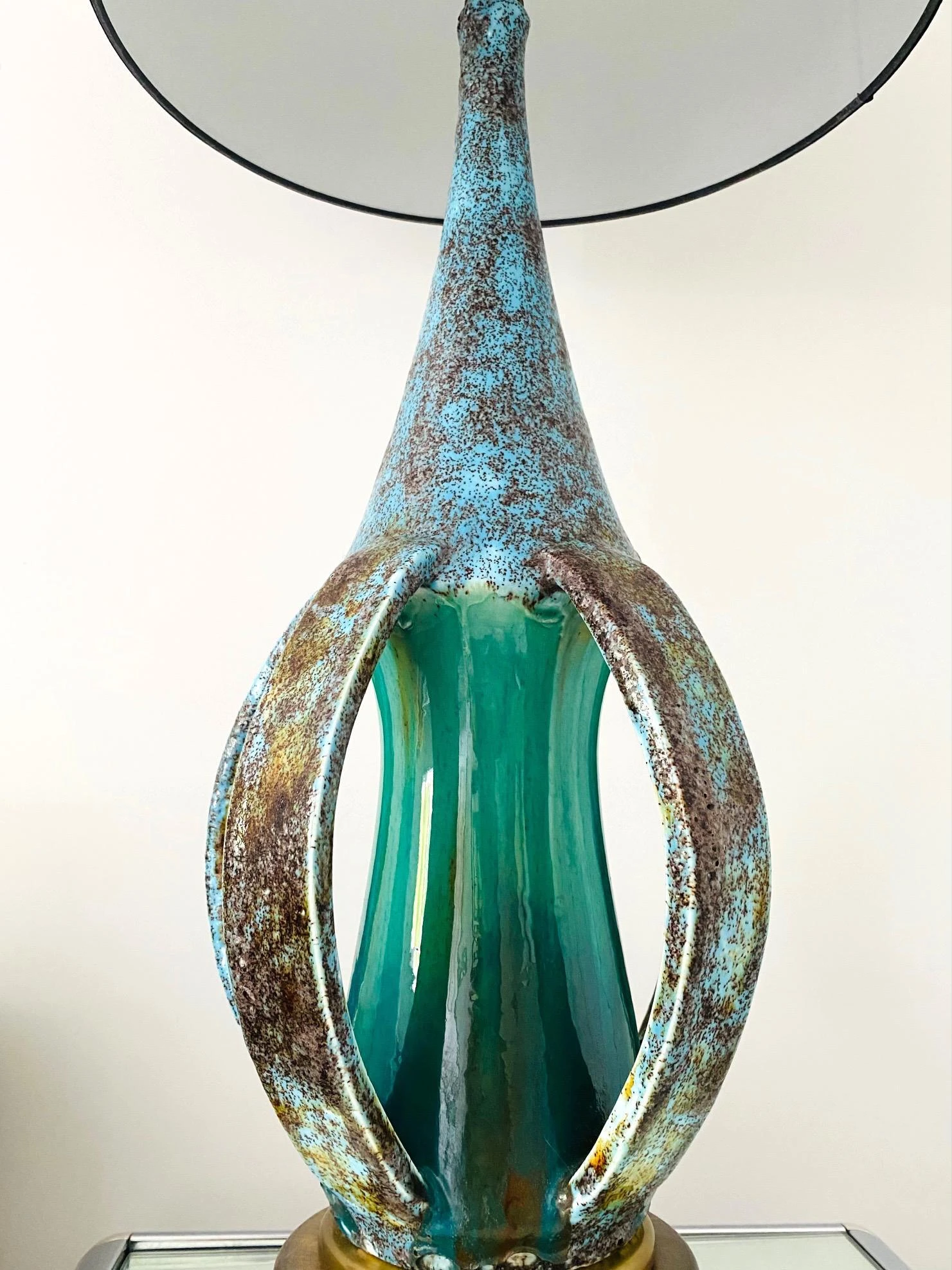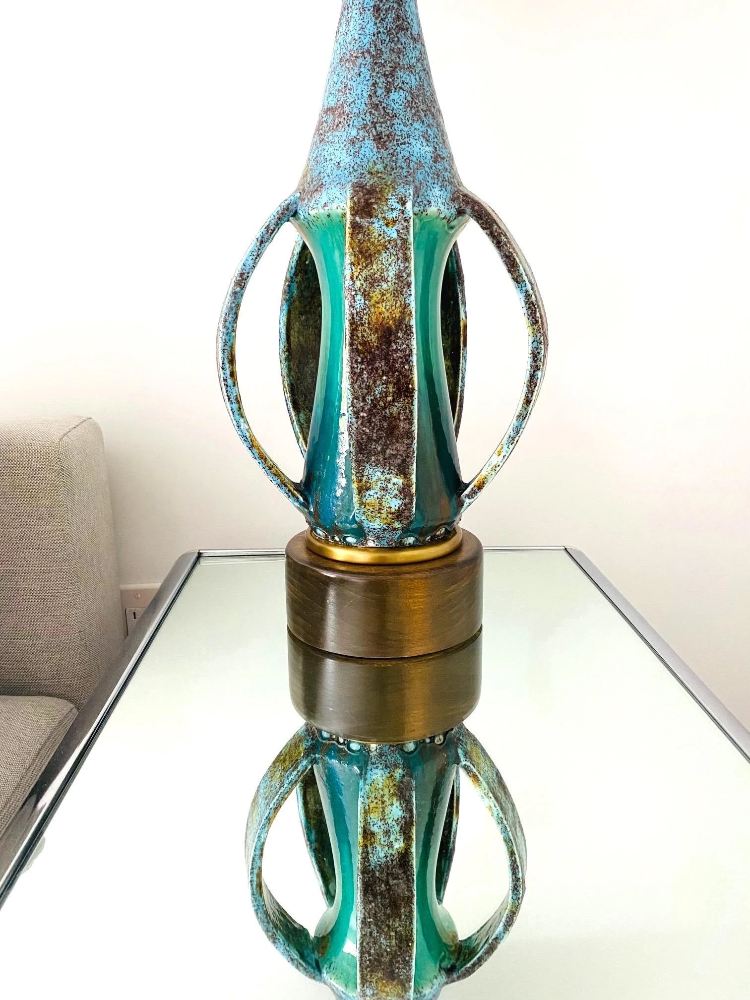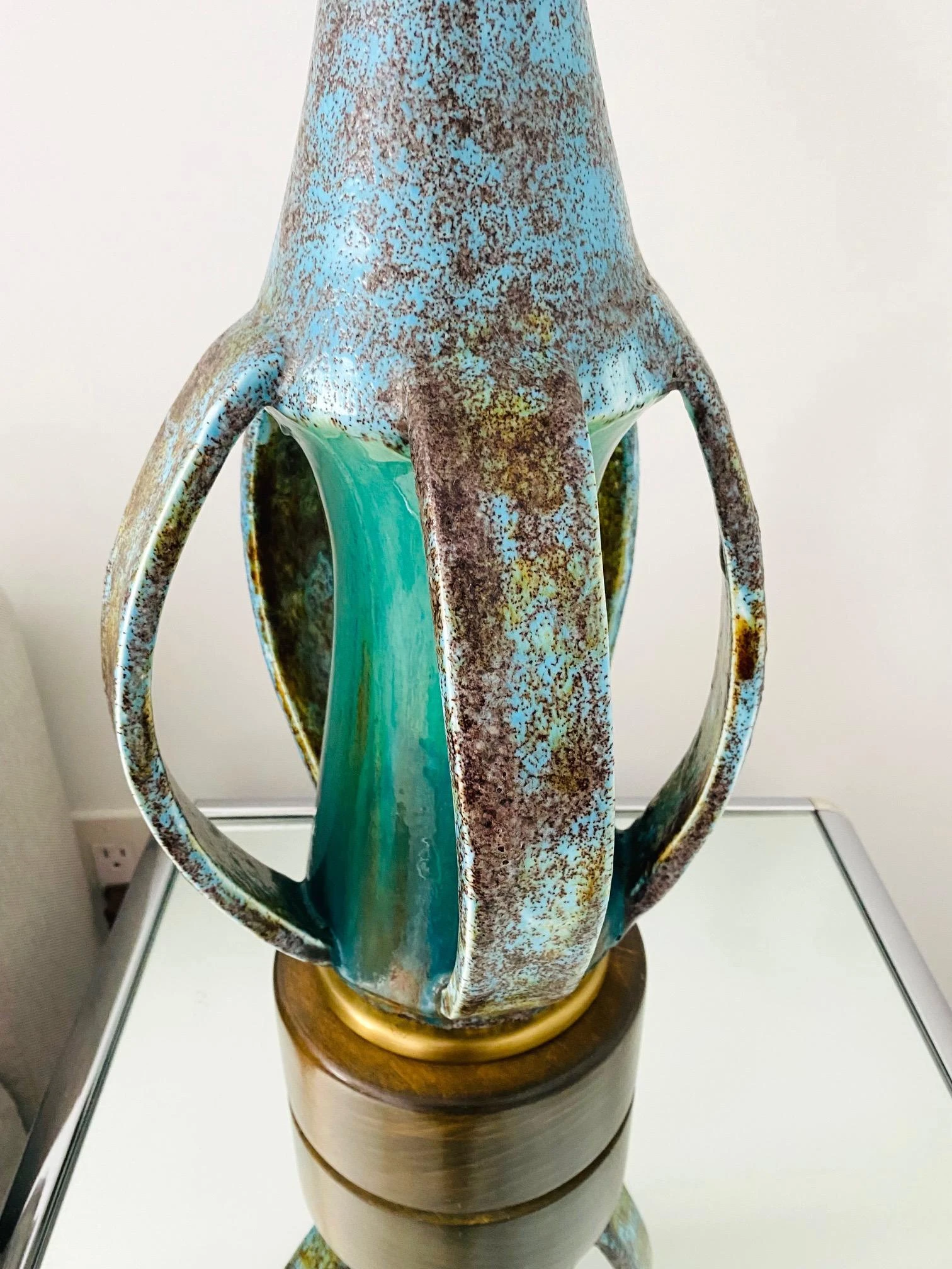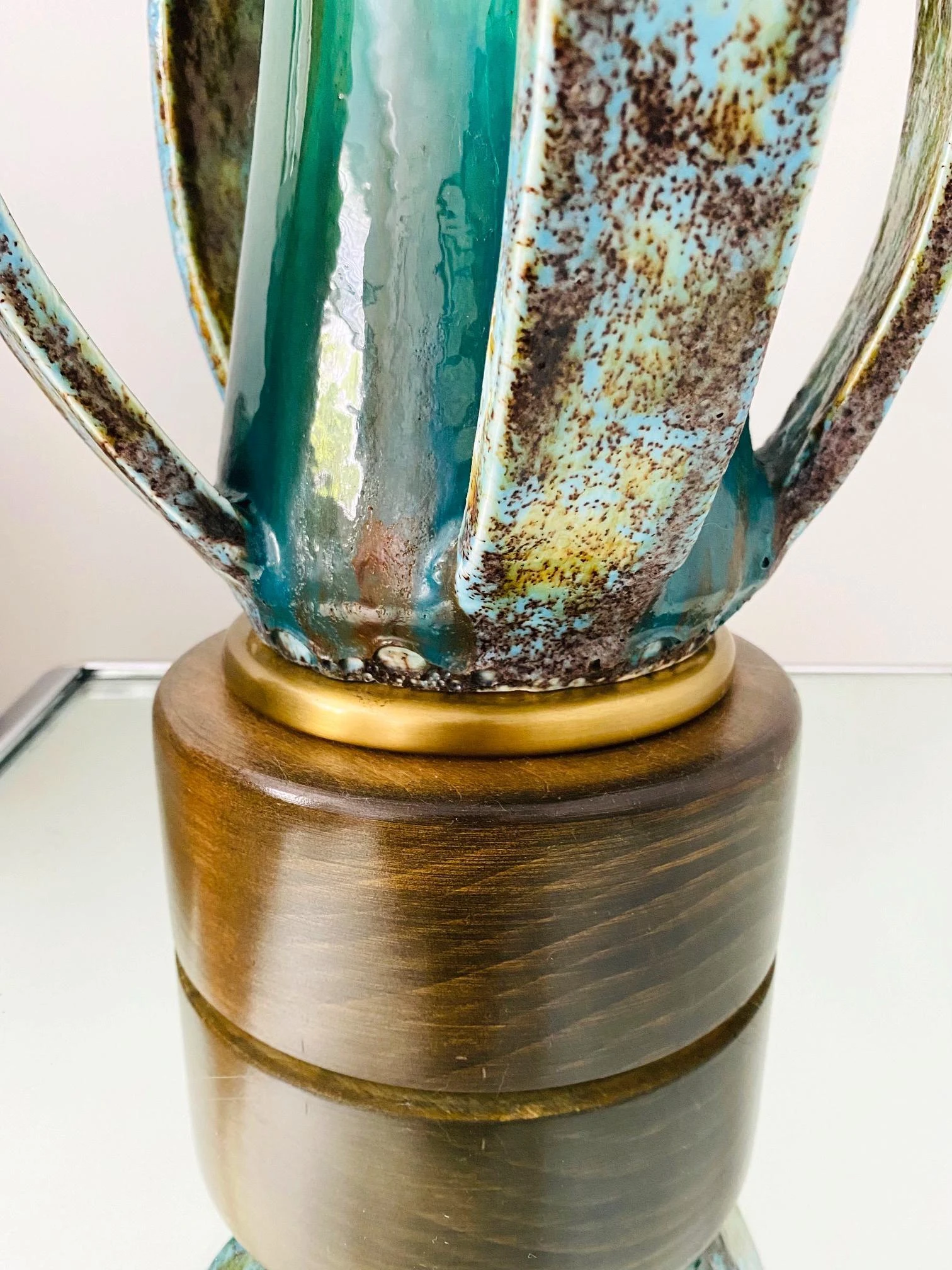 Danish Mid-Century Modern stoneware lamp with glazed finish in turquoise blue. Unique Studio Pottery lamp features an elongated vessel with open slats along the lower portion. Beautifully handmade in extraordinary matte glazed finish of robin’s-egg blue with spotted hues of moss. The center stem portion has a high gloss finish in vibrant turquoise. Finished with a teak wood base with a brass trim detail.