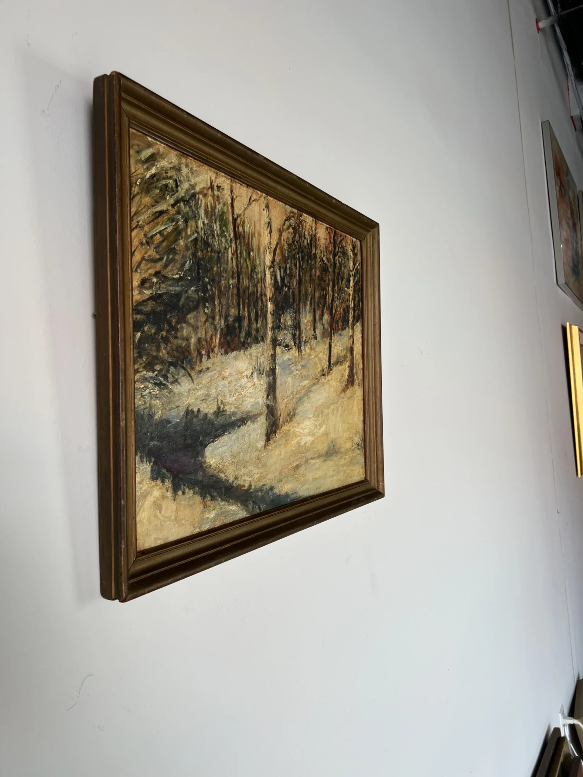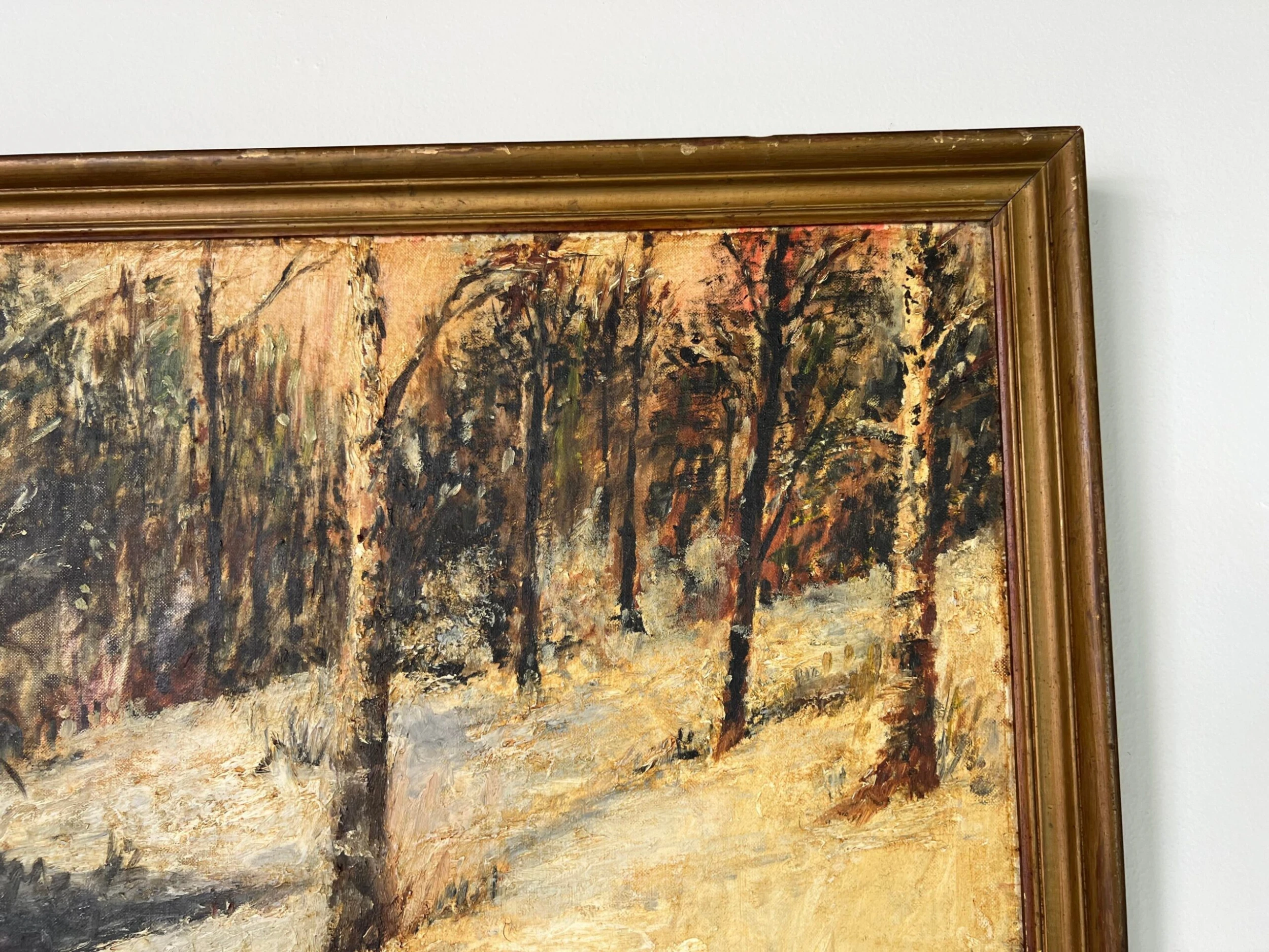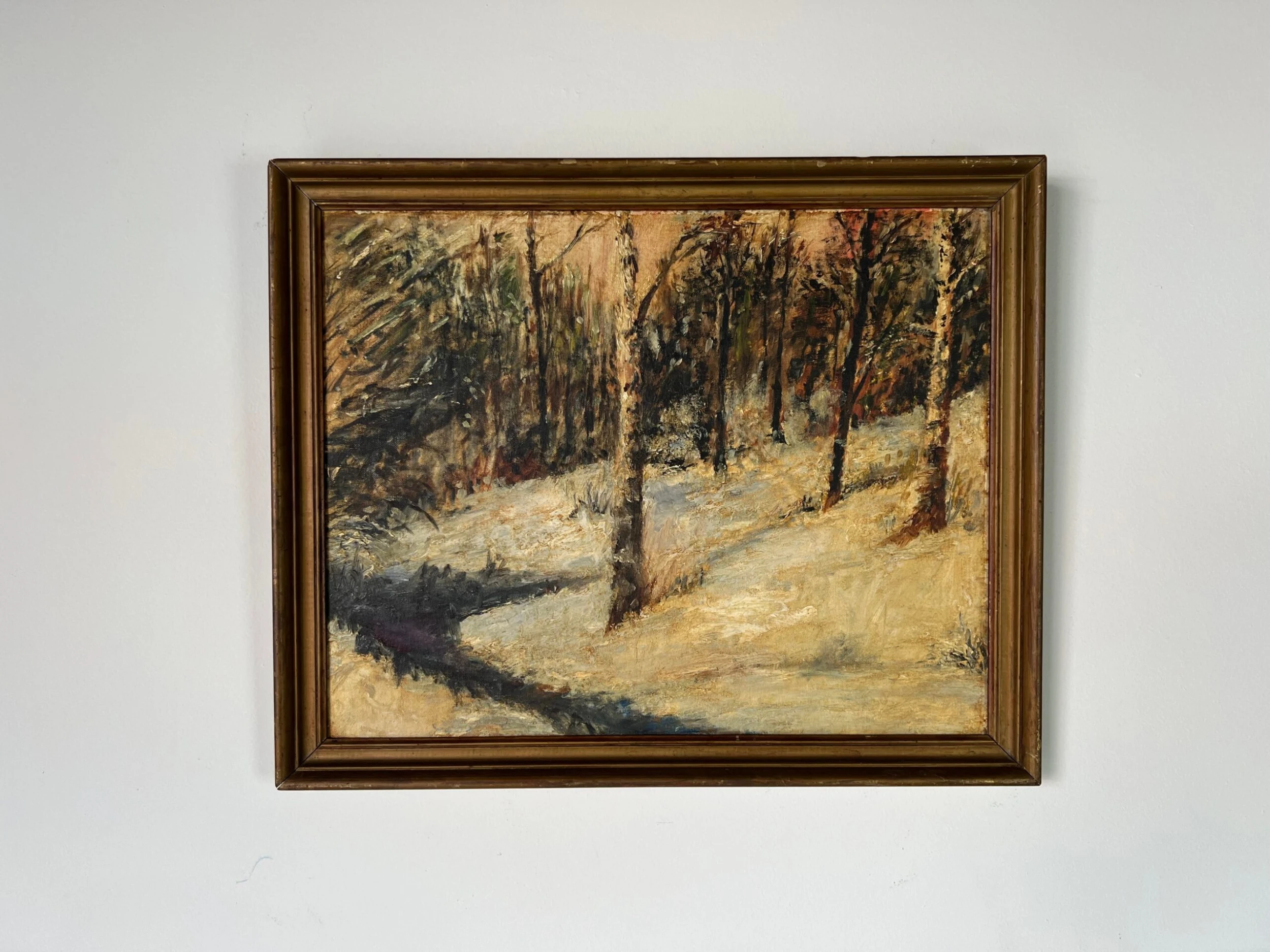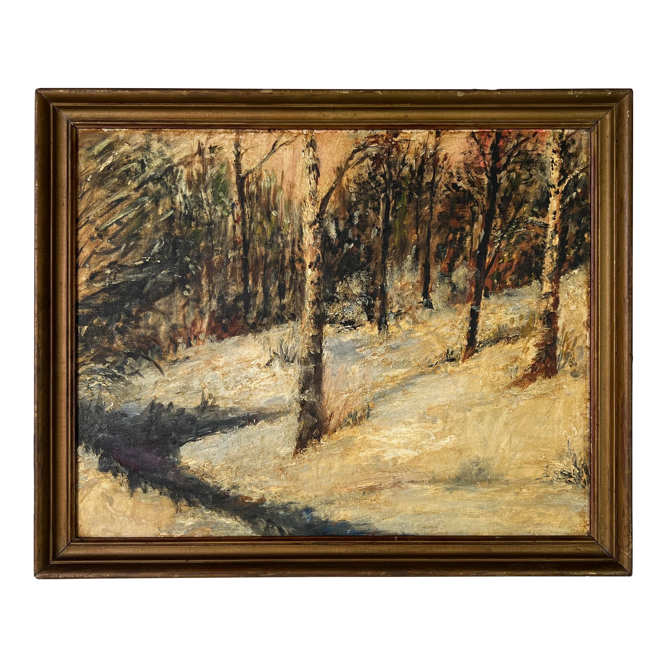 A beautiful vintage American Impressionist abstract oil painting of a winter landscape. Oil on artistic board. It has been mounted …
