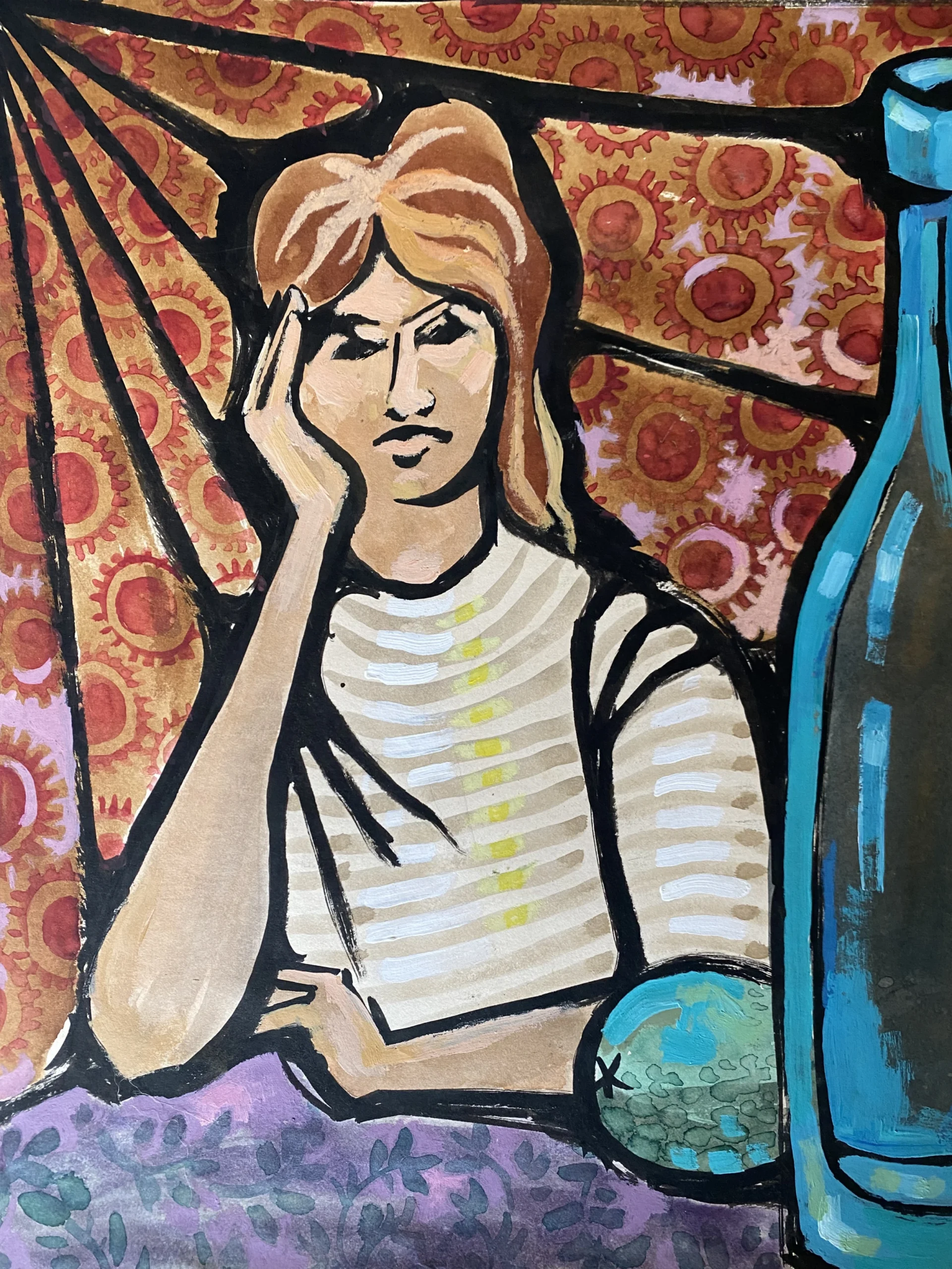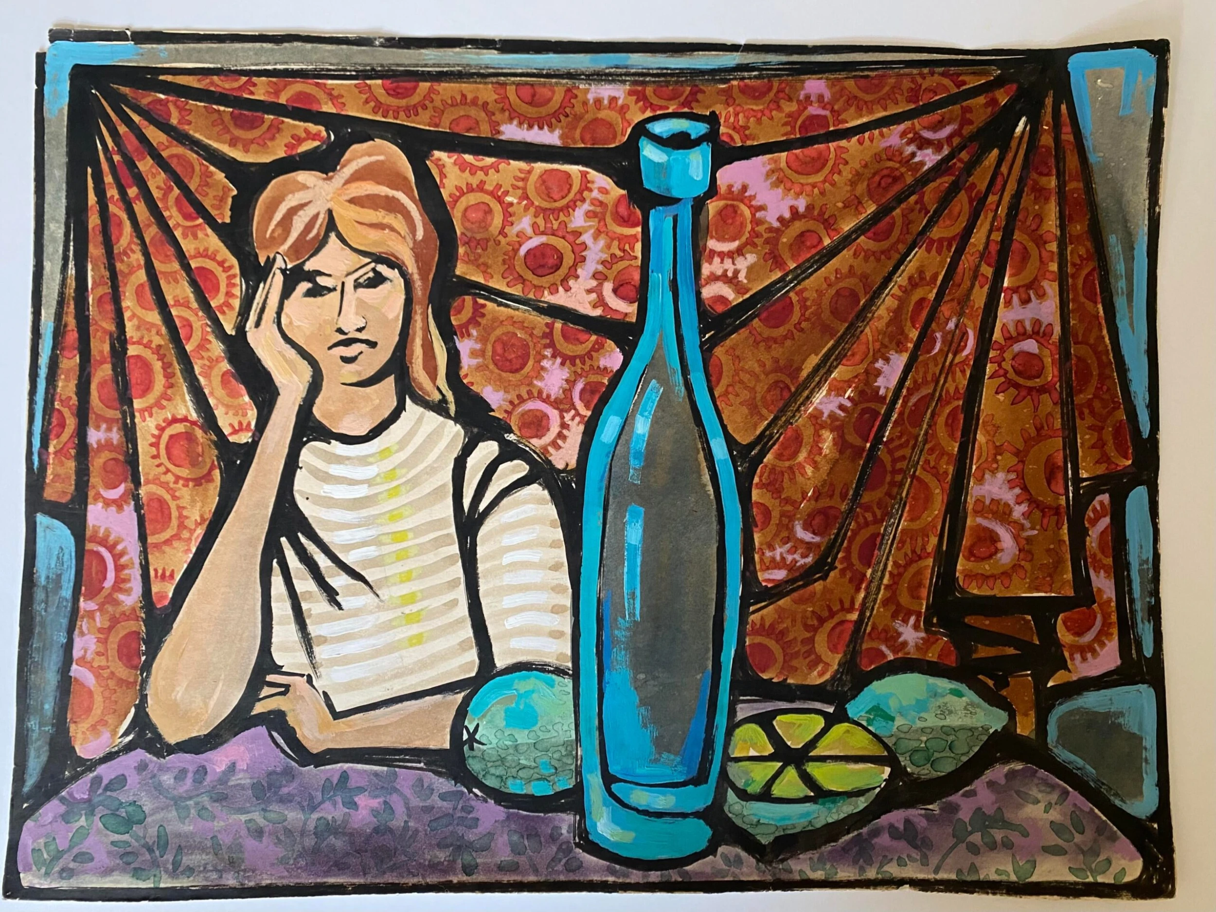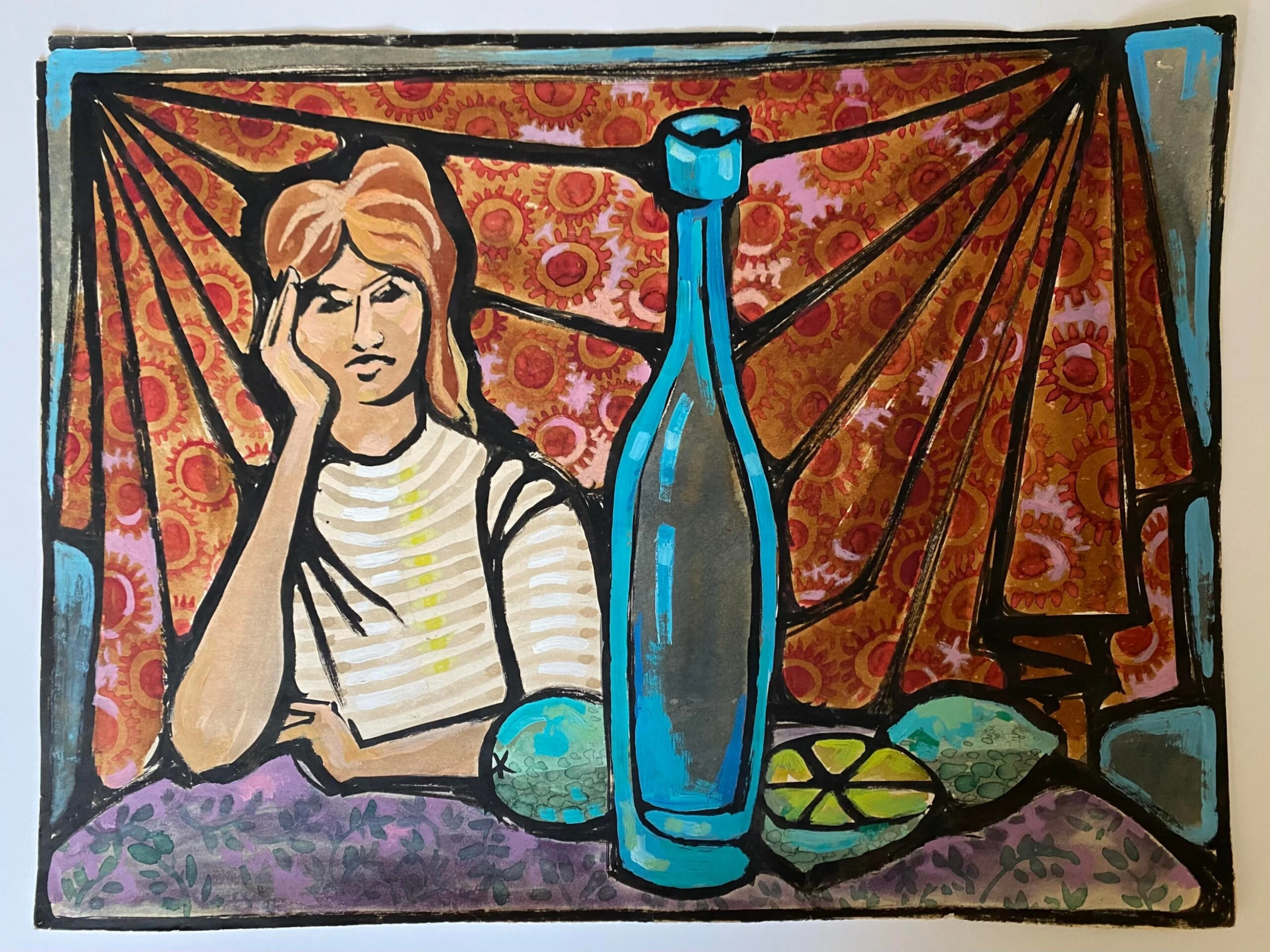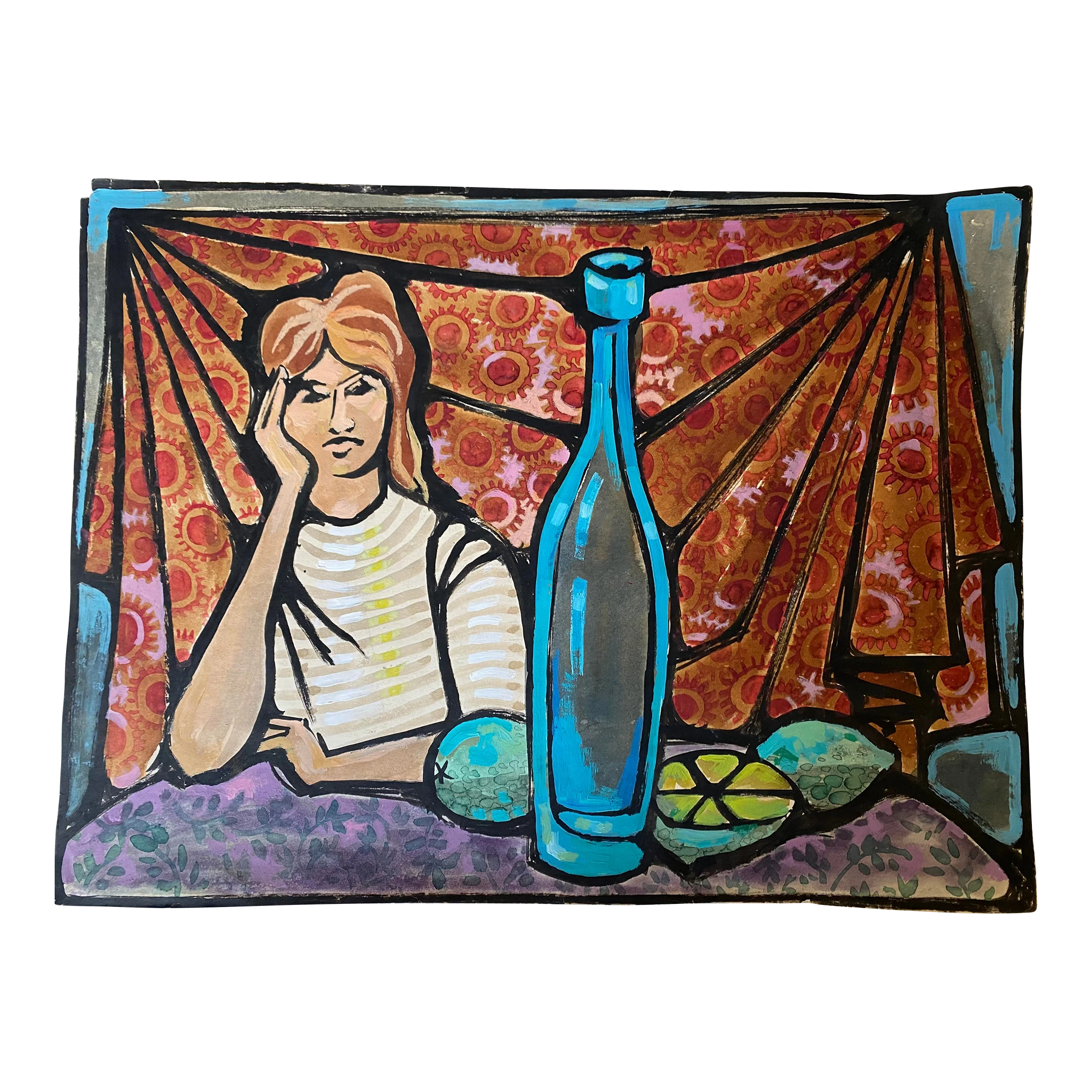 Offered is this watercolor painting by artist and teacher John P common. Highly stylized, this painting features a woman contemplating behind a bottle surrounded by lemons. The colors are remarkably bold and beautifully paired..