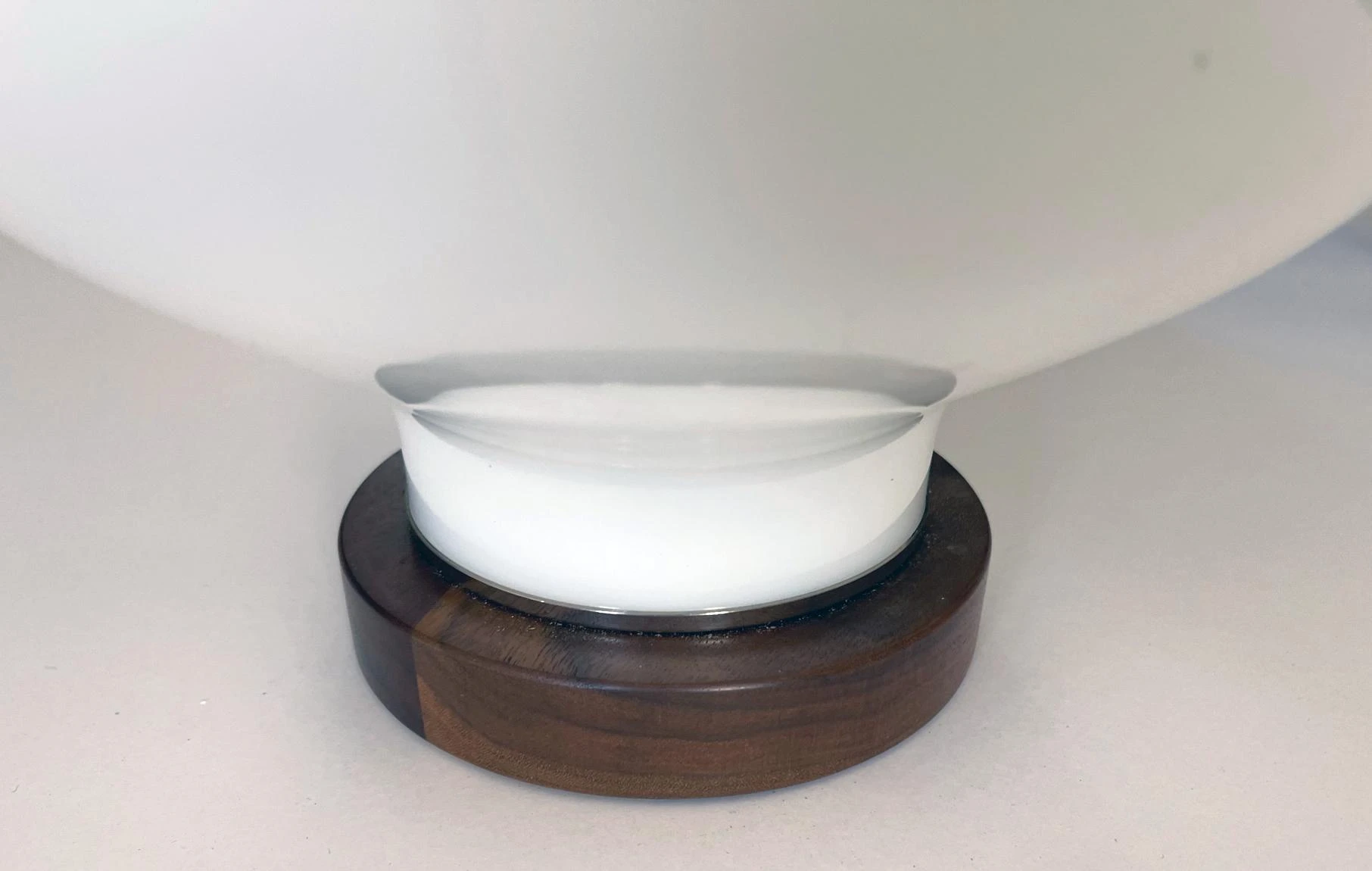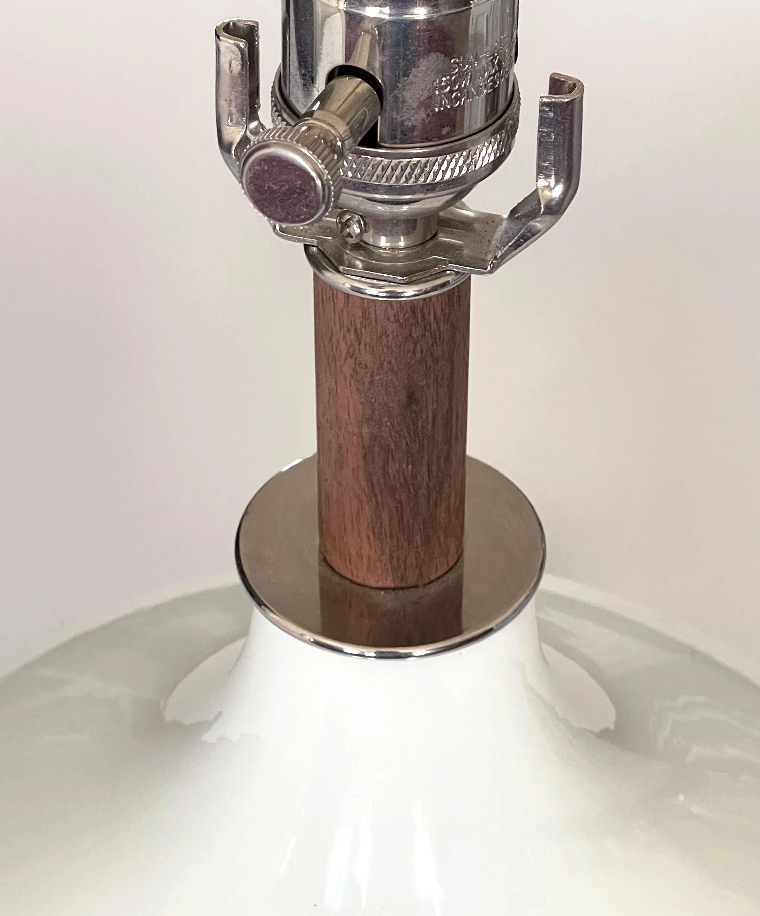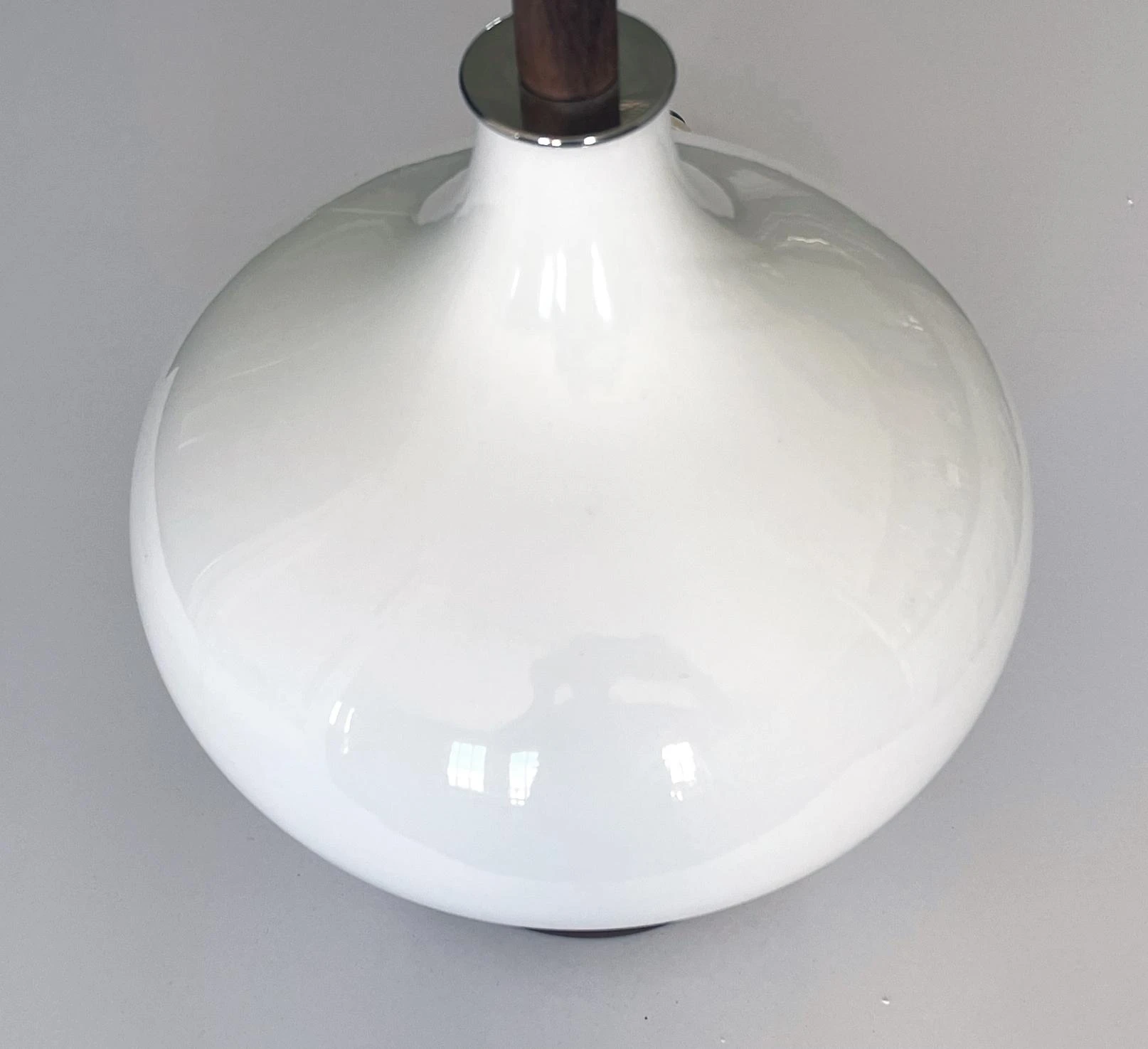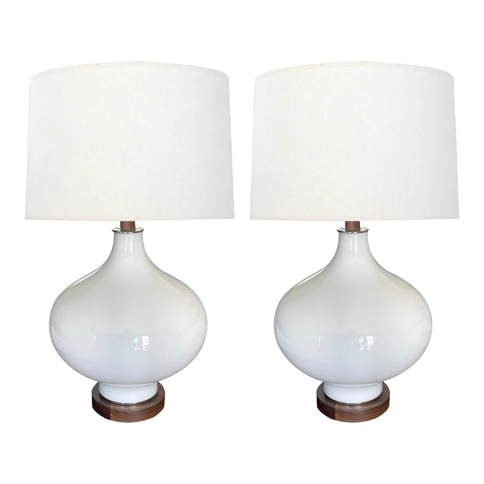 1960s lamps each bulbous lamp of white cased glass fitted with a walnut neck and base.