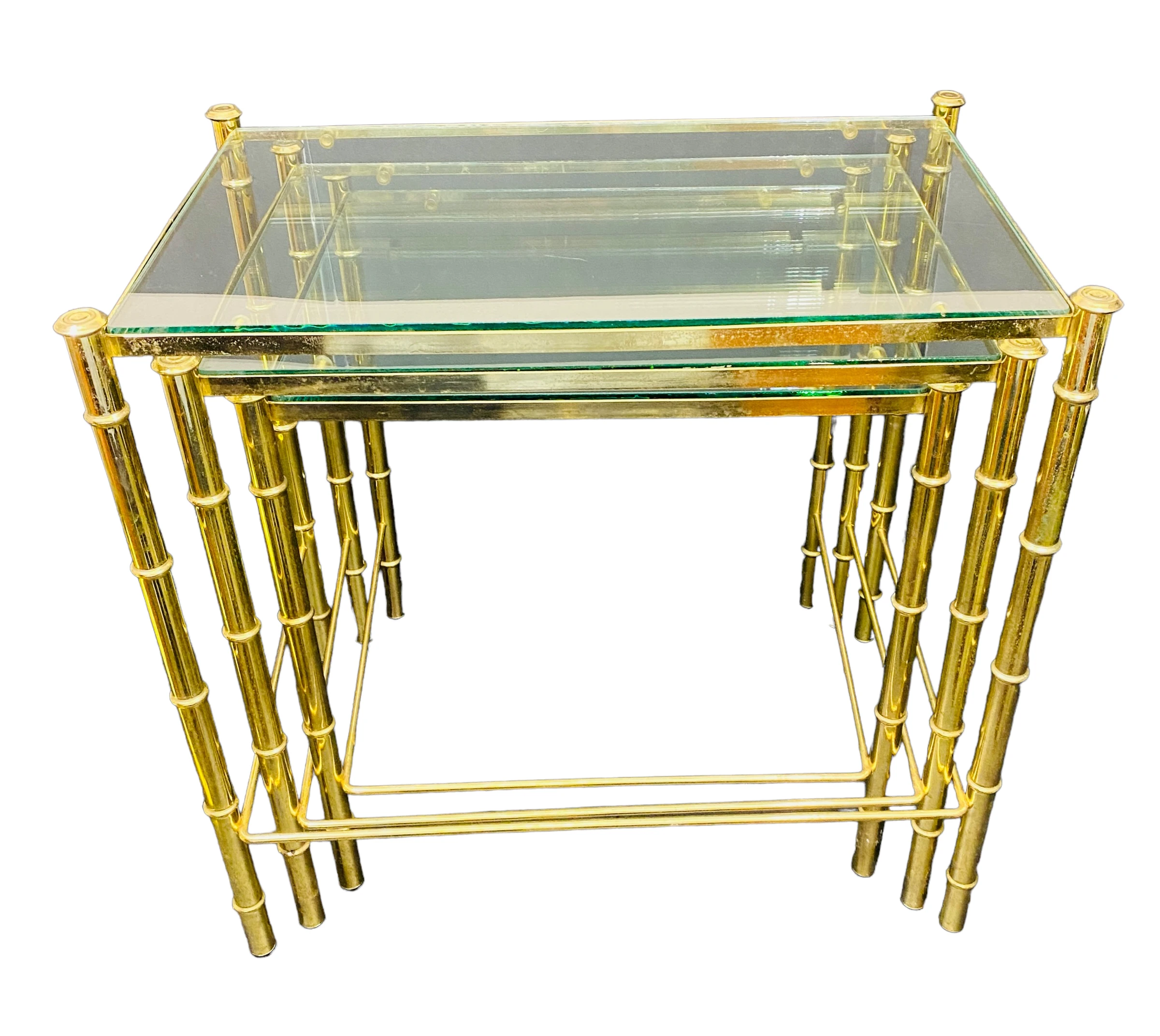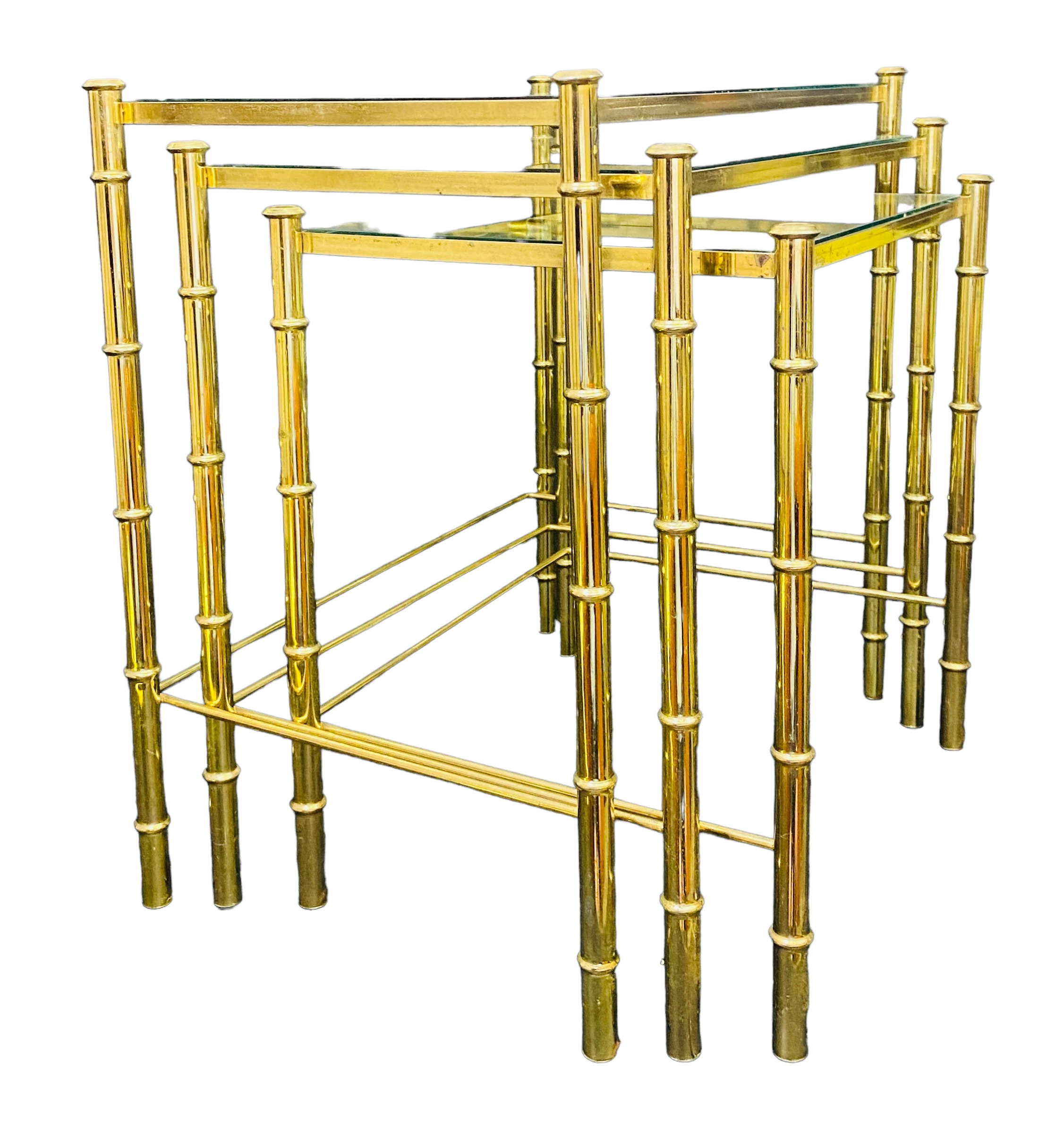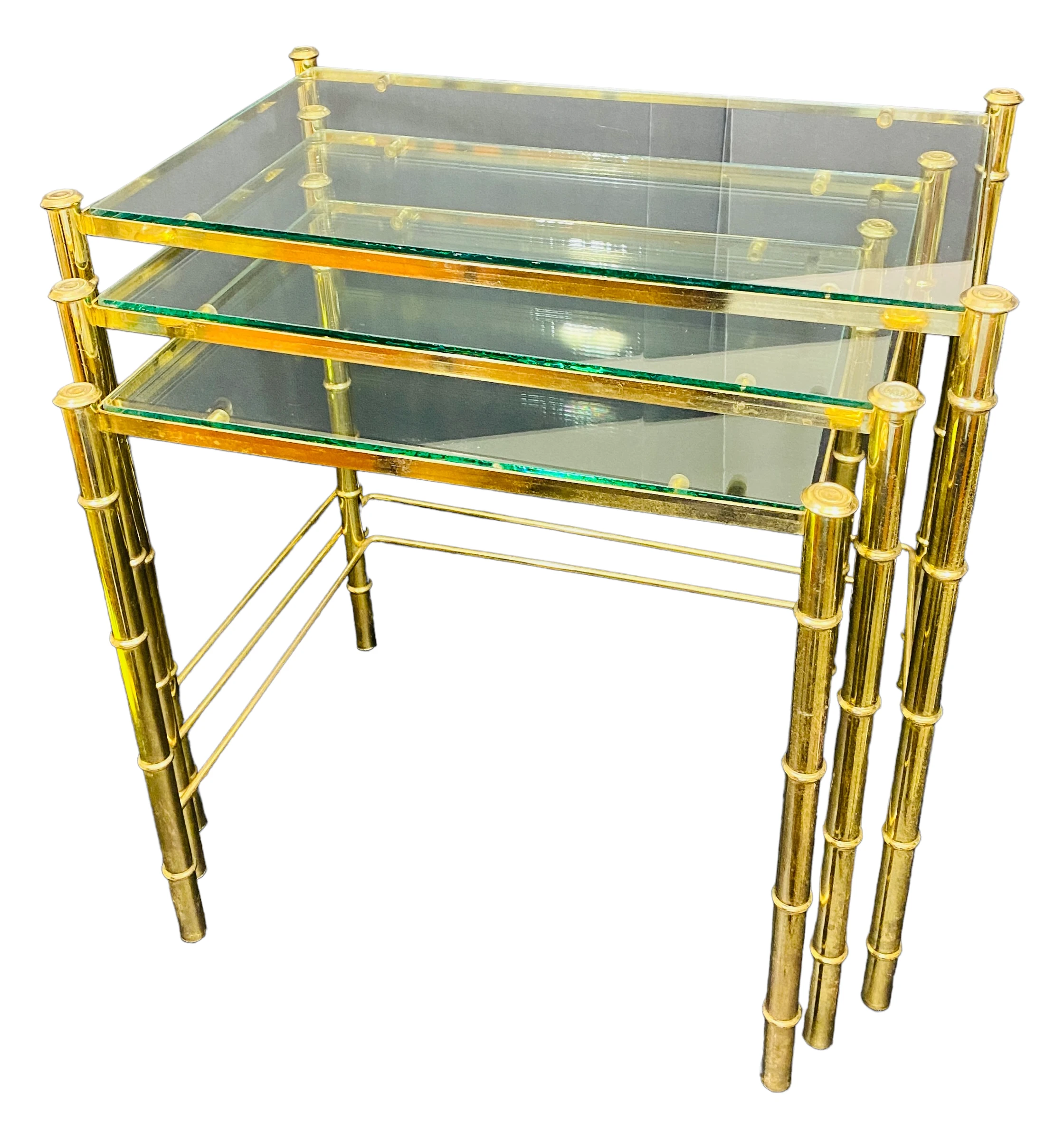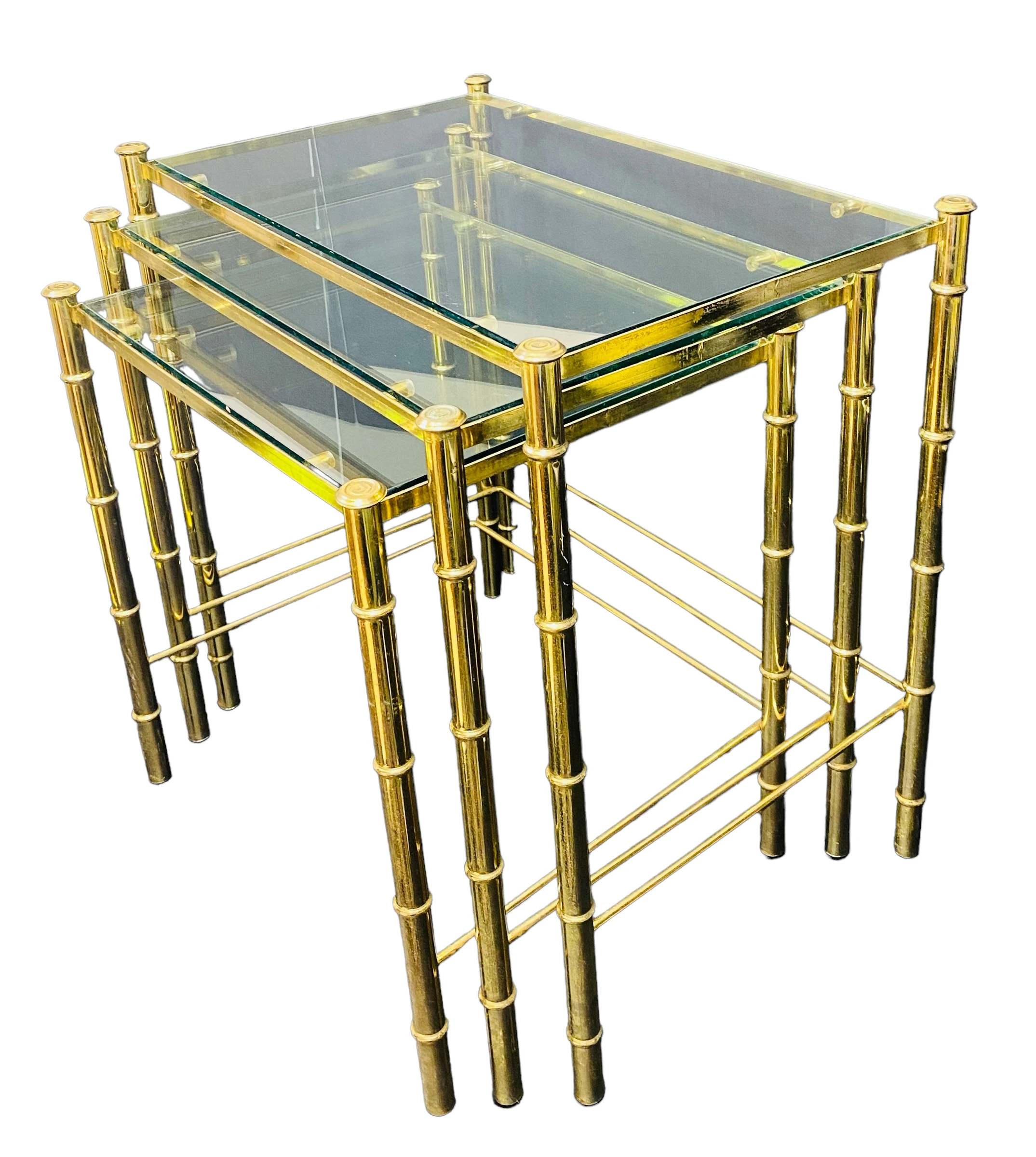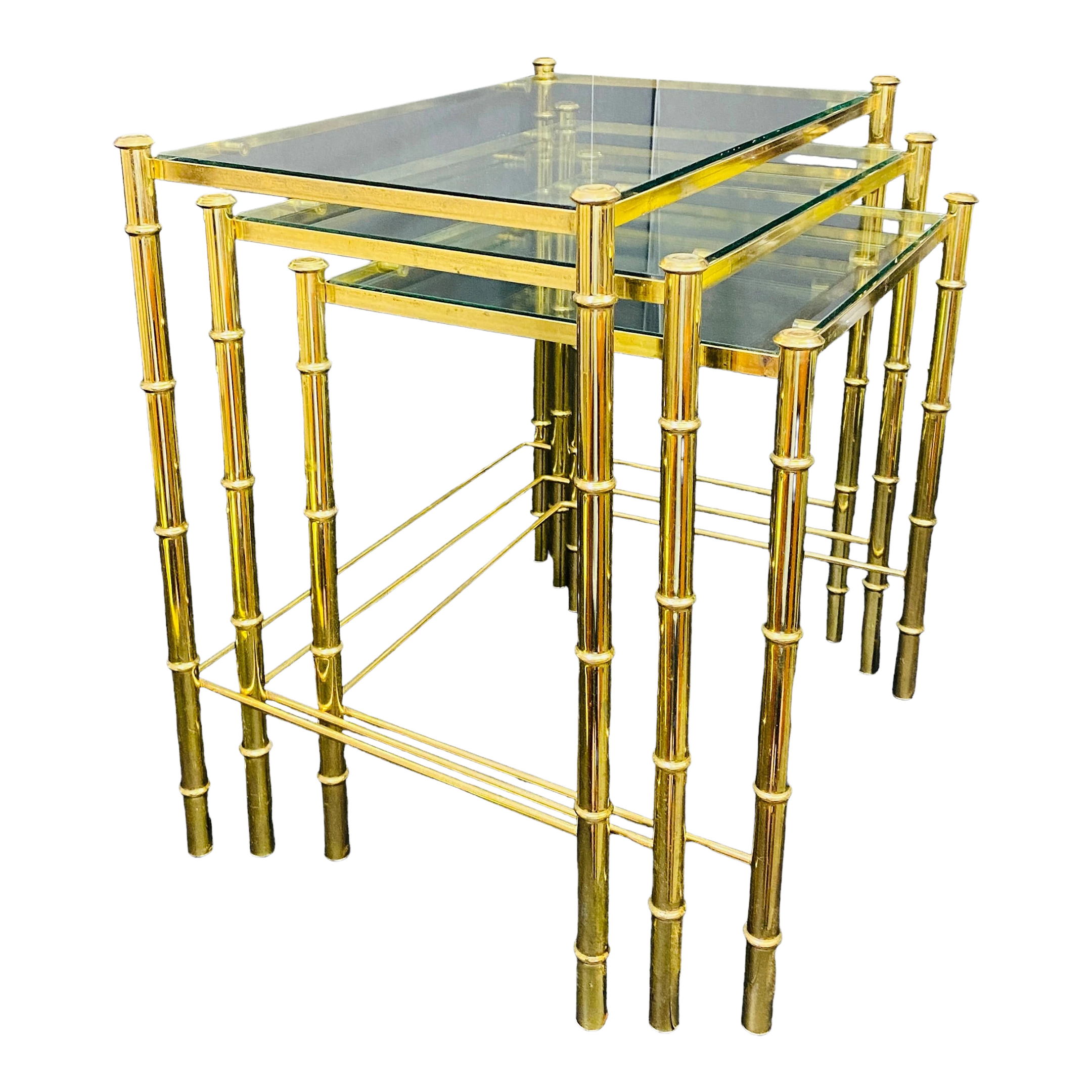 1970’s Brass Faux Bamboo Nesting Tables with Glass a Set of 3. Glass is NOT tinted – it is clear …