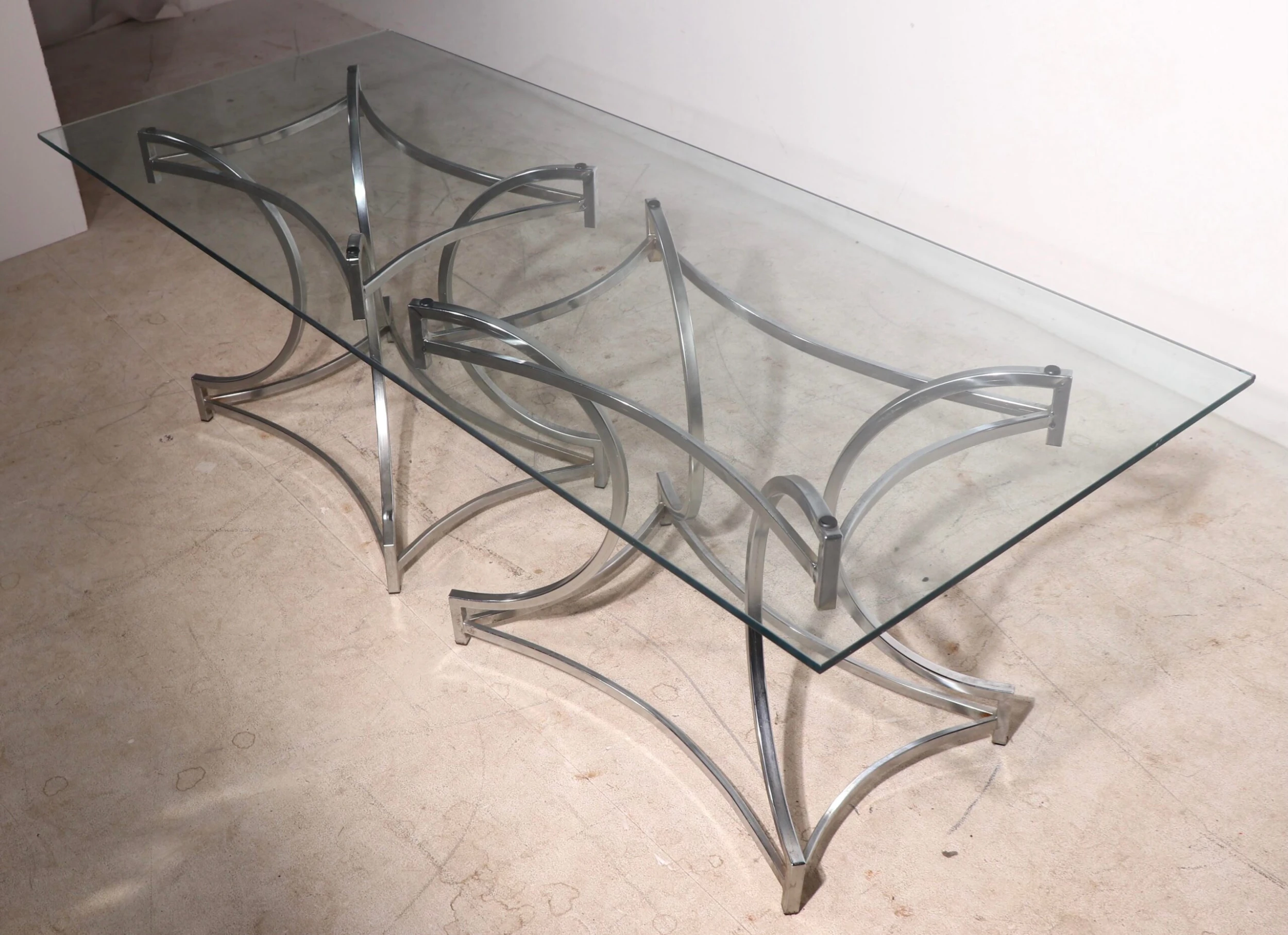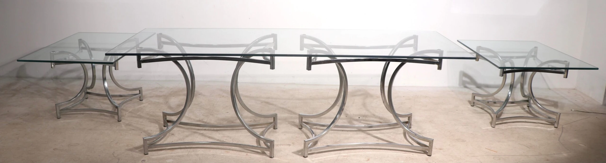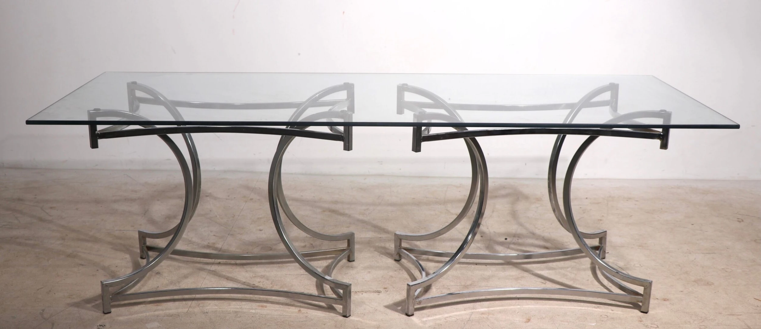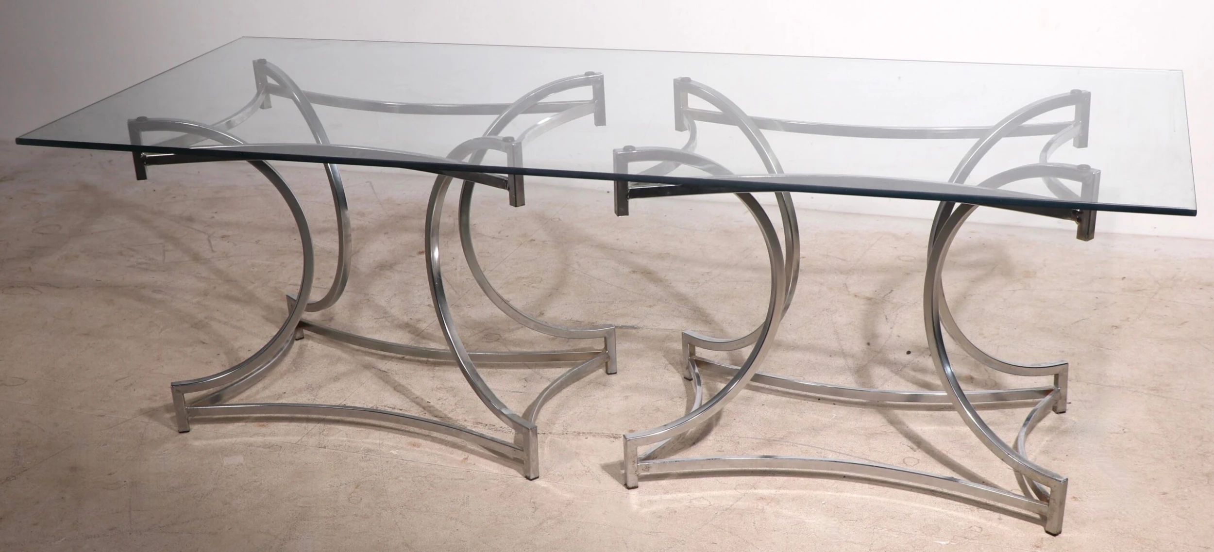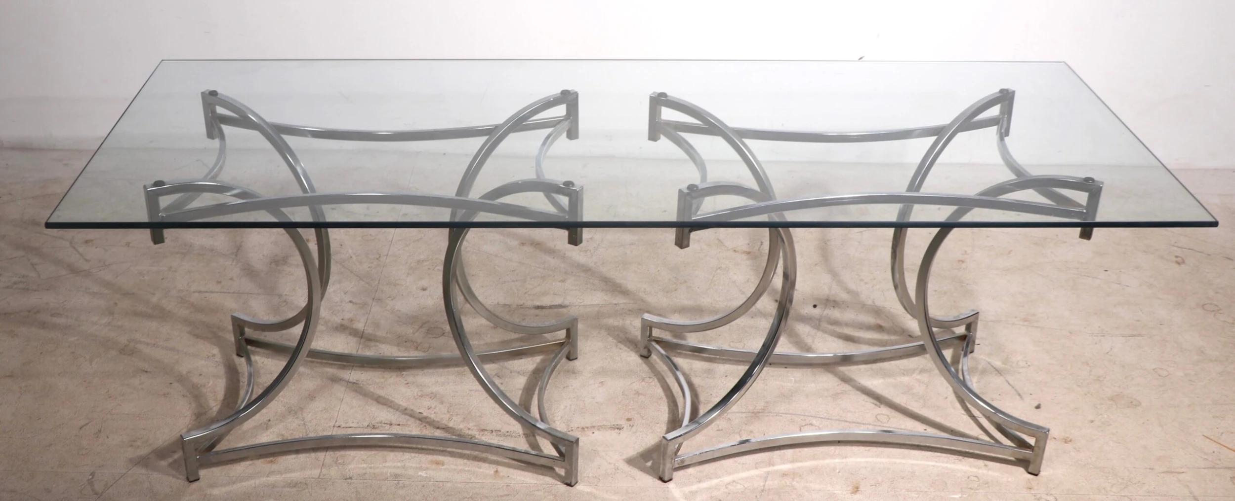 Stylish chrome based, glass top coffee table made in USA, circa 1970’s. The base consists of two architectural squared chrome …