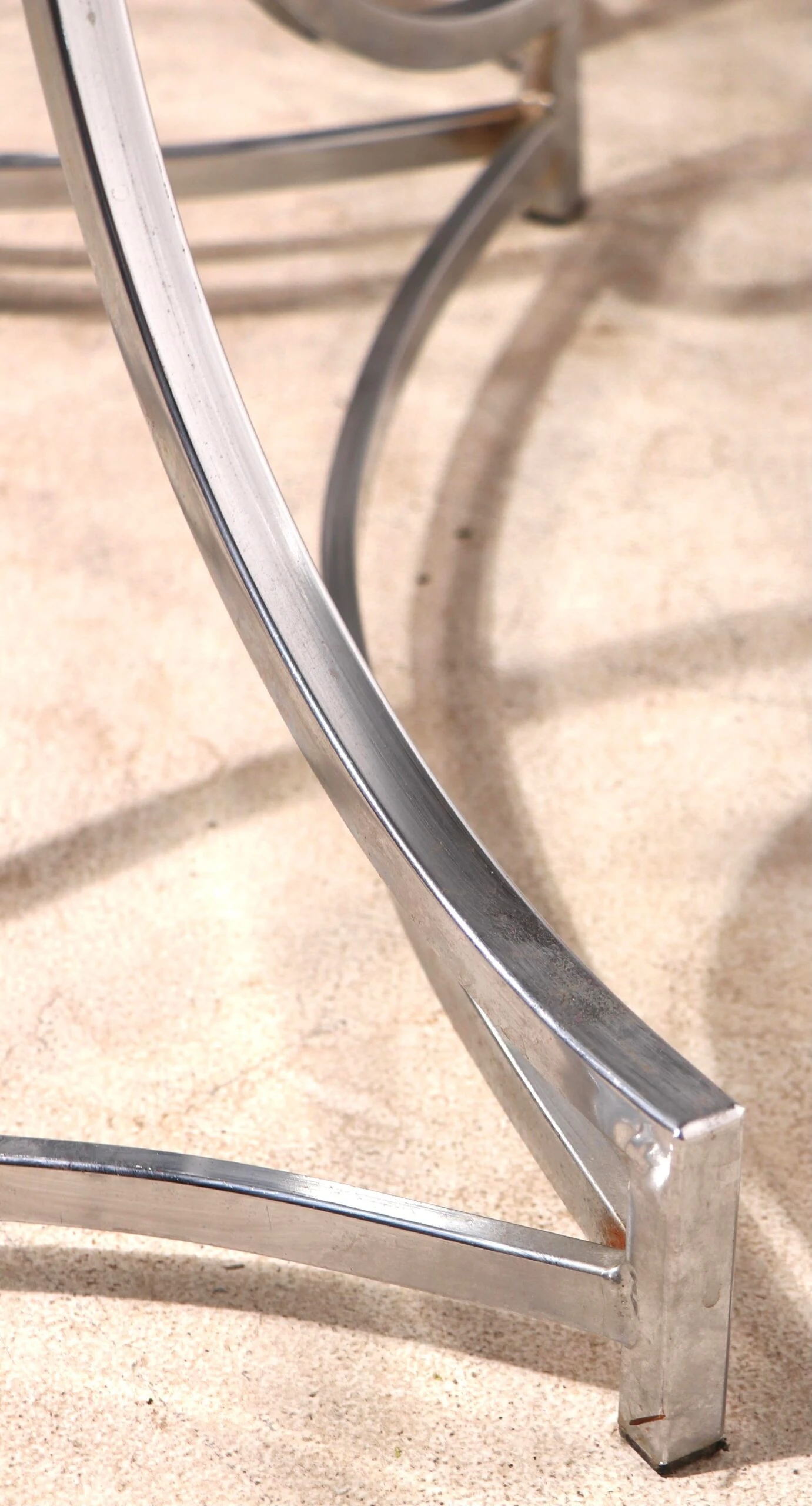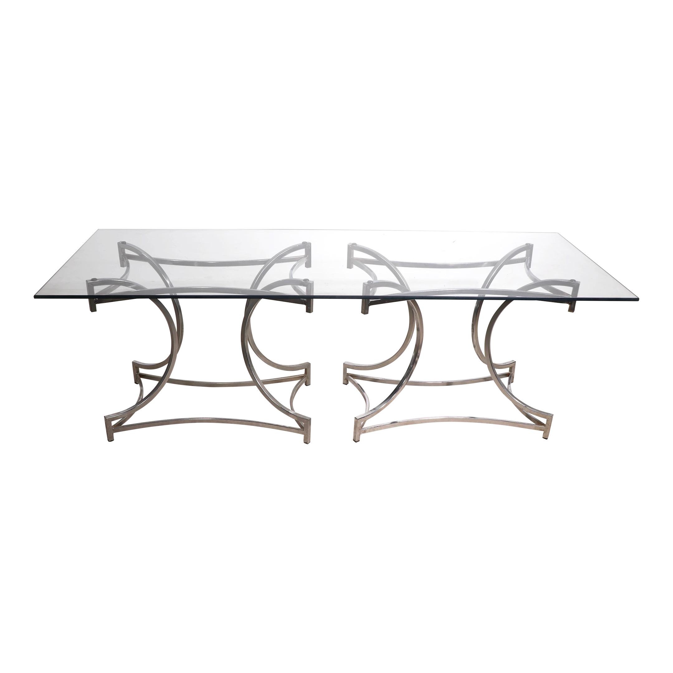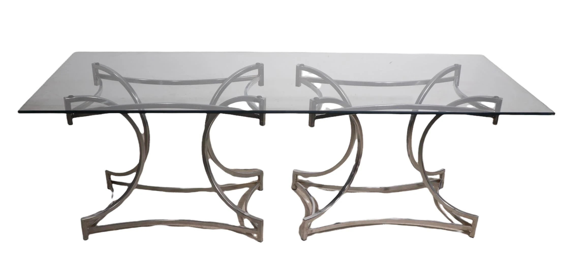 Stylish chrome based, glass top coffee table made in USA, circa 1970’s. The base consists of two architectural squared chrome supports, the rectangular glass top ( 60″ x 24″ ) shaiws a slight flaw at one corner, please see images. Design reminiscent of Milo Baughman, however the tables are unsigned. Please view the matching end tables we have listed separately, from this chic suite of 70’s furniture at Barbarella Home on Chairish. This listing is for the coffee table only.