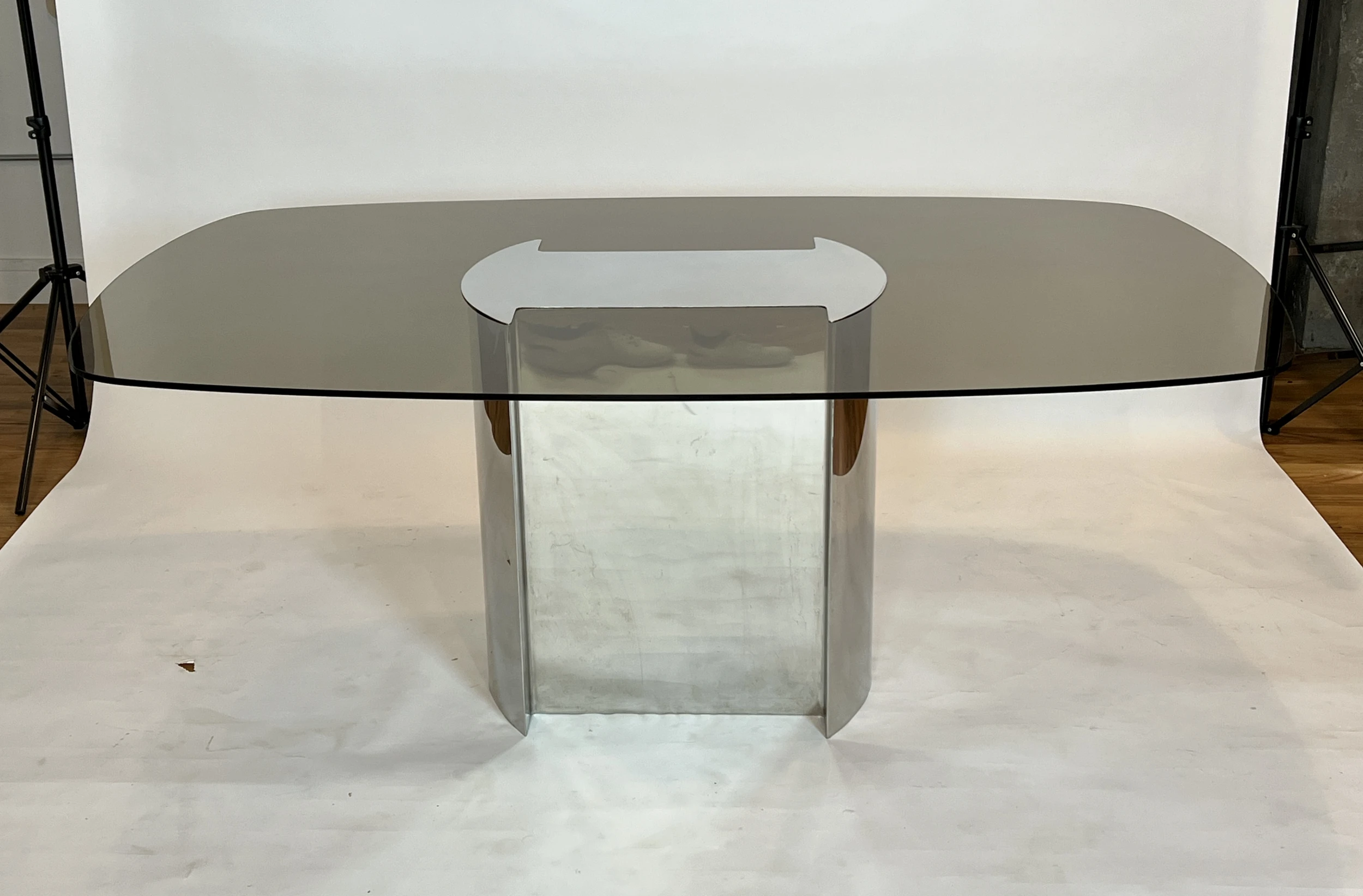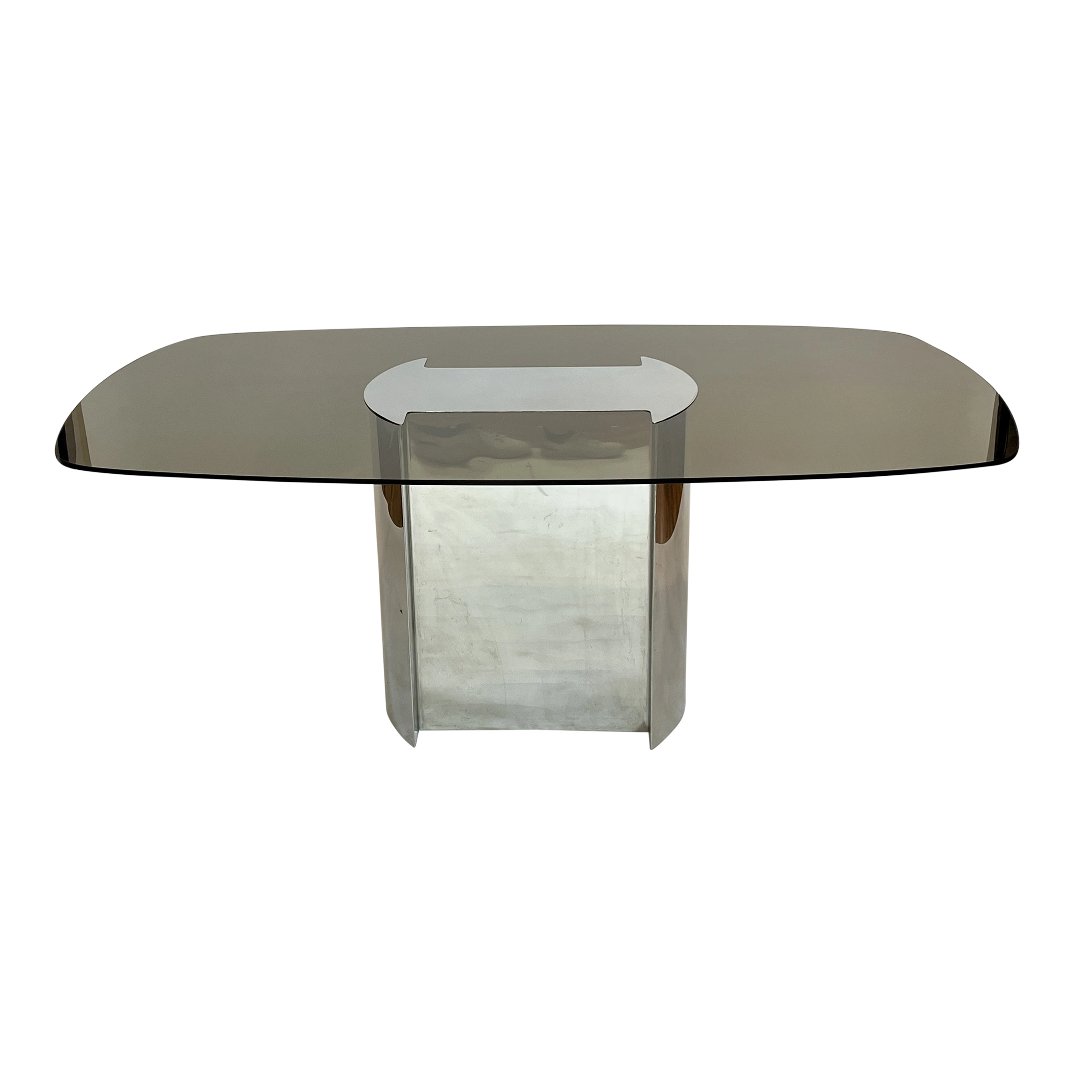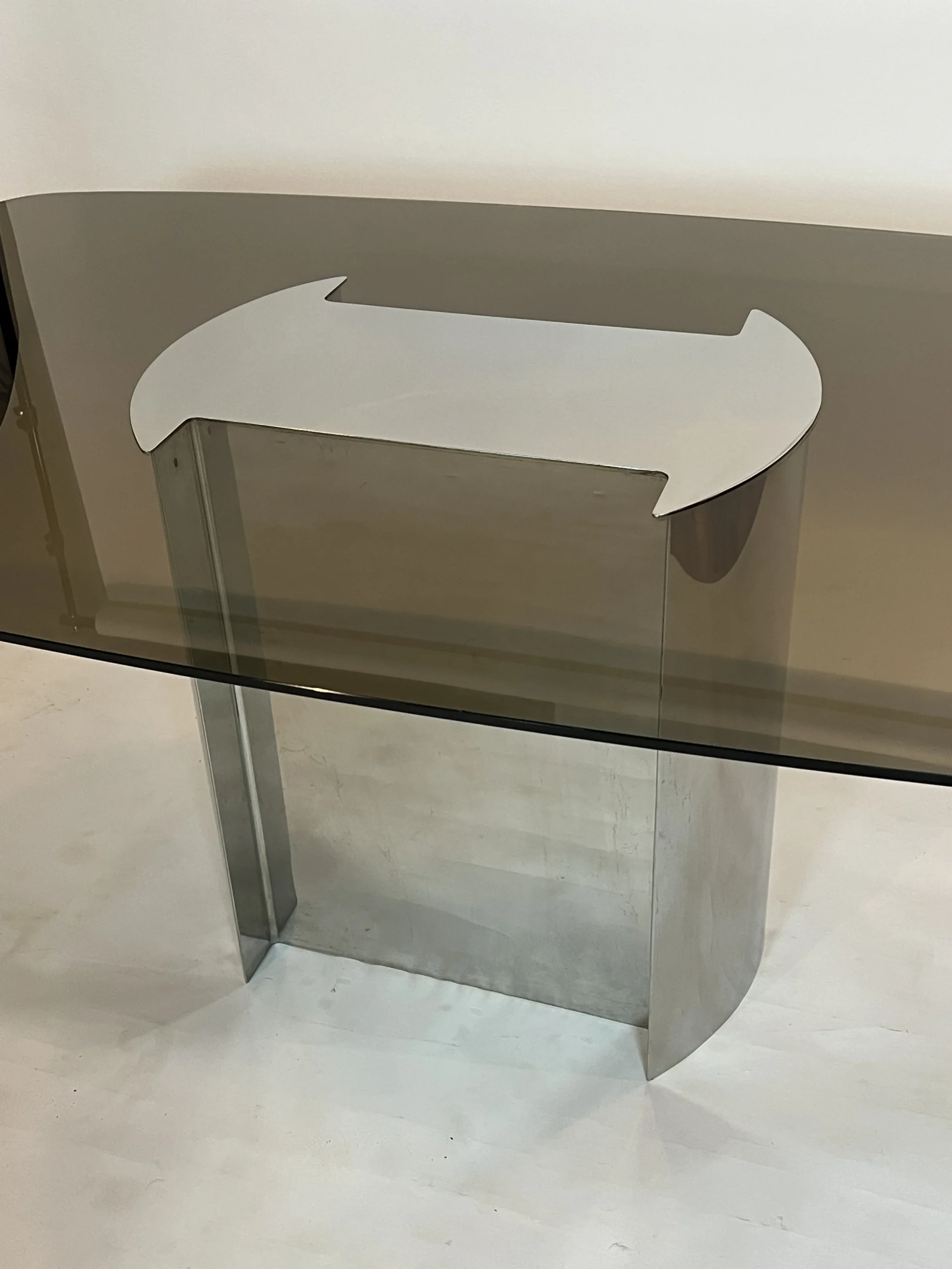 1970’s dining table made of polished chrome base and runner top with smoked glass. The chrome top caps the glass affixing it to the base. This table was paired with the set of Willy Rizzo dining chairs pictured in the listing but we do not have a definitive attribution as to the designer/maker. Smoked glass and base show very minimal wear for its age.