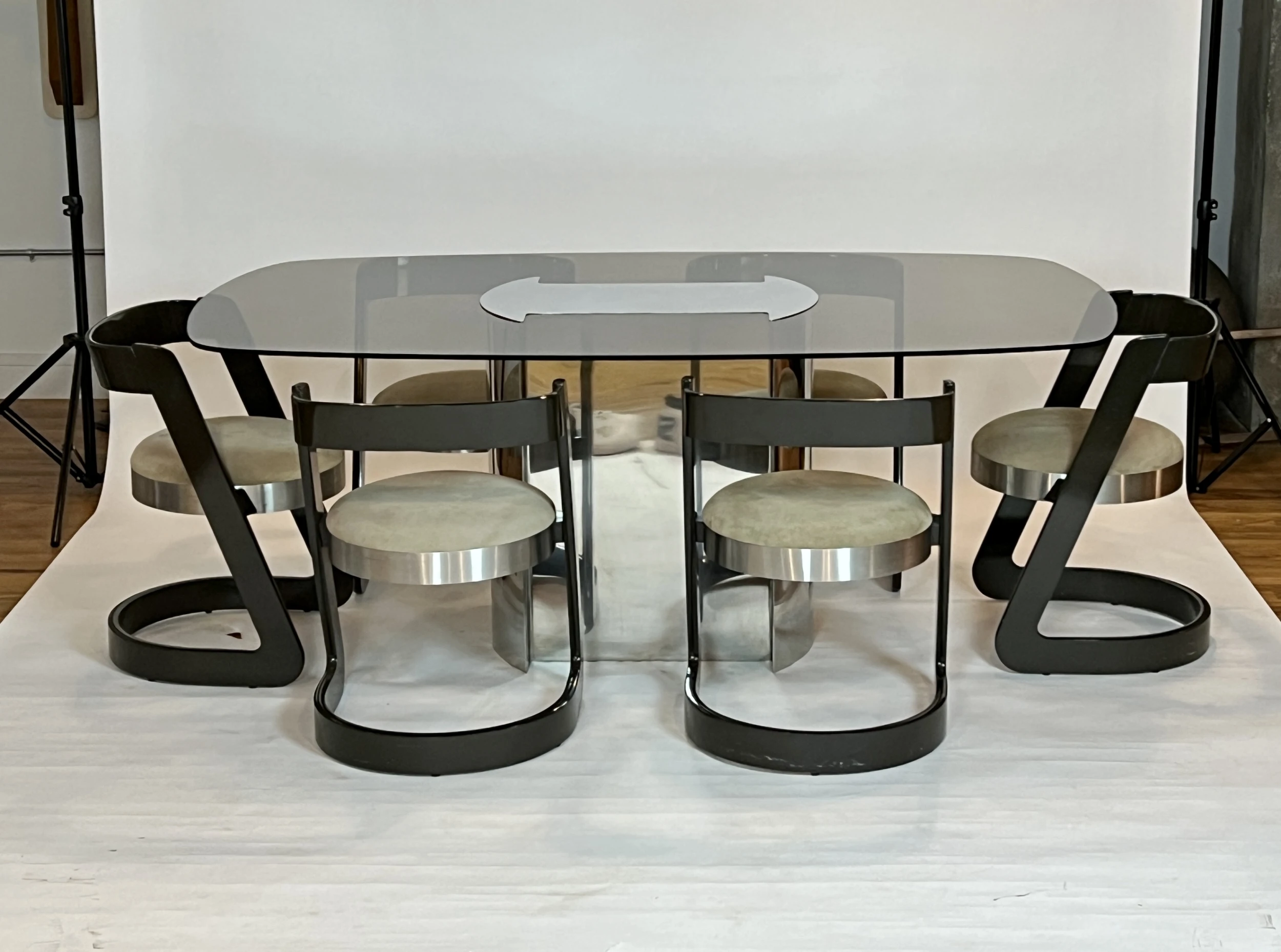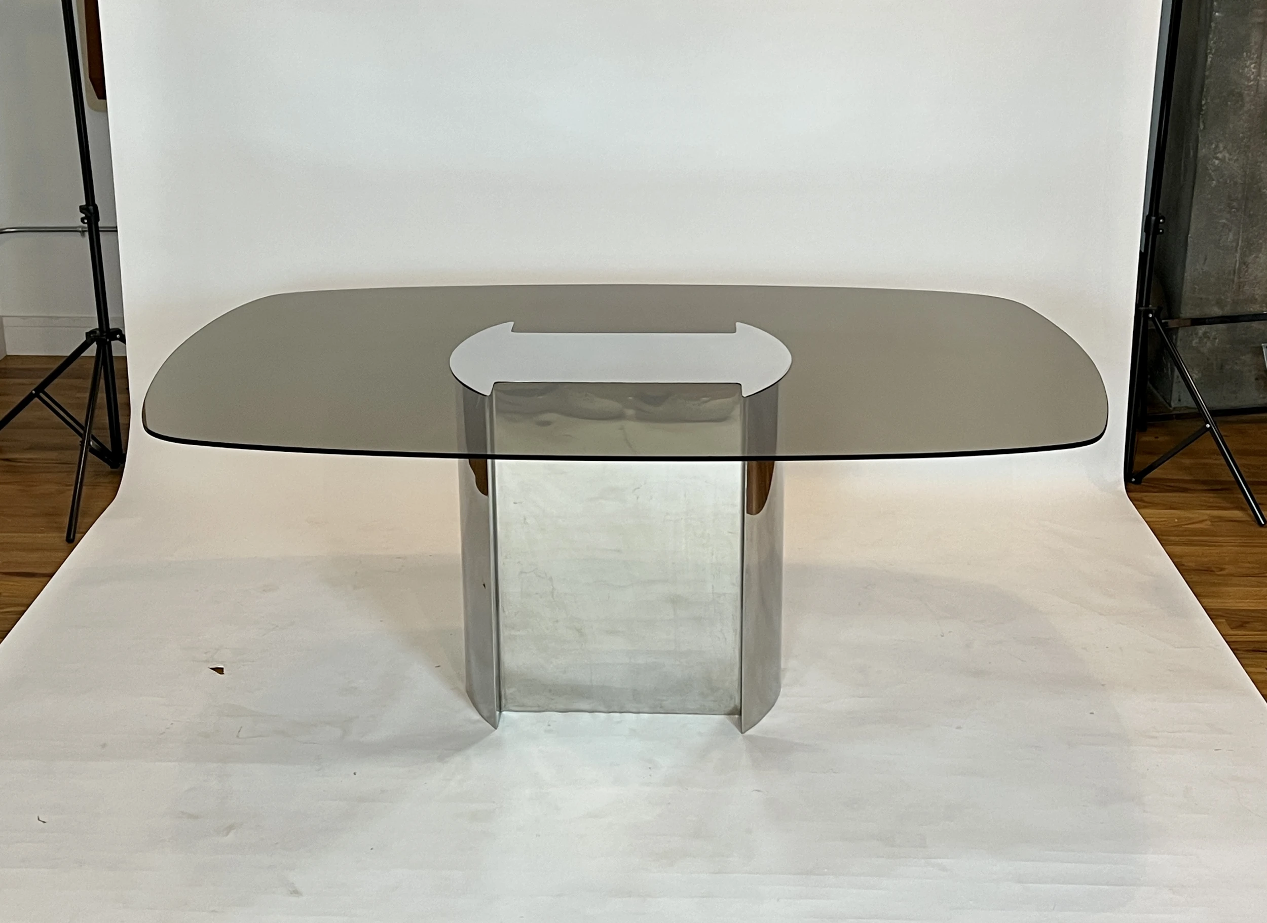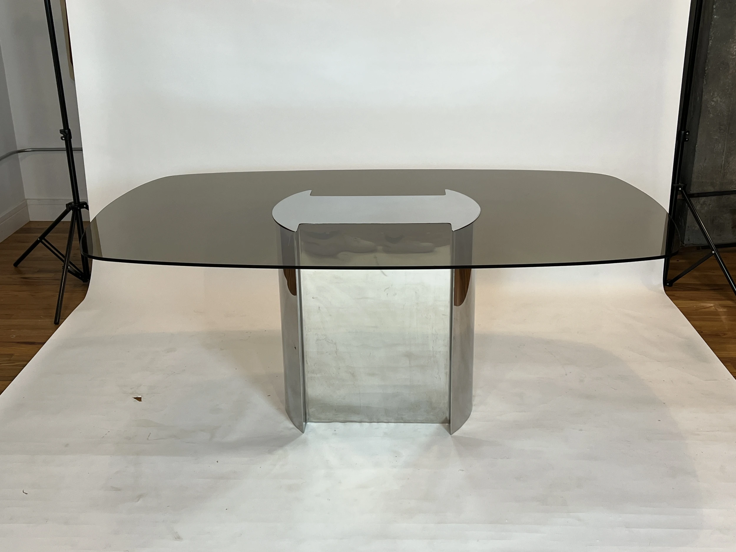 1970’s dining table made of polished chrome base and runner top with smoked glass. The chrome top caps the glass affixing it to the base. This table was paired with the set of Willy Rizzo dining chairs pictured in the listing but we do not have a definitive attribution as to the designer/maker. Smoked glass and base show very minimal wear for its age.