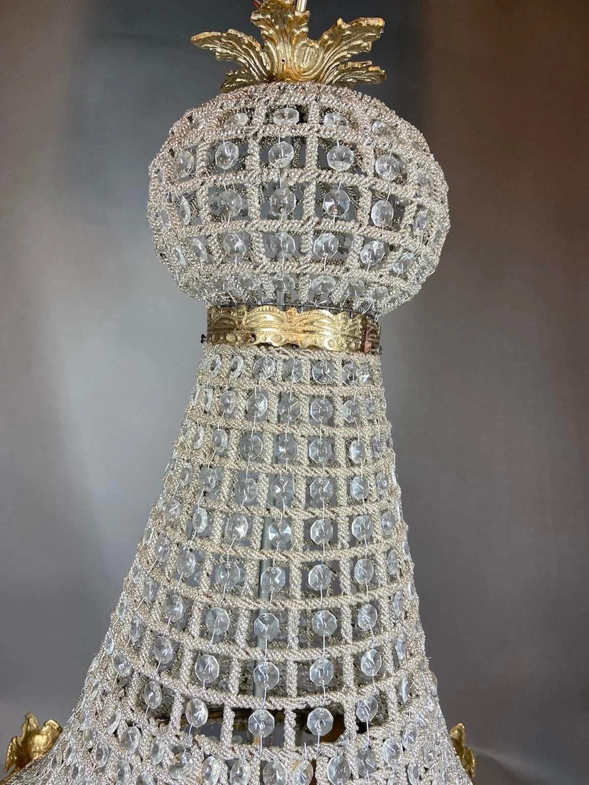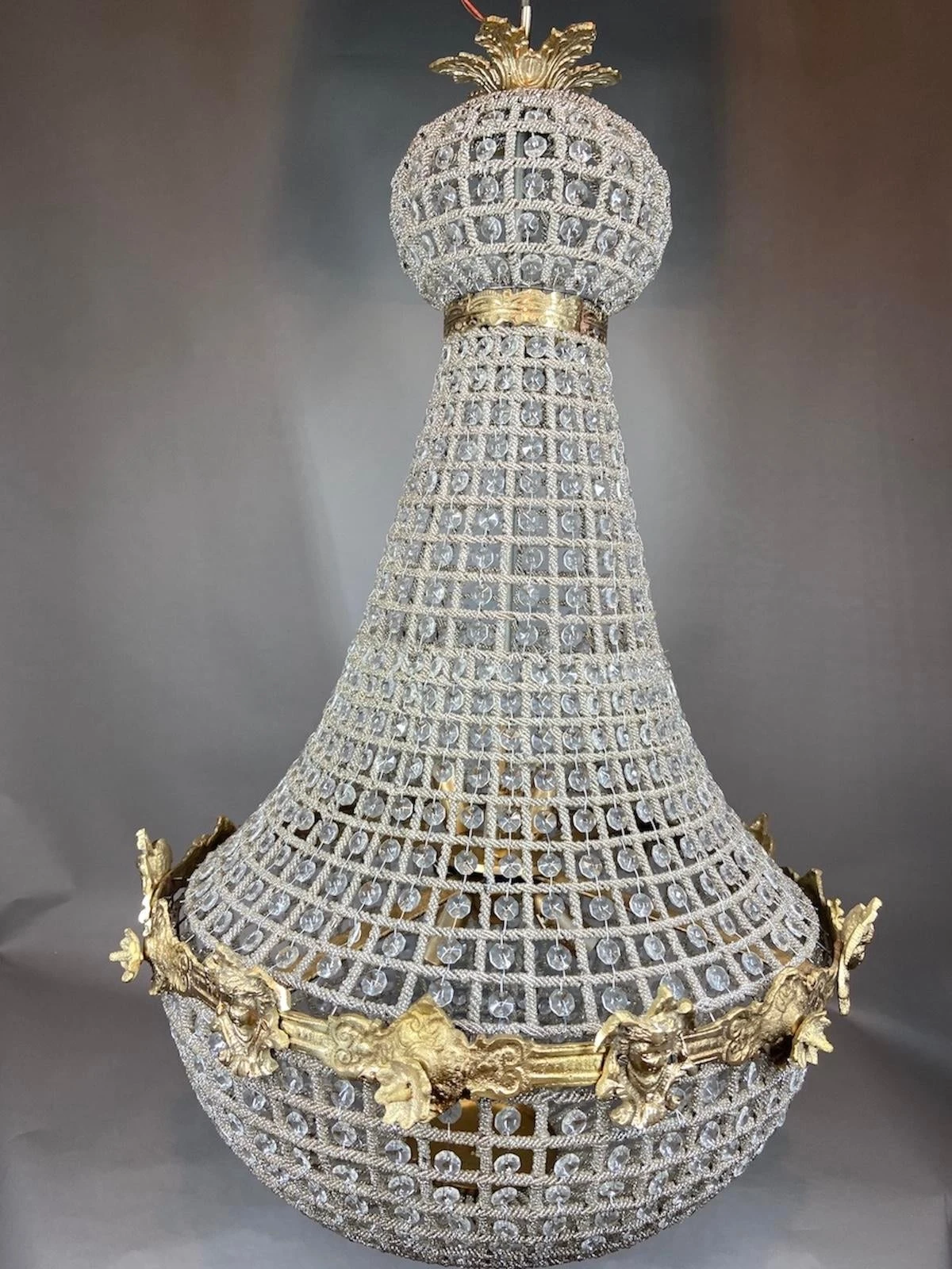 The details of this chandelier are stunning. It shows a gorgeous brass design with a lady face accents. It also shows beautiful baguette beading and various sizes beads. The chandelier has 6 lighting points at the inside that carry E14 bulbs.