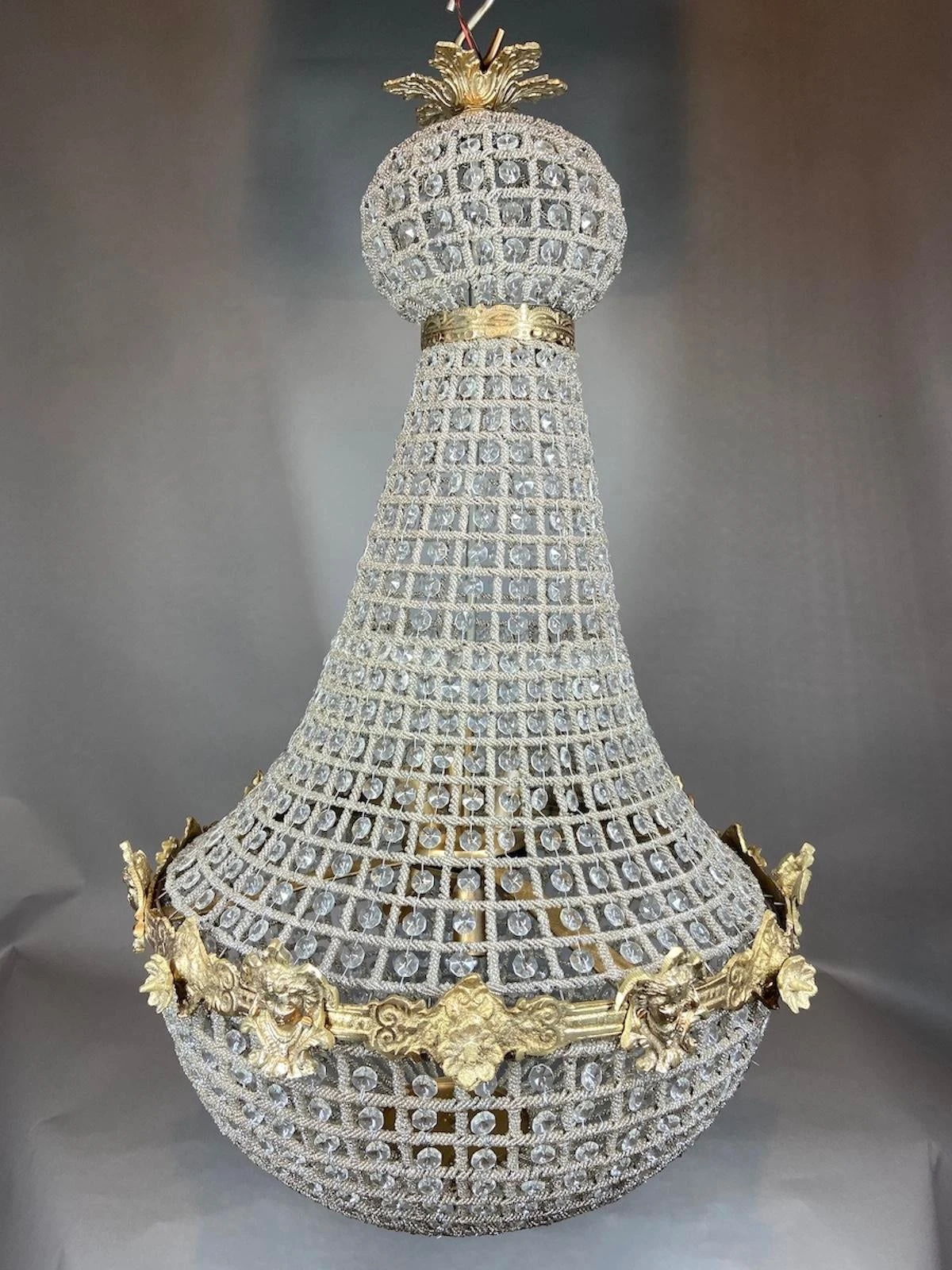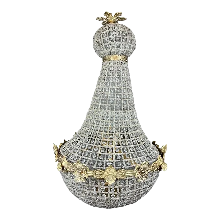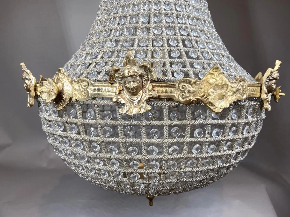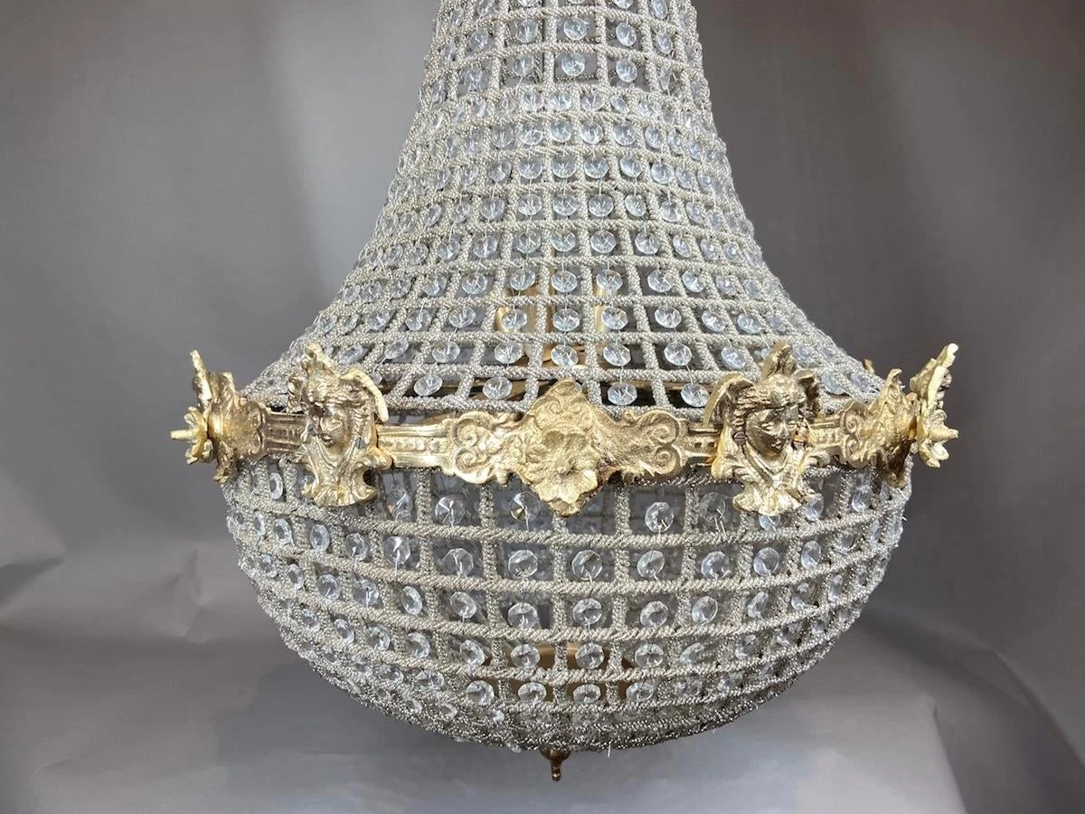 The details of this chandelier are stunning. It shows a gorgeous brass design with a lady face accents. It also shows beautiful baguette beading and various sizes beads. The chandelier has 6 lighting points at the inside that carry E14 bulbs.