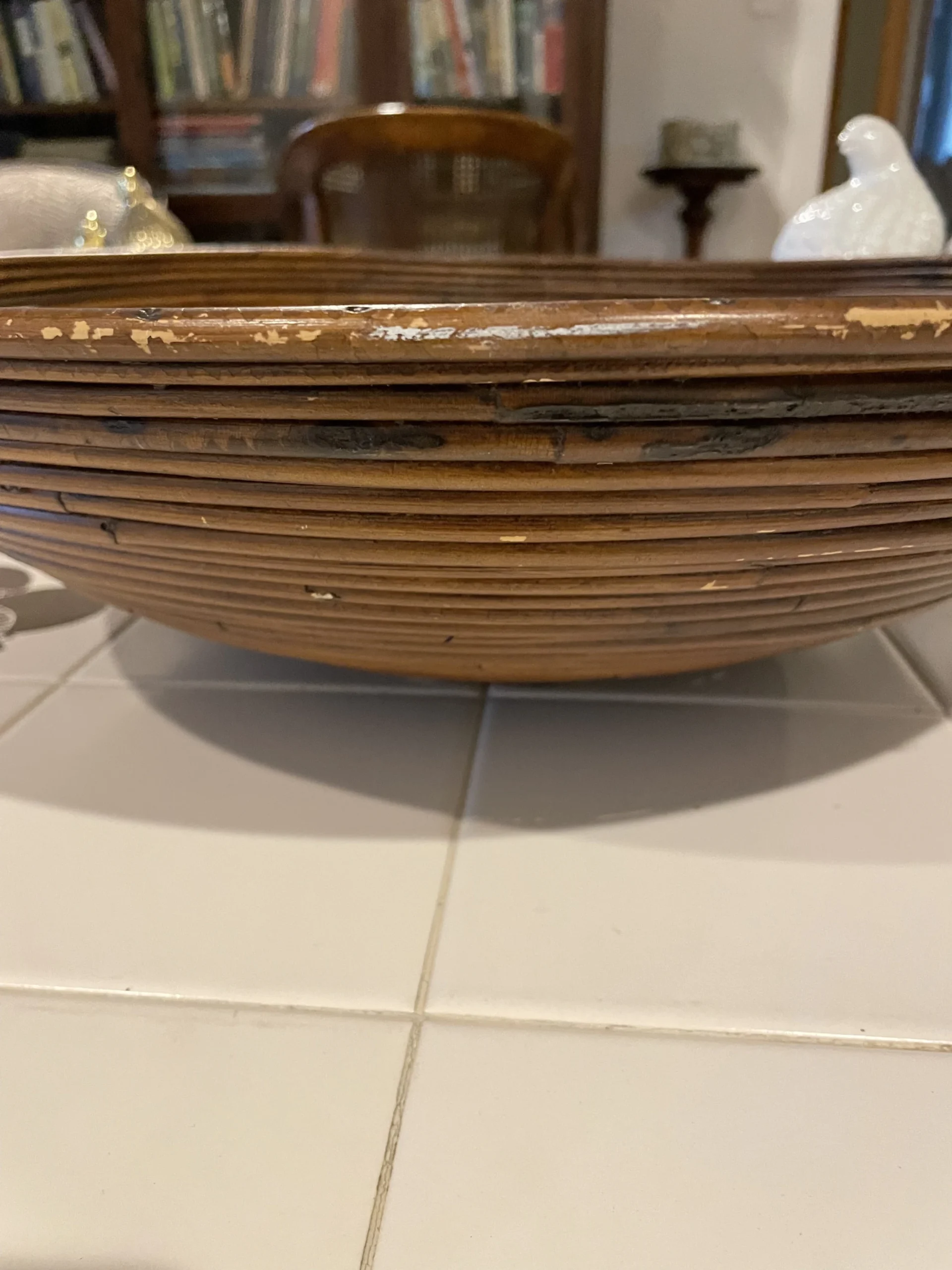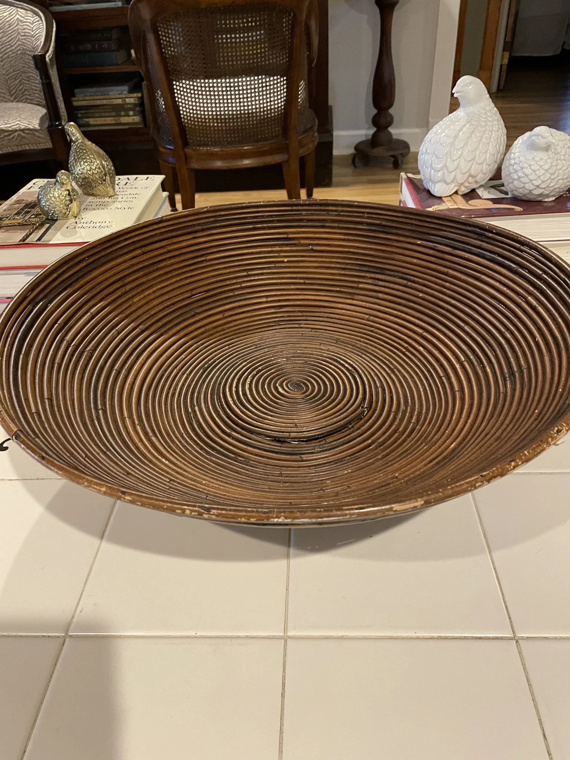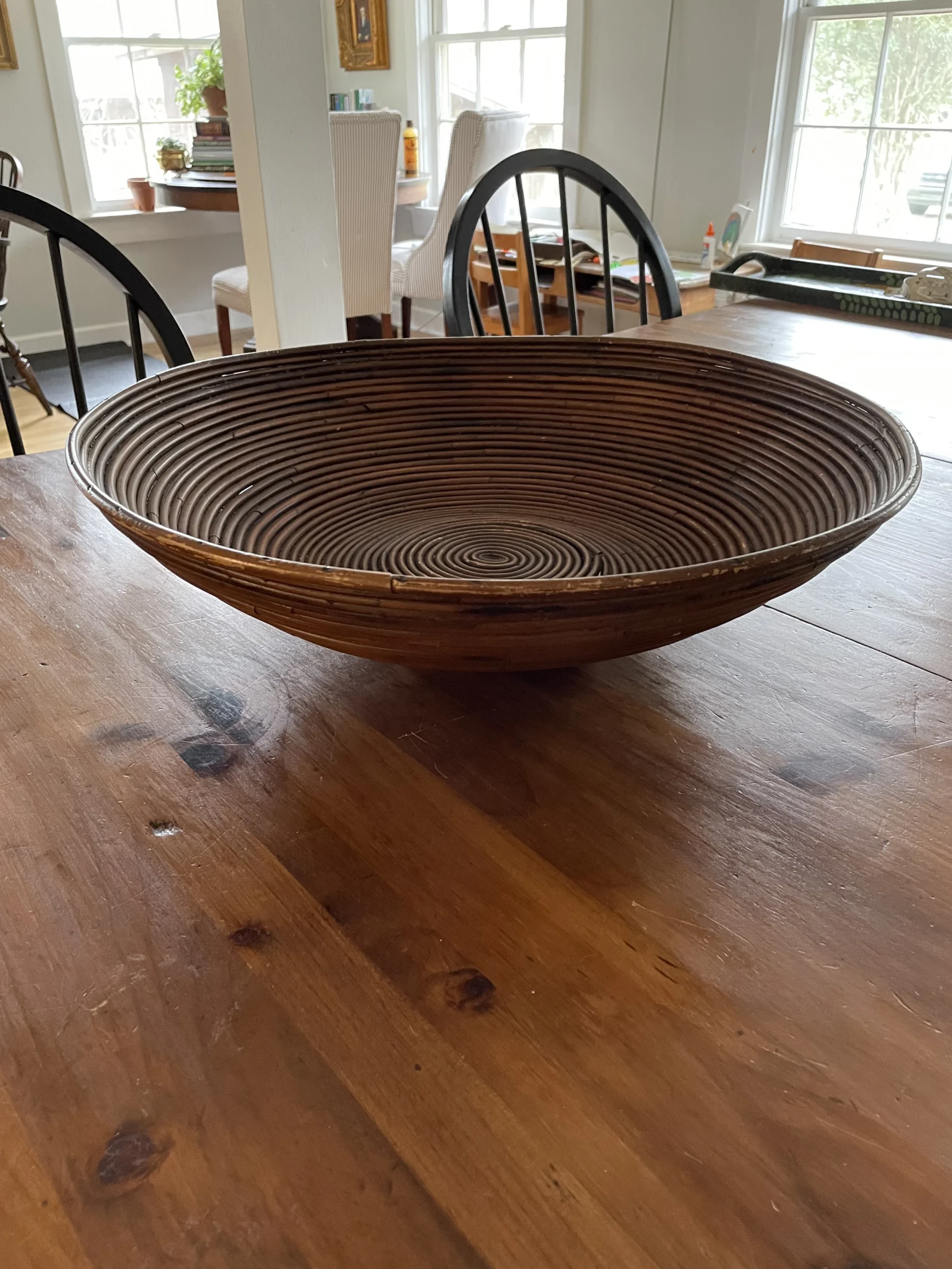 Vintage pencil reed adds color and texture combined with function when styling your home. I especially like the vintage pieces for the character produced by wear. This bowl is large …. It’s perfect for a large coffee table . Use is for magazines or plants, but it’s pretty enough to display alone.